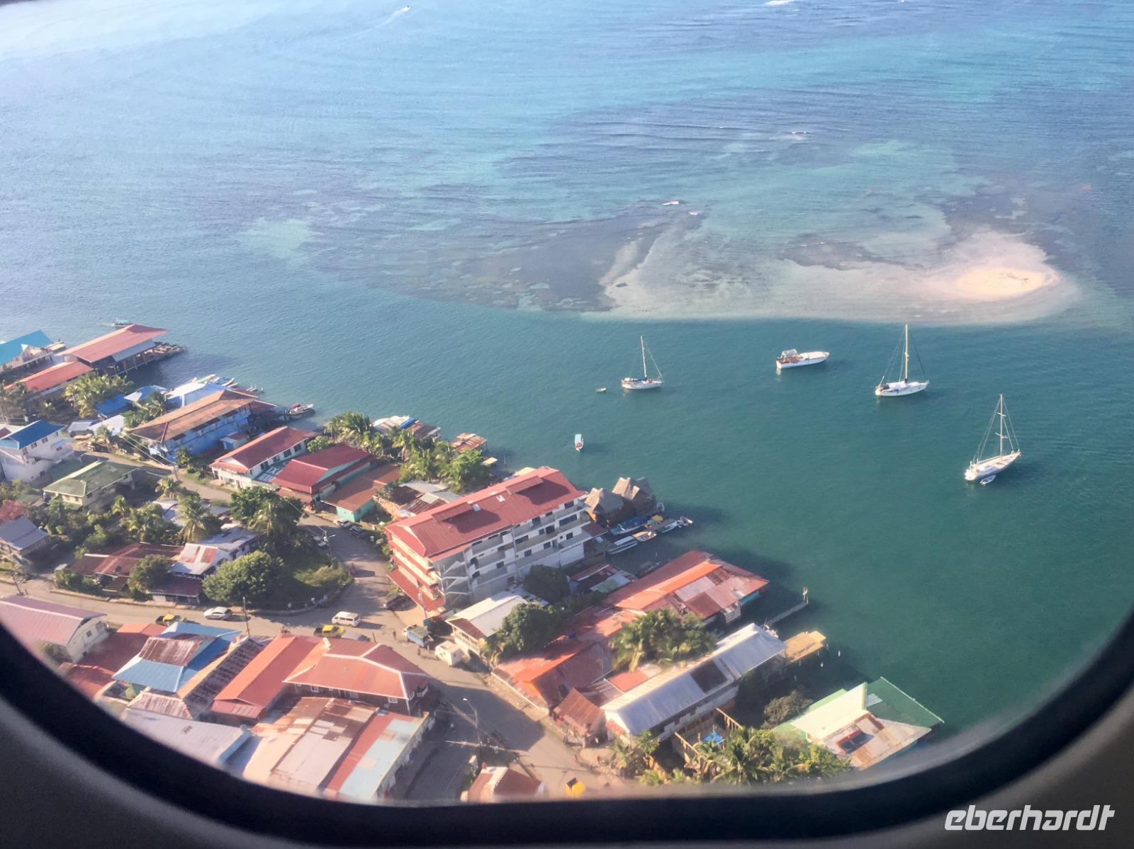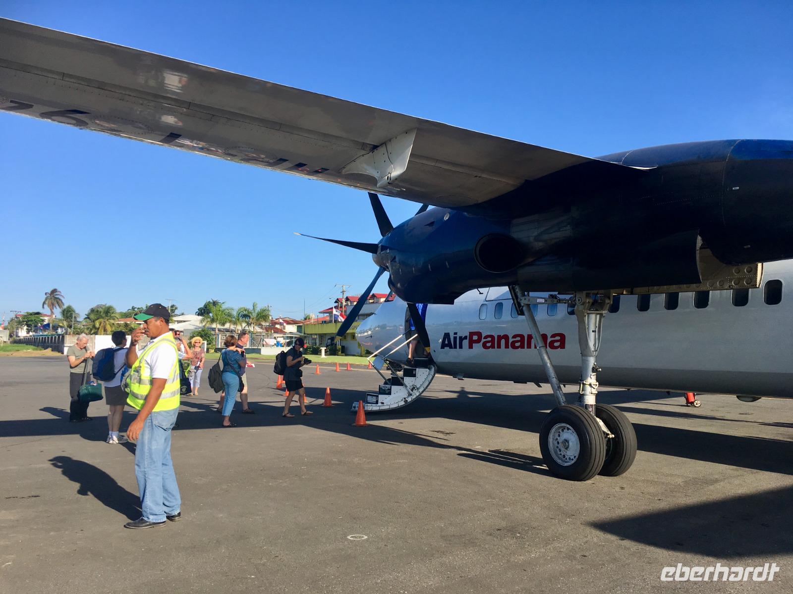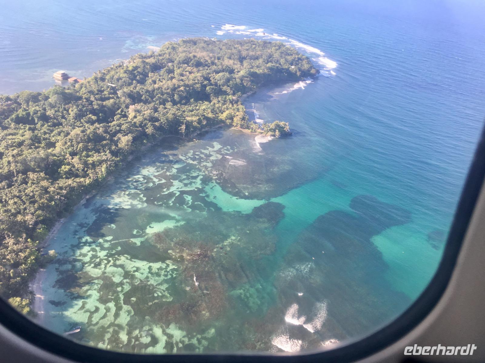 Was kann einem besseres passieren, als in der Karibik in einem tollen Hotel aufzuwachen bei Sonnenschein. Wir packen unsere sieben Sachen, geben alles in ein Zimmer und wandern zu unserem naechsten Abenteuer mit der Bade- und Schnorchelausruestung. Der Kapitaen unseres Bootes wartet bereits auf uns und schwups sitzen wir schon, mit den orangenen Schwimmwesten umgebunden, im Boot. Aha, die Kuestenwache will uns kontrollieren, also nichts wie hin. Die Papiere werden alle studiert und wir werden gemustert....wohl ob wir gut genug gelaunt sind fuer so einen herrlichen Tag ? Alles perfekt, wir koennen davonduesen. Ueber die kleinen Wellen huepfend segeln wir aus Boccas del Toro hinaus, an Saigon vorbei, direkt nach Boccas del Drago. Ja-Nein, es ist nicht jenes Saigon in Vietnam, sondern ein Fischerdorf auf der Insel Colon wo bloss Einheimische wohnen ! In Boccas del Drago steigen einige aus und gehen auf einen Spaziergang und andere moechten doch gerne ueber die hoeheren Wellen reiten um Bird-Island zu besuchen. Der Spaziergang war toll und Bird-Island war fuer unsere Vogelfreunde eine reine Freude. Sie haben sogar Paradiesvoegel und ein Albatross gesehen. Ach wie schoen. Alle sind gluecklich und so begeben wir uns auf die Strandwanderung bis zum Strand der Seesterne. Auf dem Weg bieten sich wieder etwa hundert Motive fuer das perfekte «Schatzilein und ich in der Karibik»-Bild. Mit / neben / auf / unter Palmen die sich ueber das kristallklare Wasser biegen, oder vor / neben den auf Stelzen stehenden Haeuser, oder einfach im Wasser stehend und aufs Meer blickend. Bei dem Postkartenwetter, ist die Wahl sehr schwer zu treffen, also wird wie wild geknipst und gelacht. Beim Seesternstrand angekommen trauen wir unseren Augen kaum. Es gibt hier tatsaechlich riesengrosse, dicke, gelbe und rote Seesterne. Man braucht gar nicht zu schnorcheln um sie zu sehen man muss bloss aufpassen dass man nicht auf sie draufsteigt. Wir nehmen Platz und gehen schwimmen, schnorcheln und erkunden. Besonders bei den Mangroven drueben, gibt es Millionen von kleinen Neonfischchen. Solch' dichte Schulen, dass sie um die Schnorchler herumziehen und man sich wie in einem National Geographic Film vorkommt. Ein BBQ wird zu Mittag hergerichtet und es schmeckt koestlich. Wir koennten hier noch lange bleiben, aber der Flieger nach Panama City ist schon in ein paar Stuendchen. Also wieder zurueck nach Boccas del Toro, Verabschiedung des Kapitaens, duschen, umziehen, einkaufen gehen und schon sind wir bereit fuer den Airport-Transfer ! Beim Flughafen, oder richtig Flughaefchen, sitzt auch ein Pilot und er ist ganz gluecklich, dass wir bereits eine Stunde vor Abflug bereit sind, also bittet er uns in den gecharterten Flieger einzusteigen.............ja, wir haben unser eigenes Eberhardt-Flugzeug, mit Pilot, Copilot und zwei charmanten Flugbegleiterinnen. Wir glauben es kaum, sowas, das Herz singt. Eine Stunde spaeter landen wir in Panama City und werden auch gleich von Archimedes, unserem ersten Fahrer, ins Hotel gebracht. Wir haben wieder unseren Super-Fahrer, es wird immer schoener. Was fuer ein erfolgreicher Tag, wir werden so schoen verwoehnt. In jedem Zimmer liegt auch ein Paeckchen Kaffee als Geschenk. Es ist eine Entschuldigung fuer den Linienbus von Boquete nach Boccas del Toro ! Das ist nun wirklich sehr nett.