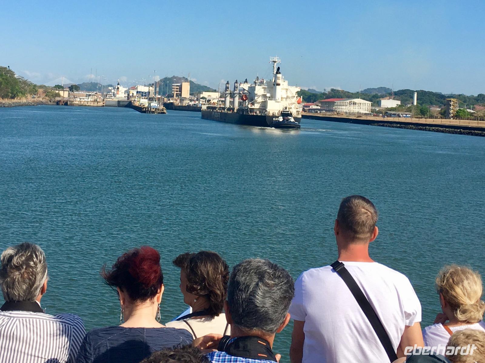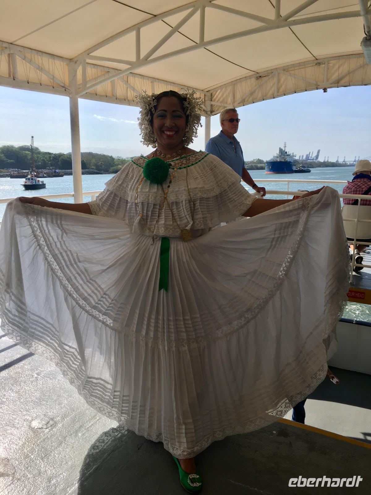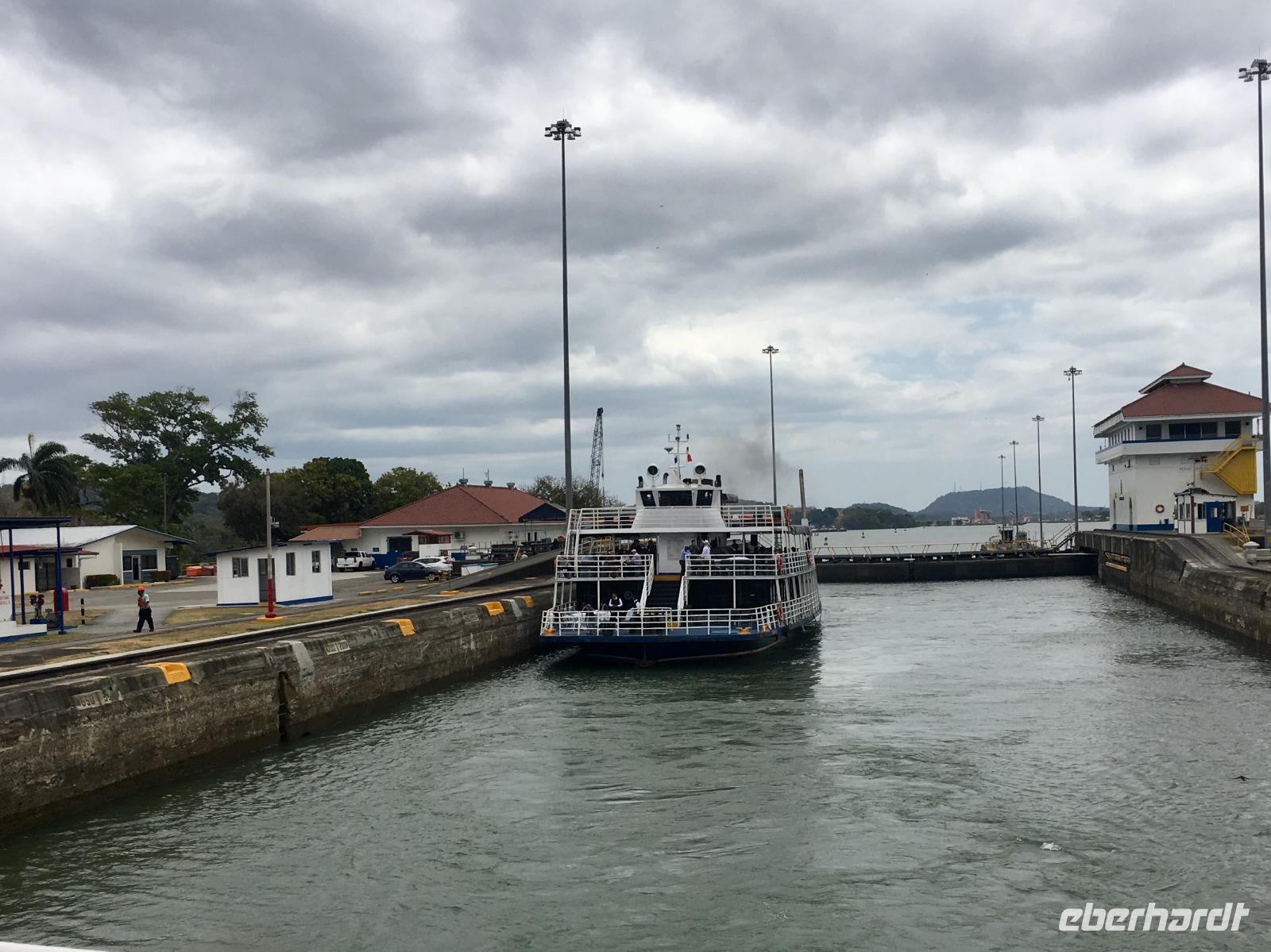 Letzter voller Tag hier in Zentral Amerika auf dieser Reise. Einige unter uns, werden sicher diese Laender nochmals bereisen, es ist zu schoen, zu vielfaeltig, zu ueberwaeltigend um es bloss einmal zu erleben. Heute geht es wieder zeitig los. 6:30 Uhr. Wir fahren naemlich zum Panama Kanal. Durch die Stadt faehrt uns Nino bis zum Flamenco Hafen. Dort wird jedem ein Baendchen um das Handgelenk gebunden und presto sind wir schon in dem 2-stoeckigen Schiff welches uns durch die Kanal Locks fahren wird. Wir sehen noch die schoene Skyline von Panama City mit dem ehemaligen Trump Tower welches nun ein Mariott Hotel ist und dem gruenen hohen spiralfoermigen Glassturm welcher weit hinauf in den tropischen Himmer ragt. Nun kommt auch schon der Lotse an Bord und es kann losgehen mit der Kanal Teil-Durchquerung. Bald kommen wir schon zu den Miraflores Locks. Es sind gleich 3 Locks mit je 8 Meter Hoehenunterschied. Wir fahren rein, das grosse schwarze Tor schliesst hinter uns, vor uns geht langsam das Tor auf, so viel Wasser um 50 olympische Schwimmbaeder fuellen zu koennen, das sind 14 Tonnen Wasser, fliessen hinein, blub-blub-blub innert 10 Minuten sind wir oben, vorderes Tor ist nun ganz offen, wir fahren raus und die naechste Stufe kann in Angriff genommen werden. Alles geht durch Schwerkraft und diese Schleusen sind bereits ueber 100 Jahre alt. Der Neue Kanal wurde vor 1 ½ Jahren eroeffnet, er ist wesentlich breiter und die Schleusen laenger, sodass auch noch groessere Frachtschiffe welche nicht bloss 14'000 Kontainer sondern sogar mit bis zu 20'000 Kontainer beladen sind, durch Panama durchfahren koennen. Der alte Kanal gehoert nun Panama und ist eine grosse Einnahmensquelle fuer dieses Land. Der neue Kanal hingegen, gehoert halb China halb Panama. Auf unserem Schiff ist auch eine Panamenia in ihrer Tracht. Stolz traegt sie das weisse bestickte Kleid mit den gruenen Pompons und einem tollen Haarschmuck aus Perlen, Ketten und goldenen Kaemmen. Wir schauen dem Treiben auf diesem Schiff genuesslich zu und halten natuerlich auch immer Ausschau auf die Pelikane, wie sie sich ins Wasser stuerzen um die Fische rauszuholen. Es wird ein Fruehstueck und auch ein Mittagessen serviert. Der panamenische Schiff-Reiseleiter erzaehlt vieles auf Spanisch und Englisch. Die deutschen Reiseleiter wechseln sich ab mit der deutschen Version. So plaudert es eigentlich staendig und man wird mit viel Wissenswertem mehrsprachig berieselt. Nach den Miraflores Locks kommen wir gleich zu den Pedro Miguel Locks und danach schlaengelt sich der Kanal durch den Gaillard Cut. Hier fuehrt der Kanal durch das Gebirge, ueber die Wasserscheide auf die karibische Seite bis zum Chagres Fluss. In Gamboa steigen wir aus und werden mit einem Bus wieder zum Ausgangspunkt gefahren. Dort wartet Nino wieder auf uns und bald sind wir im Hotel angekommen. Nun ist mal 2 Stunden Pause angesagt ehe das Abendprogramm beginnen kann. Wir wollen dem Sonnenuntergang in Panama beiwohnen und auf diese gelungene Reise anstossen. Bei Plaza de Francia stossen wir mit franzoesischem Champagner an. Schoen war diese Reise, wir haben alle Wuensche erfuellen koennen und hatten keine wesentlichen Pannen. Prost. Nun gehen wir zu Fuss in die Altstadt hinein. Da ist viel los, es ist Samstag Abend, nur gut, dass wir eine Reservierung im besten Lokal haben. Wir kommen etwas zu spaet an, da wir bei dem Panamahut Laden einfach nicht vorbeigehen koennen. 8 Huete und viel Gelaechter spaeter sind wir im Casa blanca Restaurant, Drinks gut, Essen gut, live Musik gut bis die Augen fast zufallen. Schnell ins Hotel, denn Morgen ist unser aller letzter Tag........