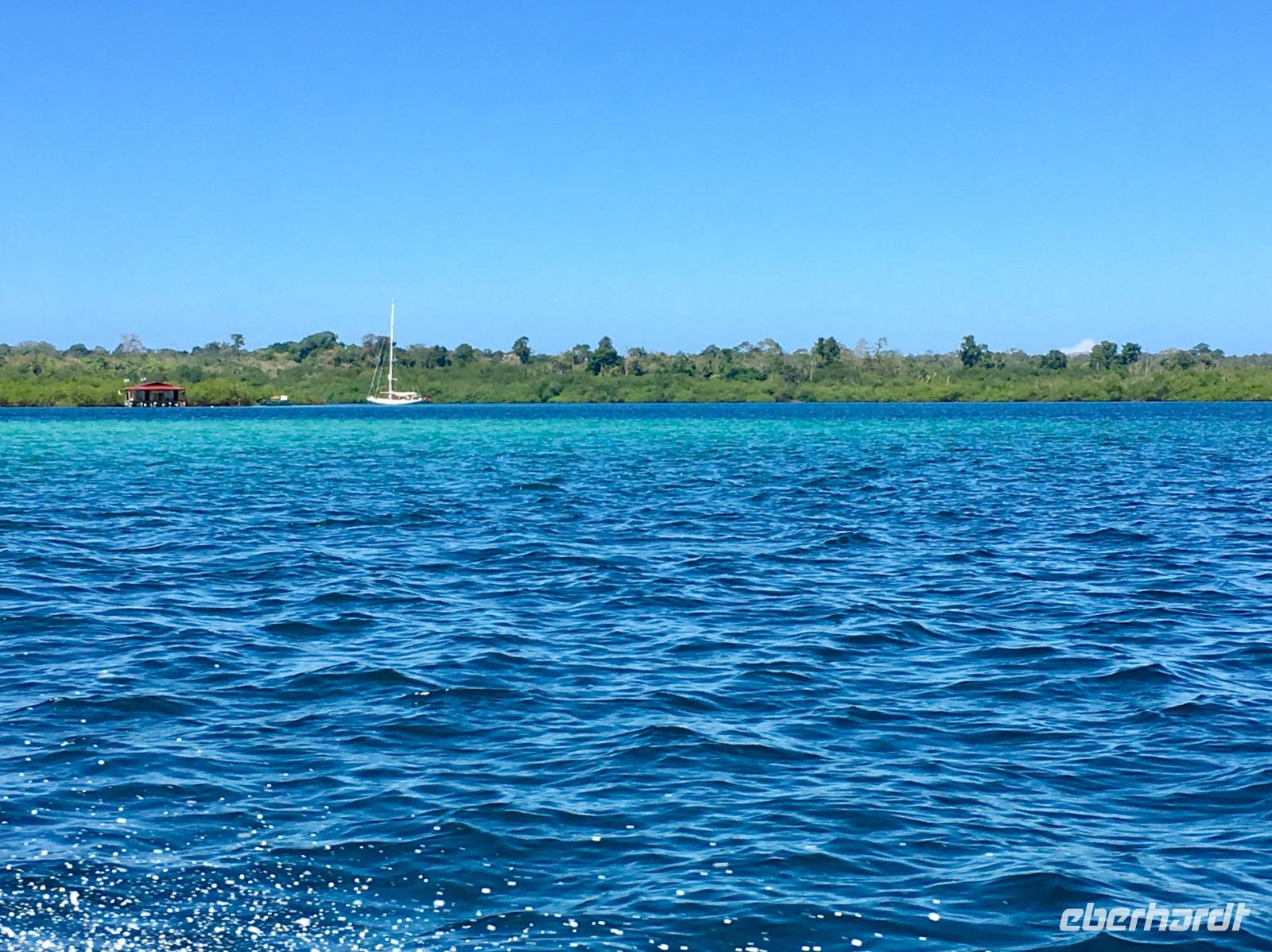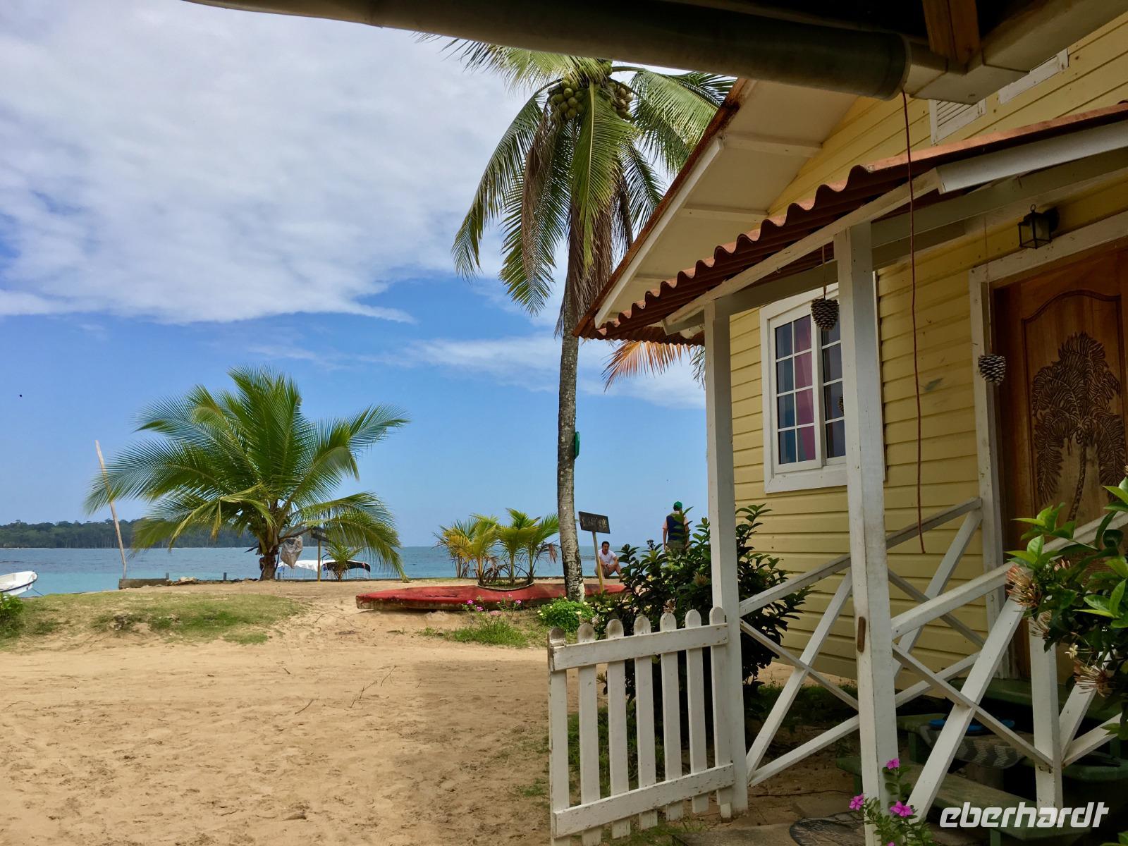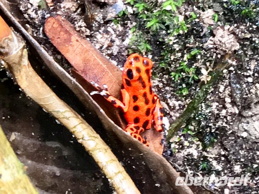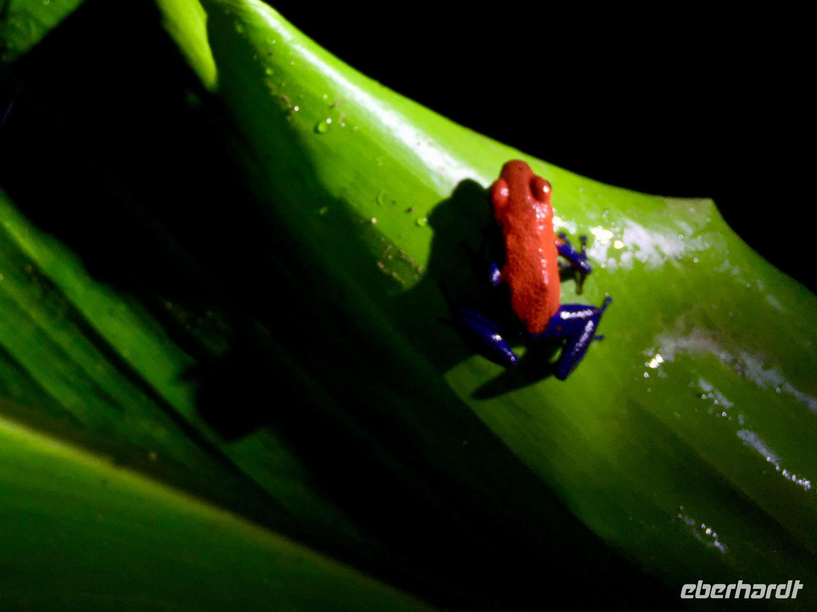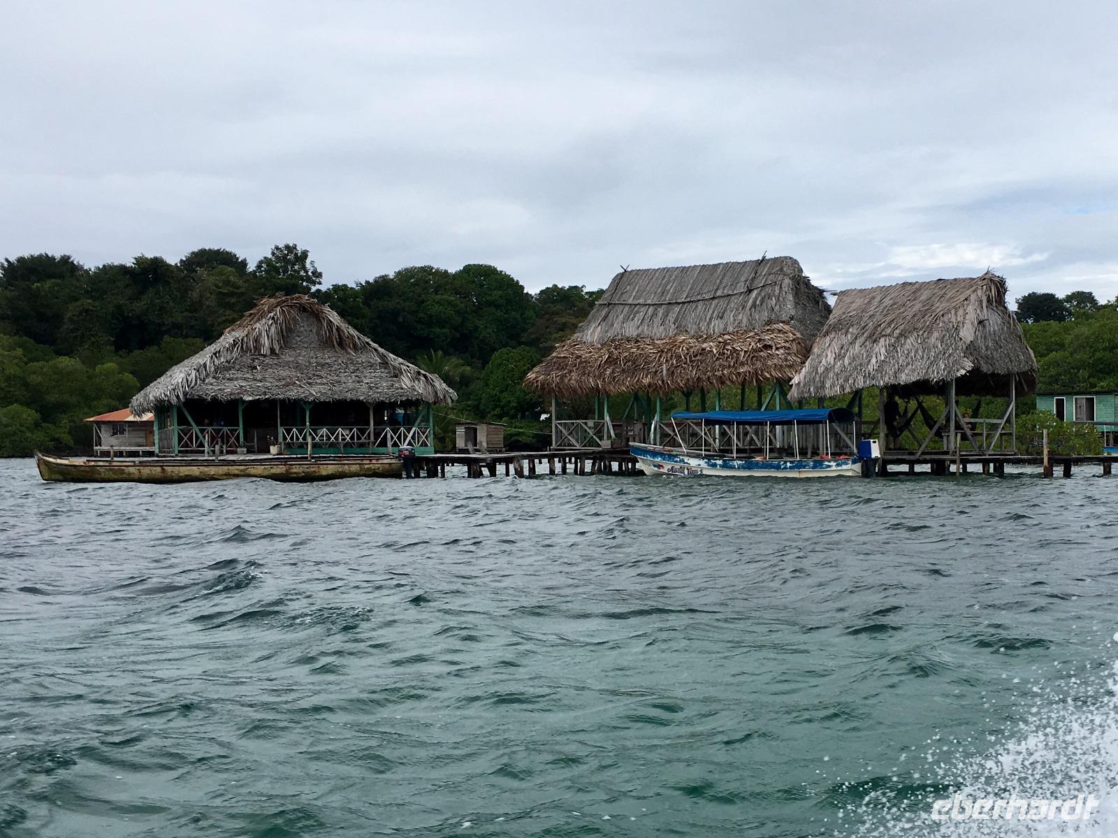 Die Suiten in diesem wunderbaren Hotel sind so schoen und gemuetlich und trotzdem freuen wir uns auf diesen Tag der Karibik. Blauer Himmel, super Fruehstueck gefolgt von kleinem Spaziergang zur Bootsanlegestelle. Dort wartet auch schon unser Kapitaen und er bringt noch eine blaue Plane aufs Gestell seines Motorbootes an. Aha, da drueben sind schon Wolken, oho zwei Minuten spaeter regnet es wie aus Kuebeln gegossen. Wir warten mal ab und siehe da, nach ca 15 Minuten hoert das prasseln wieder auf und wir steigen ins Boot ein. Los gehts in vollem Tempo durch die Inselwelt. Erst in den Mangroven fahren wir langsamer und langsamer bis zum Schrittempo, da der Wasserweg auch immer enger wird. Gespenstisch schaut es hier aus und dunkel. Ab und zu liegt wieder ein Faultier auf einem Ast, oder ein Voegelein hat sich verirrt, ein Kaiman lugt unter einer Wurzel hervor, zwei Krokodile kucken aus dem Teich wo ein Ibis gerade vorbeistolziert. Immer wieder sehen wir Einbaumkanus liegen und wundern uns wo deren Besitzer wohl sein moegen ? Hier, ein Indio-Mann steht auf einem Steg er laechelt uns zu und wir legen an. Unsere Tour im Regenwald kann beginnen. Erst wandern wir auf einem schmalen Pfad durch den Wald bis zu einer Hoehle. Au wei, soooo viele Fledermaeuse haengen da an den Waenden, bloss nicht WOW sagen und gleichzeitig hochgucken, meint unser Natur-Guide, denn die Fledermaeuse entleeren sich ploetzlich. Also gehen wir geschlossenen Mundes in die Hoehle hinein. Nur wenige, trauen sich bis weit in die Hoehle hinein, die anderen bleiben im Trockenen. Ploetzlich faengt draussen der Regen wieder an, aber wie. Hier uebernachten koennen wir nicht, also laufen wir so schnell wie moeglich auf dem, nun super matschigen und glitschigen, Weg zurueck zum Haus. Wie Lehmleute schauen wir aus und werden auch gleich abgespritzt zur Reinigung unserer Beine. Nur gut, dass es hier so warm ist, so trocknet alles wieder sehr schnell. Mit dem Motorboot gehts nun wieder aus dem Mangroven Wald hinaus auf eine andere Insel. Dort steht ein Restaurant auf Stelzen im Wasser wo wir auch unser Picknick einnehmen. Danke Eberhardt fuer das feine Bierchen dazu. Das Sandwich rutscht damit viel besser hinunter ! Die vielen Fische, die uns von unten zuschauen wollen wir nun auch mit der mitgebrachten Schnorchelausruestung gebuehrend betrachten. Das Wetter hat sich wieder erholt und die Fische tanzen um uns herum. Sogar einige schoene Korallen haben sich unter dem Restaurant angesiedelt. Unser Tag ist aber noch nicht zu Ende, mit dem Motorboot fahren wir nun wieder auf die Bastimientos Insel wo wir nun eine kleine Wanderung durch die Insel unternehmen um die roten Pfeilgiftfroesche zu sehen. Tatsaechlich sehen wir gleich mehrere. Jedes Froeschchen ist anders getupft aber allesamt sind sie leuchtend rot und sehr, sehr klein. Auf der anderen Inselseite ist der wunderbare Strand, idyllisch, romantisch, wild, wie auf einer Postkarte. Jeder geniesst die Stunde dort auf seine Art und Weise. Erst spaet nachmittags sind wir wieder zurueck in unserem schmucken Hotel. Was fuer ein ereignissreicher, toller Tag heute. Karibik pur. Das Abendessen mit Live Musik auf dem Wasser ist wieder koestlich. Ach wie schoen ist das Reisen.