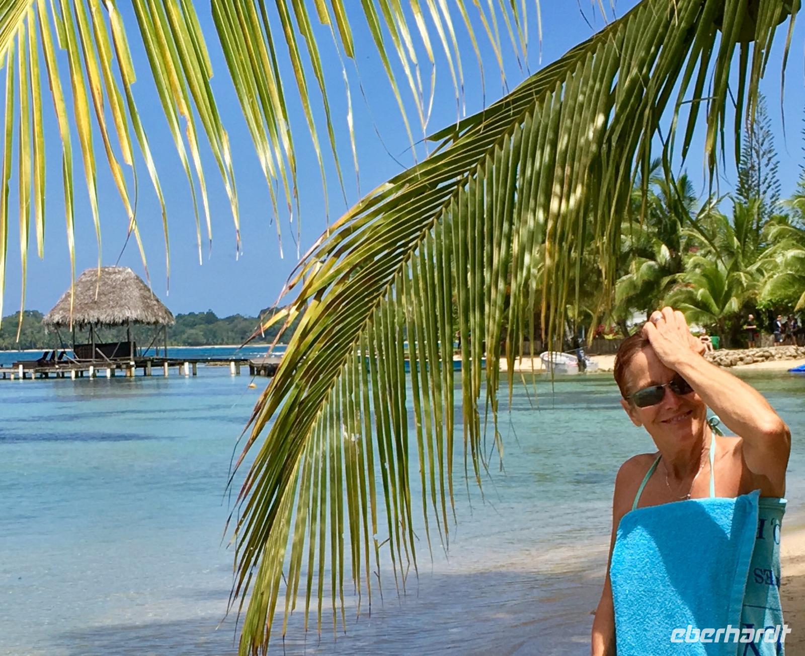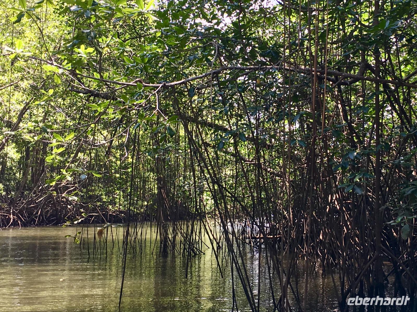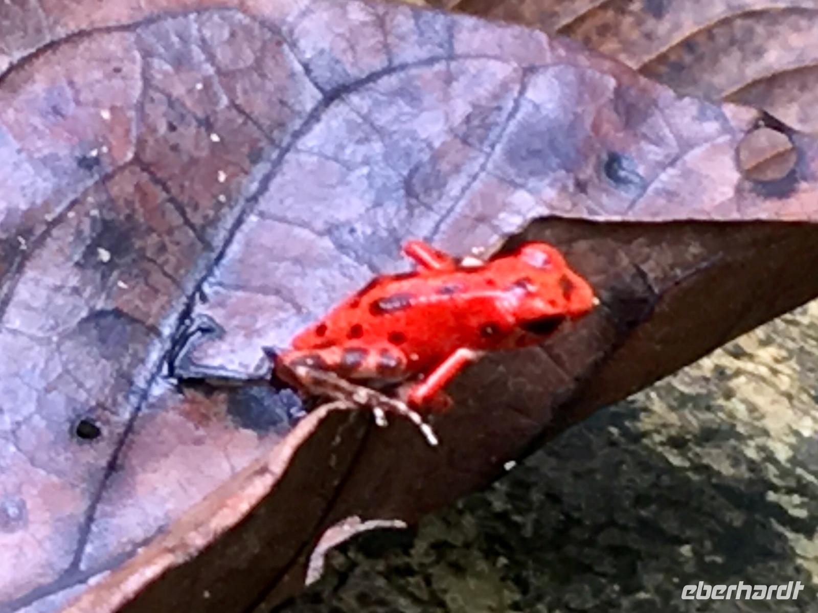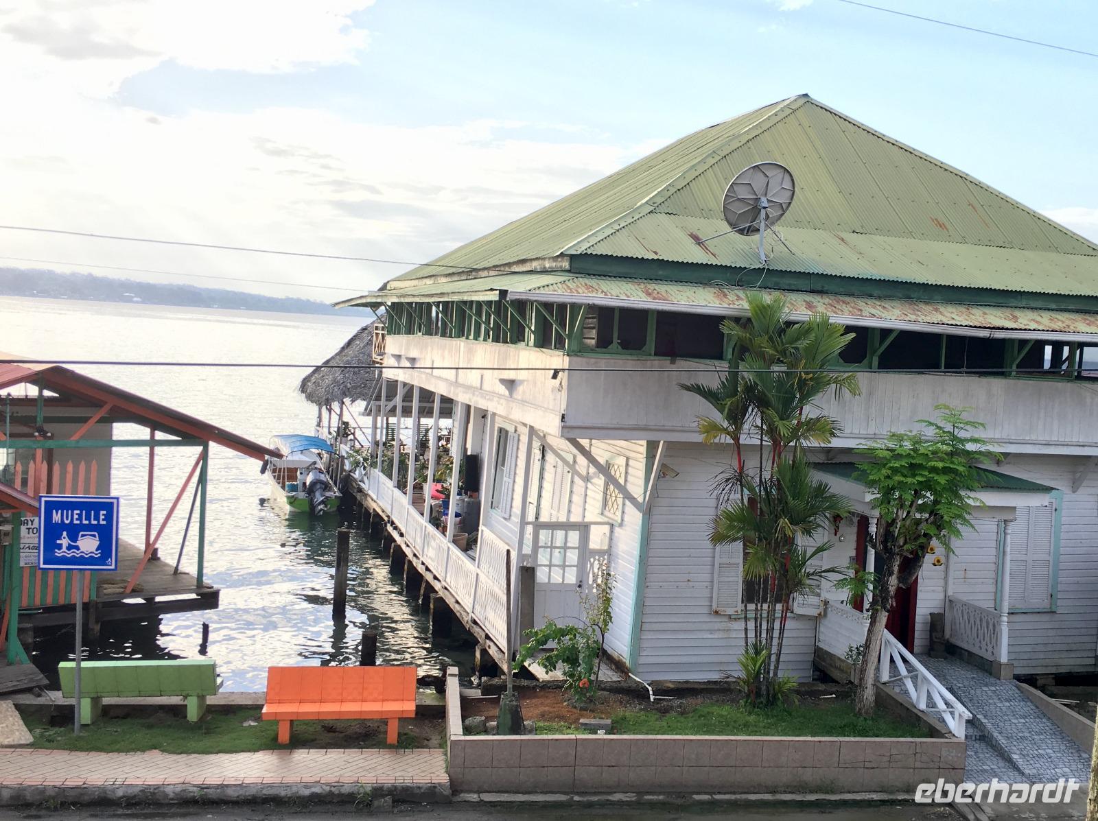 Die Suiten in diesem wunderbaren Hotel sind so schoen und gemuetlich und trotzdem freuen wir uns auf diesen Tag der Karibik. Blauer Himmel, super Fruehstueck gefolgt von kleinem Spaziergang zur Bootsanlegestelle. Dort wartet auch schon unser Kapitaen und er bringt noch eine blaue Plane aufs Gestell seines Motorbootes an. Aha, da drueben sind schon Wolken, oho zwei Minuten spaeter regnet es wie aus Kuebeln gegossen. Wir warten mal ab und siehe da, nach ca 15 Minuten hoert das prasseln wieder auf und wir steigen ins Boot ein. Los gehts in vollem Tempo durch die Inselwelt. Erst in den Mangroven fahren wir langsamer und langsamer bis zum Schrittempo, da der Wasserweg auch immer enger wird. Gespenstisch schaut es hier aus und dunkel. Ab und zu liegt wieder ein Faultier auf einem Ast, oder ein Voegelein hat sich verirrt, ein Kaiman lugt unter einer Wurzel hervor, zwei Krokodile kucken aus dem Teich wo ein Ibis gerade vorbeistolziert. Immer wieder sehen wir Einbaumkanus liegen und wundern uns wo deren Besitzer wohl sein moegen ? Hier, ein Indio-Mann steht auf einem Steg er laechelt uns zu und wir legen an. Unsere Tour im Regenwald kann beginnen. Erst wandern wir auf einem schmalen Pfad durch den Wald bis zu einer Hoehle. Au wei, soooo viele Fledermaeuse haengen da an den Waenden, bloss nicht WOW sagen und gleichzeitig hochgucken, meint unser Natur-Guide, denn die Fledermaeuse entleeren sich ploetzlich. Also gehen wir geschlossenen Mundes in die Hoehle hinein. Nur wenige, trauen sich bis weit in die Hoehle hinein, die anderen bleiben im Trockenen. Ploetzlich faengt draussen der Regen wieder an, aber wie. Hier uebernachten koennen wir nicht, also laufen wir so schnell wie moeglich auf dem, nun super matschigen und glitschigen, Weg zurueck zum Haus. Wie Lehmleute schauen wir aus und werden auch gleich abgespritzt zur Reinigung unserer Beine. Nur gut, dass es hier so warm ist, so trocknet alles wieder sehr schnell. Mit dem Motorboot gehts nun wieder aus dem Mangroven Wald hinaus auf eine andere Insel. Dort steht ein Restaurant auf Stelzen im Wasser wo wir auch unser Picknick einnehmen. Danke Eberhardt fuer das feine Bierchen dazu. Das Sandwich rutscht damit viel besser hinunter ! Die vielen Fische, die uns von unten zuschauen wollen wir nun auch mit der mitgebrachten Schnorchelausruestung gebuehrend betrachten. Das Wetter hat sich wieder erholt und die Fische tanzen um uns herum. Sogar einige schoene Korallen haben sich unter dem Restaurant angesiedelt. Unser Tag ist aber noch nicht zu Ende, mit dem Motorboot fahren wir nun wieder auf die Bastimientos Insel wo wir nun eine kleine Wanderung durch die Insel unternehmen um die roten Pfeilgiftfroesche zu sehen. Tatsaechlich sehen wir gleich mehrere. Jedes Froeschchen ist anders getupft aber allesamt sind sie leuchtend rot und sehr, sehr klein. Auf der anderen Inselseite ist der wunderbare Strand, idyllisch, romantisch, wild, wie auf einer Postkarte. Jeder geniesst die Stunde dort auf seine Art und Weise. Erst spaet nachmittags sind wir wieder zurueck in unserem schmucken Hotel. Was fuer ein ereignissreicher, toller Tag heute. Karibik pur. Das Abendessen mit Live Musik auf dem Wasser ist wieder koestlich. Ach wie schoen ist das Reisen.