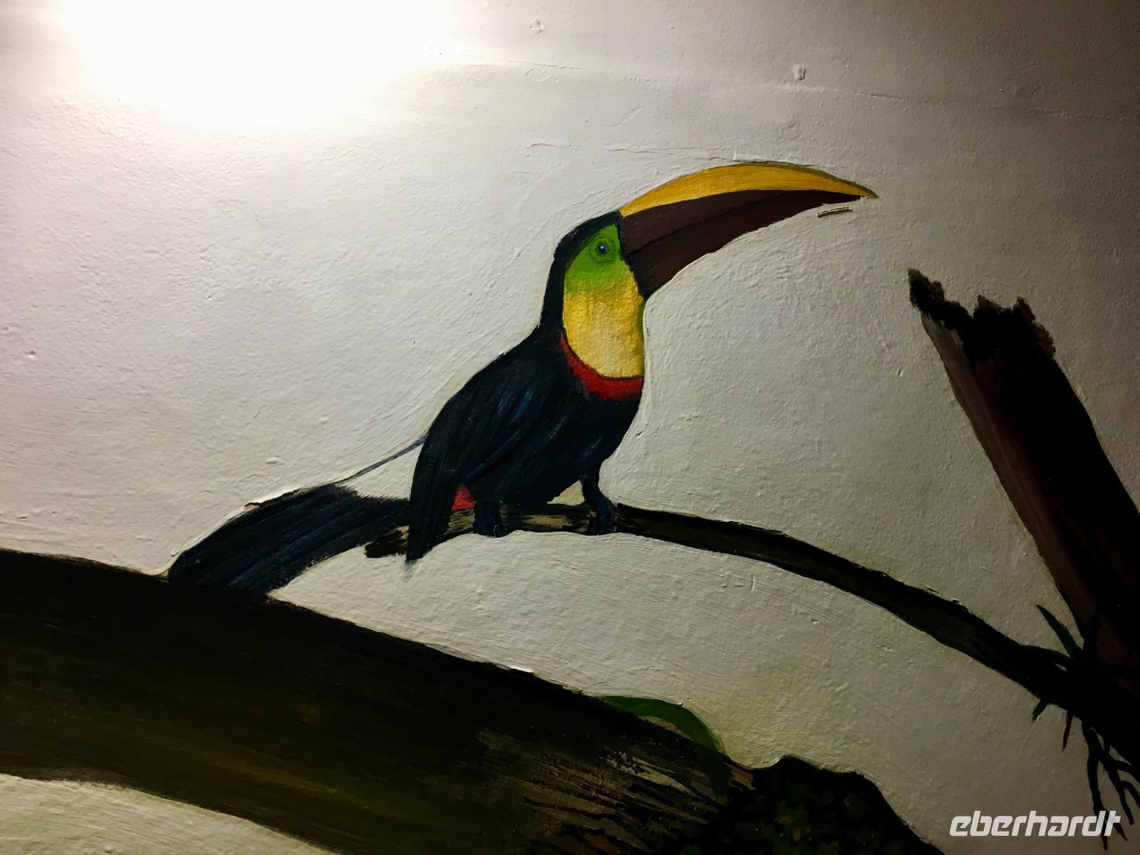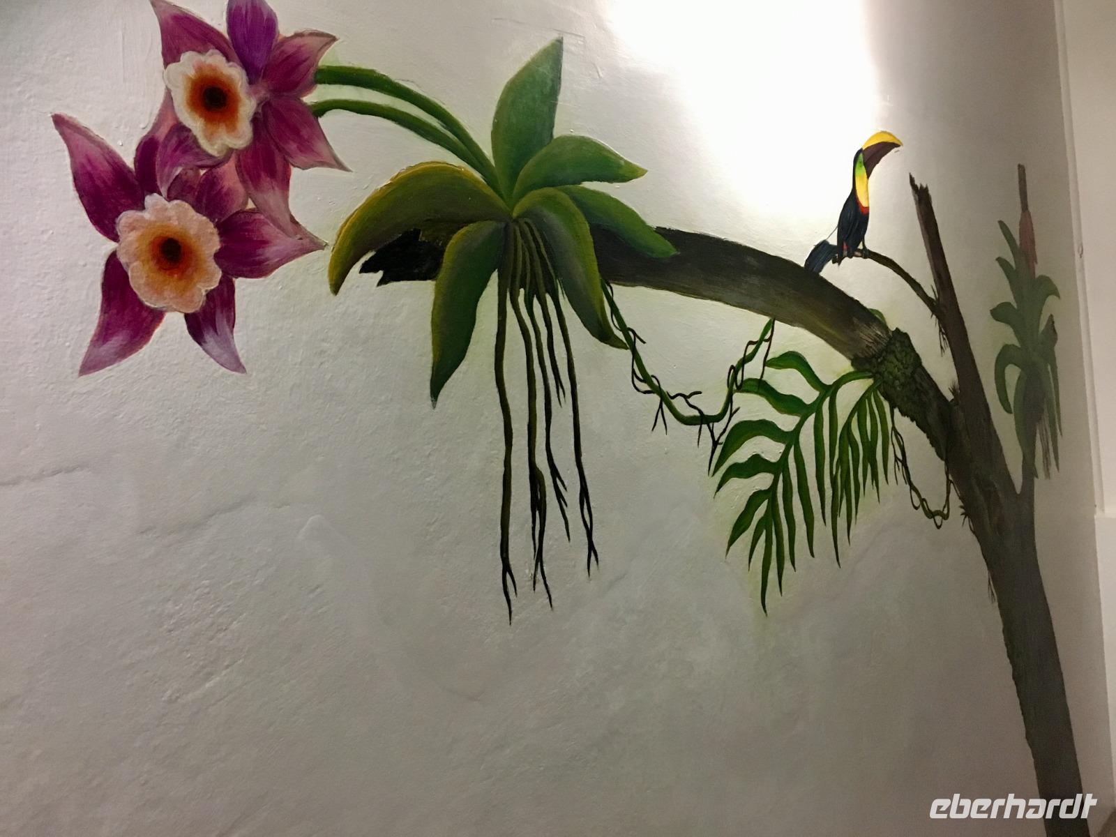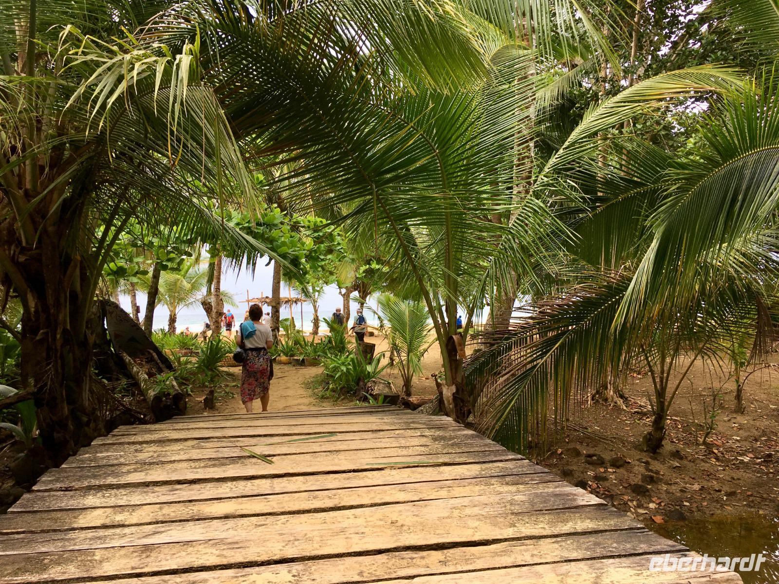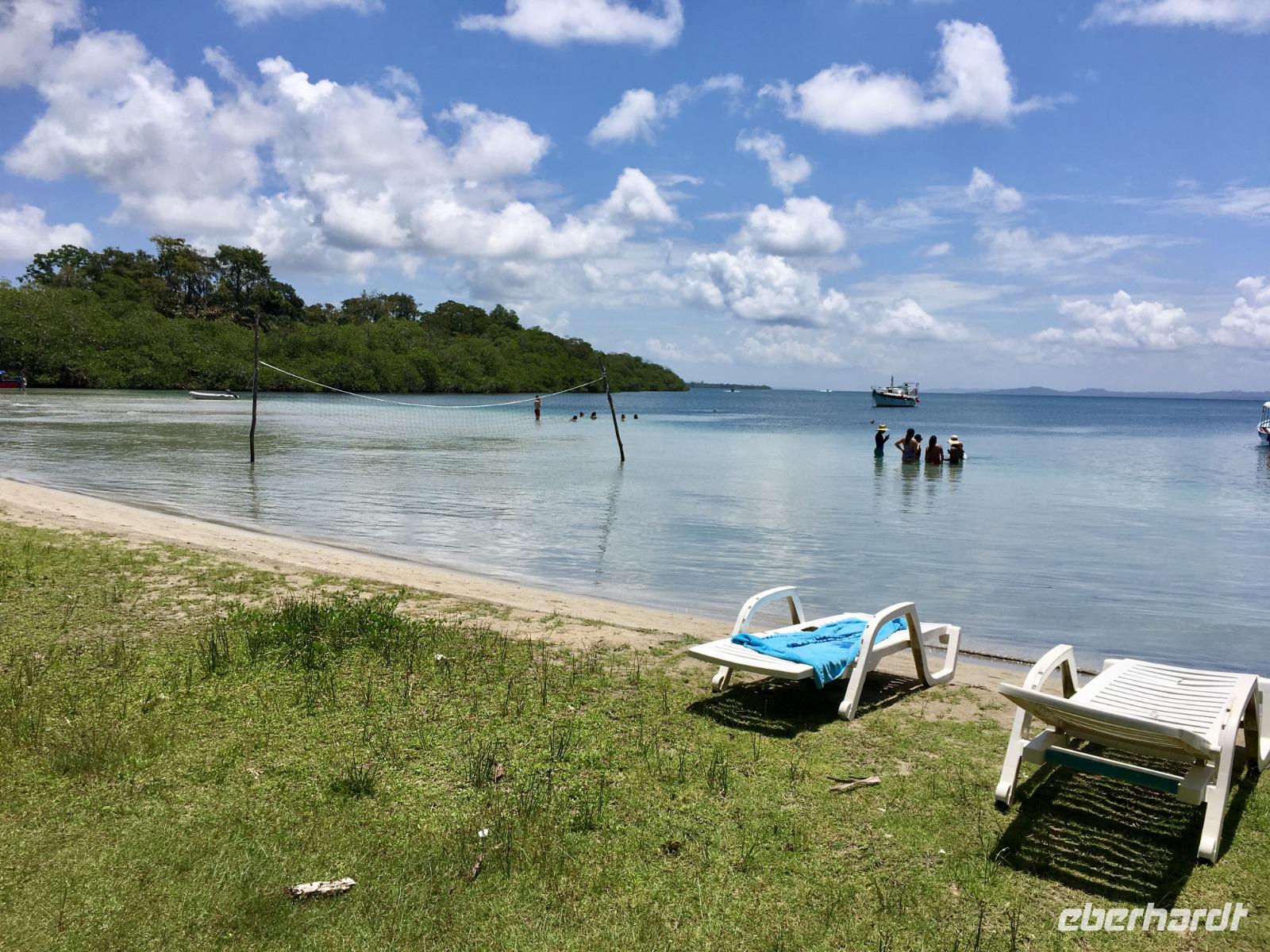 Die Suiten in diesem wunderbaren Hotel sind so schoen und gemuetlich und trotzdem freuen wir uns auf diesen Tag der Karibik. Blauer Himmel, super Fruehstueck gefolgt von kleinem Spaziergang zur Bootsanlegestelle. Dort wartet auch schon unser Kapitaen und er bringt noch eine blaue Plane aufs Gestell seines Motorbootes an. Aha, da drueben sind schon Wolken, oho zwei Minuten spaeter regnet es wie aus Kuebeln gegossen. Wir warten mal ab und siehe da, nach ca 15 Minuten hoert das prasseln wieder auf und wir steigen ins Boot ein. Los gehts in vollem Tempo durch die Inselwelt. Erst in den Mangroven fahren wir langsamer und langsamer bis zum Schrittempo, da der Wasserweg auch immer enger wird. Gespenstisch schaut es hier aus und dunkel. Ab und zu liegt wieder ein Faultier auf einem Ast, oder ein Voegelein hat sich verirrt, ein Kaiman lugt unter einer Wurzel hervor, zwei Krokodile kucken aus dem Teich wo ein Ibis gerade vorbeistolziert. Immer wieder sehen wir Einbaumkanus liegen und wundern uns wo deren Besitzer wohl sein moegen ? Hier, ein Indio-Mann steht auf einem Steg er laechelt uns zu und wir legen an. Unsere Tour im Regenwald kann beginnen. Erst wandern wir auf einem schmalen Pfad durch den Wald bis zu einer Hoehle. Au wei, soooo viele Fledermaeuse haengen da an den Waenden, bloss nicht WOW sagen und gleichzeitig hochgucken, meint unser Natur-Guide, denn die Fledermaeuse entleeren sich ploetzlich. Also gehen wir geschlossenen Mundes in die Hoehle hinein. Nur wenige, trauen sich bis weit in die Hoehle hinein, die anderen bleiben im Trockenen. Ploetzlich faengt draussen der Regen wieder an, aber wie. Hier uebernachten koennen wir nicht, also laufen wir so schnell wie moeglich auf dem, nun super matschigen und glitschigen, Weg zurueck zum Haus. Wie Lehmleute schauen wir aus und werden auch gleich abgespritzt zur Reinigung unserer Beine. Nur gut, dass es hier so warm ist, so trocknet alles wieder sehr schnell. Mit dem Motorboot gehts nun wieder aus dem Mangroven Wald hinaus auf eine andere Insel. Dort steht ein Restaurant auf Stelzen im Wasser wo wir auch unser Picknick einnehmen. Danke Eberhardt fuer das feine Bierchen dazu. Das Sandwich rutscht damit viel besser hinunter ! Die vielen Fische, die uns von unten zuschauen wollen wir nun auch mit der mitgebrachten Schnorchelausruestung gebuehrend betrachten. Das Wetter hat sich wieder erholt und die Fische tanzen um uns herum. Sogar einige schoene Korallen haben sich unter dem Restaurant angesiedelt. Unser Tag ist aber noch nicht zu Ende, mit dem Motorboot fahren wir nun wieder auf die Bastimientos Insel wo wir nun eine kleine Wanderung durch die Insel unternehmen um die roten Pfeilgiftfroesche zu sehen. Tatsaechlich sehen wir gleich mehrere. Jedes Froeschchen ist anders getupft aber allesamt sind sie leuchtend rot und sehr, sehr klein. Auf der anderen Inselseite ist der wunderbare Strand, idyllisch, romantisch, wild, wie auf einer Postkarte. Jeder geniesst die Stunde dort auf seine Art und Weise. Erst spaet nachmittags sind wir wieder zurueck in unserem schmucken Hotel. Was fuer ein ereignissreicher, toller Tag heute. Karibik pur. Das Abendessen mit Live Musik auf dem Wasser ist wieder koestlich. Ach wie schoen ist das Reisen.