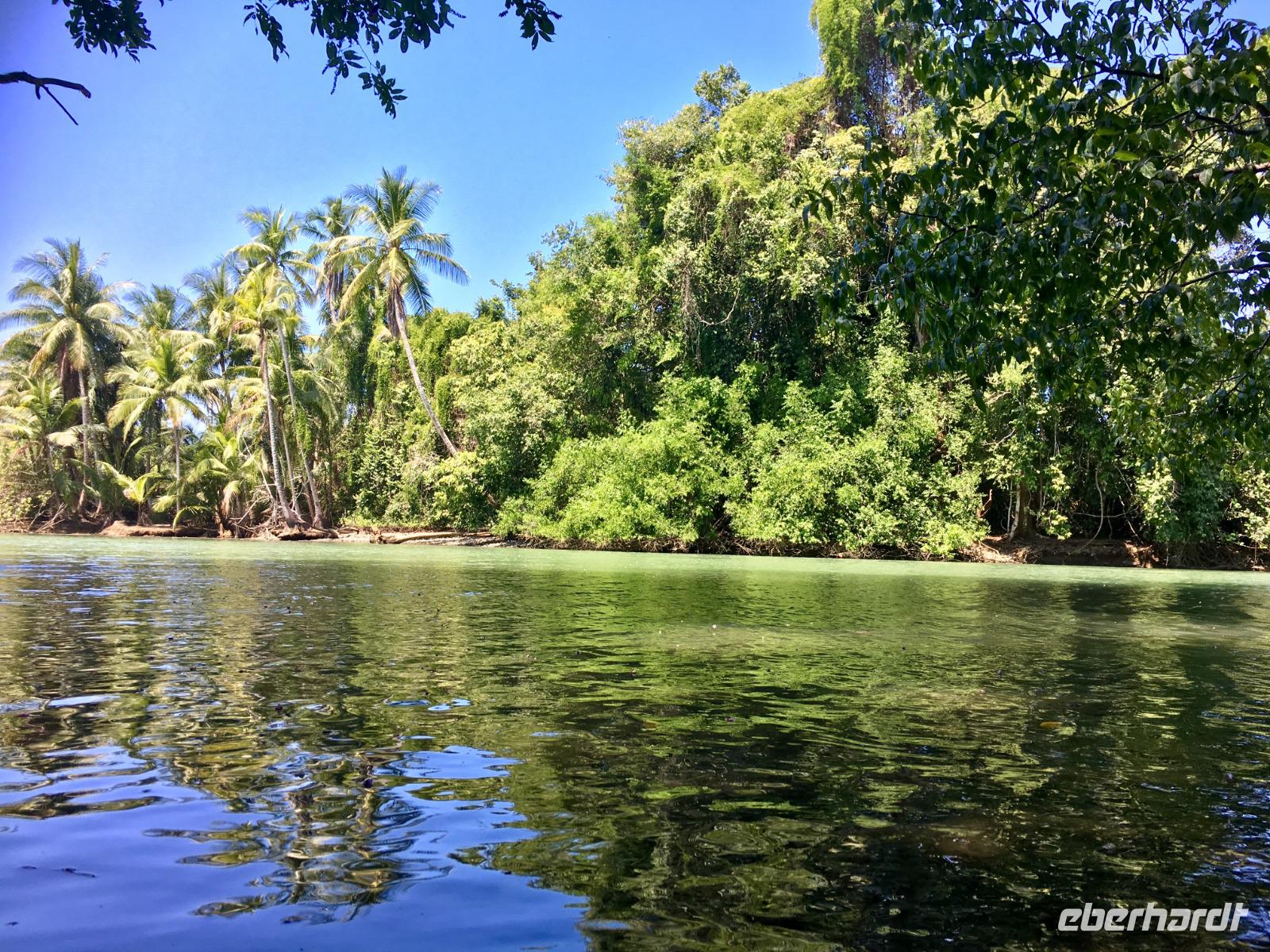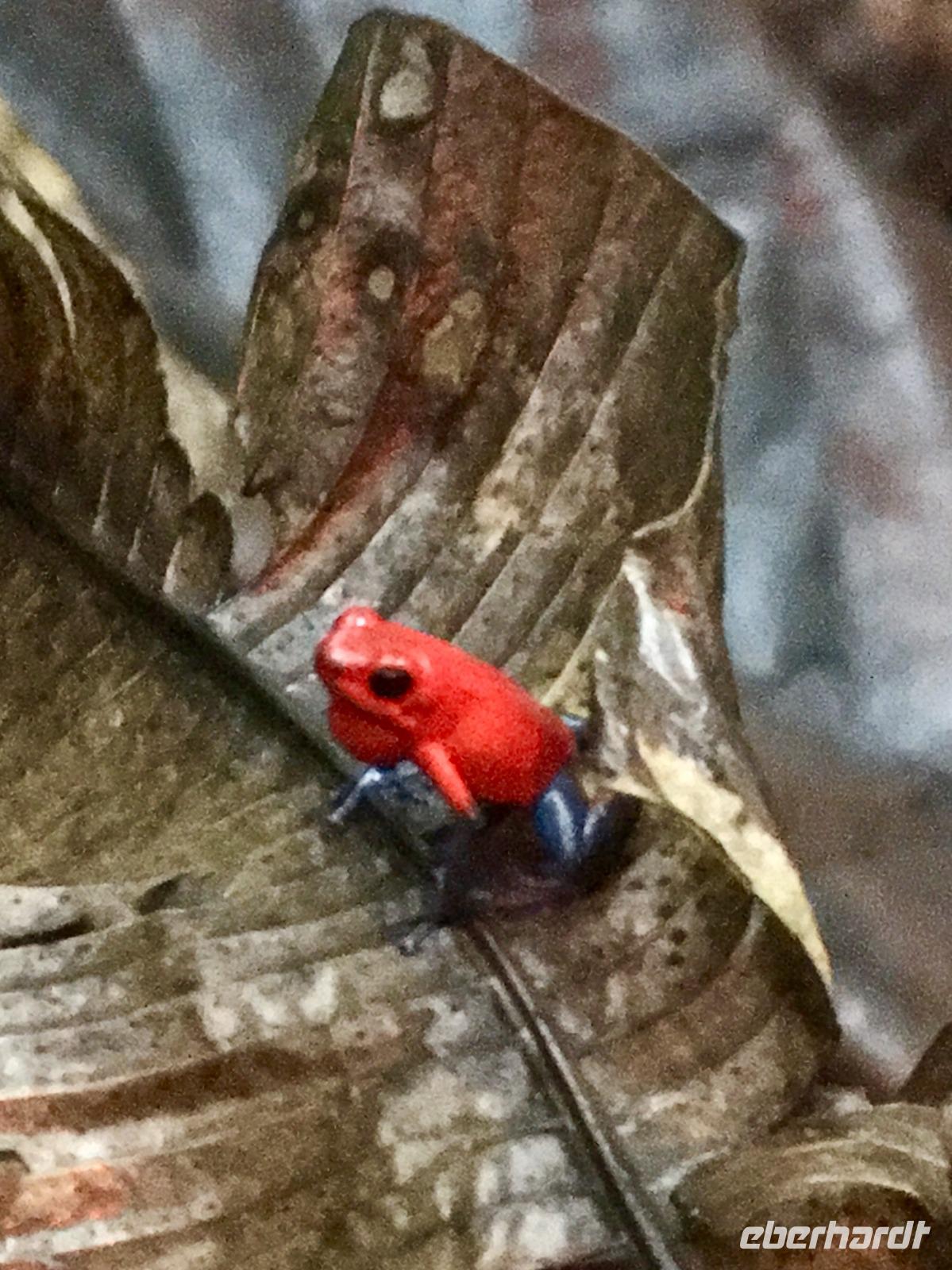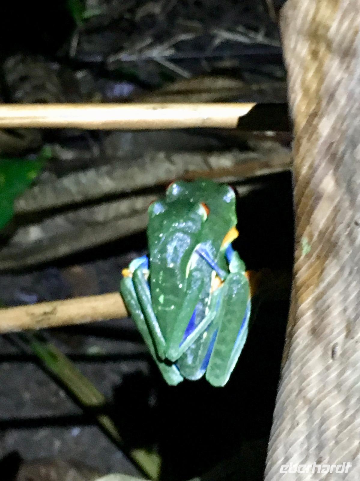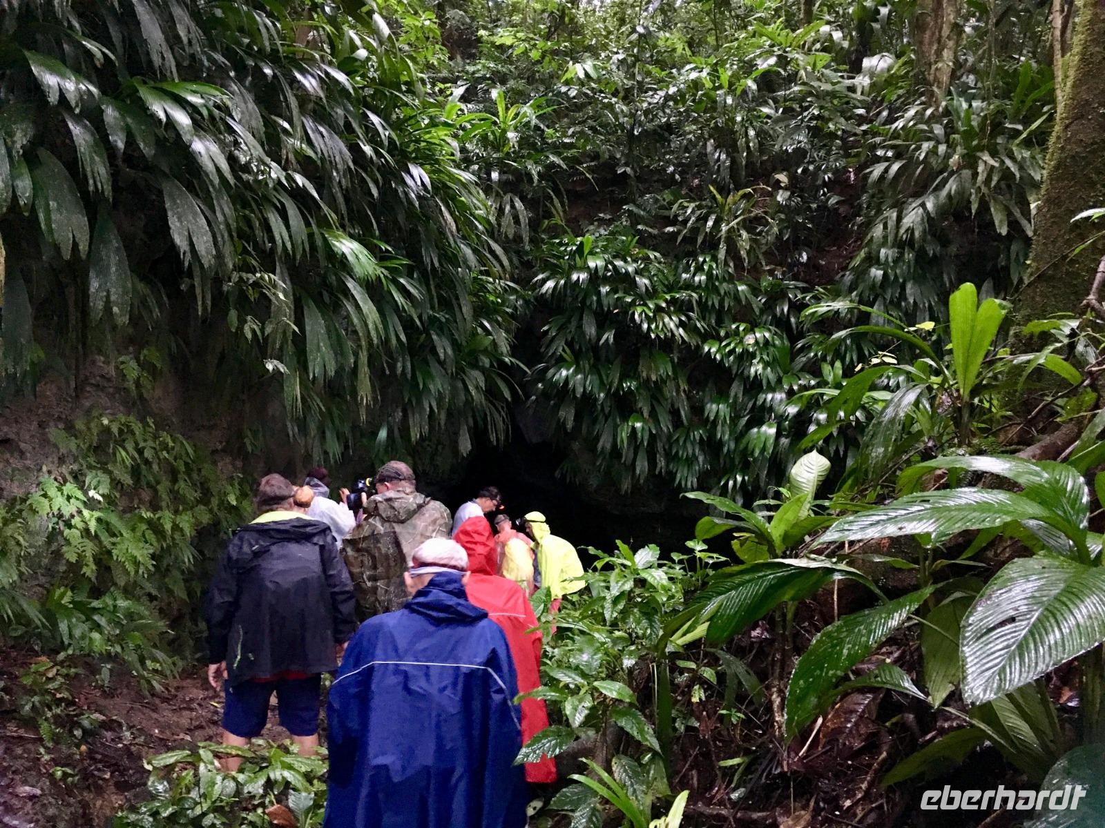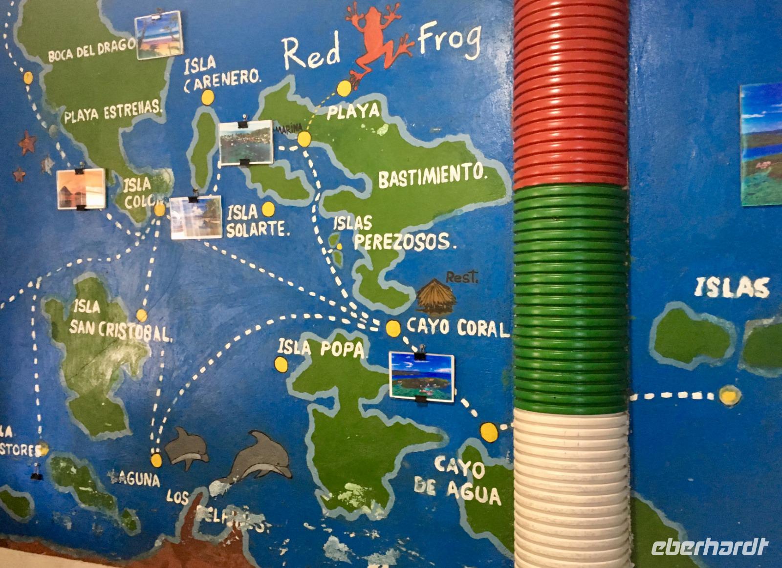 Die Suiten in diesem wunderbaren Hotel sind so schoen und gemuetlich und trotzdem freuen wir uns auf diesen Tag der Karibik. Blauer Himmel, super Fruehstueck gefolgt von kleinem Spaziergang zur Bootsanlegestelle. Dort wartet auch schon unser Kapitaen und er bringt noch eine blaue Plane aufs Gestell seines Motorbootes an. Aha, da drueben sind schon Wolken, oho zwei Minuten spaeter regnet es wie aus Kuebeln gegossen. Wir warten mal ab und siehe da, nach ca 15 Minuten hoert das prasseln wieder auf und wir steigen ins Boot ein. Los gehts in vollem Tempo durch die Inselwelt. Erst in den Mangroven fahren wir langsamer und langsamer bis zum Schrittempo, da der Wasserweg auch immer enger wird. Gespenstisch schaut es hier aus und dunkel. Ab und zu liegt wieder ein Faultier auf einem Ast, oder ein Voegelein hat sich verirrt, ein Kaiman lugt unter einer Wurzel hervor, zwei Krokodile kucken aus dem Teich wo ein Ibis gerade vorbeistolziert. Immer wieder sehen wir Einbaumkanus liegen und wundern uns wo deren Besitzer wohl sein moegen ? Hier, ein Indio-Mann steht auf einem Steg er laechelt uns zu und wir legen an. Unsere Tour im Regenwald kann beginnen. Erst wandern wir auf einem schmalen Pfad durch den Wald bis zu einer Hoehle. Au wei, soooo viele Fledermaeuse haengen da an den Waenden, bloss nicht WOW sagen und gleichzeitig hochgucken, meint unser Natur-Guide, denn die Fledermaeuse entleeren sich ploetzlich. Also gehen wir geschlossenen Mundes in die Hoehle hinein. Nur wenige, trauen sich bis weit in die Hoehle hinein, die anderen bleiben im Trockenen. Ploetzlich faengt draussen der Regen wieder an, aber wie. Hier uebernachten koennen wir nicht, also laufen wir so schnell wie moeglich auf dem, nun super matschigen und glitschigen, Weg zurueck zum Haus. Wie Lehmleute schauen wir aus und werden auch gleich abgespritzt zur Reinigung unserer Beine. Nur gut, dass es hier so warm ist, so trocknet alles wieder sehr schnell. Mit dem Motorboot gehts nun wieder aus dem Mangroven Wald hinaus auf eine andere Insel. Dort steht ein Restaurant auf Stelzen im Wasser wo wir auch unser Picknick einnehmen. Danke Eberhardt fuer das feine Bierchen dazu. Das Sandwich rutscht damit viel besser hinunter ! Die vielen Fische, die uns von unten zuschauen wollen wir nun auch mit der mitgebrachten Schnorchelausruestung gebuehrend betrachten. Das Wetter hat sich wieder erholt und die Fische tanzen um uns herum. Sogar einige schoene Korallen haben sich unter dem Restaurant angesiedelt. Unser Tag ist aber noch nicht zu Ende, mit dem Motorboot fahren wir nun wieder auf die Bastimientos Insel wo wir nun eine kleine Wanderung durch die Insel unternehmen um die roten Pfeilgiftfroesche zu sehen. Tatsaechlich sehen wir gleich mehrere. Jedes Froeschchen ist anders getupft aber allesamt sind sie leuchtend rot und sehr, sehr klein. Auf der anderen Inselseite ist der wunderbare Strand, idyllisch, romantisch, wild, wie auf einer Postkarte. Jeder geniesst die Stunde dort auf seine Art und Weise. Erst spaet nachmittags sind wir wieder zurueck in unserem schmucken Hotel. Was fuer ein ereignissreicher, toller Tag heute. Karibik pur. Das Abendessen mit Live Musik auf dem Wasser ist wieder koestlich. Ach wie schoen ist das Reisen.