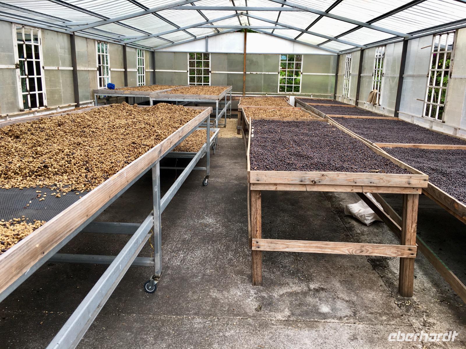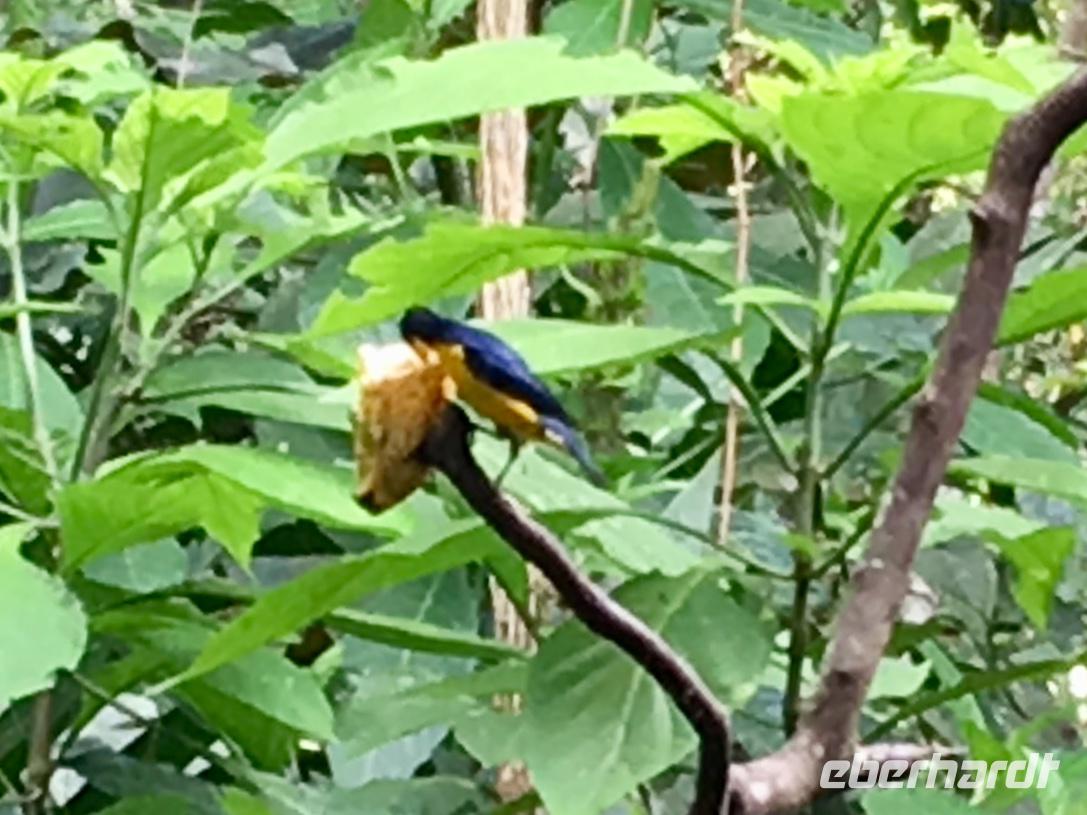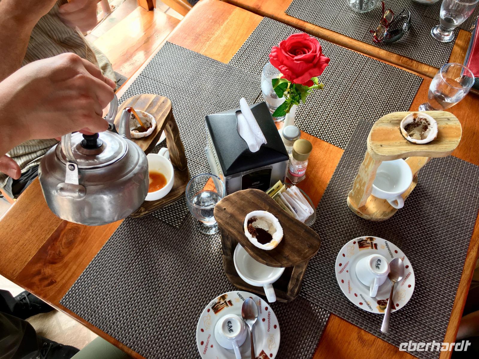Unser charismatischer Panama Guide Christian ist auch schon hier und bald gehts los auf das Boquete Abenteuer. Bei der Finca Larida halten wir und werden von Cesar dem hiesigen Pflanzen und Vogel-Guru begruesst. Was fuer ein toller Mann, er weiss alles und wir sind allesamt von seinem Wissen hingerissen. In den 3 Stunden haben wir wieder vieles dazugelernt. Kollibirs haben uns begleitet, Quetzals haben sich gezeigt, Nageschnaebler und Mini-Toukane haben wir gesehen, Haemmerlinge gehoert. Aber auch von Baeume wie die Esche mit ihrem Hartholz, Ortecacea welche schoene rote Traubenfruechte traegt, Wuergefeigen welche von oben nach unten wachsen, Taubenbaeume mit den schoenen gelben Blueten, Tomatenbaeume deren Fruechte Saft wir zum Mittagessen serviert bekommen haben, und von vielen anderen Pflanzen haben wir nun Kenntnis erhalten. Nach so einem erfolgreichen Erkundungsspaziergang, meldet sich unser Magen nun auch wieder. Das Mittagessen auf der Finca ist wie im Film. «out of Costa Rica, by Eberhardt Films». Auf einer herrlichen Terrasse mit Sicht auf den Garten gibt es 4 Sachen zur Auswahl. Mmmmhhh. Nach einem Stuendchen gehen wir auf die Kaffee-tour. Cesar erklaert uns ganz genau wie man Kaffee gewinnt, woher die Pflanze kommt, wie man darauf kam einen Kaffee zu brauen, wo er nun angepflanzt wird, welche Sorten, wie und wann und warum. Wir koennen nun schon selbst eine Plantage gruenden, so versiert sind wir in dem Fach. Danach haben wir noch eine Kaffee-verkostung, ja, wie Wein oder Bier, aber eben Kaffee. Einatmen, Sippen, Ausatmen, der Duft entfaltet...aaahhh. Der billigste Kaffee hat uns am besten geschmeckt, sorry, Cesar. Nun gibt es noch Kaffee und Kuchen ehe wir die Finca Lareida verlassen. Noch einen Stopp im Supermarkt in Boquete und dann «nach Hause» in unsere Lodge. Wir sind heute Selbstversorger. Traeumen werden wir wohl von den 4 Quetzal die wir heute gesichtet haben, wo wir wohl eine Finca finden koennten mit einer Kaffeeplantage und wie man schleunigst auch so klettern und kraxeln lernt wie Christian !