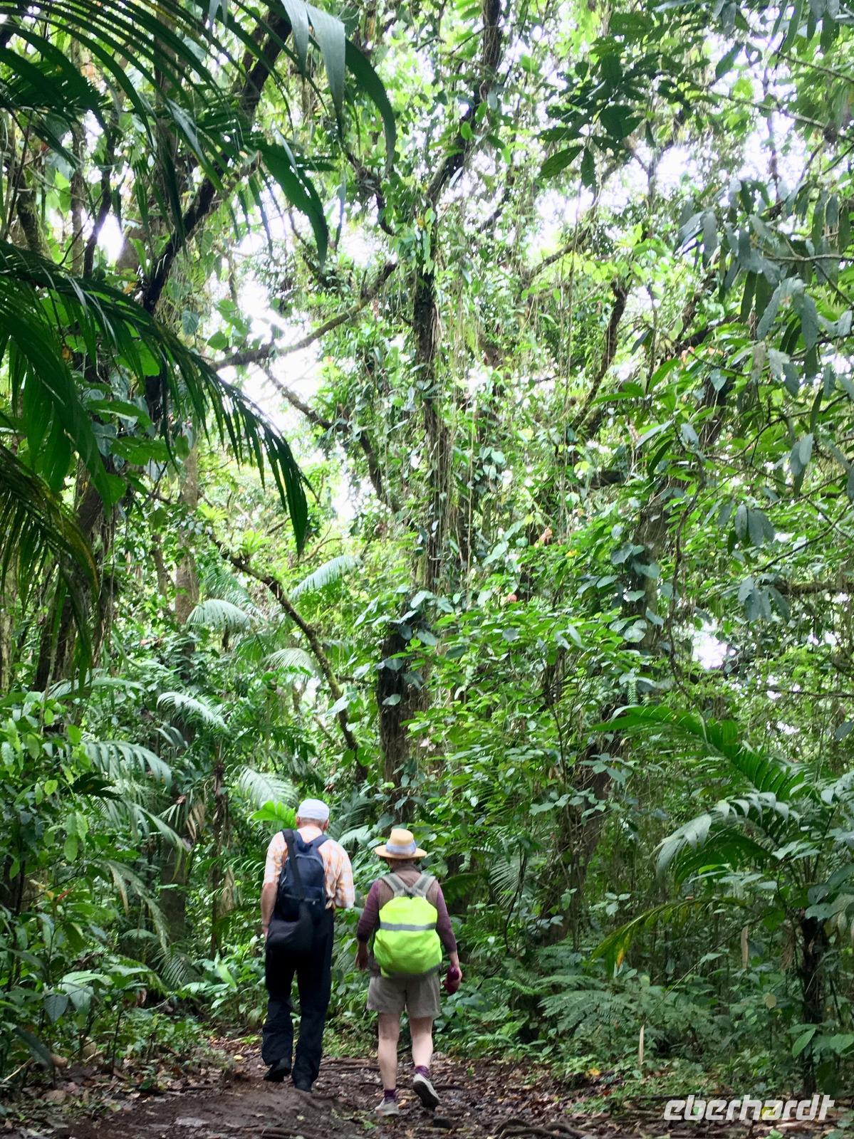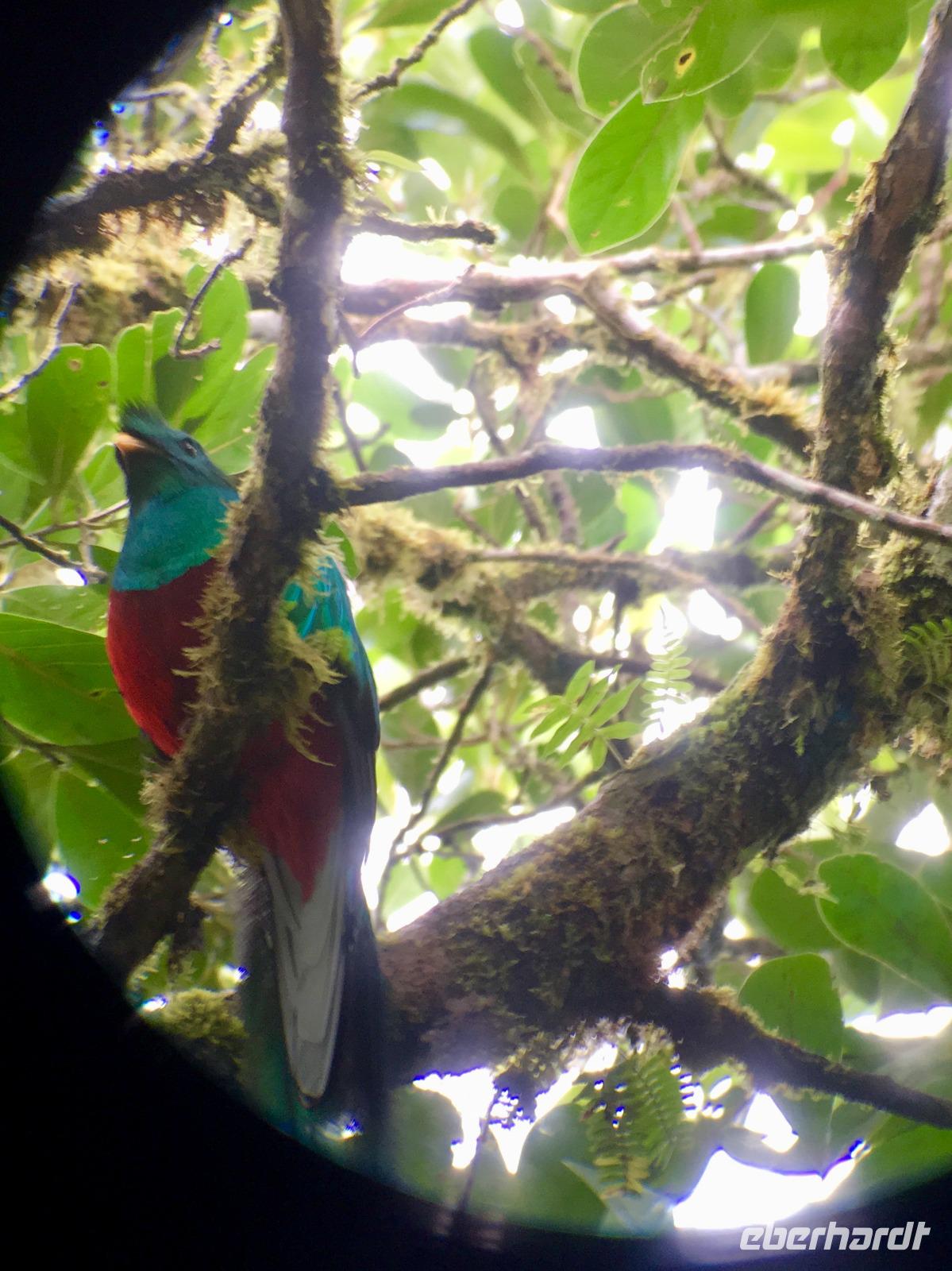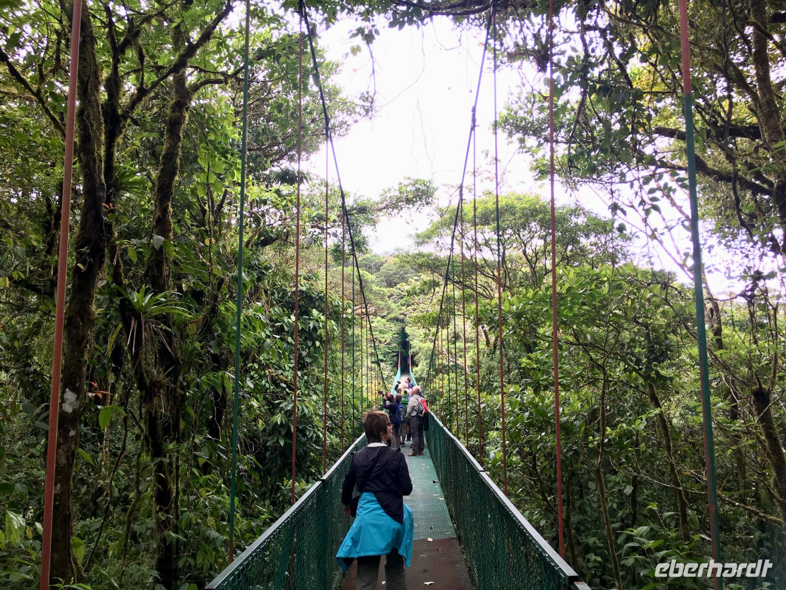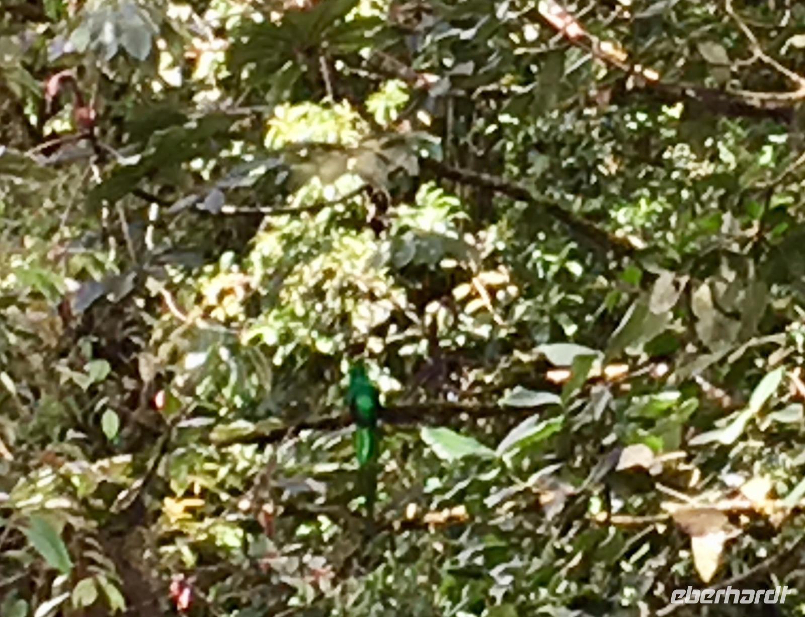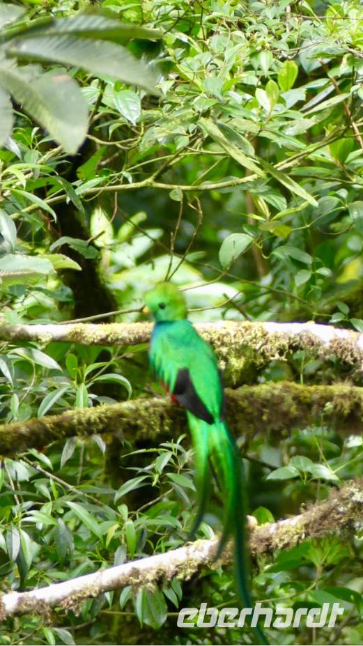 So wandern wir guckend, blickend und suchend durch den schoenen Wald, zuecken immer wieder die Kamera und erfreuen uns an dieser Pracht. Auf einemal auf einem breiteren Weg sehen wir viele Leute in die Baeume schauen. Einrohr Fernglaeser sind aufgestellt, keiner sagt was aber man spuert die Aufregung. Ein wunderschoener Quetzal sitzt in seiner vollen Pracht gut sichtbar auf SEINEM Ast. Er ist das Paradestueck der Voegel hier in Costa Rica und gluecklich ist jener der ihn sieht. Wie wir, die Auserwaehlte Eberhardt Gruppe (so fuehlen wir uns jedenfalls !) Lange bleiben wir dort und staunen ueber des Quetzals Schoenheit. Nicht lange danach gibt es wieder ein kleineres Grueppchen und schon wieder ein Quetzal ! So viel Glueck, wir koennen es kaum glauben. Jeder hat nun ein perfektes Bild und unsere Reise geht weiter. Ein halbes Stuendchen spaeter kommen wir in Salvatura Tree Top Walk an. 8 Bruecken und schoene Wege dazwischen fueren uns durch, und ueber diesen Urwald. Ein wunderbares Gefuehl ist es ueber diese hohen langen Haengebruecken zu gehen und die Welt von oben zu sehen. Der Bruellaffe weiss nicht, dass wir auch auf Baumspitzhoehe sind und frisst lustig an der Baumkrone weiter. Bald will er auf einen anderen Baum und spaziert etwa 2 Meter ueber unseren Koepfen hinueber. Ach wie schoen, er schaut uns sogar von oben an, und, plumps, entleert sich gerade zwischen 2 Damen !!! Wo bitte ist die Affen-Sitten-Polizei ! Wir lachen lauthals. OOOps nicht so laut lachen, denn die Vogelbeobachter unter uns haben weiter vorne auf der Bruecke in der Ferne einen seltenen Haemmerling gesichtet. Der zeigt sich nur sehr selten. Sein weisser Kopf ist in dem Dschungelgruen gut ersichtlich aber fuer die meisten Kameras ist er etwas weit entfernt. Er schaut eher wie ein Golfball auf Urlaub aus. Weiter gehen wir ueber all diese wundersamen Bruecken bis zur 8. Bruecke. Dort sehen wir noch einmal einen Quetzal, er sitzt ganz nahe, bewegt sich anfangs nicht, er schimmert in seinem gruenen Federkleid und sein langer eleganter Schweif tanzt im Wind. Was fuer ein Tag. Das Mittagessen schmeckt auch sehr fein und die Fahrt zum Hotel ist wieder holperig. Heute Nachmittag ist frei und einige unter uns treffen sich wieder zum Abendessen. Dieses Mal gehen wir ins beste Restaurant am Platz. Es ist koeslich. Danke Berny, danke Felix !