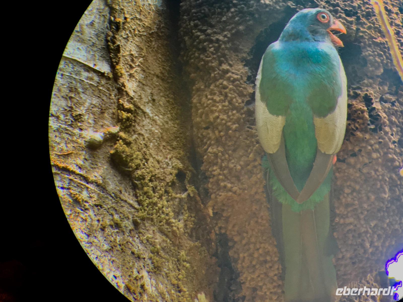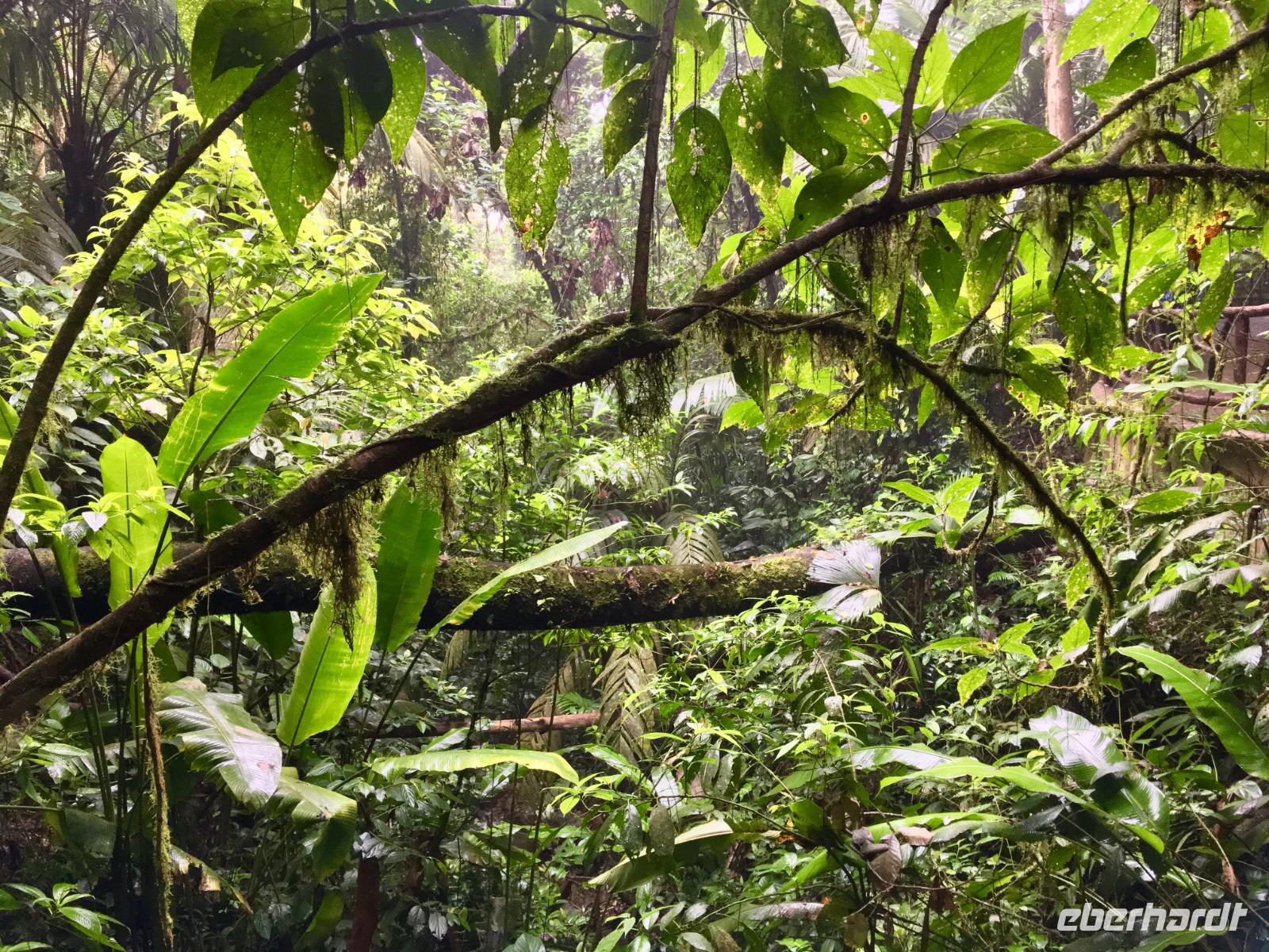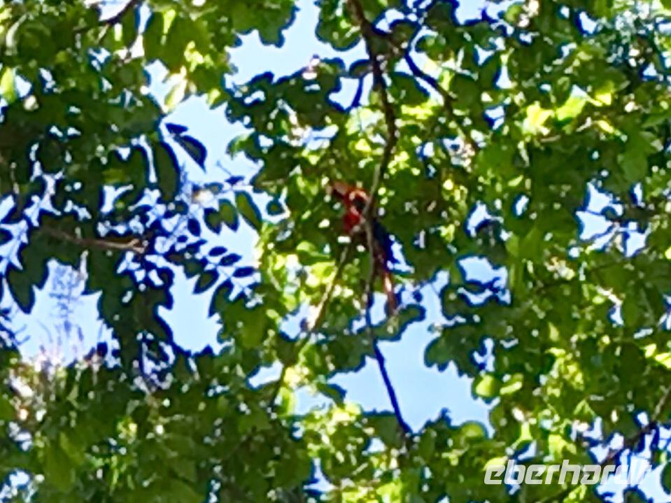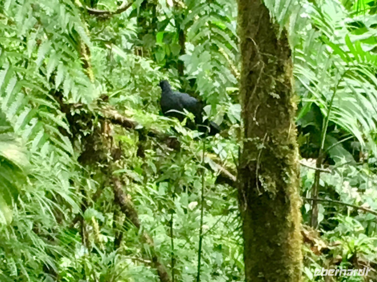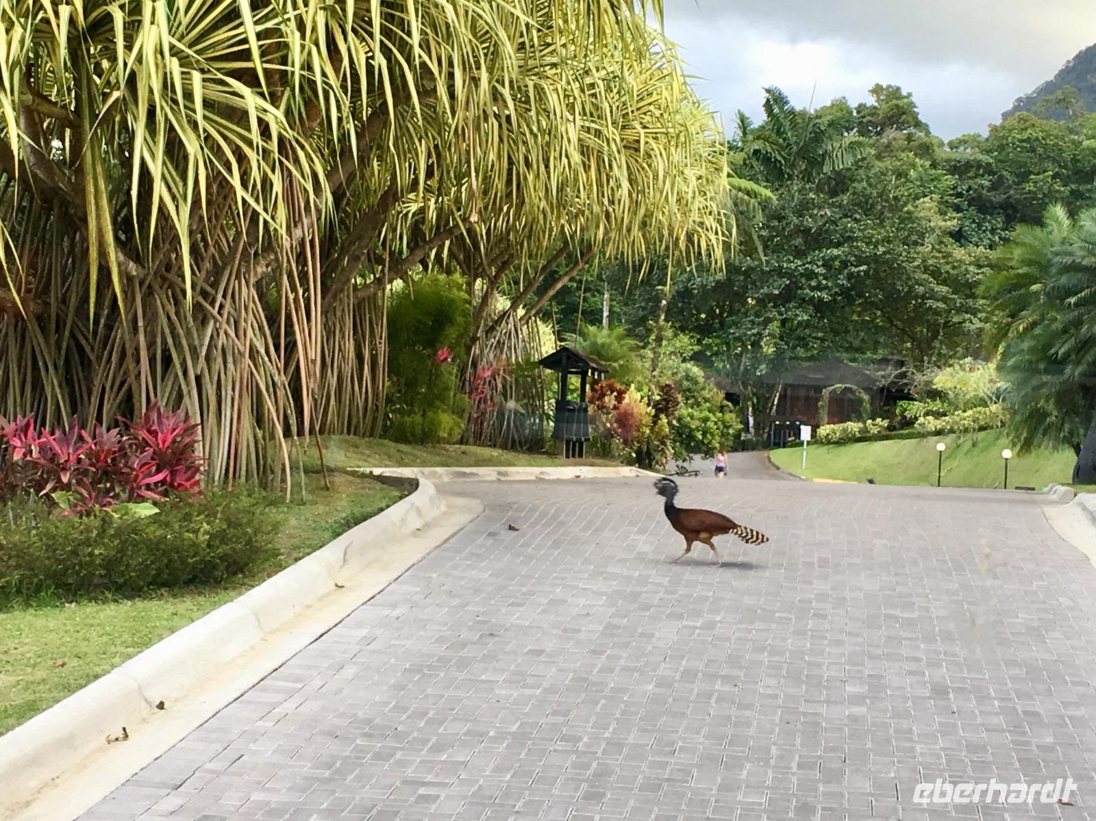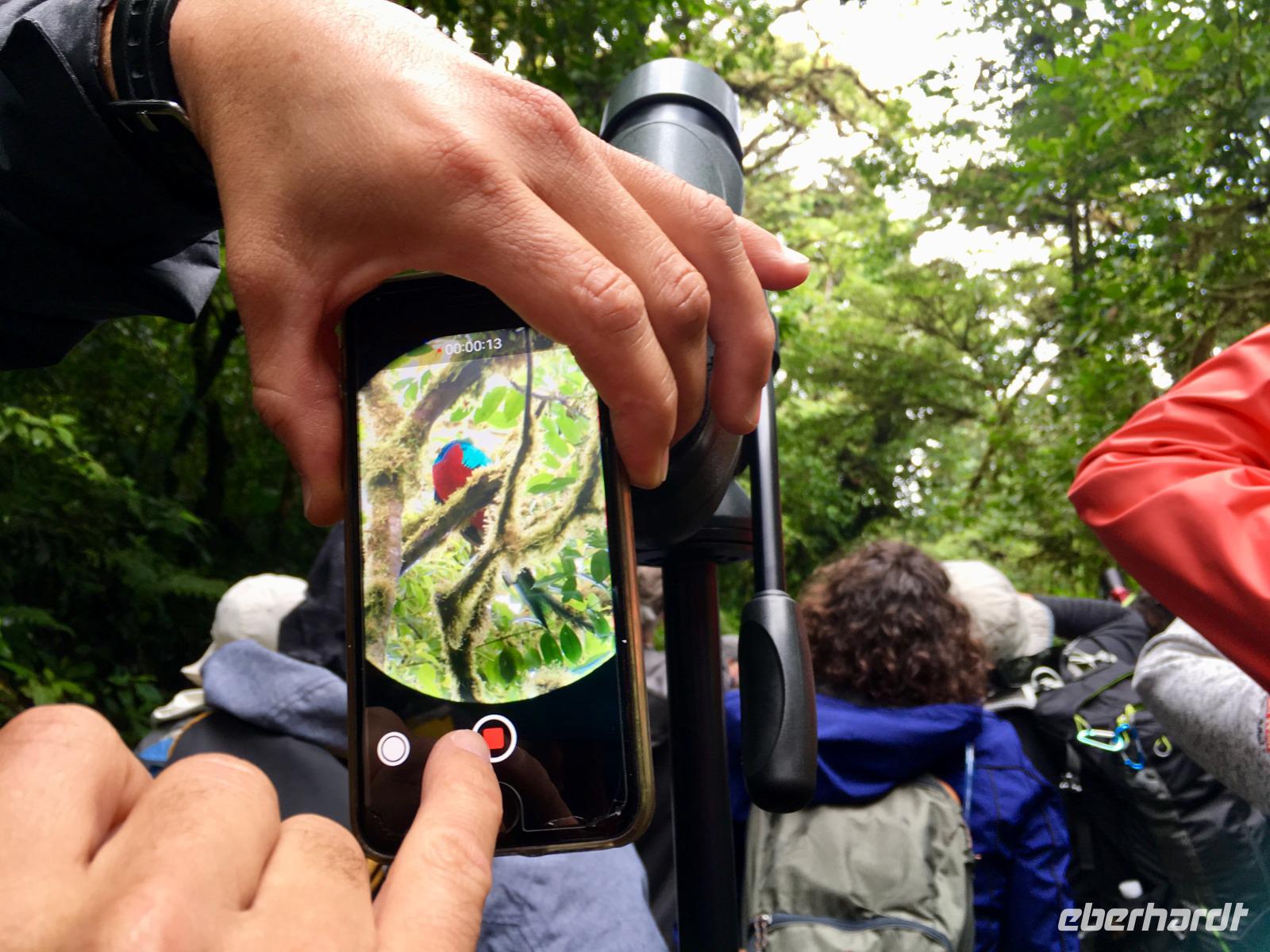 So wandern wir guckend, blickend und suchend durch den schoenen Wald, zuecken immer wieder die Kamera und erfreuen uns an dieser Pracht. Auf einemal auf einem breiteren Weg sehen wir viele Leute in die Baeume schauen. Einrohr Fernglaeser sind aufgestellt, keiner sagt was aber man spuert die Aufregung. Ein wunderschoener Quetzal sitzt in seiner vollen Pracht gut sichtbar auf SEINEM Ast. Er ist das Paradestueck der Voegel hier in Costa Rica und gluecklich ist jener der ihn sieht. Wie wir, die Auserwaehlte Eberhardt Gruppe (so fuehlen wir uns jedenfalls !) Lange bleiben wir dort und staunen ueber des Quetzals Schoenheit. Nicht lange danach gibt es wieder ein kleineres Grueppchen und schon wieder ein Quetzal ! So viel Glueck, wir koennen es kaum glauben. Jeder hat nun ein perfektes Bild und unsere Reise geht weiter. Ein halbes Stuendchen spaeter kommen wir in Salvatura Tree Top Walk an. 8 Bruecken und schoene Wege dazwischen fueren uns durch, und ueber diesen Urwald. Ein wunderbares Gefuehl ist es ueber diese hohen langen Haengebruecken zu gehen und die Welt von oben zu sehen. Der Bruellaffe weiss nicht, dass wir auch auf Baumspitzhoehe sind und frisst lustig an der Baumkrone weiter. Bald will er auf einen anderen Baum und spaziert etwa 2 Meter ueber unseren Koepfen hinueber. Ach wie schoen, er schaut uns sogar von oben an, und, plumps, entleert sich gerade zwischen 2 Damen !!! Wo bitte ist die Affen-Sitten-Polizei ! Wir lachen lauthals. OOOps nicht so laut lachen, denn die Vogelbeobachter unter uns haben weiter vorne auf der Bruecke in der Ferne einen seltenen Haemmerling gesichtet. Der zeigt sich nur sehr selten. Sein weisser Kopf ist in dem Dschungelgruen gut ersichtlich aber fuer die meisten Kameras ist er etwas weit entfernt. Er schaut eher wie ein Golfball auf Urlaub aus. Weiter gehen wir ueber all diese wundersamen Bruecken bis zur 8. Bruecke. Dort sehen wir noch einmal einen Quetzal, er sitzt ganz nahe, bewegt sich anfangs nicht, er schimmert in seinem gruenen Federkleid und sein langer eleganter Schweif tanzt im Wind. Was fuer ein Tag. Das Mittagessen schmeckt auch sehr fein und die Fahrt zum Hotel ist wieder holperig. Heute Nachmittag ist frei und einige unter uns treffen sich wieder zum Abendessen. Dieses Mal gehen wir ins beste Restaurant am Platz. Es ist koeslich. Danke Berny, danke Felix !