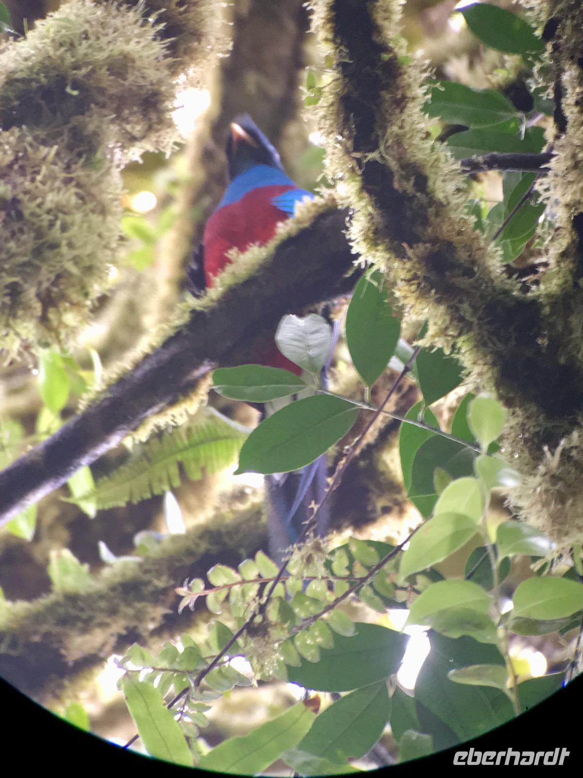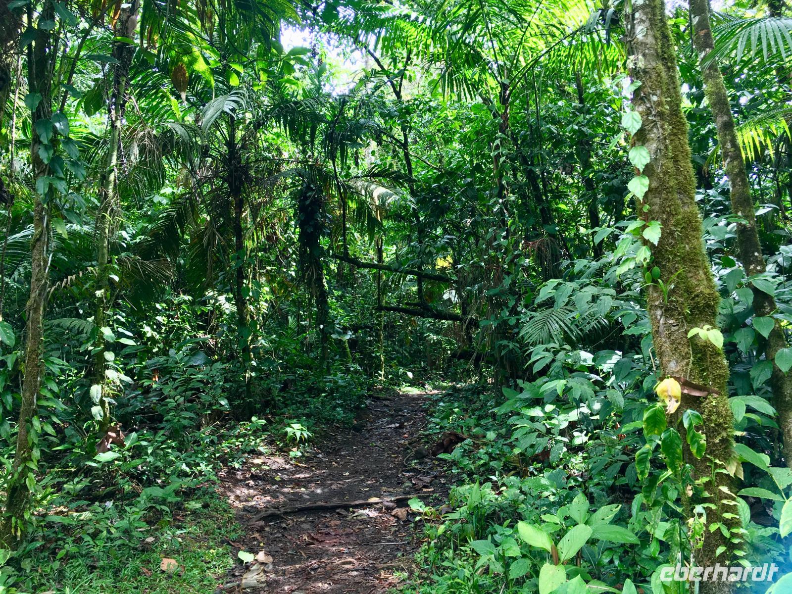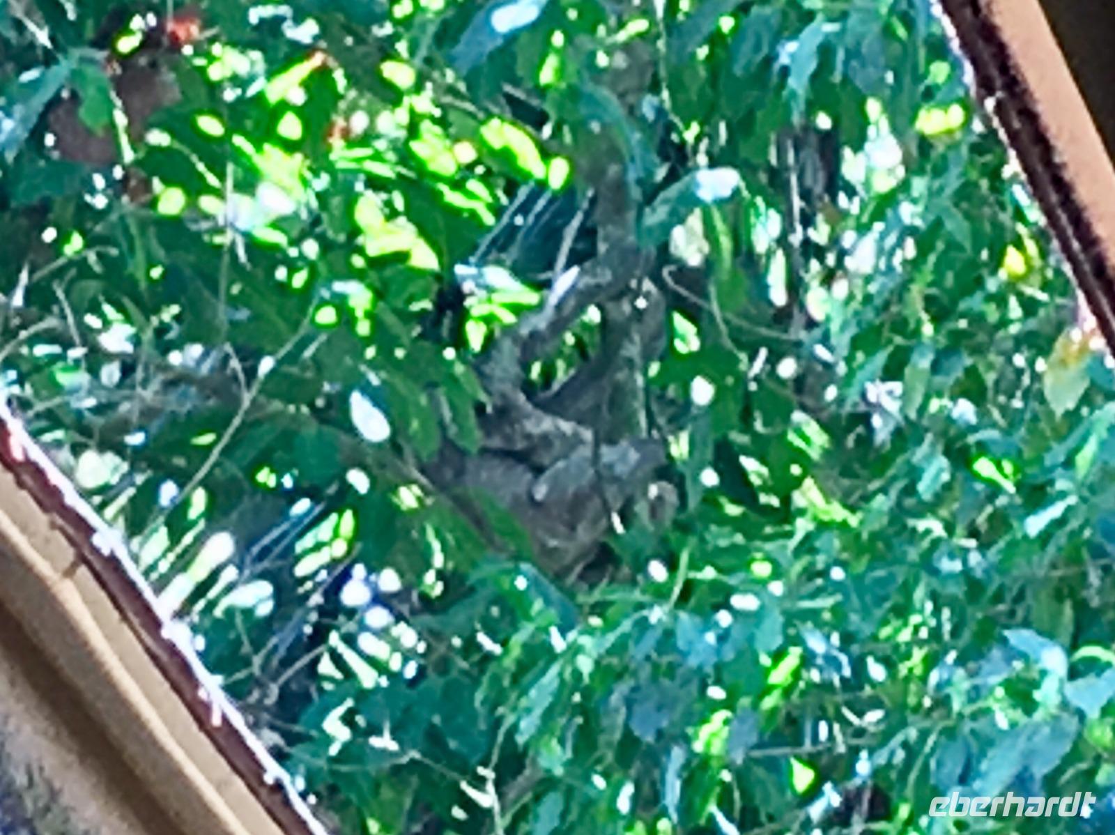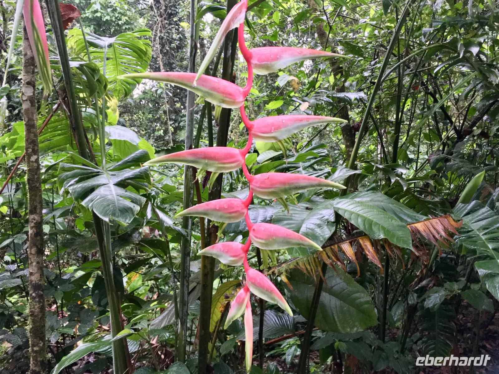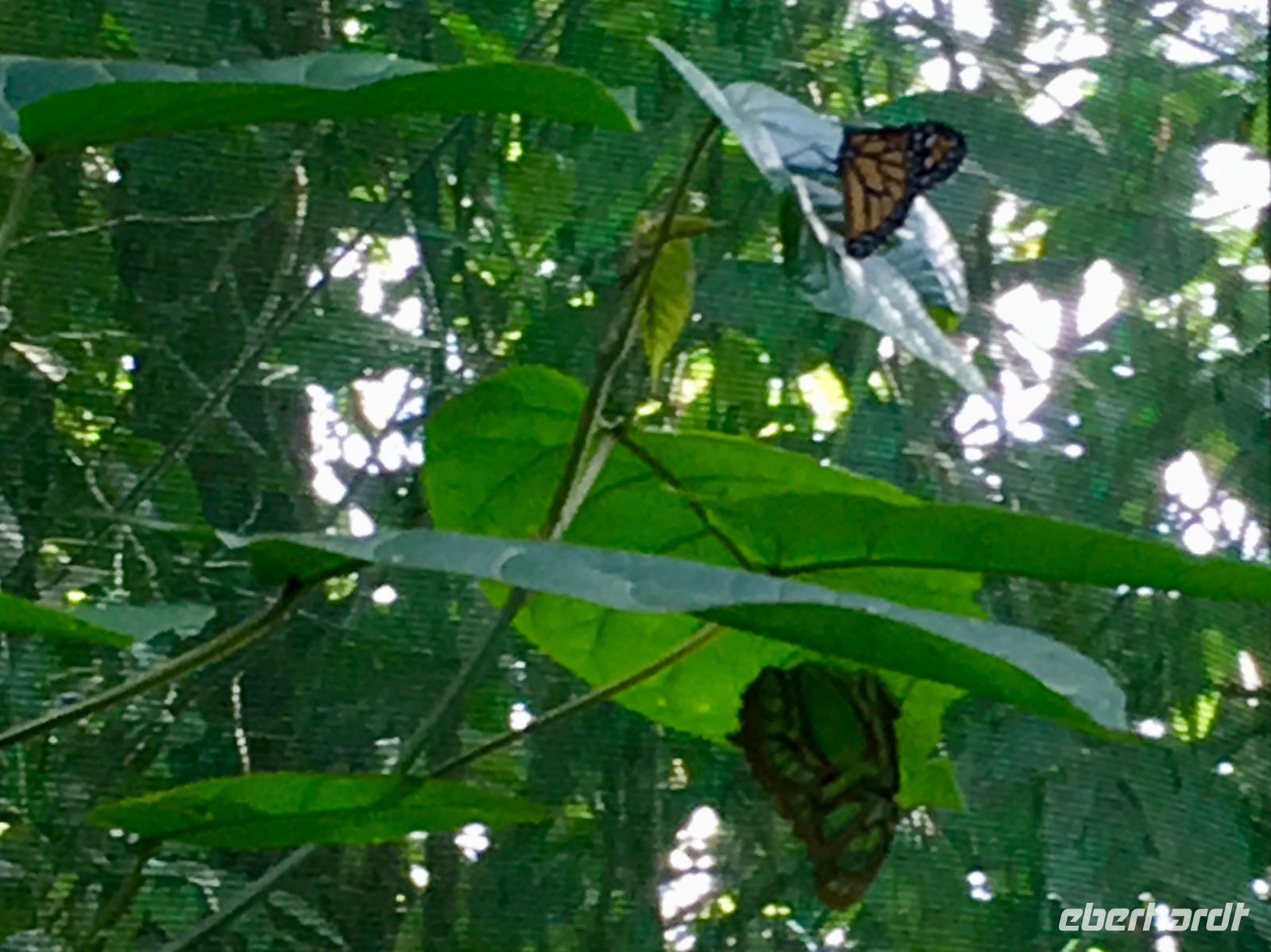 So wandern wir guckend, blickend und suchend durch den schoenen Wald, zuecken immer wieder die Kamera und erfreuen uns an dieser Pracht. Auf einemal auf einem breiteren Weg sehen wir viele Leute in die Baeume schauen. Einrohr Fernglaeser sind aufgestellt, keiner sagt was aber man spuert die Aufregung. Ein wunderschoener Quetzal sitzt in seiner vollen Pracht gut sichtbar auf SEINEM Ast. Er ist das Paradestueck der Voegel hier in Costa Rica und gluecklich ist jener der ihn sieht. Wie wir, die Auserwaehlte Eberhardt Gruppe (so fuehlen wir uns jedenfalls !) Lange bleiben wir dort und staunen ueber des Quetzals Schoenheit. Nicht lange danach gibt es wieder ein kleineres Grueppchen und schon wieder ein Quetzal ! So viel Glueck, wir koennen es kaum glauben. Jeder hat nun ein perfektes Bild und unsere Reise geht weiter. Ein halbes Stuendchen spaeter kommen wir in Salvatura Tree Top Walk an. 8 Bruecken und schoene Wege dazwischen fueren uns durch, und ueber diesen Urwald. Ein wunderbares Gefuehl ist es ueber diese hohen langen Haengebruecken zu gehen und die Welt von oben zu sehen. Der Bruellaffe weiss nicht, dass wir auch auf Baumspitzhoehe sind und frisst lustig an der Baumkrone weiter. Bald will er auf einen anderen Baum und spaziert etwa 2 Meter ueber unseren Koepfen hinueber. Ach wie schoen, er schaut uns sogar von oben an, und, plumps, entleert sich gerade zwischen 2 Damen !!! Wo bitte ist die Affen-Sitten-Polizei ! Wir lachen lauthals. OOOps nicht so laut lachen, denn die Vogelbeobachter unter uns haben weiter vorne auf der Bruecke in der Ferne einen seltenen Haemmerling gesichtet. Der zeigt sich nur sehr selten. Sein weisser Kopf ist in dem Dschungelgruen gut ersichtlich aber fuer die meisten Kameras ist er etwas weit entfernt. Er schaut eher wie ein Golfball auf Urlaub aus. Weiter gehen wir ueber all diese wundersamen Bruecken bis zur 8. Bruecke. Dort sehen wir noch einmal einen Quetzal, er sitzt ganz nahe, bewegt sich anfangs nicht, er schimmert in seinem gruenen Federkleid und sein langer eleganter Schweif tanzt im Wind. Was fuer ein Tag. Das Mittagessen schmeckt auch sehr fein und die Fahrt zum Hotel ist wieder holperig. Heute Nachmittag ist frei und einige unter uns treffen sich wieder zum Abendessen. Dieses Mal gehen wir ins beste Restaurant am Platz. Es ist koeslich. Danke Berny, danke Felix !