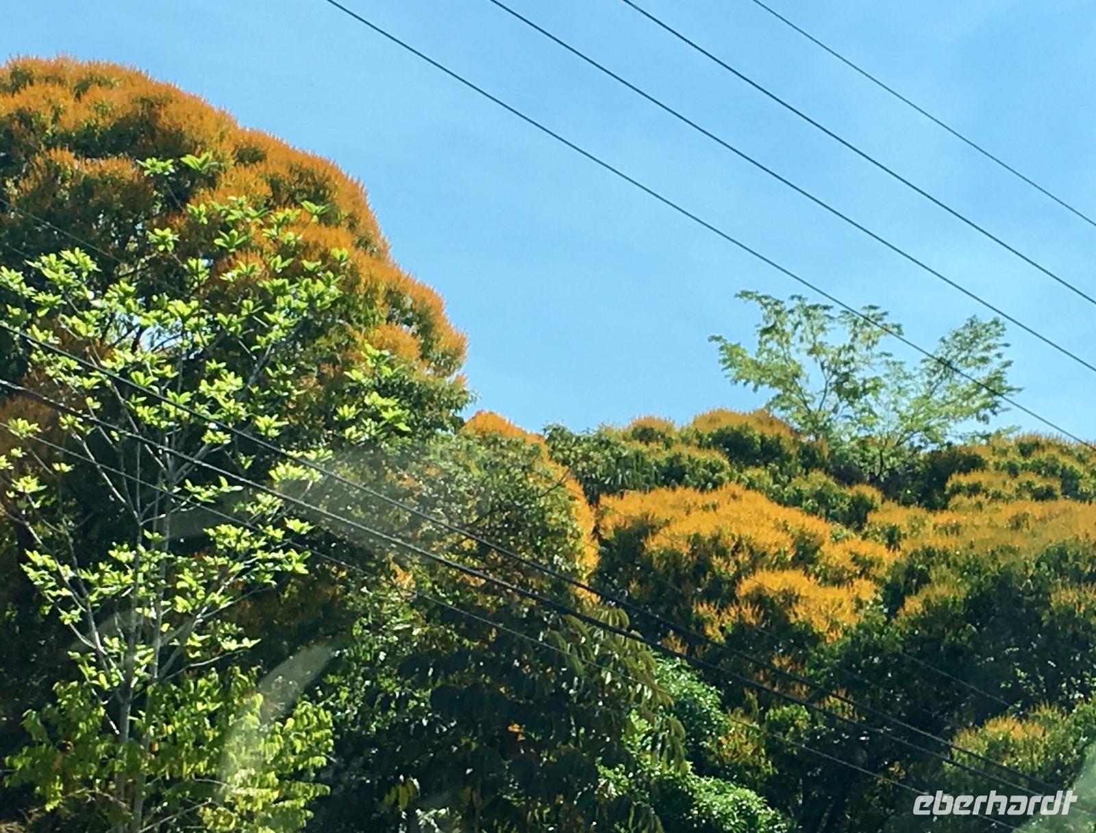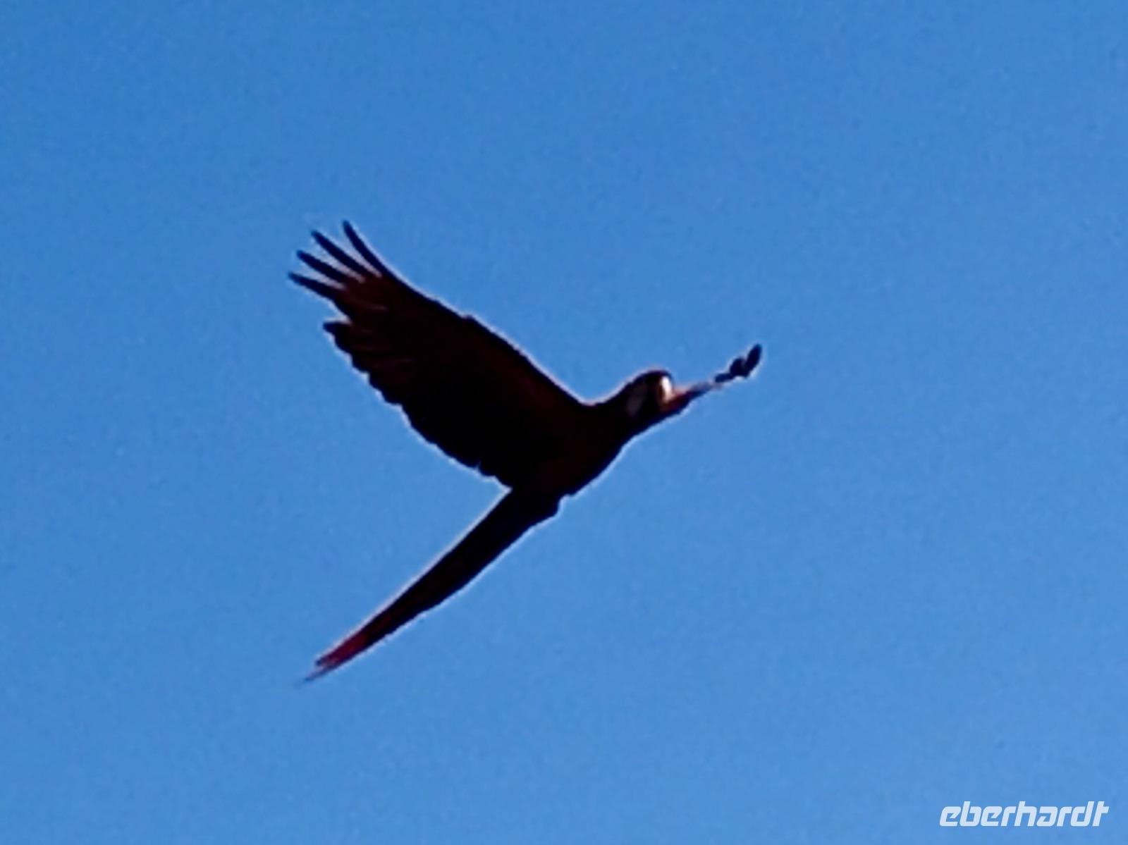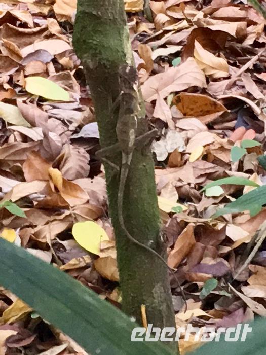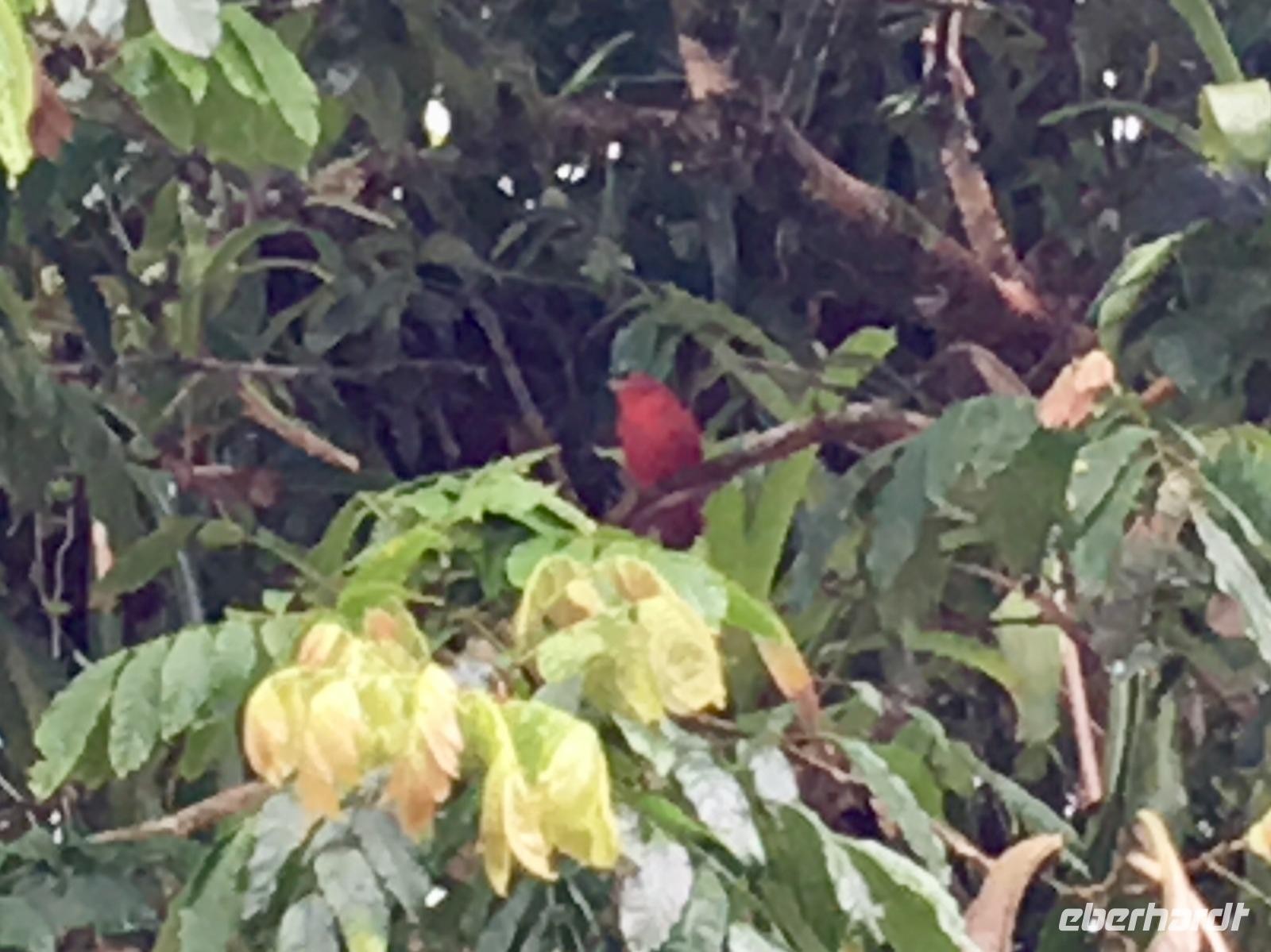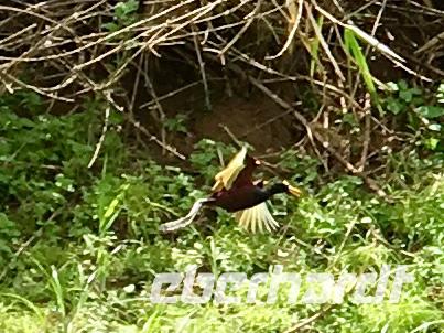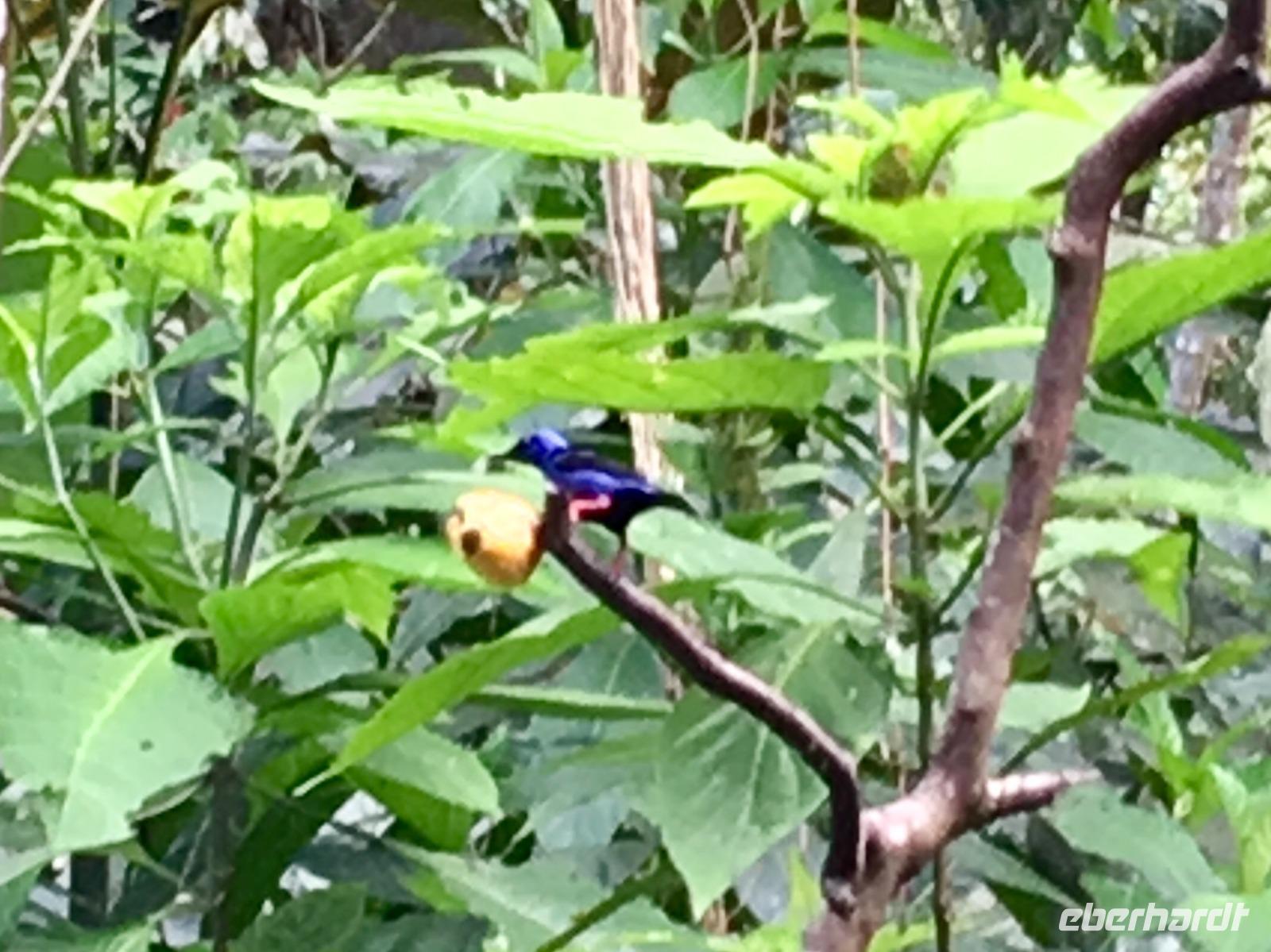 So wandern wir guckend, blickend und suchend durch den schoenen Wald, zuecken immer wieder die Kamera und erfreuen uns an dieser Pracht. Auf einemal auf einem breiteren Weg sehen wir viele Leute in die Baeume schauen. Einrohr Fernglaeser sind aufgestellt, keiner sagt was aber man spuert die Aufregung. Ein wunderschoener Quetzal sitzt in seiner vollen Pracht gut sichtbar auf SEINEM Ast. Er ist das Paradestueck der Voegel hier in Costa Rica und gluecklich ist jener der ihn sieht. Wie wir, die Auserwaehlte Eberhardt Gruppe (so fuehlen wir uns jedenfalls !) Lange bleiben wir dort und staunen ueber des Quetzals Schoenheit. Nicht lange danach gibt es wieder ein kleineres Grueppchen und schon wieder ein Quetzal ! So viel Glueck, wir koennen es kaum glauben. Jeder hat nun ein perfektes Bild und unsere Reise geht weiter. Ein halbes Stuendchen spaeter kommen wir in Salvatura Tree Top Walk an. 8 Bruecken und schoene Wege dazwischen fueren uns durch, und ueber diesen Urwald. Ein wunderbares Gefuehl ist es ueber diese hohen langen Haengebruecken zu gehen und die Welt von oben zu sehen. Der Bruellaffe weiss nicht, dass wir auch auf Baumspitzhoehe sind und frisst lustig an der Baumkrone weiter. Bald will er auf einen anderen Baum und spaziert etwa 2 Meter ueber unseren Koepfen hinueber. Ach wie schoen, er schaut uns sogar von oben an, und, plumps, entleert sich gerade zwischen 2 Damen !!! Wo bitte ist die Affen-Sitten-Polizei ! Wir lachen lauthals. OOOps nicht so laut lachen, denn die Vogelbeobachter unter uns haben weiter vorne auf der Bruecke in der Ferne einen seltenen Haemmerling gesichtet. Der zeigt sich nur sehr selten. Sein weisser Kopf ist in dem Dschungelgruen gut ersichtlich aber fuer die meisten Kameras ist er etwas weit entfernt. Er schaut eher wie ein Golfball auf Urlaub aus. Weiter gehen wir ueber all diese wundersamen Bruecken bis zur 8. Bruecke. Dort sehen wir noch einmal einen Quetzal, er sitzt ganz nahe, bewegt sich anfangs nicht, er schimmert in seinem gruenen Federkleid und sein langer eleganter Schweif tanzt im Wind. Was fuer ein Tag. Das Mittagessen schmeckt auch sehr fein und die Fahrt zum Hotel ist wieder holperig. Heute Nachmittag ist frei und einige unter uns treffen sich wieder zum Abendessen. Dieses Mal gehen wir ins beste Restaurant am Platz. Es ist koeslich. Danke Berny, danke Felix !