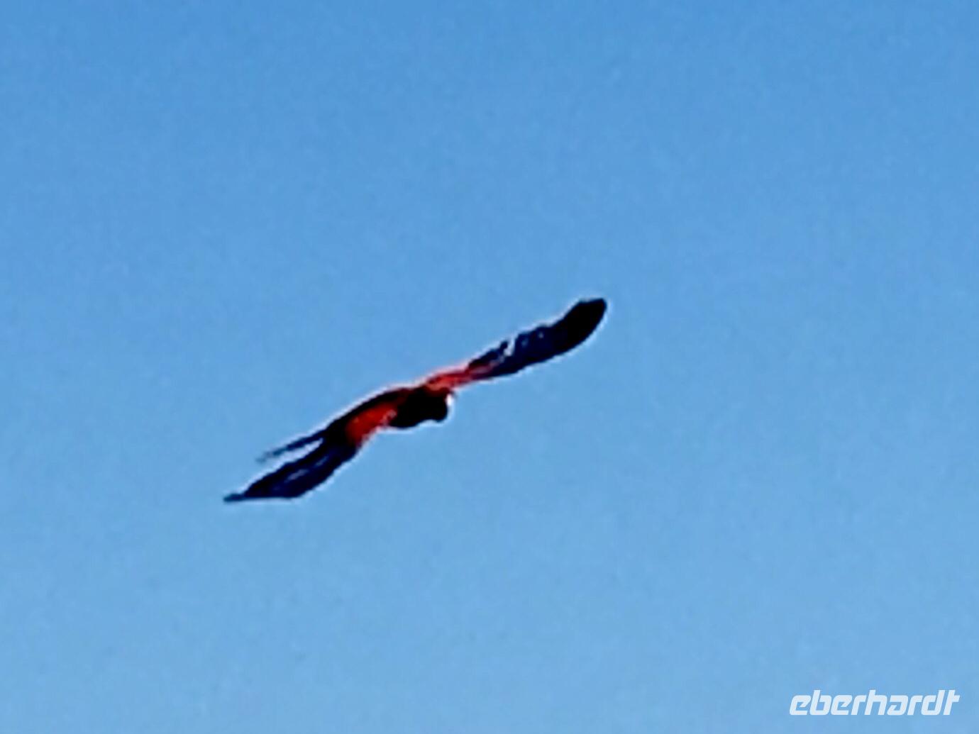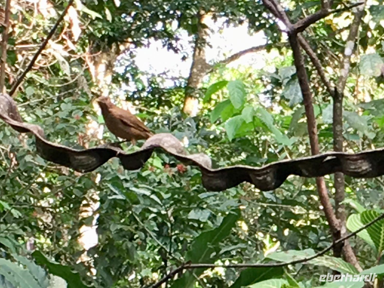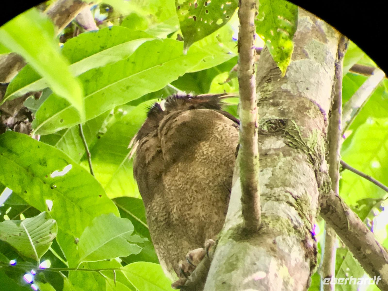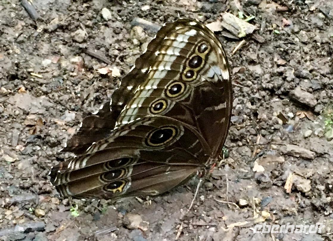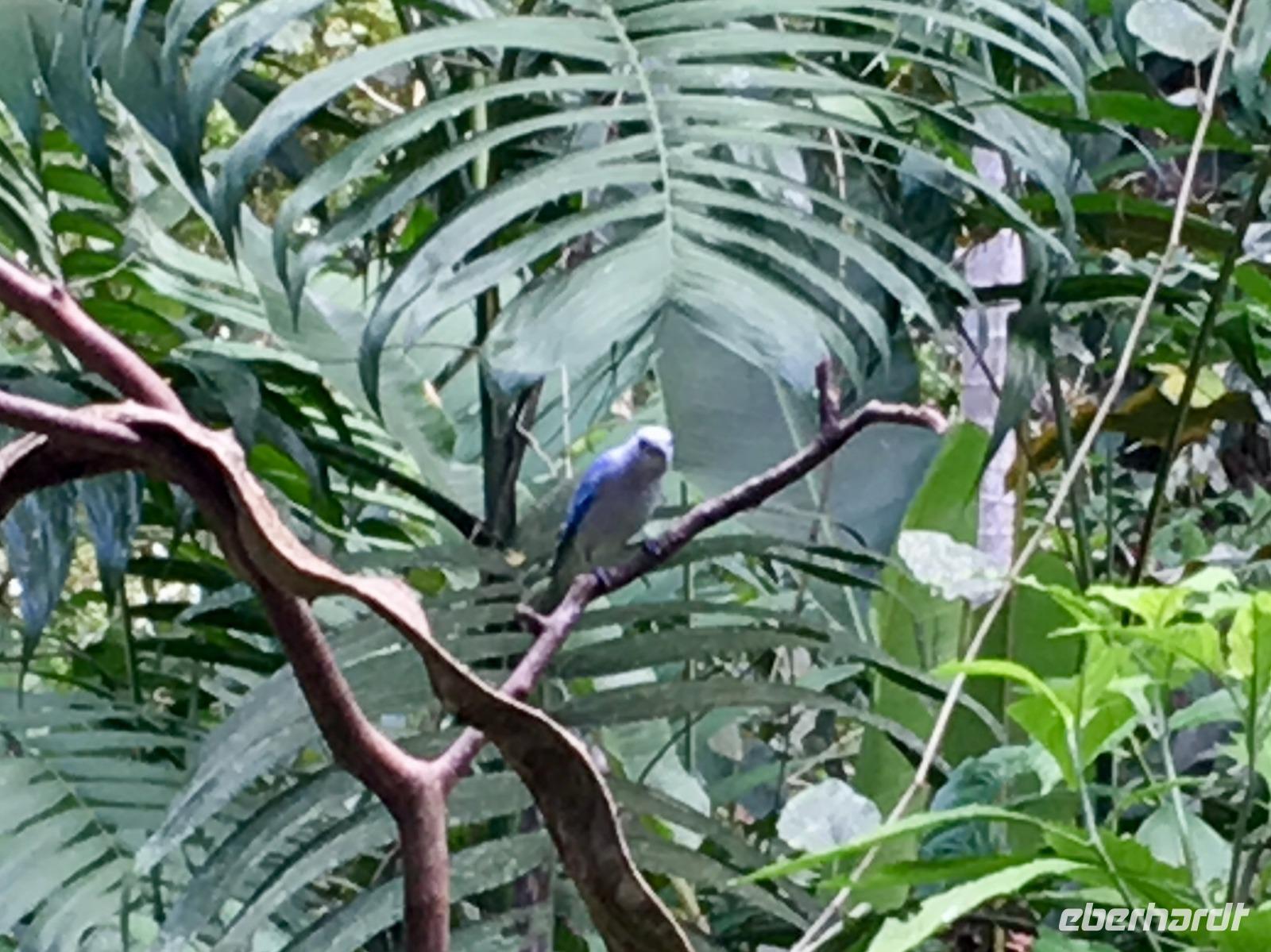So wandern wir guckend, blickend und suchend durch den schoenen Wald, zuecken immer wieder die Kamera und erfreuen uns an dieser Pracht. Auf einemal auf einem breiteren Weg sehen wir viele Leute in die Baeume schauen. Einrohr Fernglaeser sind aufgestellt, keiner sagt was aber man spuert die Aufregung. Ein wunderschoener Quetzal sitzt in seiner vollen Pracht gut sichtbar auf SEINEM Ast. Er ist das Paradestueck der Voegel hier in Costa Rica und gluecklich ist jener der ihn sieht. Wie wir, die Auserwaehlte Eberhardt Gruppe (so fuehlen wir uns jedenfalls !) Lange bleiben wir dort und staunen ueber des Quetzals Schoenheit. Nicht lange danach gibt es wieder ein kleineres Grueppchen und schon wieder ein Quetzal ! So viel Glueck, wir koennen es kaum glauben. Jeder hat nun ein perfektes Bild und unsere Reise geht weiter. Ein halbes Stuendchen spaeter kommen wir in Salvatura Tree Top Walk an. 8 Bruecken und schoene Wege dazwischen fueren uns durch, und ueber diesen Urwald. Ein wunderbares Gefuehl ist es ueber diese hohen langen Haengebruecken zu gehen und die Welt von oben zu sehen. Der Bruellaffe weiss nicht, dass wir auch auf Baumspitzhoehe sind und frisst lustig an der Baumkrone weiter. Bald will er auf einen anderen Baum und spaziert etwa 2 Meter ueber unseren Koepfen hinueber. Ach wie schoen, er schaut uns sogar von oben an, und, plumps, entleert sich gerade zwischen 2 Damen !!! Wo bitte ist die Affen-Sitten-Polizei ! Wir lachen lauthals. OOOps nicht so laut lachen, denn die Vogelbeobachter unter uns haben weiter vorne auf der Bruecke in der Ferne einen seltenen Haemmerling gesichtet. Der zeigt sich nur sehr selten. Sein weisser Kopf ist in dem Dschungelgruen gut ersichtlich aber fuer die meisten Kameras ist er etwas weit entfernt. Er schaut eher wie ein Golfball auf Urlaub aus. Weiter gehen wir ueber all diese wundersamen Bruecken bis zur 8. Bruecke. Dort sehen wir noch einmal einen Quetzal, er sitzt ganz nahe, bewegt sich anfangs nicht, er schimmert in seinem gruenen Federkleid und sein langer eleganter Schweif tanzt im Wind. Was fuer ein Tag. Das Mittagessen schmeckt auch sehr fein und die Fahrt zum Hotel ist wieder holperig. Heute Nachmittag ist frei und einige unter uns treffen sich wieder zum Abendessen. Dieses Mal gehen wir ins beste Restaurant am Platz. Es ist koeslich. Danke Berny, danke Felix !