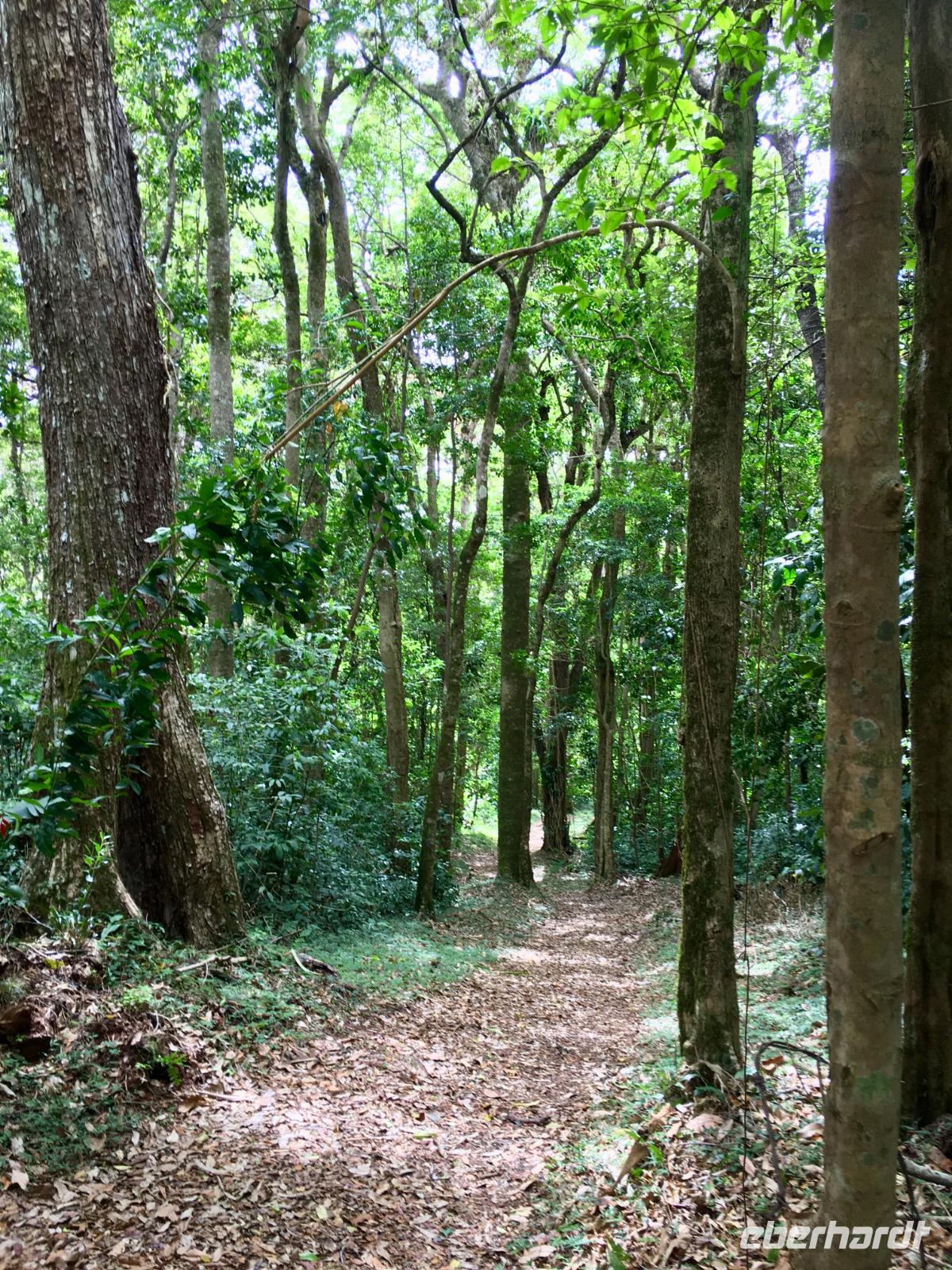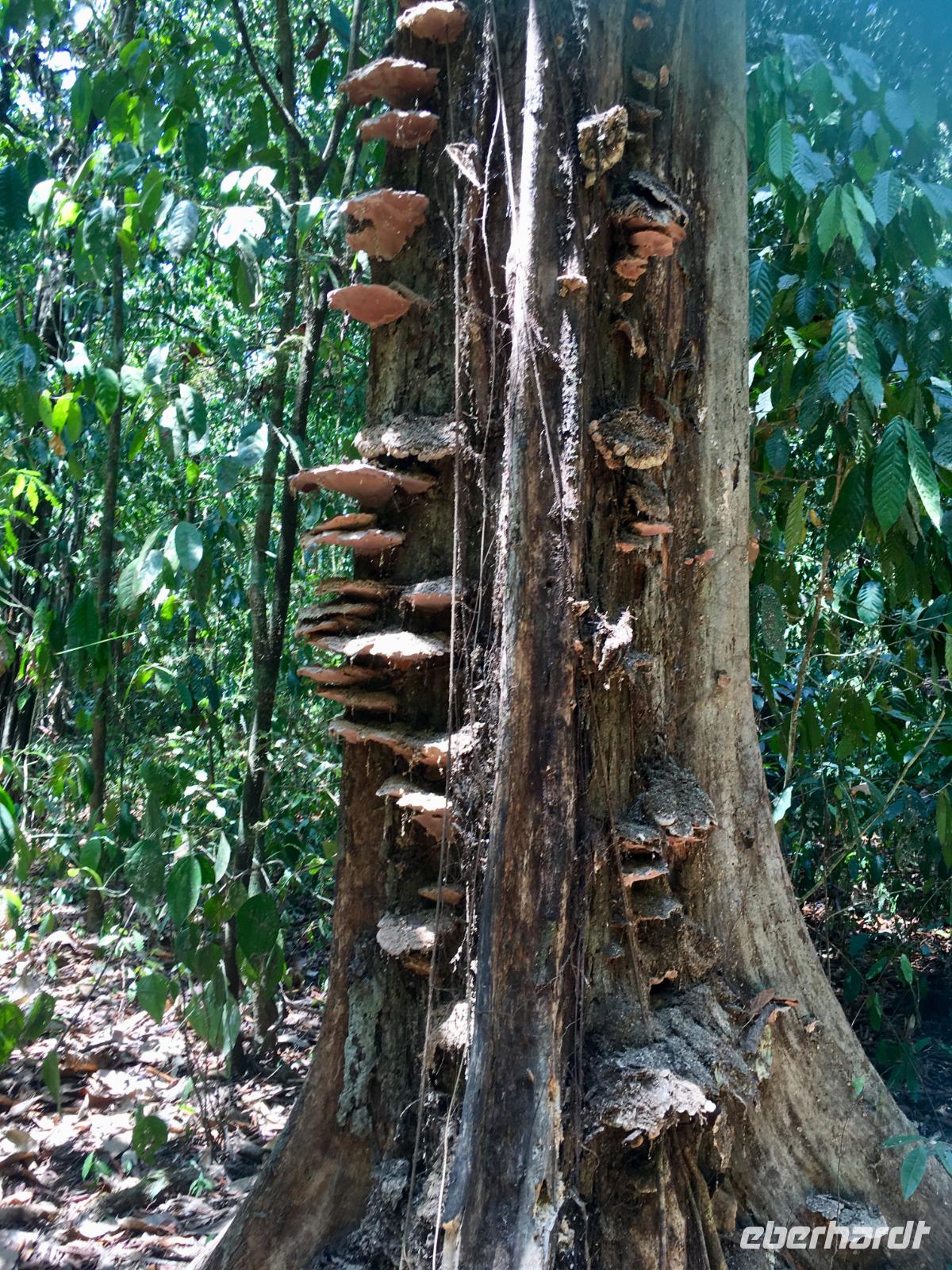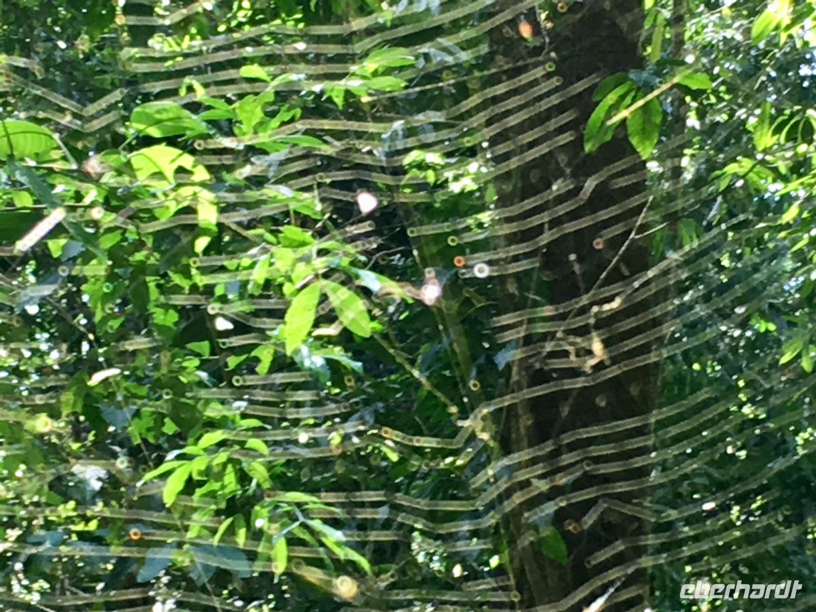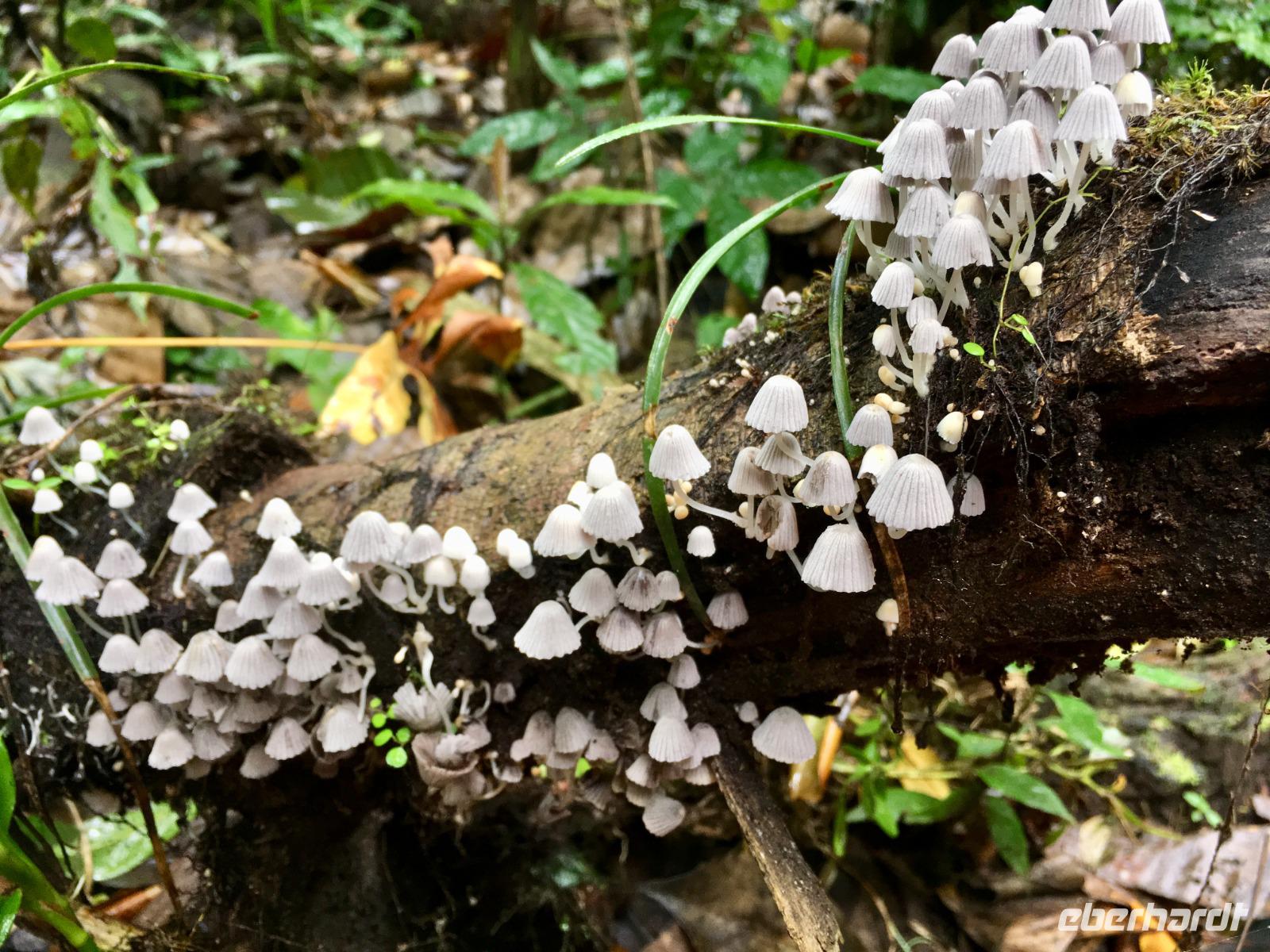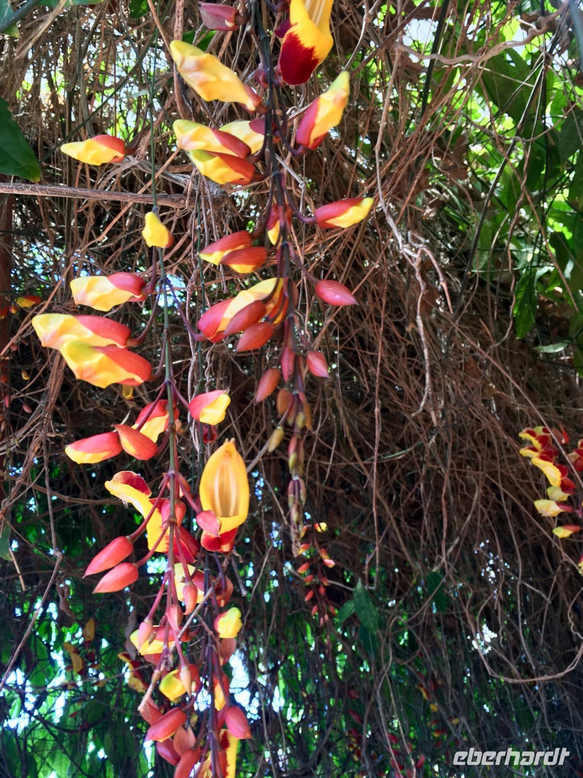 So wandern wir guckend, blickend und suchend durch den schoenen Wald, zuecken immer wieder die Kamera und erfreuen uns an dieser Pracht. Auf einemal auf einem breiteren Weg sehen wir viele Leute in die Baeume schauen. Einrohr Fernglaeser sind aufgestellt, keiner sagt was aber man spuert die Aufregung. Ein wunderschoener Quetzal sitzt in seiner vollen Pracht gut sichtbar auf SEINEM Ast. Er ist das Paradestueck der Voegel hier in Costa Rica und gluecklich ist jener der ihn sieht. Wie wir, die Auserwaehlte Eberhardt Gruppe (so fuehlen wir uns jedenfalls !) Lange bleiben wir dort und staunen ueber des Quetzals Schoenheit. Nicht lange danach gibt es wieder ein kleineres Grueppchen und schon wieder ein Quetzal ! So viel Glueck, wir koennen es kaum glauben. Jeder hat nun ein perfektes Bild und unsere Reise geht weiter. Ein halbes Stuendchen spaeter kommen wir in Salvatura Tree Top Walk an. 8 Bruecken und schoene Wege dazwischen fueren uns durch, und ueber diesen Urwald. Ein wunderbares Gefuehl ist es ueber diese hohen langen Haengebruecken zu gehen und die Welt von oben zu sehen. Der Bruellaffe weiss nicht, dass wir auch auf Baumspitzhoehe sind und frisst lustig an der Baumkrone weiter. Bald will er auf einen anderen Baum und spaziert etwa 2 Meter ueber unseren Koepfen hinueber. Ach wie schoen, er schaut uns sogar von oben an, und, plumps, entleert sich gerade zwischen 2 Damen !!! Wo bitte ist die Affen-Sitten-Polizei ! Wir lachen lauthals. OOOps nicht so laut lachen, denn die Vogelbeobachter unter uns haben weiter vorne auf der Bruecke in der Ferne einen seltenen Haemmerling gesichtet. Der zeigt sich nur sehr selten. Sein weisser Kopf ist in dem Dschungelgruen gut ersichtlich aber fuer die meisten Kameras ist er etwas weit entfernt. Er schaut eher wie ein Golfball auf Urlaub aus. Weiter gehen wir ueber all diese wundersamen Bruecken bis zur 8. Bruecke. Dort sehen wir noch einmal einen Quetzal, er sitzt ganz nahe, bewegt sich anfangs nicht, er schimmert in seinem gruenen Federkleid und sein langer eleganter Schweif tanzt im Wind. Was fuer ein Tag. Das Mittagessen schmeckt auch sehr fein und die Fahrt zum Hotel ist wieder holperig. Heute Nachmittag ist frei und einige unter uns treffen sich wieder zum Abendessen. Dieses Mal gehen wir ins beste Restaurant am Platz. Es ist koeslich. Danke Berny, danke Felix !