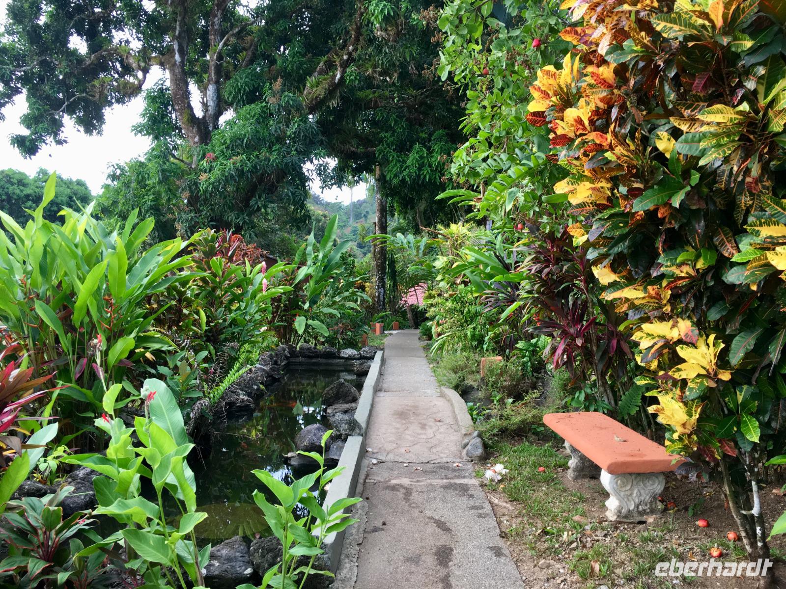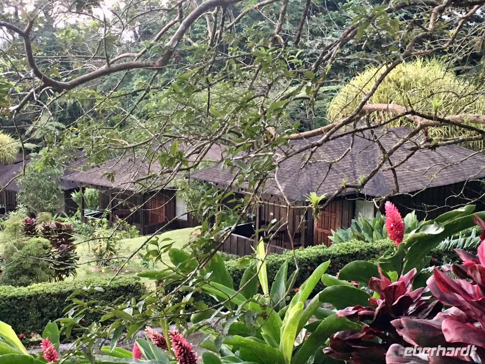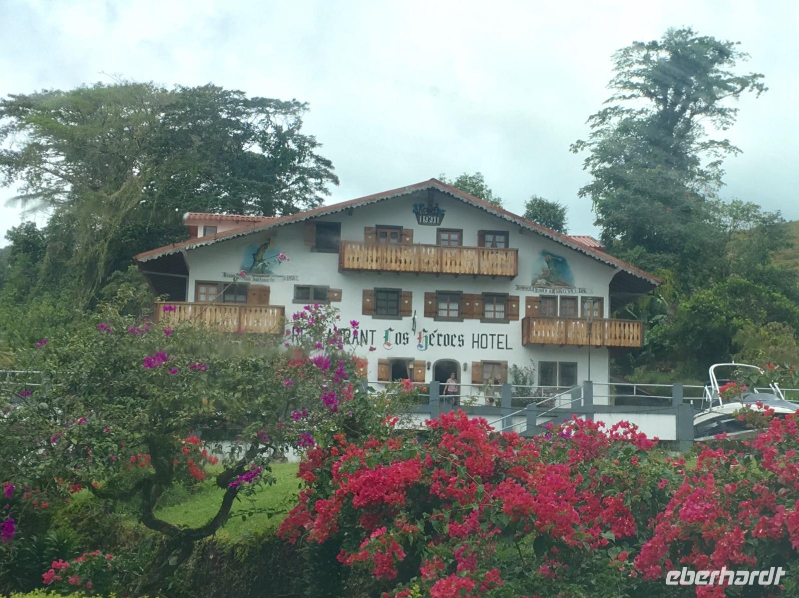 Heute gehts schon in der Frueh los, denn wir fahren nach Panama. So nehmen wir Abschied vom Pazifischen Ozean, steigen wieder in das Schnellboot ein und erreichen Sierpe eine Stunde spaeter. Nun muessen alle Koffer und Taschen vom Boot ausgeladen werden und sie stehen nun am Strassenrand. Da kommt ja auch schon unser neuer Bus, oh, ist der bloss fuer die Koffer ? oder bloss fuer Passagiere ? Nicht muede, hiefen nun Buschauffeur und Berny die 20 Koffer auf das Dach des Minibusses sodass sie dort oben, fest angebunden, die Reise mit uns nach Panama an der frischen Luft mitmachen koennen. Wir fahren wieder 1 ¾ Stunde durch Anbaugebiet bis wir an der Grenze sind. Dort stellen wir uns erst bei dem Emigration-Schalter an. Nach dem Obulus von 7 Dollar duerfen wir ueber die Strasse zirkeln um beim naechsten Schalter anzustehen. Dort wird uns ein Stempel in den Pass verpasst. Nun wieder in den Bus um bald beim panamenischen Grenzposten zu sein. Auch hier gibt es wieder die Moeglichkeit sich anzustellen. Dieses Mal muessen wir auch unsere Tickets aus Panama hinaus herzeigen. Die wollen wohl wissen, dass wir nicht nach Panama ausziehen sondern die Geschenkchen an die Daheimgebliebenen auch tatsaechlich hinbringen ! Nach Bild und Fingerabdruck bekommen wir auch hier einen Stempel in den Pass und werden entlassen. Christian ist der lokale Reiseleiter und er winkt uns freundlich zu. Ein Riesenbus erwartet uns mit Alberto dem Fahrer. Nach einem kurzen Mittagsessen in einem lokalen Restaurant fahren wir in Richtung Berge. Man sieht in schon, den hoechsten Vulkan in Panama Baru mit seinen 3450 MüM. Boquete liegt am Fusse dieses Vulkans und hier waechst auch einer der besten Kaffeesorten ueberhaupt. Morgen werden wir auf eine Kaffeeplantage gehen. Bald finden wir das Hotel, welches wunderbar im gruenen steht mit Sicht auf Boquete. Jeder hat sein eigenes Haeuschen mit Terrasse. Im nahegelegenen Restaurant haben wir das Abendessen reserviert und schauen noch lange den vielen lustigen Kollibris zu.
