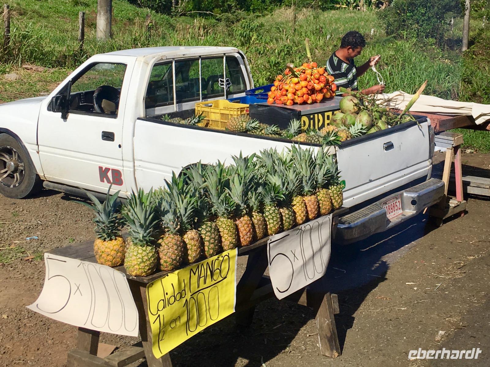 Gemuetlich geht es heute in der Frueh zu. Denn wir fahren erst um 9:00 Uhr von Monteverde weg. Es blaest natuerlich wieder und ist frisch aber wir wissen bereits, dass es heute und in den naechsten paar Tagen sehr warm werden wird. Also kurze Hose und T-Shirt. Wir fahren ca 200 Km und brauchen dafuer zirka 3 Stunden. Auf der Schotterstrasse fahren wir die kurvenreiche Strasse ueber die Wasserscheide dieses Landes. Immer wieder gibt es schoene Aussichten und wir halten oft bis wir zu der Kreuzung mit der Panamerica kommen. Unsere Vogelbeobachter bekommen nun auch eine Privatbesprechung mit Berny, waehrend die anderen vor sich hindoesen. Danach lernen wir wieder einiges ueber den Anbau von Papaya, Mango, Reis, Bohnen, Ananas, Avocados und Macadamia Nuesse. Die Ananas zum Beispiel wird durch Ableger gezuechtet. Ein guter Pflanzer kann bis zu 8'000 Ananans-Saetzlinge pro Tag pflanzen und verdient dann auch ganz schoen. Dies bringt uns nach Puntarenas, der Spielplatz der reichen Ticos. Wir fahren dort vorbei da es Hochsaison ist und begeben uns auf die Kuesten-Strasse. Vorbei an Caldera, ein frueher sehr wichtiger Handelshafen und danach der Pazifischen Kueste entlang bis nach Quepos. Wir halten auch bei der Krokodil-Bruecke und machen schoene Bilder von den Urtieren. Es liegen gleich 11 unter und um die Bruecke herum. Ah das spendierte Bierchen mit Sicht auf Kroks schmeckt aber gut. Danke Eberhardt ! Es gibt keinen besseren Ort um unser verfruehtes Happy Hour einzunehmen. Eine Stunde spaeter sind wir in unseren Hotels. Wir werden in zwei Gruppen aufgeteilt und uebernachten in 2 verschiedenen Hotels da alles ausgebucht ist. Zum Abendessen melden sich wieder einige um das einheimische Fischrestaurant aufzusuchen andere bleiben lieber im und ums Hotel. Gestern hatten wir gefroren heute surrt die Klimaanlage. Was fuer ein herrliches Land dies Costa Rica, Pura Vida, es ist wirklich das „wahre Leben".