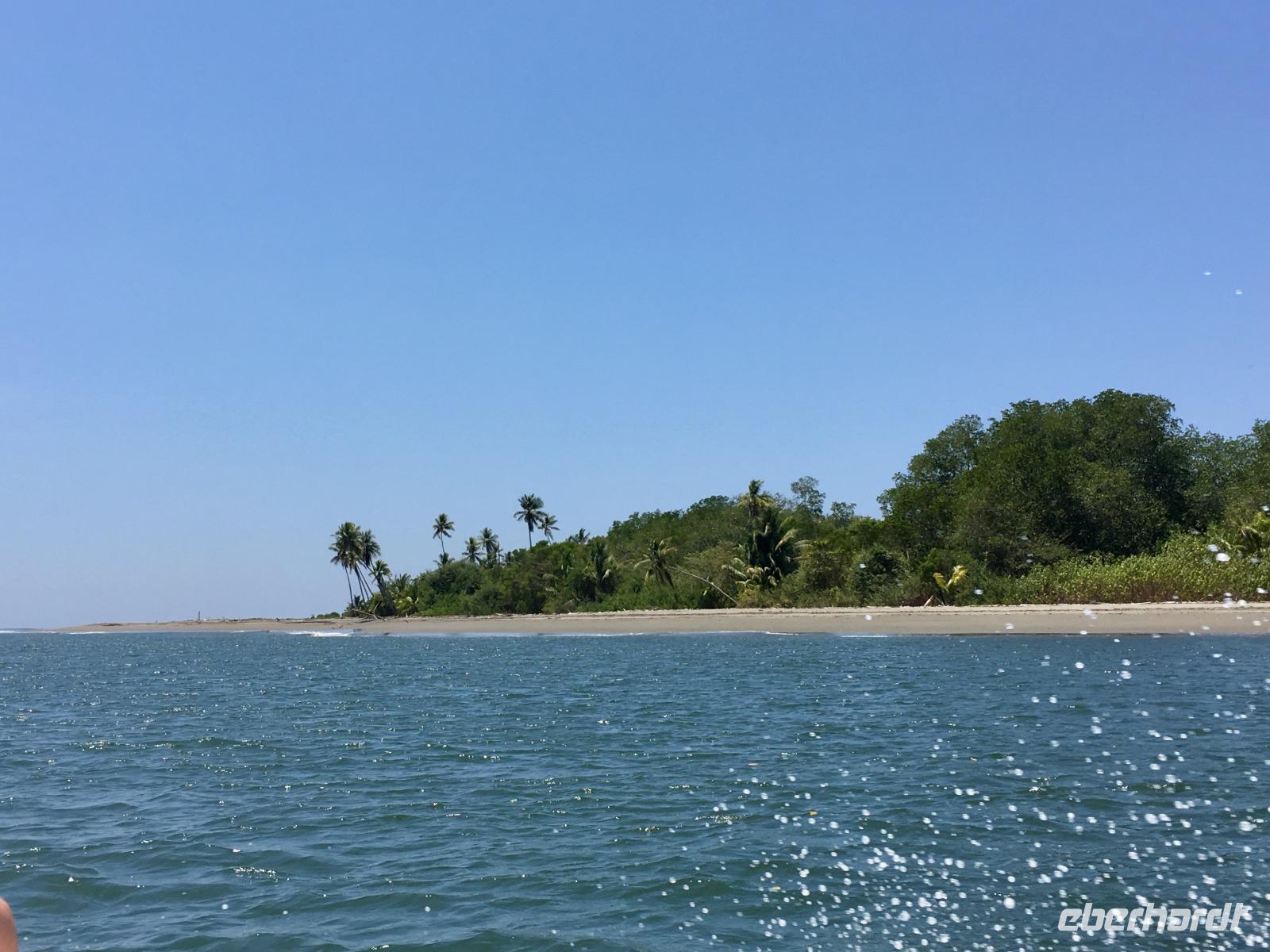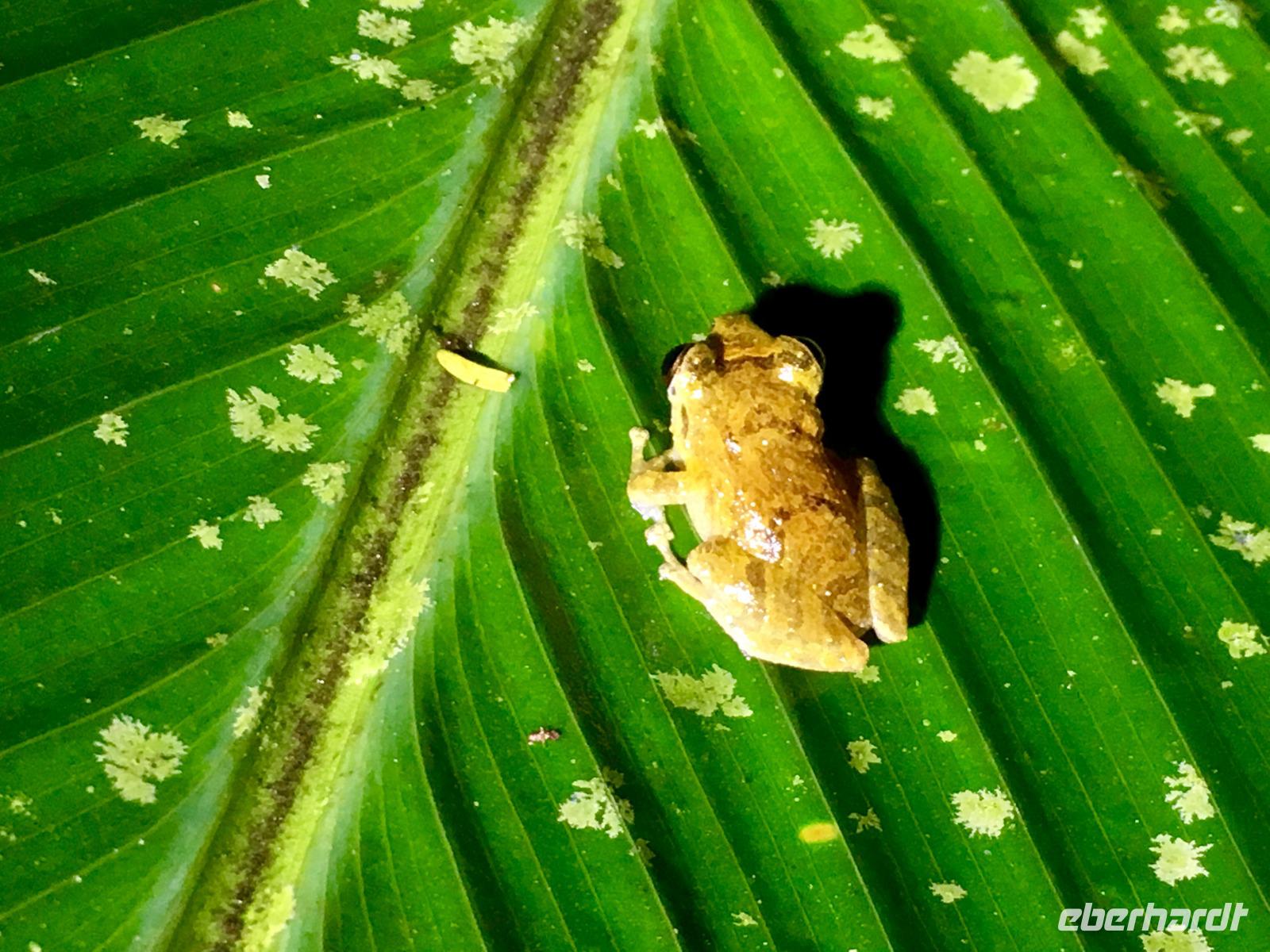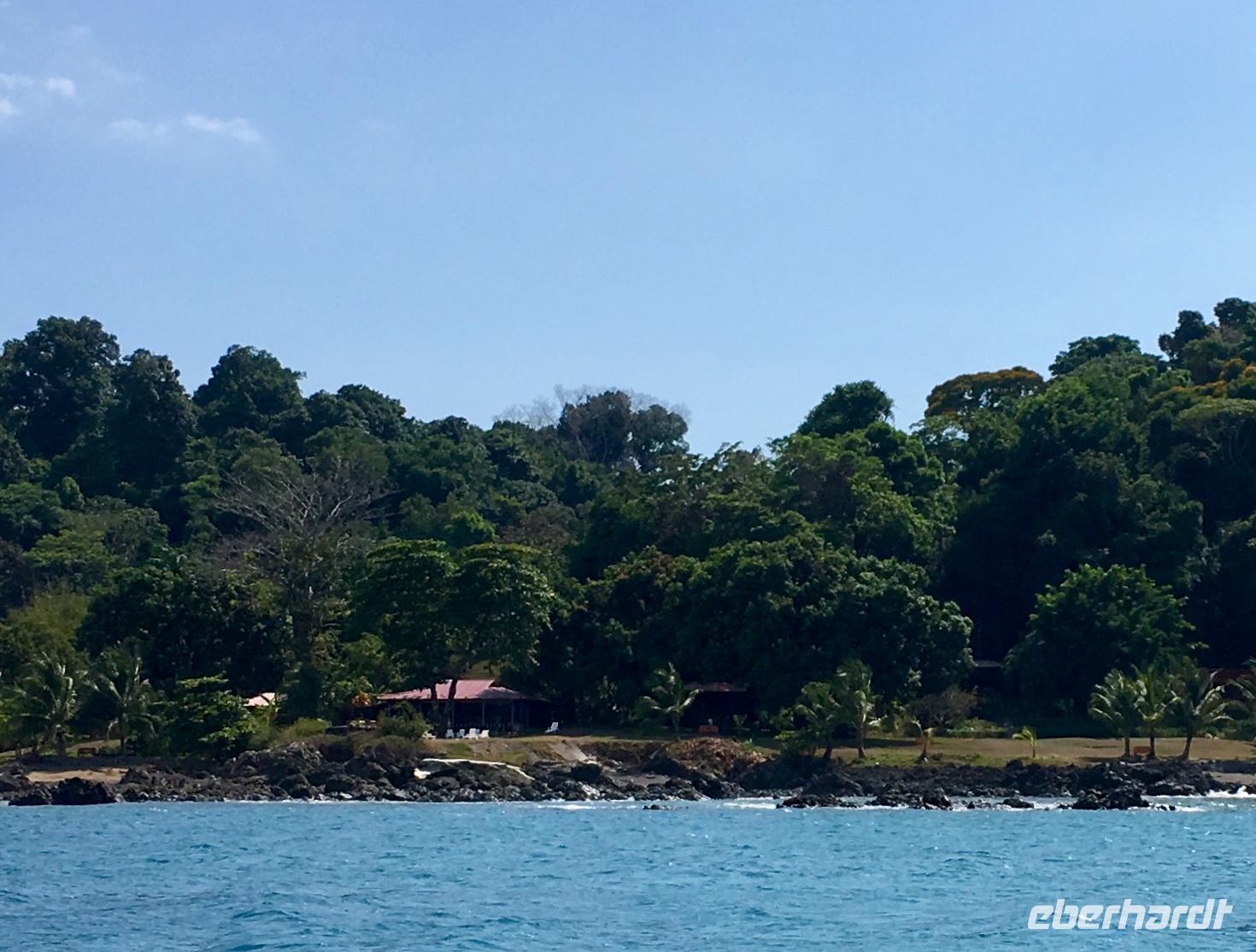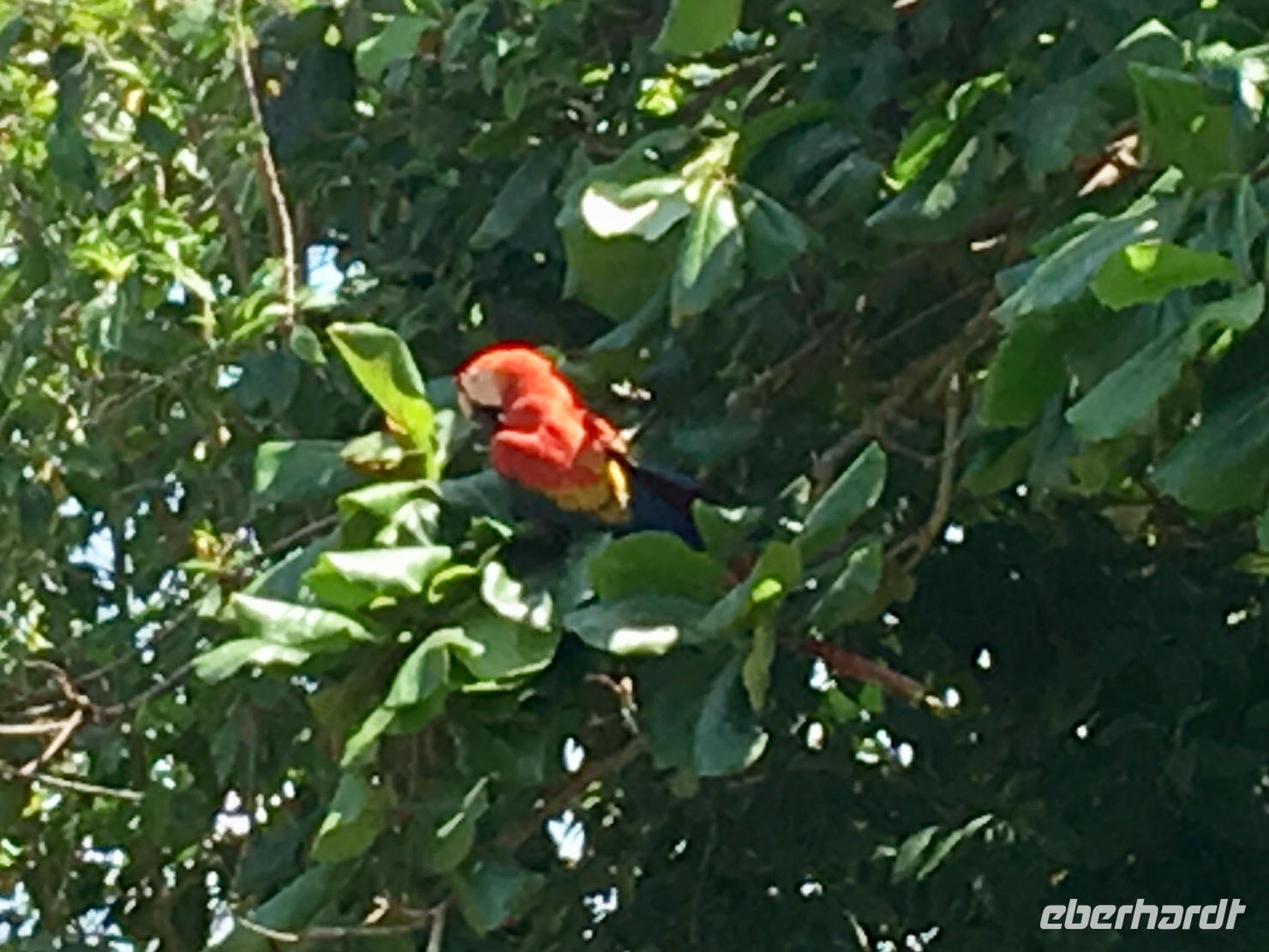 Pures Leben, wie man hier in Costa Rica sagt, denn wir werden in der Frueh von den Totenkopfaeffchen auf dem Dach der Zimmer geweckt. Herrlich. Das Fruehstueck inmitten des Dschungels schmeckt auch gut und bald ist die ganze Gruppe im Bus wiedervereint. Heute fahren wir gute 200 Km in den Sueden. Wir wollen nach Drake Bay und das wird interessant, denn vorerst werden wir von unserem guten Felix gefahren, in Sierpe steigen wir alle aus mit unserem Gepaeck, Felix faehrt zurueck nach San Jose und wir steigen in ein Boot um, welches uns in die beiden Hotels nach Drake Bay bringt. Auch heute Nacht, sind wir in zwei Hotels aufgeteilt, was aber kein Problem ist. Auf der Fahrt von Manuel Antonio nach Sierpe erklaert uns Berny wieder vieles ueber dieses begnadete Land. Stolz sind die Ticos auf ihr Land, welches eine kulturelle und natuerliche Bruecke der beiden Amerikas bildet. Es ist ein Eco-Land, und so haben die Hotels ausser der Sterne Bezeichnung auch eine wichtige Eco-Blatt Bezeichnung. Je ecologischer das Hotel gefuehrt wird um so mehr Blaetter bekommt es. Wir fahren lange durch Oelpalmen Plantagen. Frueher waren es Bananen Plantagen der United Fruit Company und oft sieht man noch die alten Herrenhaeuser der Plantagen Manager und die Haeuser und Kirchen fuer die Arbeiter. Dies bringt Berny auch zum Thema Verdienst in Costa Rica, Arbeitslosen- und Kindergeld usw. Da ist auf der rechten Strassenseite ein Spielplatz und Felix haelt den Bus an. Gleich neben dem leeren Spielplatz liegt eine riesen Steinkugel. Es ist noch nicht ganz klar, woher sie kommen, weshalb man sie gemeisselt hat und wozu sie dienten. Vielleicht haben Riesen damit Tennis gespielt, denn diese Kugel hat sogar Tennisball-aehnliche Zeichnung ! In Sierpe angekommen fuehrt uns Felix auch gleich zum Restaurant, wo unser Boot angelegt auf uns wartet. Wir verabschieden uns von dem ausgezeichneten Fahrer....Pura Vida Felix.....Guielmo/Memo und Jeremy, der Kapitan und sein Mat sind bereit uns nun aufzunehmen. Vorerst alle Koffer in den Bug verstaut, dann die ganze Gruppe im Boot verteilt fahren wir 1 Stunde und ein Viertel nach Drake Bay auf der Osa Halbinsel. Erst ist der Fluss ganz flach und wir fahren durch einen schwarz-Mangroven Wald bis zum Meer. Der Wind ist aufgekommen und wir schaukeln noch 20 Minuten auf den hohen Wellen ehe wir ankommen. Die Mittag- und Abendessen sind fuer die naechsten Tage inkludiert und die Hotels sind wunderschoen am Meer gelegen. Auf der einen Seite ist Wald und vorne Strand. Eldorado ! Am Nachmittag erkunden wir alle mal die neue Umgebung und geniessen die Ruhe hier. Die roten Papageie schauen uns zu, die Grillen zirpen, das Meer rauscht, der kleine Frosch huepft schnell vorbei und die Echsen lassen sich von der Sonne aufwaermen. Ahhhh. Hier schlafen wir wie die Herrgoettchen, denn Morgen gehts wieder zeitig los. Wir wollen den Corcovado Nationalpark erleben. Buena Noche !