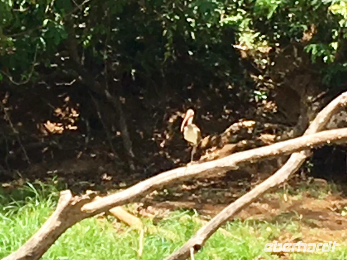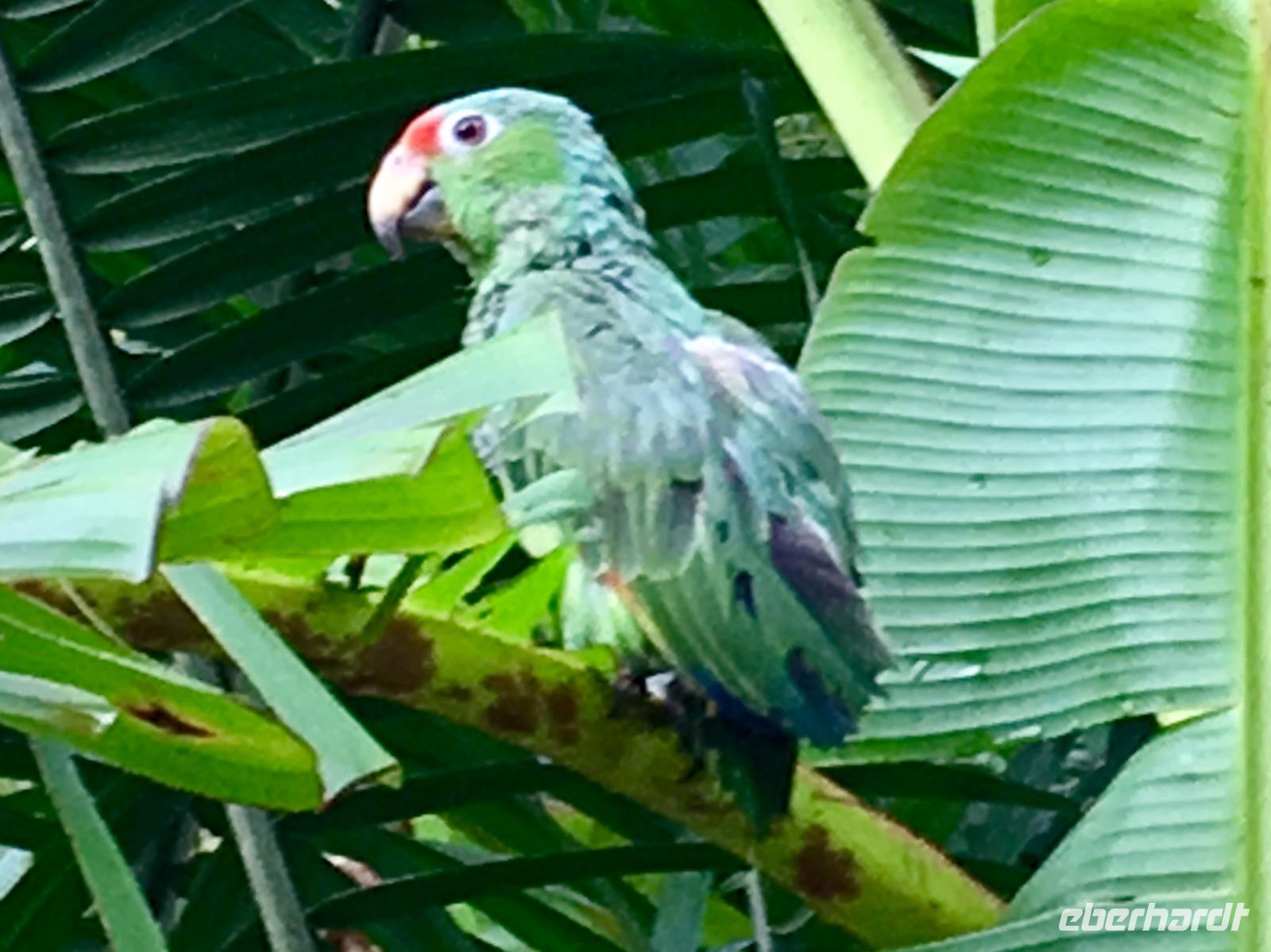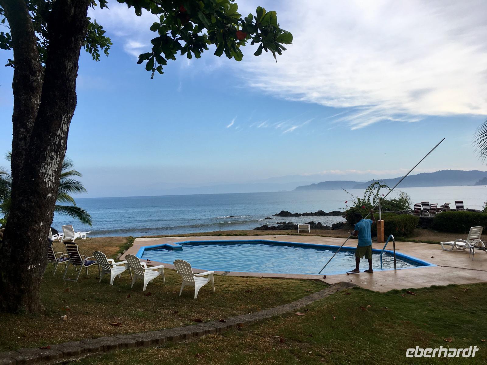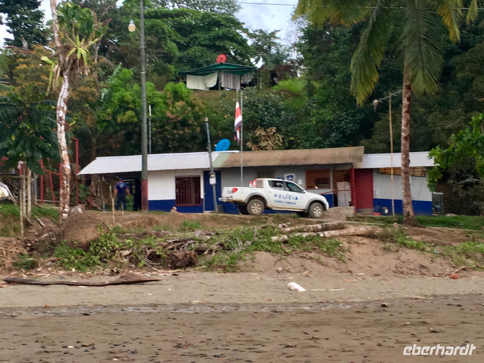 Pures Leben, wie man hier in Costa Rica sagt, denn wir werden in der Frueh von den Totenkopfaeffchen auf dem Dach der Zimmer geweckt. Herrlich. Das Fruehstueck inmitten des Dschungels schmeckt auch gut und bald ist die ganze Gruppe im Bus wiedervereint. Heute fahren wir gute 200 Km in den Sueden. Wir wollen nach Drake Bay und das wird interessant, denn vorerst werden wir von unserem guten Felix gefahren, in Sierpe steigen wir alle aus mit unserem Gepaeck, Felix faehrt zurueck nach San Jose und wir steigen in ein Boot um, welches uns in die beiden Hotels nach Drake Bay bringt. Auch heute Nacht, sind wir in zwei Hotels aufgeteilt, was aber kein Problem ist. Auf der Fahrt von Manuel Antonio nach Sierpe erklaert uns Berny wieder vieles ueber dieses begnadete Land. Stolz sind die Ticos auf ihr Land, welches eine kulturelle und natuerliche Bruecke der beiden Amerikas bildet. Es ist ein Eco-Land, und so haben die Hotels ausser der Sterne Bezeichnung auch eine wichtige Eco-Blatt Bezeichnung. Je ecologischer das Hotel gefuehrt wird um so mehr Blaetter bekommt es. Wir fahren lange durch Oelpalmen Plantagen. Frueher waren es Bananen Plantagen der United Fruit Company und oft sieht man noch die alten Herrenhaeuser der Plantagen Manager und die Haeuser und Kirchen fuer die Arbeiter. Dies bringt Berny auch zum Thema Verdienst in Costa Rica, Arbeitslosen- und Kindergeld usw. Da ist auf der rechten Strassenseite ein Spielplatz und Felix haelt den Bus an. Gleich neben dem leeren Spielplatz liegt eine riesen Steinkugel. Es ist noch nicht ganz klar, woher sie kommen, weshalb man sie gemeisselt hat und wozu sie dienten. Vielleicht haben Riesen damit Tennis gespielt, denn diese Kugel hat sogar Tennisball-aehnliche Zeichnung ! In Sierpe angekommen fuehrt uns Felix auch gleich zum Restaurant, wo unser Boot angelegt auf uns wartet. Wir verabschieden uns von dem ausgezeichneten Fahrer....Pura Vida Felix.....Guielmo/Memo und Jeremy, der Kapitan und sein Mat sind bereit uns nun aufzunehmen. Vorerst alle Koffer in den Bug verstaut, dann die ganze Gruppe im Boot verteilt fahren wir 1 Stunde und ein Viertel nach Drake Bay auf der Osa Halbinsel. Erst ist der Fluss ganz flach und wir fahren durch einen schwarz-Mangroven Wald bis zum Meer. Der Wind ist aufgekommen und wir schaukeln noch 20 Minuten auf den hohen Wellen ehe wir ankommen. Die Mittag- und Abendessen sind fuer die naechsten Tage inkludiert und die Hotels sind wunderschoen am Meer gelegen. Auf der einen Seite ist Wald und vorne Strand. Eldorado ! Am Nachmittag erkunden wir alle mal die neue Umgebung und geniessen die Ruhe hier. Die roten Papageie schauen uns zu, die Grillen zirpen, das Meer rauscht, der kleine Frosch huepft schnell vorbei und die Echsen lassen sich von der Sonne aufwaermen. Ahhhh. Hier schlafen wir wie die Herrgoettchen, denn Morgen gehts wieder zeitig los. Wir wollen den Corcovado Nationalpark erleben. Buena Noche !