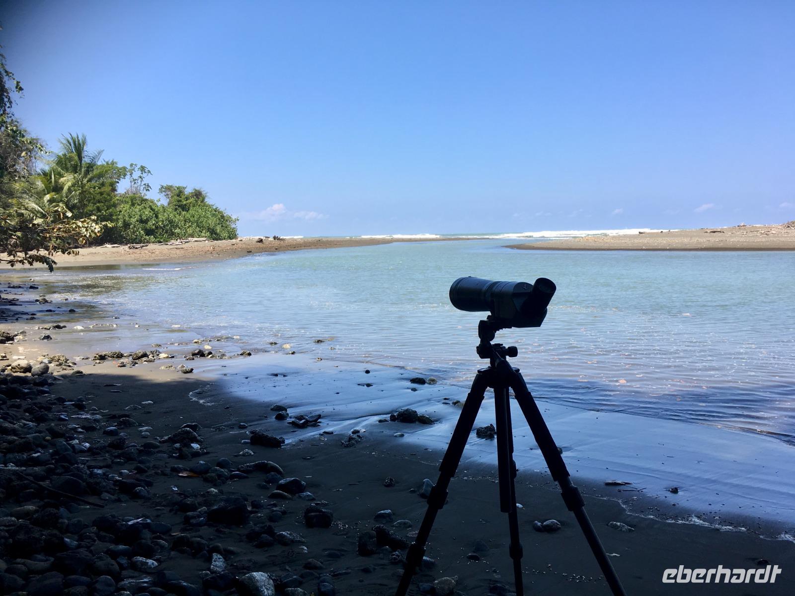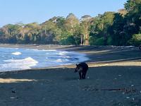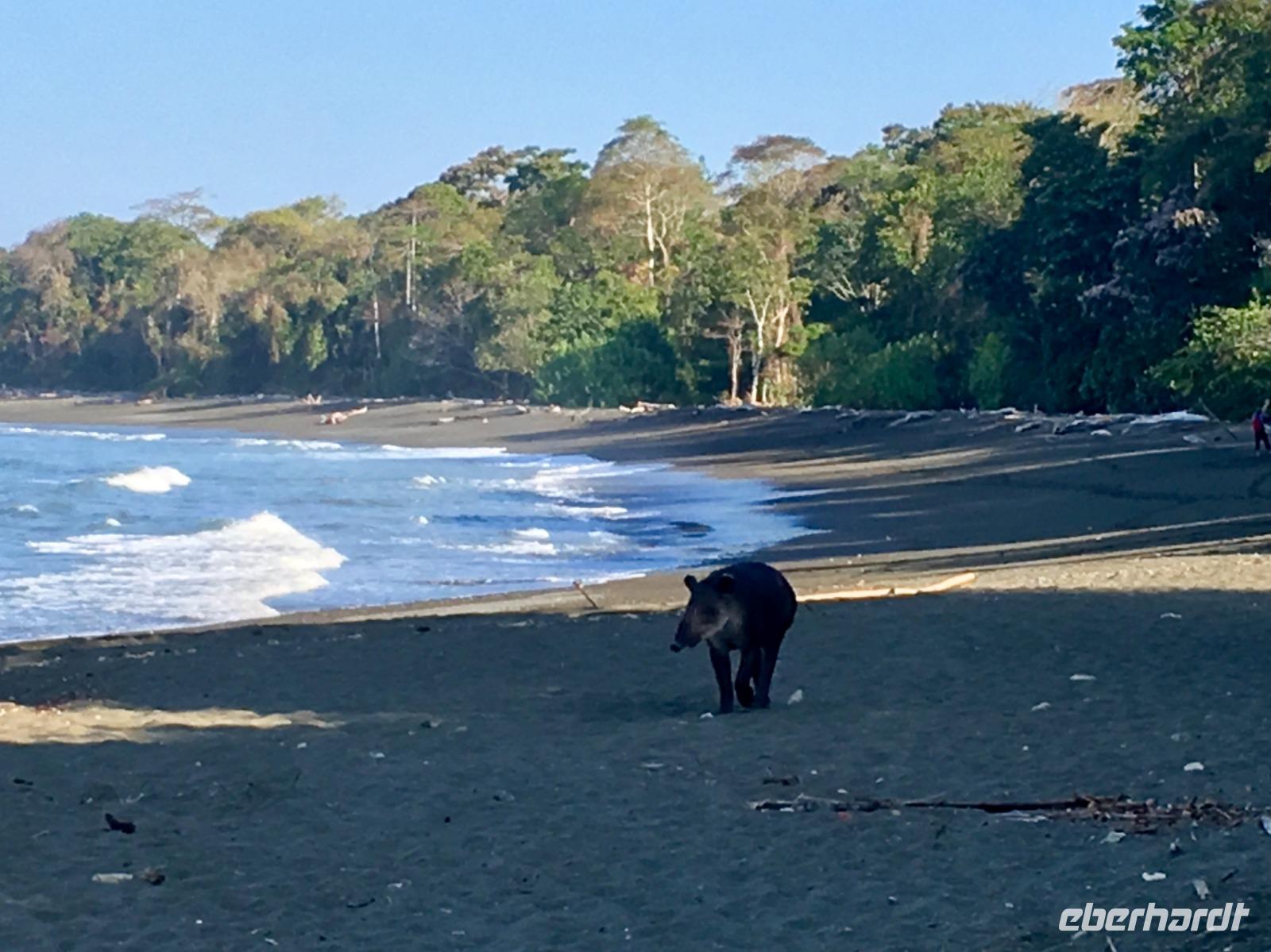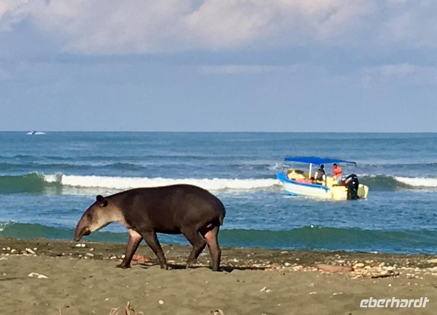 Pura Vida. Die Voegel pfeiffen uns wieder frueh aus den Federn und das Handy leuchtet schon wie wild. Es ist 5 Uhr !!! Bald kommt schon das Boot und bringt uns zum Fruehstueck ins Resort wo der Rest der Gruppe uns sicher schon sehr vermisst hat. Das Lancia-Schnellboot faehrt uns ueber tolle weite Wellen eine Stunde lang zum Corcovado Nationalpark. Dort angekomment huepfen wir wie die Gazellen ! aus dem Boot auf den Strand. Der Sand ist dunkel und etwa 40 Km lang aber bloss 20 Meter breit gesaeumt von Urwald. Keine Haeuser, Natur pur. Ploetzlich heisst es Statue - still stehen - nicht bewegen, denn ein Tapir spaziert gemuetlich dem Strand entlang. Alle Kameras werden gezueckt und wie wild haben wir alle das perfekte Tapir-Bild festgehalten. Wir sind so entzueckt und eigentlich fast mundtot geschlagen vor so viel Glueck.