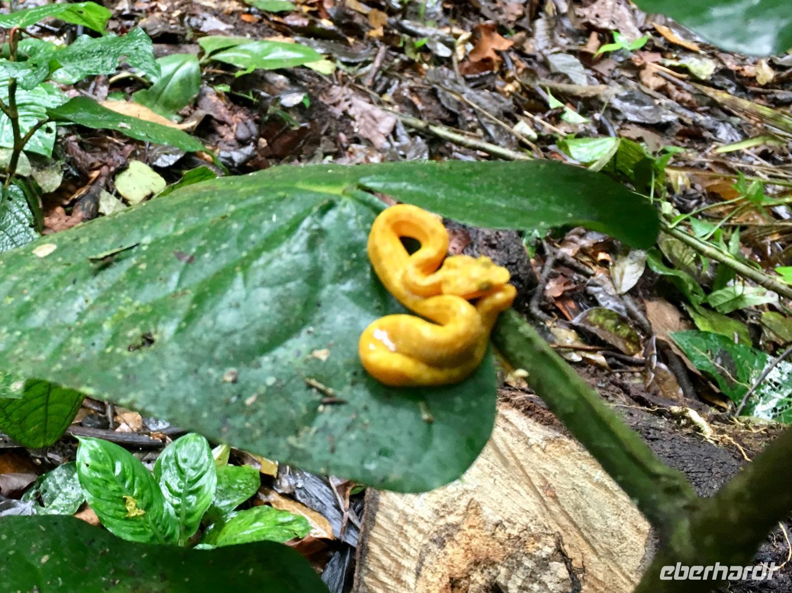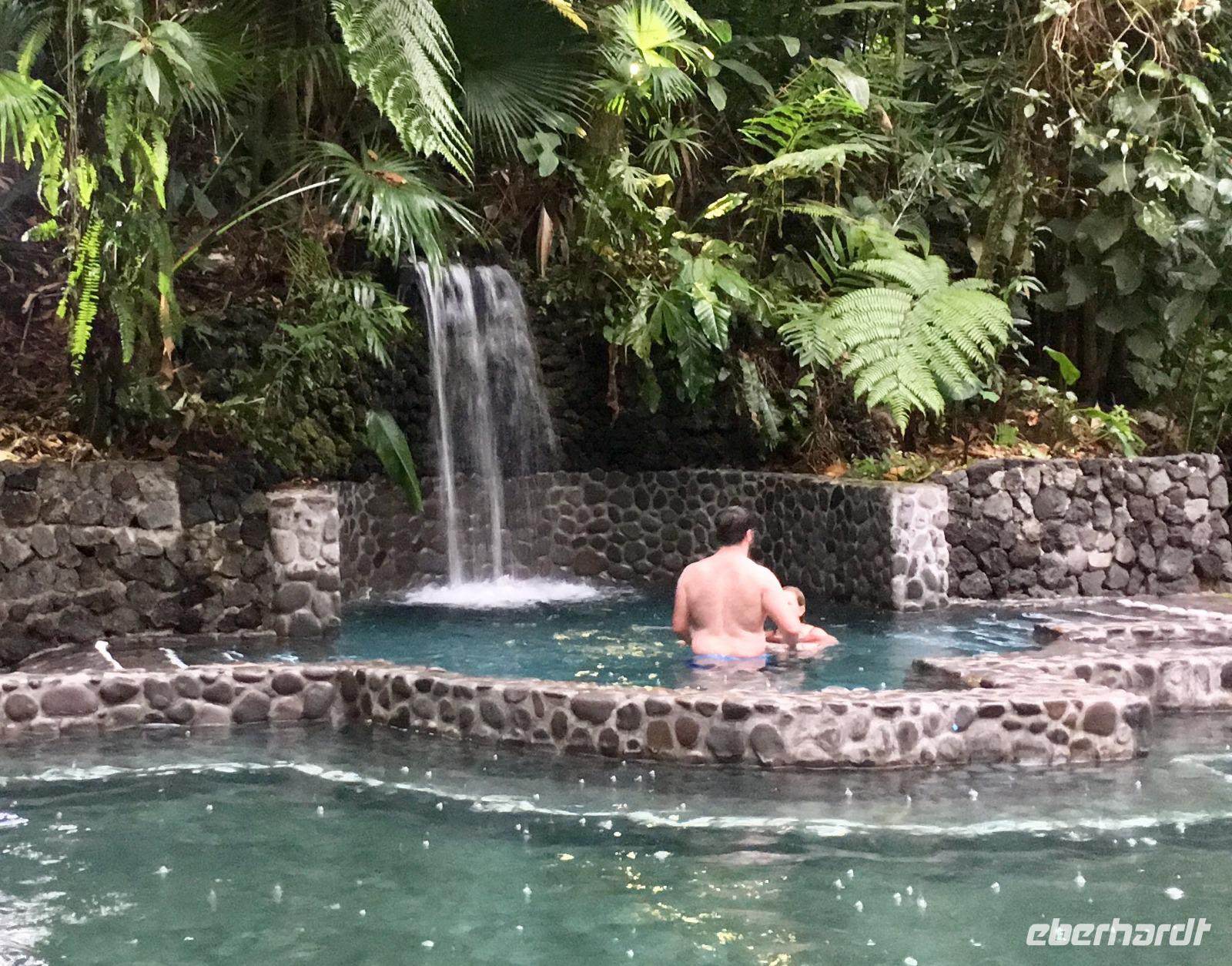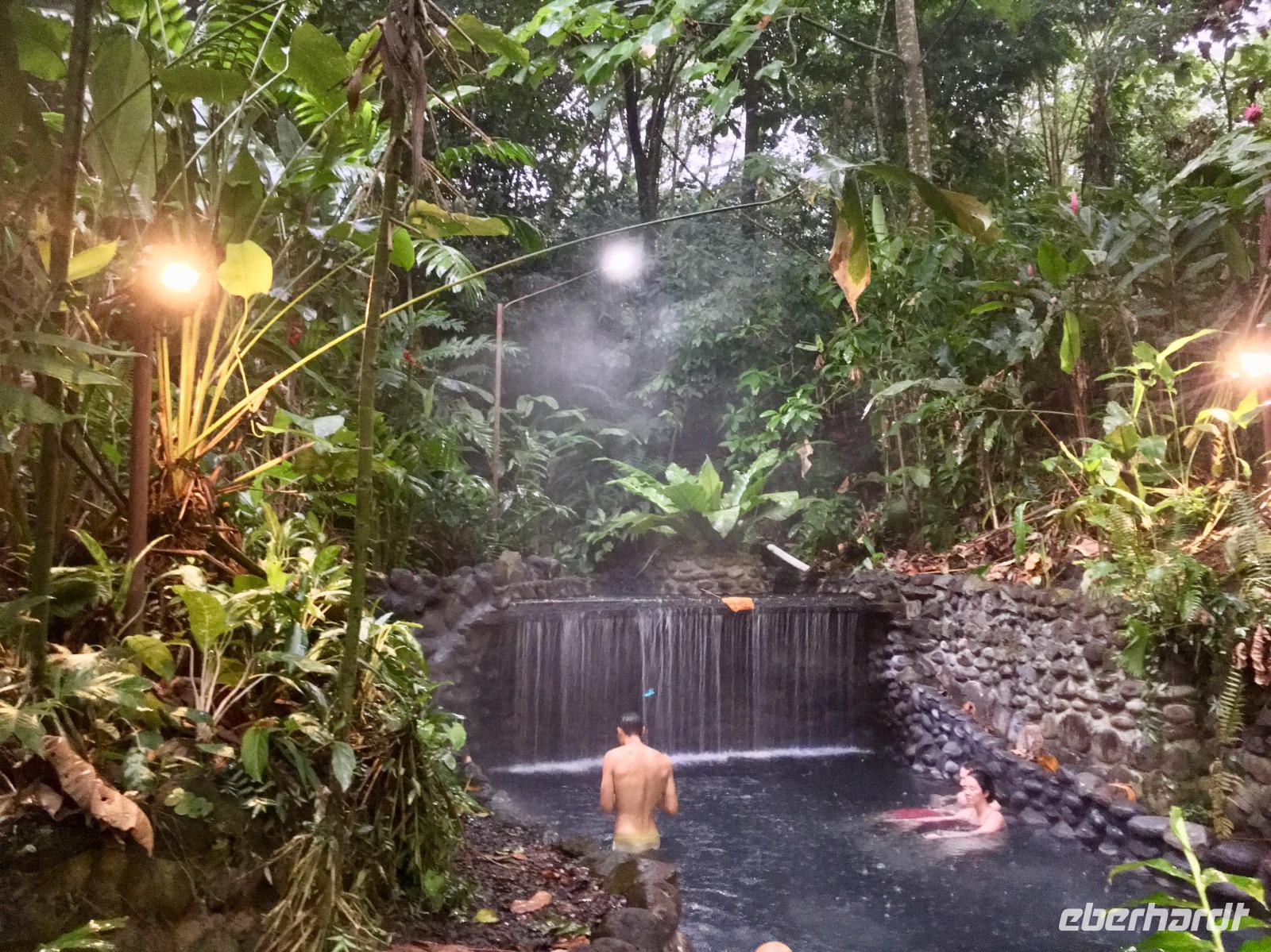 Ein fantastischer Tag beginnt heute mit dem feinen Fruhestueck in der schmucken Lodge. Geschlafen haben wir wie die Herrgoettchen in den Holzhaeuschen, geweckt wurden wir von Vogelgesang und um 6:00 Uhr vom Weckdienst. Auf dem heutigen Programm steht Cano Negro. Flussfahrt fuer Tierbeobachtung. Nach einer halben Stunde Fahrt machen wir schon mal Rast. Nicht nur guten Kaffee gibt es hier, auch schmucke Souveniers und Leguane, ueberall Leguane. Das faengt ja schon gut an. Im Bus fahren wir gen Norden fast zur nicaraguanischen Grenze. Eine Stunde spaeter sind wir da, ein unscheinbarer Fluss mit hellbraunem Wasser, ein Restaurant, saubere Toi's und freundliche Leute die uns auf ein ueberdachtes konfortables Boot hinweisen. Also muessen wir nicht selbst Kanu fahren ! oder Raften, Gott Sei Dank ! Wir haben kaum abgelegt sehen wir schon einen Caiman mit seiner Brille wie er das Flussufer erkundet. Danach geht es wie bei einem Ping Pong Match, Vogel rechts, Affe links, Schildkroete auf dem schwimmenden Ast, Reiher aller Arten presentieren sich, nukleargruene Echsen sonnen sich, ein Kormorant hat gerade einen langen Fisch aufgespiesst - schlaegt ihn immer wieder auf die Wasseroberflaeche bis er nicht betaeubt ist - jongliert ihn in die Luft und verschluckt ihn schlussendlich Kopf voran. Es ist alles wie im Film, wie eine Safari. Wir sehen sogar eine Wuergeboa, wie sie zusammengerollt in einer Riesenpalme liegt und von einem rosa-beinchen-Vogel (sorry, kenne nicht alle beim Namen) beobachtet wird. Der Vogel hat wohl ein Nest in der Naehe und haelt deshalb die Schlange im Auge. Von dem Naturalisten erfahren wir sehr viel, er weiss ueber jedes Tier interessant zu berichten und die RBGL uebersetzt fleissig. Die 1 einhalb stuendige Fahrt ist so abwechslungsreich heute, dass wir nach 2 ½ Stunden Beobachtungstour zurueck beordnet werden. Das Mittagessen warten schon als Buffet auf uns. Es schmeckt lecker und das Bierchen dazu auch. Bald wird es Zeit wieder zurueck zu unserem schmucken Hotel zu fahren. Vorbei an vielen Rohzucker- und Ananas Plantagen erreichen wir La Fortuna. Einige huepfen gleich in den Pool mit Sicht auf den Arenal Vulkan, andere erforschen den Spazierweg hinter dem Hotel fuer noch mehr Vogelbeobachtung. Am Abend essen einige im Hotel und andere kommen mit in ein feines Restaurant in La Fortuna. Das war nun echt ein toller Tag. Das Aussortieren der Photos wird sicher lange dauern......6. TagMitten in der Nacht, genau um 3 Uhr in der Frueh faengt es an zu regnen wie es bloss in den Tropen moeglich ist. Man denkt, die Tropfen fielen gleich mal durchs Dach so haemmern sie da oben. Aber es ist ja bloss 3 Uhr, also umdrehen und weiterschlafen. Heute gehts gemuetlich zu und her, da es auch zum Fruehstueck noch etwas nieselt und man den Vulkan Arenal gar nicht mehr sehen kann vor lauter Nebel und Wolken. So fahren wir dann erst gegen 8 ab um unsere Wanderung im Sekundaerwald am Fusse des Arenal Vulkans in Angriff zu nehmen. Wir denken wir sind im Dschungelbuch, es ist genauso, mystisch und anfangs ruhig. Erst nach ein paar Meter merkt man wie der Wald hier lebt. Es piepst, kriecht, laeuft, schleicht und fliegt ueberall. Der Dschungel ist geheimnissvoll und nur wer genau beobachtet sieht auch die vielen Bewohner hier. Eine ganz kleine graue Schlange liegt wie angepasst nahe einem Termitenbau auf einem umgefallenen dicken Ast, noch eine ganz kleine giftgelbe Schlange hat sich ein Blatt ausgesucht inder es sich in der Mitte eingekugelt hat. Die verschiedenen Voegel verstecken sich geschickt ganz oben auf dem Dschungeldach und bloss einige mutige groessere Voegel zeigen sich im Mittelbereich des Dschungels. Wir erleben, sehen, gehen, plaudern und geniessen. Jedem seine Gedanken, jedem sein Stueckchen Paradies. Unser Geburtstagskind hat nun echt viel Glueck, dass sein Datum genau auf diesen fantastischen Tag faellt. Also lassen wir ihn nach der Wanderung auch gebuehrend hochleben. Der Costa Rica Rum, Centenario schmeckt mit Cola sehr fein und die Nacho und Taco Chips mit ihrem typischen Dip passen gut dazu. So haben wir alle etwas von dem Geburtstag und freuen uns ungemein. Bald darauf fahren wir zum Hotel. Einige unter uns steigen hier aus und andere fahren mit ins Staedtchen fuer ein lokales Mittagessen und um noch Einkaeufe fuer die daheimgebliebenen zu taetigen. Aber ja, wir denken schon an Euch, bloss haben wir nicht viel Zeit zum denken auf so einer interessanter Reise. Sorry ! Nun gibt es endlich eine Verschnaufpause von 2 Stunden ehe wir zu den Thermalbaeder fahren. 6 Pools mit Wasser in verschiedenen Themperaturen bieten die hier. Es soll unserer Haut so gut tun und verjuengend wirken..........ob die Zuhausgebliebenen uns wohl wiedererkennen werden ? Vielleicht wenn sie die Geschenkchen sehen ! Item, nach dem einweichen unserer Koerper, gehen wir gleich zur Bar und dann zum schmackhaften Abendessen. Ab und zu giesst es wieder wie aus Kuebel aber immer wenn wir draussen sind, hoert der Regen wieder auf. Jemand mag uns ganz besonders. Zurueck in unseren Zimmer heisst es nun packen, denn morgen geht es schon sehr zeitig los um den Voegelein bei der Morgentoilette zugucken zu koennen ?