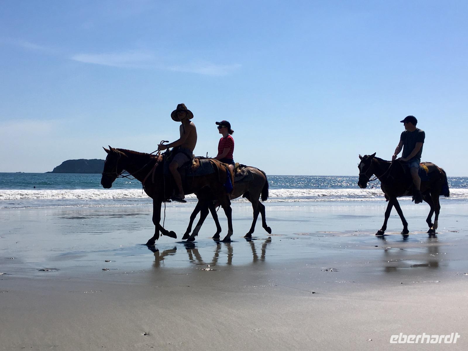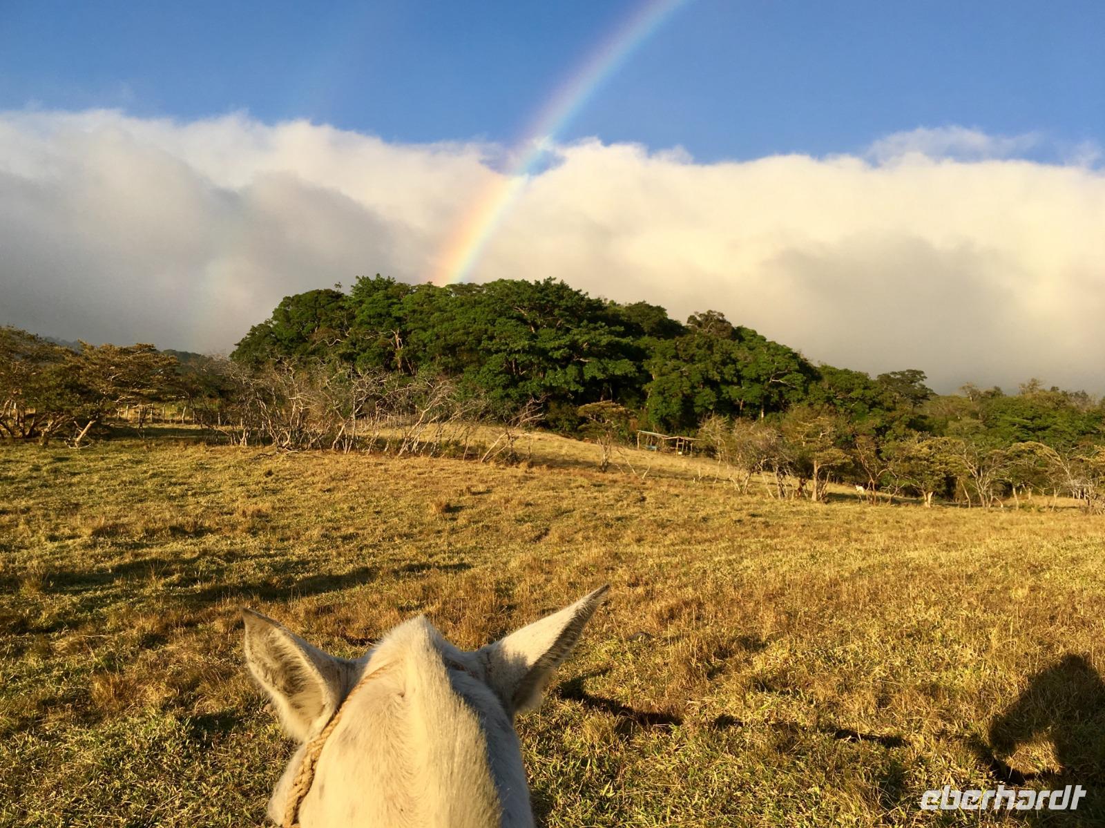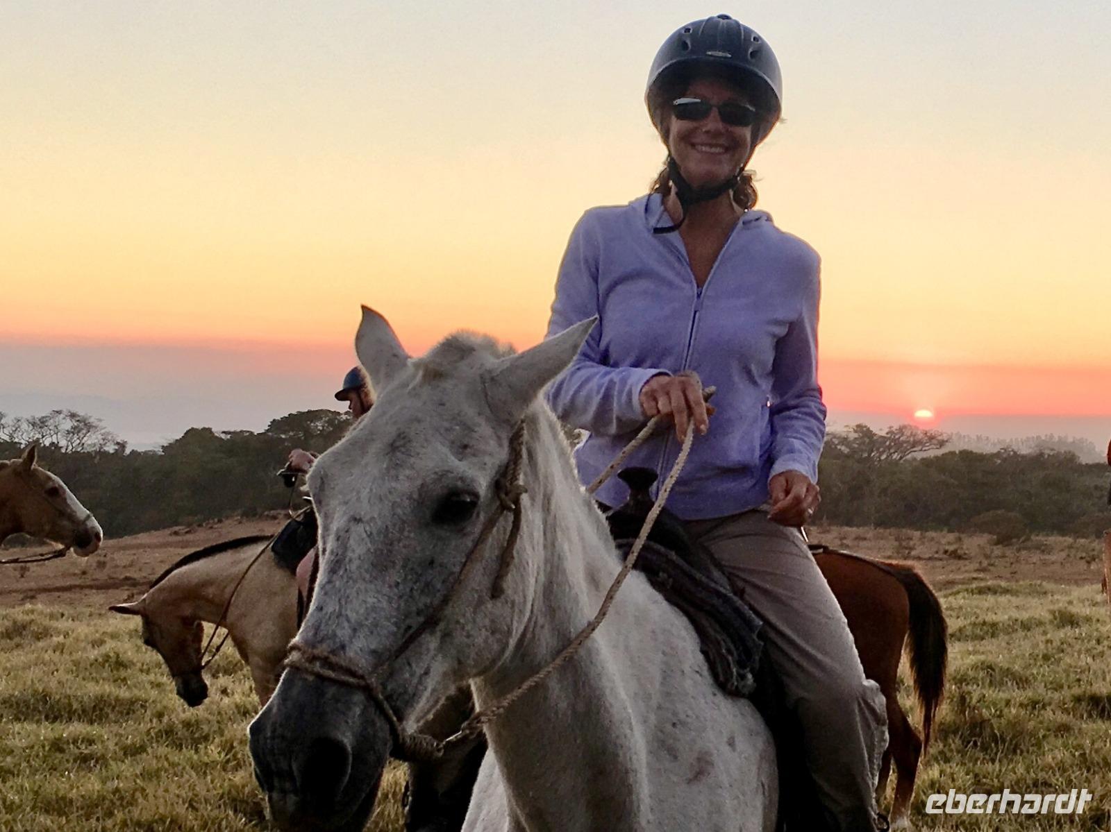 Autsch, 4:45, aufstehn, das tut schon ein bisschen weh, aber die Belohnung ist sehr gross. Die Fahrt zu den Mistico Bruecken dauert bloss eine ½ Stunde so sind wir Punkt 6 Uhr schon da und die beiden besten Guides warten bereits auf uns. So werden wir in zwei Gruppen geteilt. Eine Gruppe hat Schwerpunkt Voegel die andere allgemeine Natur (Voegel inbegriffen). Wir befinden uns im Regenwald und sind auch dementsprechend ausgeruestet. Schoen und einfach zu gehen ist der Weg durch diesen Dschungel es troepfelt staendig, die Blaetter glaenzen, der Boden ist feucht, es ist angenehm warm. Geradezu kitschig-idyllisch. Schon nach den ersten paar Meter sehen wir Klammeraeffchen in den Baeumen. Sie rennen um die Wette und schwingen sich wie im Film von Ast zu Ast und Baum zu Baum. Es scheint ein Kindergarten zu sein bloss eine Mama mit ihrem Baby vorneangehaengt passt auf die wilde eJugend auf. In der Ferne hoeren wir das tiefe Schreien der Bruellaffen aber zeigen tun sie sich nicht. Dem Weg entlang gehend sehen wir ploetzlich einen herrlich gezeichneten Vogel. Er ist ziemlich gross hat einen orangenen Kopf, violette Baeckchen, gruene Fluegel und ein langes zartes dunkles Schwaenzchen. Er sitzt schlecht getarnt, unser Guide Julio, stellt sein Fernglas auf und darin spiegelt sich der Breitschnabel Mot-mot. Wir sind alle ganz entzueckt, gleich darauf sehen wir eine grassgruene lange Schlange auf einem Palmenblatt und danach geht es schon ueber die erste der 9 Haengebruecken. Den Urwald von oben zu sehen ist ganz was besonderes. So fuehlt sich ein Vogel, ach wie schoen. Viele verschiedene Baeume, Palmen, Farne, Pflanzen, Lianen und Moose beleben diesen Wald. Grosszuegig und ueppig ist es hier. Immer wieder sehen wir ausgefallene Blumen und Pflanzen sowie Voegel, Reptilien und Froesche. Sogar einen Buejeans Frosch haben wir bildlich festgehalten. Er ist ganz klein, sitzt am Boden und ist knall-rot mit blauen Beinchen. Gestern abend hatten wir seinen Freund getroffen der auch sehr klein ist aber gruen mit orangfarbenen Patscherln. Ein junges Voegelein schaut gerade aus seinem Nestchen und piepst nach Mama und dem Wuermchen. Die Bruecken sind teilweise so lange und so hoch, dass wir uns wie Trapezkuenstler im Zirkus vorkommen. Ein herrlicher Ausflug endet dann mit einem guten Fruehstueck ehe wir mit dem Bus um den Arenal-See fahren um an unser naechstes Ziel zu gelangen. Aus dem Regenwald hinaus, in den trocken-Wald hinein, zum Nebelwald in Monteverde fahren wir. Die Aussicht auf den schoenen grossen Arenal-See geniessen wir von einem Restaurant aus. Wir horchen auch den interessanten Erklaerungen Berny's zu. Fragen zu Schul- und Sozialwesen in Costa Rica werden besprochen. Die Strasse ist sehr schoen aber leider in schlechtem Zustand, so schlafen und doesen wir einfach vor uns hin werden geruettelt, geschuettelt und geschaukelt. In Monteverde angekommmen, checken wir gleich in unsere Lodge ein. Einige Erkunden gleich schon mal die Vogelwelt ums Hotel herum, andere wandern fleissig ins Staedtchen und ein Grueppchen moechte gerne mal reiten gehen. Das ist ein lustiges Unterfangen, denn die Pferde gehen gelassen hinter einander her und die Caballeros/Cowboys passen auf, dass auch niemand aus der Reihe tanzt. Ploetzlich haelt die Gesellschaft, denn wir muessen gleich alle unsere Kameras zuecken. Gleich zwei 2-zehen Faultiere sitzen auf einem dicken Ast. Aber hallo ! was machen denn die gerade.....sie sind gar nicht faul.....hoffentlich fallen die nicht runter.....! Dann gehts mit dem Reiten genuesslich weiter, ueber Wiesen, durch Wald, auf schmalen Spuren und auf breiten gruenen Wegen zu einer Koppel. Die Sonne verabschiedet sich gerade, noch ein Foto „Reiter im Abendlicht" und dann reiten wir langsam wieder zurueck zum Stall. Ein herrlicher Ausflug, ein Erlebnis. Zum Abendessen kommen einige mit in die Stadt in ein super Lokal andere bleiben im Hotel. Der Wind blaest uns in den Schlaf, die Zudecke wird genuetzt und die Traeume halten schon Einzug.
