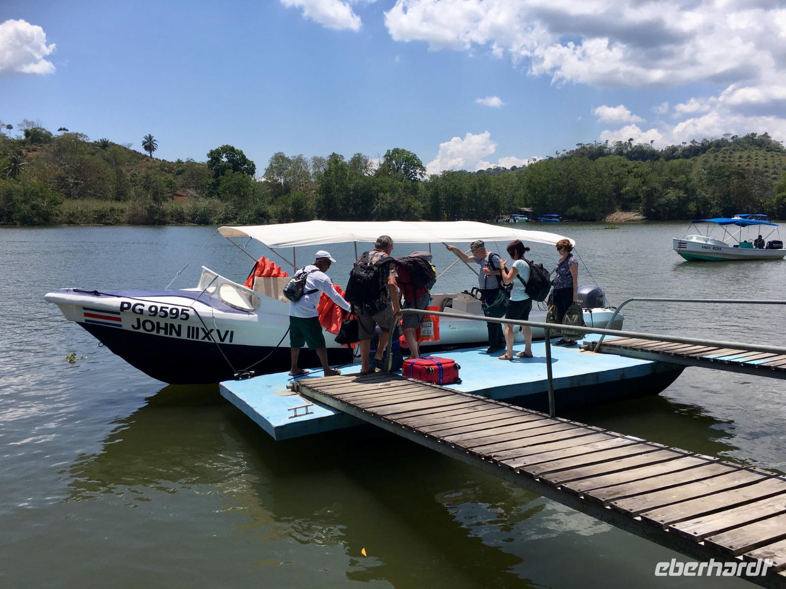 Heute gehts schon sehr zeitig los, macht aber nichts, da wir wegen der 6-stuendigen Zeitverschiebung eh schon um 5:00 wach sind. Was 5 Uhr, viele sind bereits um 3 Uhr fit. Wir huepfen in die kurzen Hosen, ziehen ein T-Shirt ueber und sind bald schon bereit fuer die ersten Eindruecke Panamas. Nun gehts mit dem grossen Bus, gefahren von Archimedes - Nino los zu einem kleinen Bahnhof, dort wartet der Zug der Panama Canal Railway auf uns.....und die anderen Passagiere. In einem gediegenen Wagon aus den 50er Jahren ratteln wir gemuetlich die 40 Kilometer dem Panama Kanal entlang. Ueber viele Bruecken, durch tiefen Wald, ueber Fluesse und entlang des Gatung Sees gelangen wir nach Colon. Ein wunderbares Erlebnis in so einem historischen Zug zu sitzen. Die Geschichte dazu erzaehlt uns Myra unsere Reiseleiterin. Beim Ziel, wartet Nino, unser Fahrer mit seinem blitzblanken Riesenbus. Jeder hat wieder seinen eigenen Fensterplatz und auf gehts, entlang Palmoel Plantagen und Djungel zum Weltkulturerbe Portobelo. Eine wunderbare Bucht, historisch wieder sehr interessant da von Piraten immer wieder heimgesucht und vernichtet. Alle wollten sich an dem Gold dieser Neuen Welt bereichern. Das kleine Dorf Portobelo hat eine interessante Kirche die dem Patron des Schwarzen Jesus' gewidmet ist, und viele bunt bemalte einfache Haeuschen saeumen den Hauptweg. Das grosse, renovierungsbeduerftige Zollamtsgebaeude und die Ruinen der spanischen Festung fallen in dieser karibischen Idylle auf. Myra erklaert uns die Geschichte Portobelos und der Festung und wir stolpern ueber Stock, Stein und Kanonen dieser tollen Ruine. Im Zollamtsgebaeude wurde damals das gefundene Gold aufbewahrt ehe es in die Gallionen verfrachtet wurde. Im kleinen, muffeligen Museum kann man viele Zeugen der damaligen Zeit bestaunen. Nun muessen wir aber weiter zu unserem naechsten Erlebnis. Nach einer 1 ½ stuendiger Fahrt sind wir an einem Fluss angelangt wo ein groesseres Einbaumkanu auf uns wartet. Wir steigen ein, Baenke werden hergerichtet und los geht es, angetrieben von dem kleinen Motor hinten. Durch Urwald, Busch und Weide fahren wir bis zu einem Embrera Dorf. Es wohnen dort Einheimische die uns alsobald mit einem feinen Mittagessen, einer Tanzvorfuehrung und einem medizinischen Kraeutergarten-Rundgang verwoehnen. Wir wuerden am liebsten bei ihnen einziehen. Es ist ruhig, idyllisch, organisch. Die 12 Familien wohnen (so scheint es jedenfalls) in paradiesischem Einklang. Unser guter Nino wartet jedoch schon auf uns und wir muessen doch noch zur Strasse zurueck gondeln. Auf der Fahrt sehen wir wieder tolle Voegel, grosse und kleine, bunte und graue, seltene, ausgefallene und bekannte Piepser. Die Vogelbeobachter unter uns haben ihre eitle Freude und knipsen wie wild mit ihren speziel dafuer ausgeruesteten Kameras. Zurueck in Panama City, gehen wir in der Naehe des Hotels Abendessen und freuen uns schon auf das schoene geraeumige Zimmer.