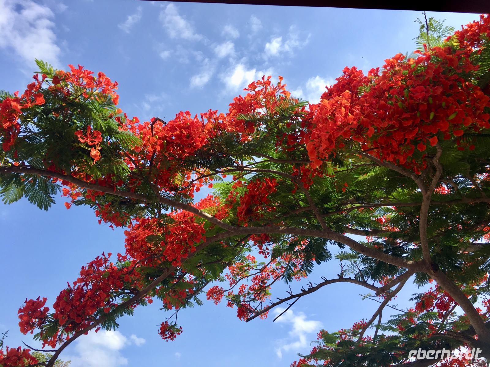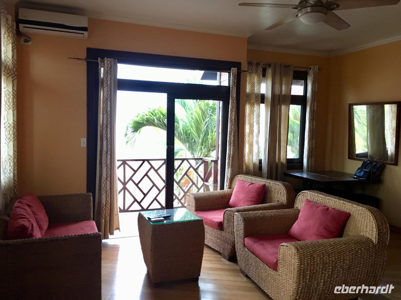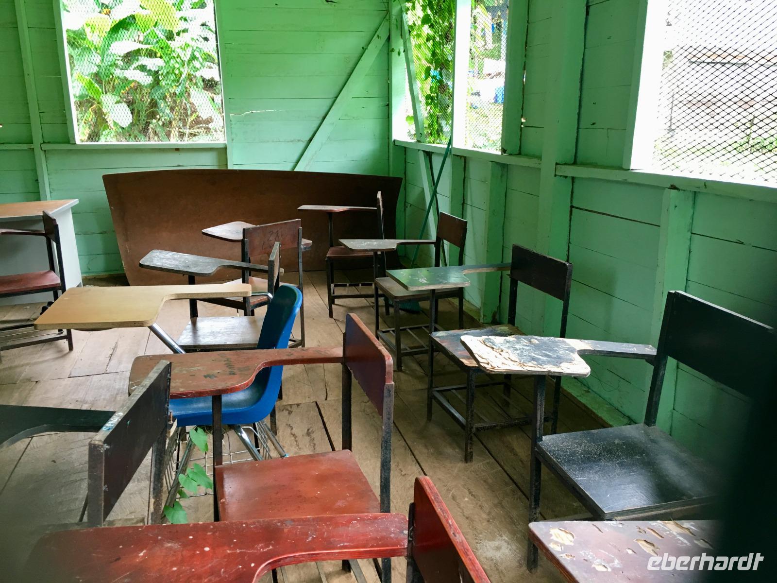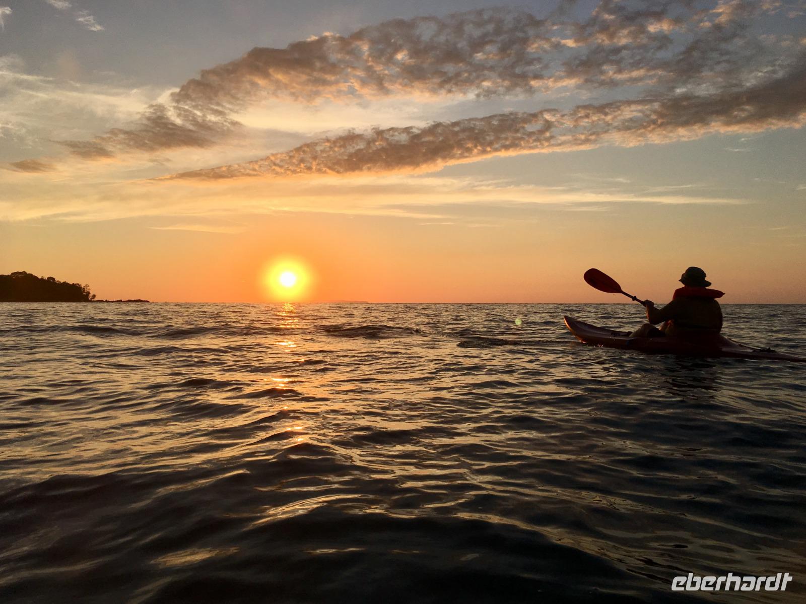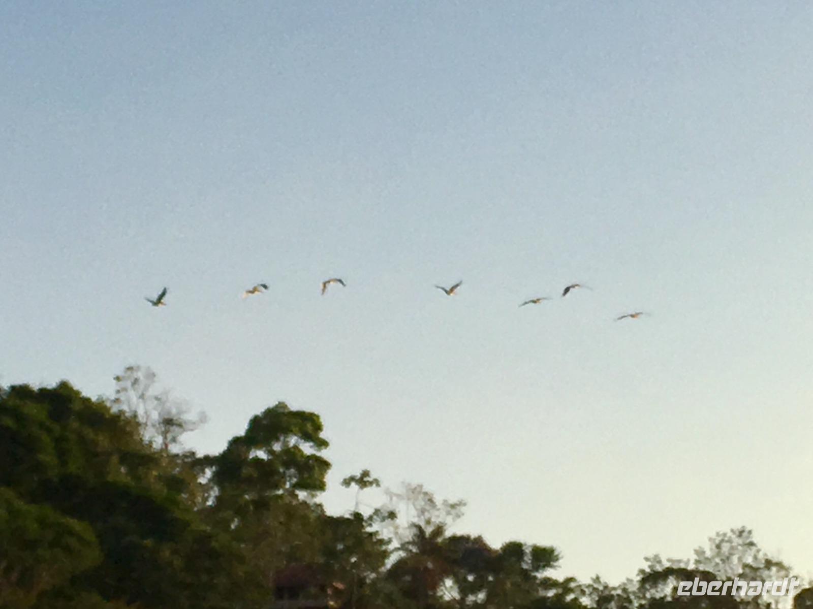 Ja, von dem Schnorchelausflug haben wir alle getraeumt aber ploetzlich gehts bei den meisten los und die Badezimmer von fast allen haben Hochbetrieb. Wir haben den Virus eines Jugendlichen, welcher gestern mit seiner Gruppe abgereist war, erwischt. Ach was fuer eine Nacht, wir sind allesamt je 3-4 Kg leichter aber auch blasser und schwaecher geworden. Niemand hat da Lust auf eine Schnorcheltour, also teilen wir uns auf. Viele bleiben einfach in ihren Zimmer und warten auf die Aerztin, die sofort avisiert wurde, andere gehen derweilen auf einen kleinen Spaziergang um das Resort herum und die 5 gluecklichen Gaeste unter uns, die den Virus nicht gepackt hat, fahren mit dem Reiseleiter auf die Delphin-Pirsch. Die beiden Aerztinnen behandeln alle sehr gut und jeder fuehlt sich danach schon wesentlich besser. Das wunderschoene Ara Paeraerchen schaut in seinem Rot-Blau-Gruen schimmernden Kleid immer wieder vorbei, als wollten die beiden nach uns fragen. Zu Mittag gibt es ein spezielles Huehnersueppchen und Kokosnuss-Wasser dazu. Das weckt auch wieder die Geister. Den Nachmittag kann man mit einem gefuehrten Spaziergang ins Dorf oder mit einer gefuehrten Kayak-Tour fuellen. Die Kayak-Tour aufs flache Meer bei Sonnenuntergang hat sehr gefallen. So geht es uns bald wieder gut. Abends haben wir jedoch nochmals ein spezielles Menue. Kartoffelstock und gegrilltes Huehnerbruestchen. Der Abend ist ruhig und herrlich, einige huepfen nochmals kurz ins Meer, ehe die Schlafzimmer rufen. Schlafestrunken fallen wir in die Betten.
