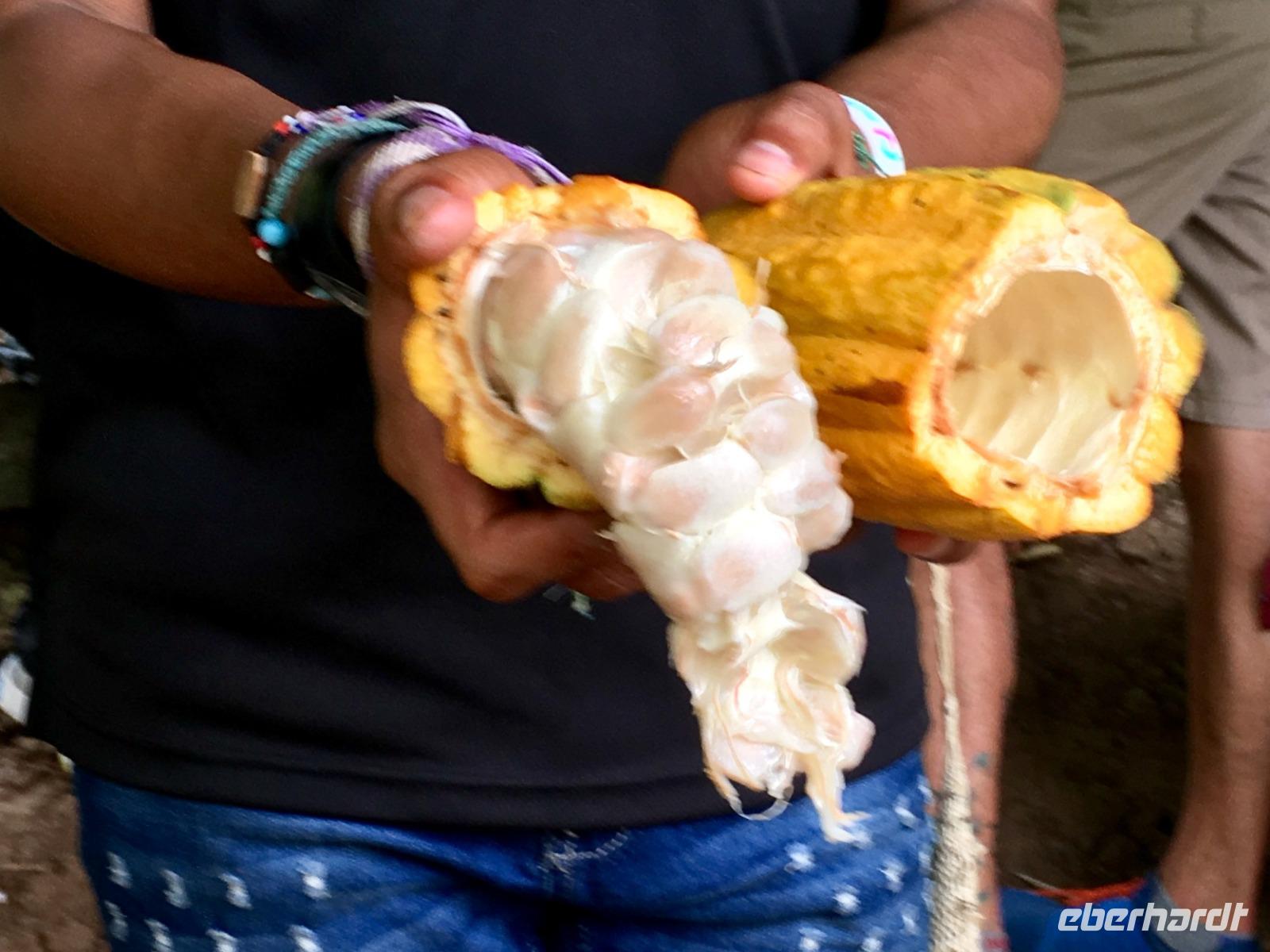 Oh noch mal das wundeschoene Vogelgezwitscher...auf, auf, denn wir muessen unser Gepaeck umpacken. Ein kleines Gepaeckstueck fuer die naechsten 2 Naechte und 3 Tage an der Karibik sollen wir packen und das restliche Gepaeck wird direkt nach Panama City gefahren. Wir fahren nun an die Karibische Kueste nach Boccas del Toro und fliegen danach nach Panama in einem kleineren Flugzeug mit Gepaeckrestriktionen. Heute erwartet uns wieder ein neuer Fahrer dieses mal in einem Linien Bus. Das ist ganz was neues und wir fuehlen uns wie Panamenos ! Die Fahrt ueber die Cordillera ist sehr, sehr kurven- und abwechslungsreich. Auch wettermaessig kommen wir vom kalten Boquete ins warme David, dann hinauf ins windige echt kalte Gebirge und auf der anderen Seite wieder hinunter auf die karibische Seite mit seinen Nebelwaelder und tueppigen warmen Klima bis zum Meer. Unser gute Christian nuetzt die Zeit um uns viele tolle Geschichten aus seiner Schulzeit und dem Leben in Panama zu erzaehlen. Alles ist sehr interessant und wir lernen auch ueber das panamenische Oelgeschaeft und die Pipeline durch Panama welches kostenguenstiger ist als Oel durch den Kanal zu fahren. Ueber Bodenschaetze reden wir, ueber Wohneigentum und die damit entstehenden Komplikationen, ueber die einheimische Bevoelkerung und deren Probleme, ueber das grosse Muell-Problem in Panama und so weiter. Wir lachen viel und amuesieren uns ein wenig, dass unser Fahrer Antonio bei jeder Kurve auf 20 Kmh abbremst. So tuckern wir dahin und kommen nach den laengsten 3 Stunden, welche 4 1/2 Stunden gedauert haben bei der Kakao Plantage an. Wir haben Hunger und das traditionelle Indio Mittagessen mit Huehnchen, Tarowurzel und Blatt, sowie mit Blaukartoffeln war schmackhaft. Jetzt werden wir steil den Berg hinauf gefuehrt um uns die Kakao Pflanzen anzuschauen und zu lernen wie man sie verarbeitet. Der Duft ist betoerend aber die Ameisen wollen heute auch alle dabei sein: Die einheimischen Frauen in ihren Trachten versuchen sie alle in Schach zu halten und polieren den Waldboden mit Blaetter ! Also, man braucht viel Liebe um Kakaopaste herzustellen und viel Geduld und Passion da man bloss 15 % der ganzen Kakao-Ernte gebrauchen kann. Zurueck im Dorf, machen wir noch schoene Bilder und fahren dann bald weiter ans Meer nach Almirante. Dort steigen wir um in ein Boot-taxi welches mit 100 Stundenkilometer ueber die Wellen sausst, sodass einige unter uns total durchnaesst werden...ehe wir die Seitenwaende des Schiffes runterlassen. Unser Hotel ist das schoenste in Boccas, mit seinen grossen Terrassen direkt am Meer gelegen hat es schoene Zimmer. Im Staedtchen ist viel los, ueberall Musik und schoene Restaurants. Ein schoener, langer Tag neigt sich nun und der Vollmond schaut uns zu.