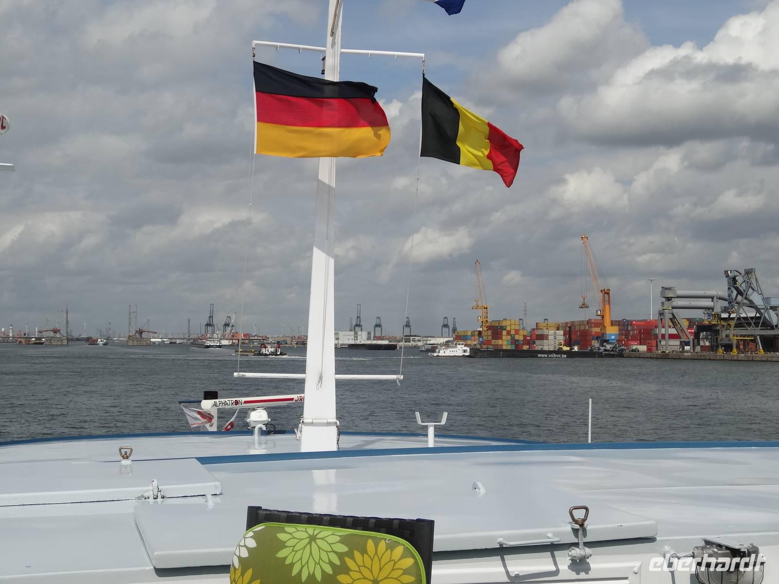 Beim Aufwachen stellten wir fest, dass unser Schiff bereits in Antwerpen angelegt hat. Nach einem stärkenden Frühstück kam unser Bus und eine örtliche Reiseleiterin, die uns zu einem Ausflug nach Brügge einlud. Auf der Hinfahrt fuhren wir durch kleine belgische Dörfer und bekamen daher einen Eindruck von der belgischen Lebensweise. In Brügge angekommen, unternahmen wir einen Spaziergang durch die noch aus dem Mittelalter erhaltene Stadt. Am Marktplatz endete unsere Führung und jeder konnte sich noch nach Lust und Laune umschauen. Am Nachmittag ging es entweder per Fuß oder per Stadtbus zurück zur Bushaltestelle, um dann wieder zu unserem Schiff zu gelangen, welches ja in Antwerpen vor Anker lag. Leider war Petrus an diesem Tag nicht so gnädig gestimmt, denn er schickte uns Regen. Aber dafür wurden wir auf der Rückfahrt mit einem schönen Regenbogen belohnt. Nach dem Abendessen an Bord konnte jeder auf seine Weise den Abend ausklingen lassen. Da unser Schiff über Nacht in Antwerpen blieb, nutzten einige die Möglichkeit eines Abendspaziergangs im Hafen, andere machten es sich auf der Terrasse oder im Salon gemütlich.