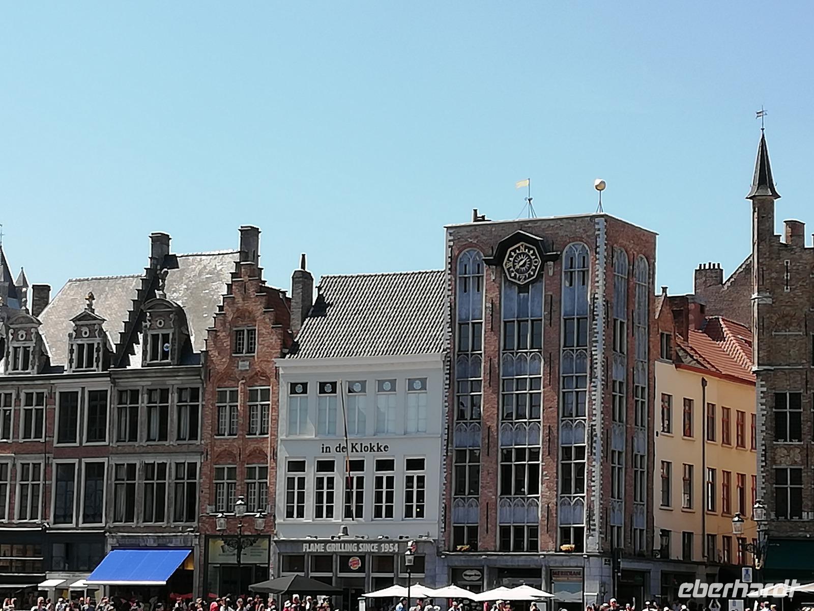 Grote Markt - Der zentrale große Markt Brügges war im Mittelalter noch mit dem Schiff erreichbar. An der Ostseite des Marktes konnten Stoffe in der „Waterhalle" genannten großen Tuchhalle im Trockenen gelagert und gehandelt werden. Das Wahrzeichen der Stadt ist der „Brügger Belfried" - 83 m hoch+ einem Glockenspiel aus 47 Glocken und in die Hallen am zentralen Marktplatz von Brügge (Grote Markt) integriert. Er wurde ebenso wie diese im 13. Jahrhundert erbaut und diente als Brandwache. Noch heute darf ihn kein Neubau überragen. Wunderschön auch der Provinciaal Hof - im Stil der Neogotik erbaut. Er ist Regierungssitz der Provinz Westflandern. In unserer Freizeit hatten wir die Möglichkeit einheimische Spezialitäten, wie Belgische Waffeln, Muscheln, Pralinen, Bier etc. oder dass ein oder andere Mitbringsel zu erwerben.