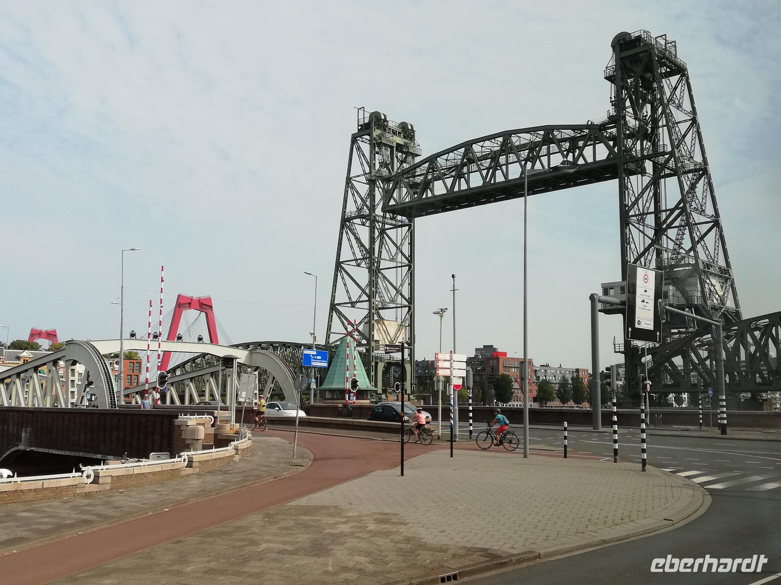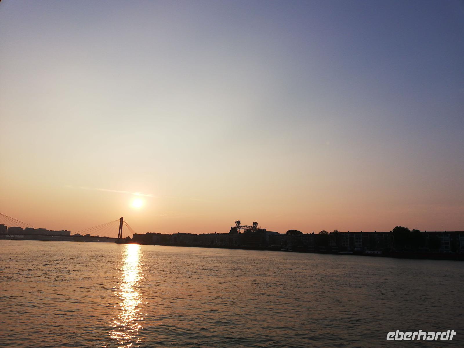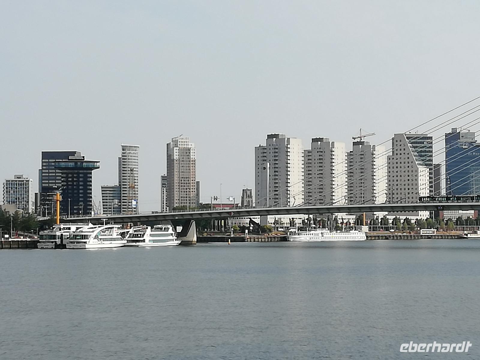 Unser Anleger beim Uniworld Steiger befindet sich direkt an der Erasmusbrücke. Die Erasmusbrücke (niederl. Erasmusbrug) ist eine Schrägseilbrücke über die Nieuwe Maas, einen Hauptstrom im Rhein-Maas-Delta. Die nach dem Philosophen Erasmus von Rotterdam benannt wurde, verbindet das Zentrum mit dem Kop van Zuid, einem städtebaulichen Entwicklungsgebiet.