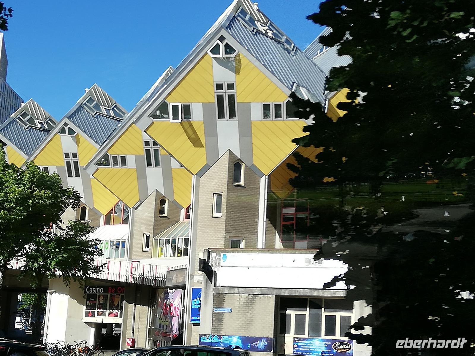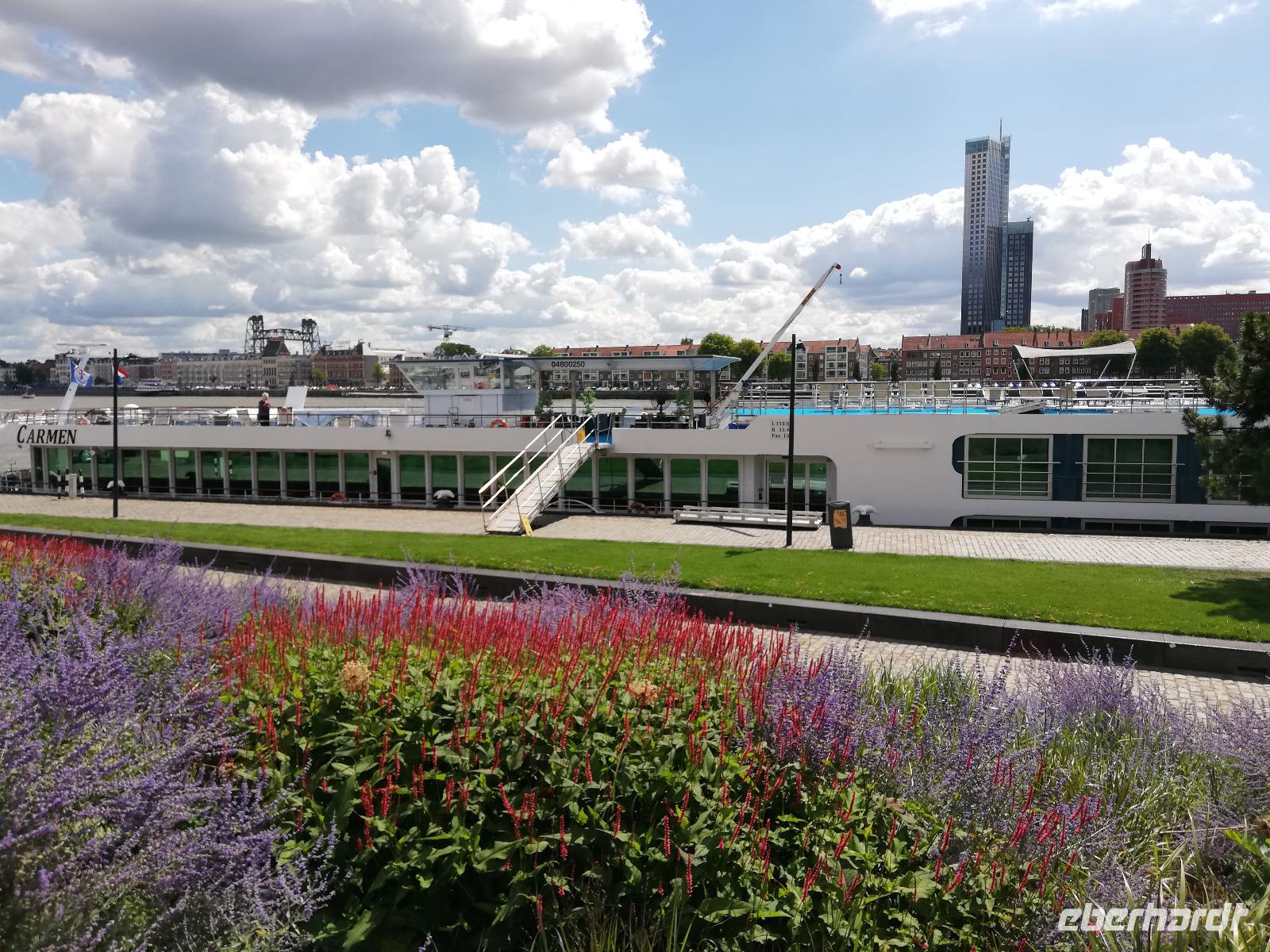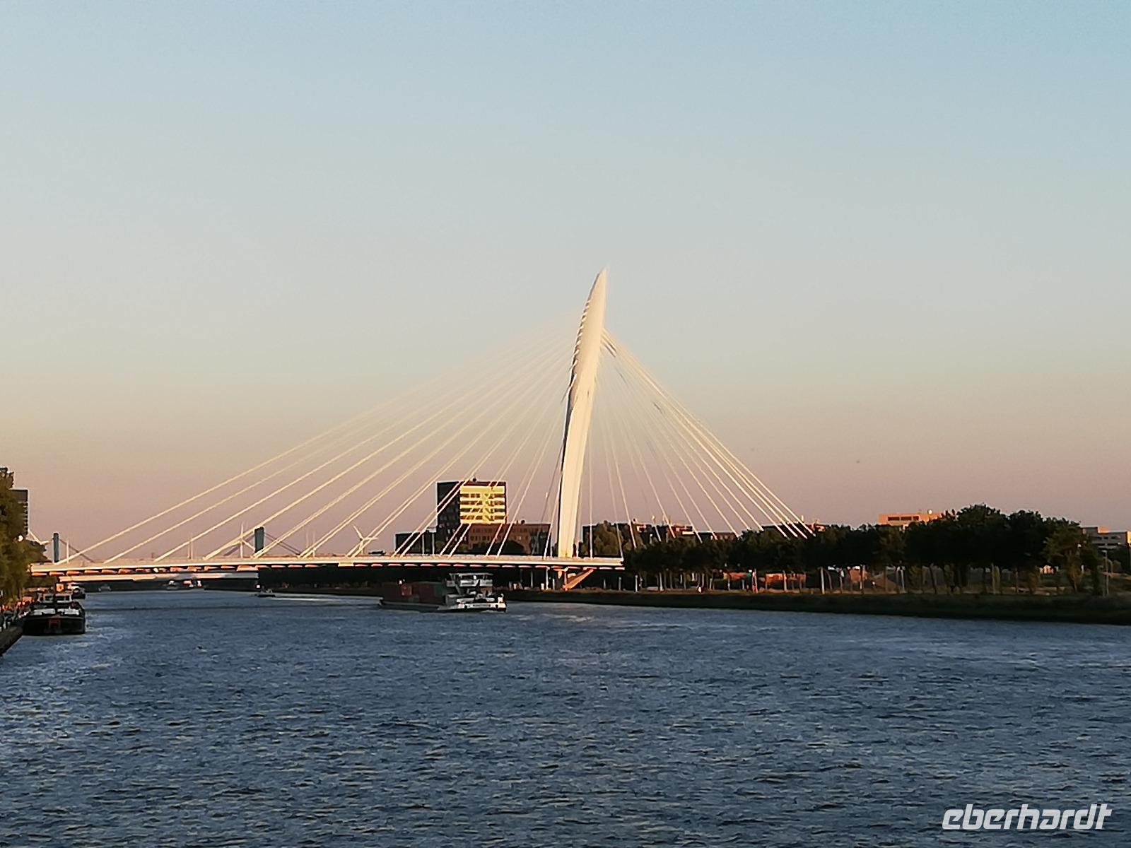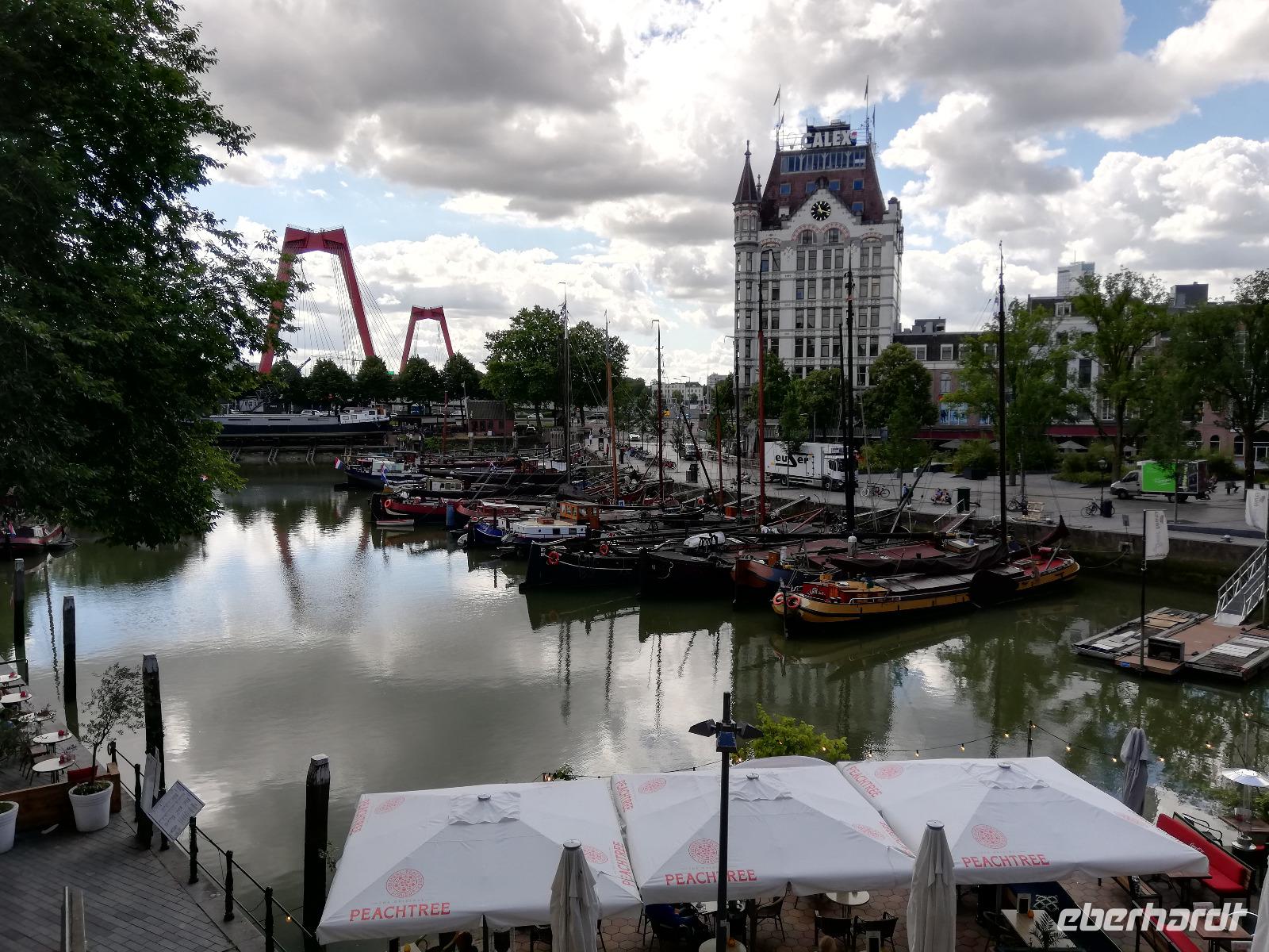 Einige Gäste sind am frühen Morgen auf Deck, wir sind in Rotterdam angekommen und man kann vom Schiff aus die Ruhe genießen, die in der Stadt noch vorherrscht. Wir stehen direkt vor der Erasmusbrücke, die über der neuen Maas das Stadtzentrum mit dem Kop van Zuid verbindet. Die Brücke ist ein neues Wahrzeichen der Stadt und wurde am 04.09.1996 eröffnet. Die Fotografen haben ihre Freude, diesen Bau am frühen Morgen zu fotografieren. Nach dem Frühstück gegen O9.00 Uhr beginnen wir mit unserer zweistündigen Stadtrundfahrt. Unsere Stadtführerin(Ulla) gebürtige Deutsche aber leidenschaftliche Holländerin überrascht uns mit den vielen Informationen zur Stadt und den Liedern der Hafenarbeiter. Erläuterung übermittelt Sie in Reimform. Ulla kann man nicht so schnell vergessen. Wir hatten viel Glück, dass sie uns durch ihre Stadt geführt hat. Während der Führung erfahren wir, dass Rotterdam die zweit größte Stadt der Niederlande und aufgrund des größten Seehafens Europas, auch ein bedeutender Verkehrsknotenpunkt, ist. Einen Zwischenstopp legen wir am Hotel New York ein. Wir sind im Süden der Stadt angekommen und erfahren, dass in dem heutigen Hotel die Unterkunft für Amerika-Emigranten war. Nach den 2 Stunden Stadtrundfahrt bleibt noch Zeit um die Markthalle, die Kubushäuser oder auch den alten Hafen zu besichtigen.