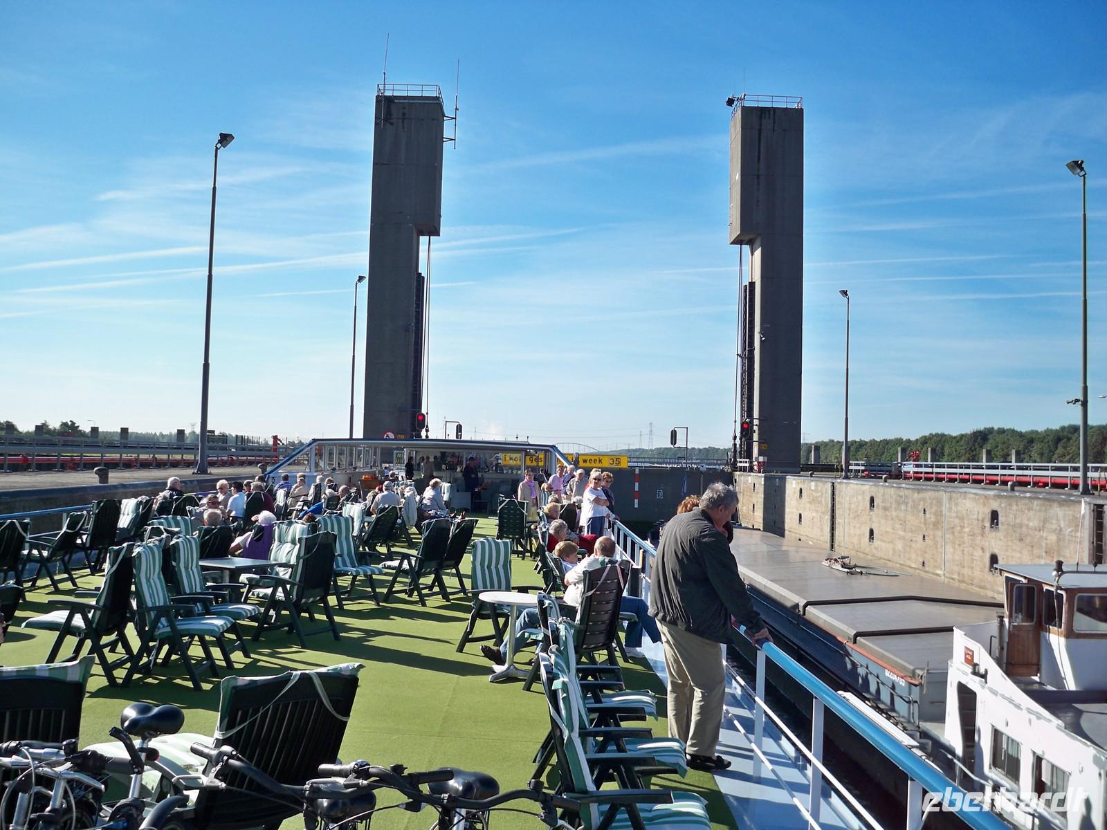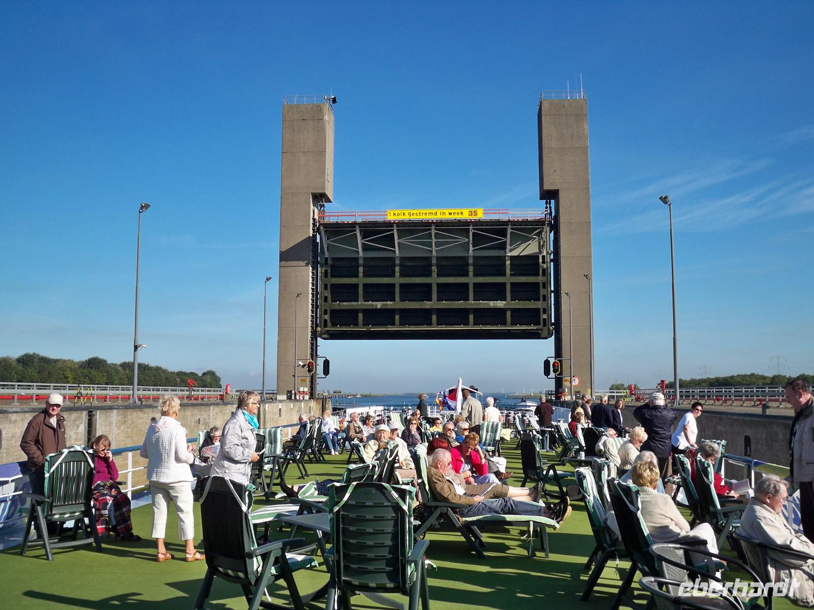 Nach dem leckeren Frühstücksbuffet fanden sich schon bald die Gäste auf dem Sonnendeck ein. Die Sonne schien, es war aber noch recht frisch. Mit Brigitta konnte man sich deshalb bei einer leichten Gymnastik aufwärmen. Dann gab es „Leckerbissen" im Salon und Bordmusiker Oliver spielte auch schon wieder. Allmählich näherten wir uns Antwerpen. Allerdings gab es einen längeren Stau vor der Schleuse "Volkerak". Dann passierten wir die imposanten Hafenanlagen von Antwerpen und waren erstaunt von der Größe dieses Hafens.