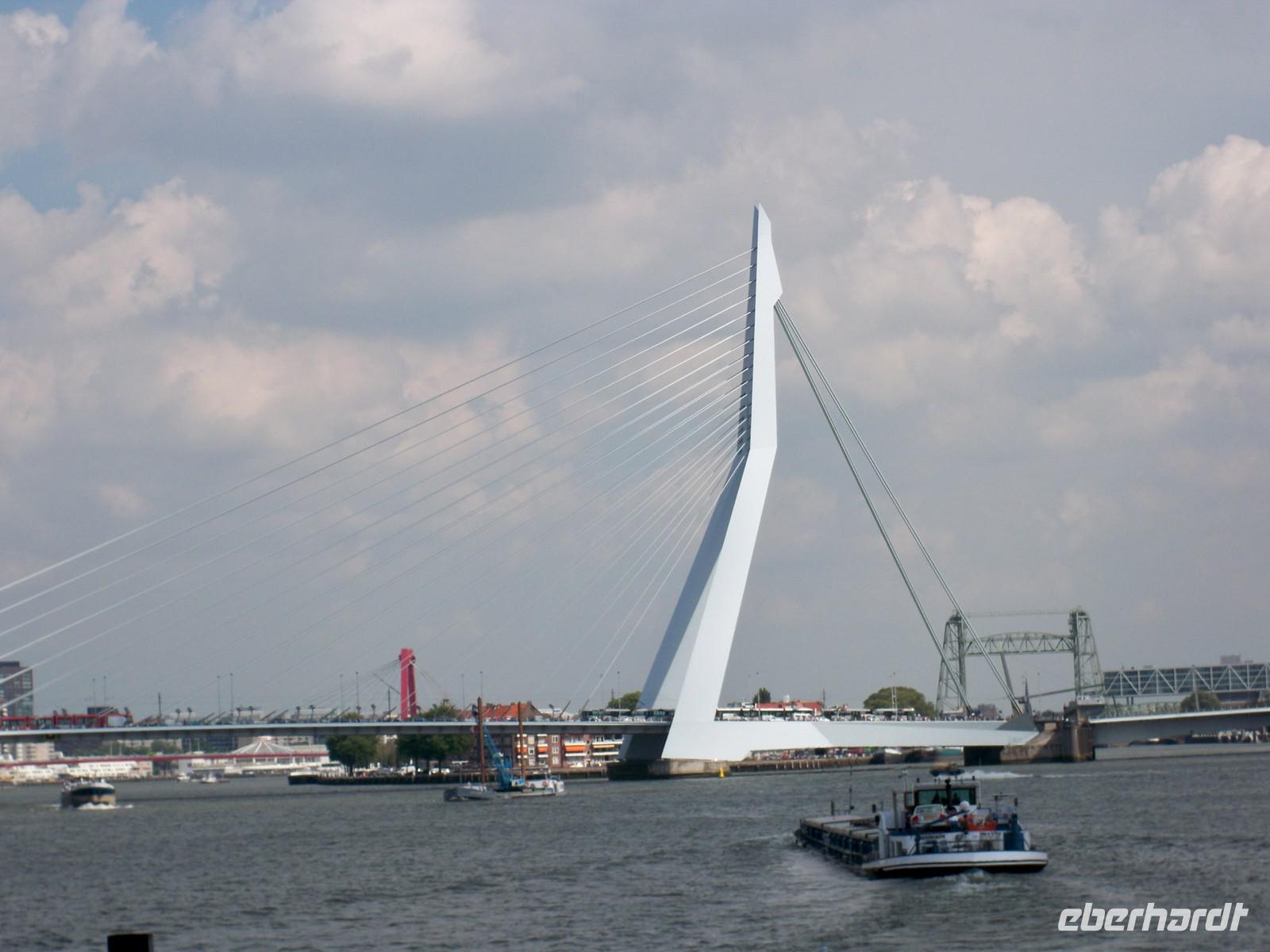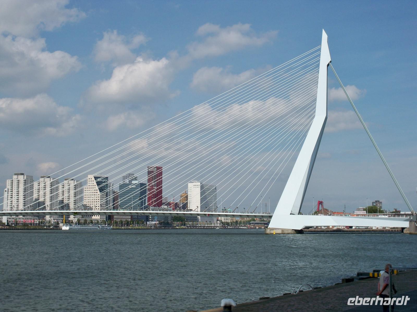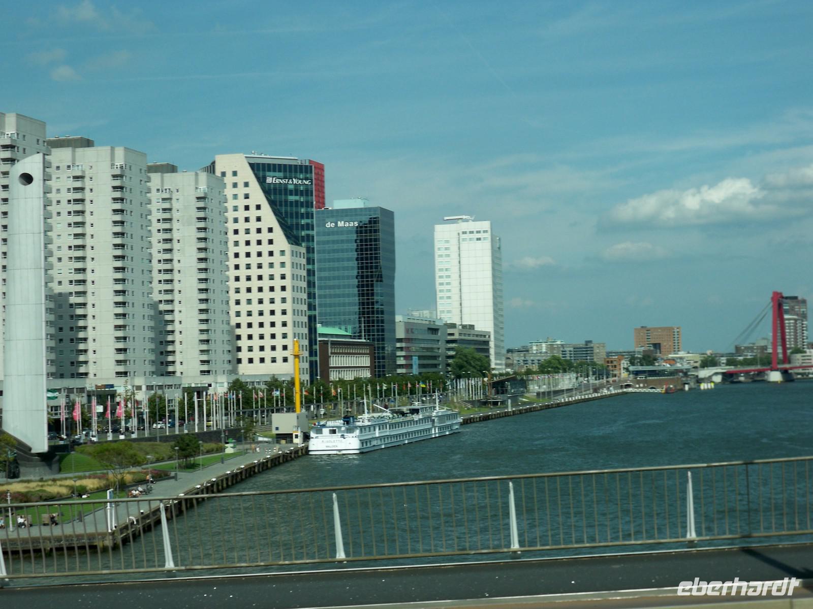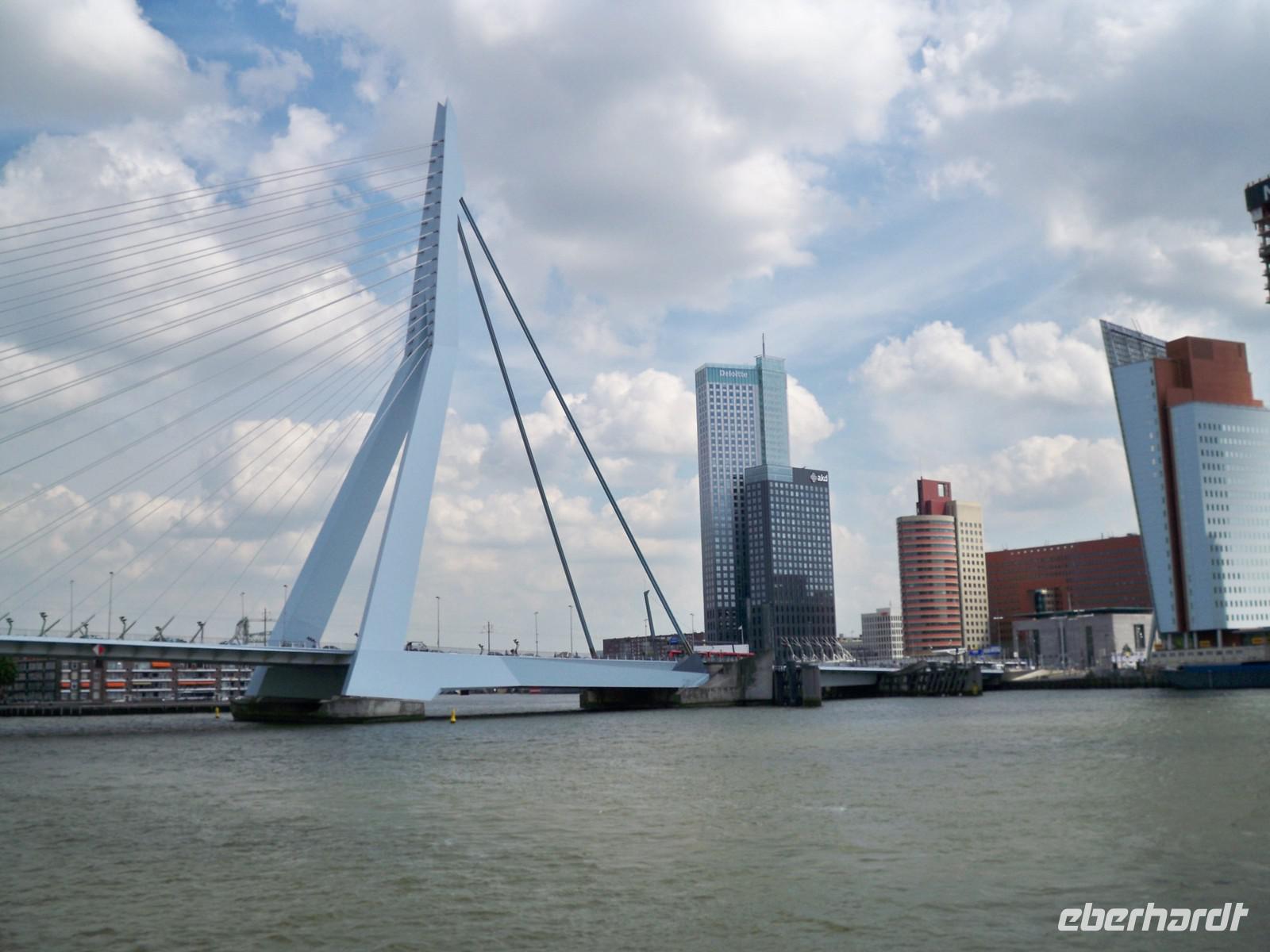 Am frühen Morgen legte unser Schiff in Richtung Rotterdam ab. Durch Schleusen, den Schelde-Rhein-Kanal und die Oude Maas ging es weiter Richtung Rotterdam. Auch heute wieder strahlend schönes Wetter. Also schnell auf das Sonnendeck und die Landschaft genießen. Wieder Stau an der Schleuse. Vorbei an Rotterdams Hafenanlagen ankerten wir dann direkt in der Nähe der „Erasmusbrücke". Auf Grund ihrer weißen Farbe und der zauberhaften Gestaltung gleicht sie einem Schwan und wird auch liebevoll so genannt. 800 Meter lang mit einem 139 Meter hohen Pylon verbindet sie seit 1996 als wichtigste Verbindung den Norden und den Süden der Stadt. Der Nachmittag begann mit einer Stadtrundfahrt. Unsere Stadtführerin machte die Tour durch die zweitgrößte Stadt der Niederlande zu einem besonderen Erlebnis. Sehr interessant gestaltete sie die Rundfahrt durch die Stadt mit dem größten Seehafen der Welt. Erzählte viel von Land und Leuten und der Entwicklung der im 2. Weltkrieg fast völlig zerstörten Stadt.