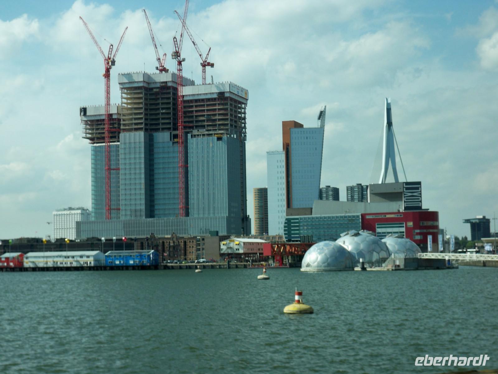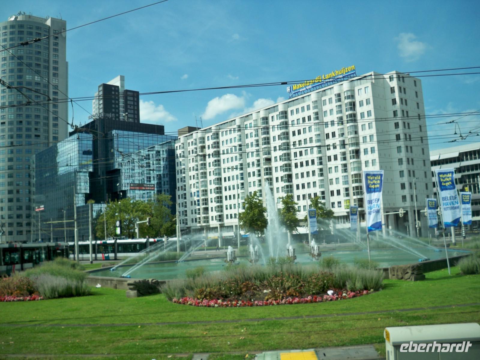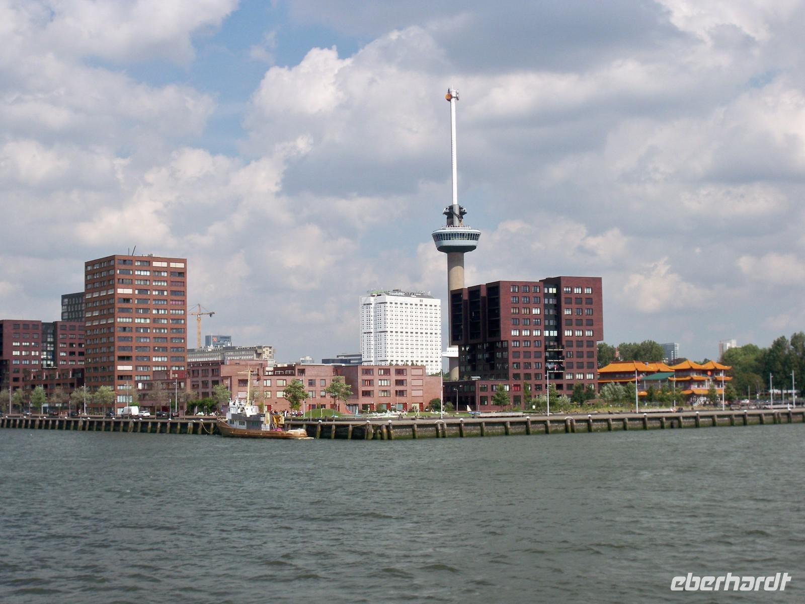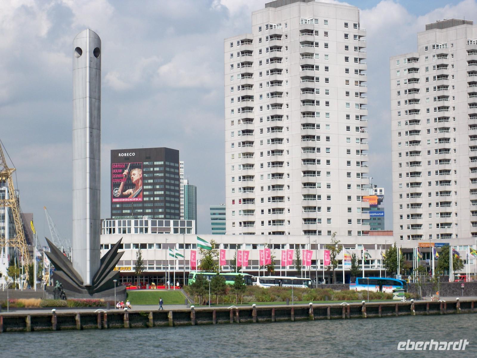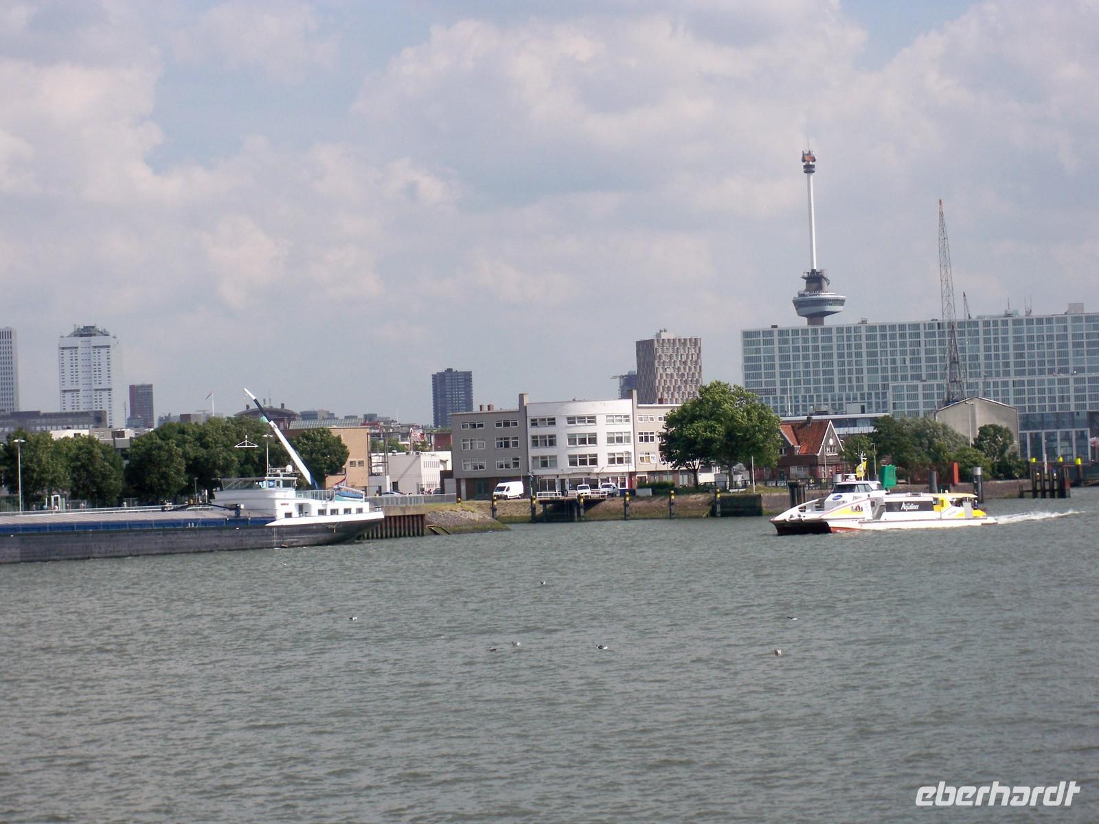 Am frühen Morgen legte unser Schiff in Richtung Rotterdam ab. Durch Schleusen, den Schelde-Rhein-Kanal und die Oude Maas ging es weiter Richtung Rotterdam. Auch heute wieder strahlend schönes Wetter. Also schnell auf das Sonnendeck und die Landschaft genießen. Wieder Stau an der Schleuse. Vorbei an Rotterdams Hafenanlagen ankerten wir dann direkt in der Nähe der „Erasmusbrücke". Auf Grund ihrer weißen Farbe und der zauberhaften Gestaltung gleicht sie einem Schwan und wird auch liebevoll so genannt. 800 Meter lang mit einem 139 Meter hohen Pylon verbindet sie seit 1996 als wichtigste Verbindung den Norden und den Süden der Stadt. Der Nachmittag begann mit einer Stadtrundfahrt. Unsere Stadtführerin machte die Tour durch die zweitgrößte Stadt der Niederlande zu einem besonderen Erlebnis. Sehr interessant gestaltete sie die Rundfahrt durch die Stadt mit dem größten Seehafen der Welt. Erzählte viel von Land und Leuten und der Entwicklung der im 2. Weltkrieg fast völlig zerstörten Stadt.