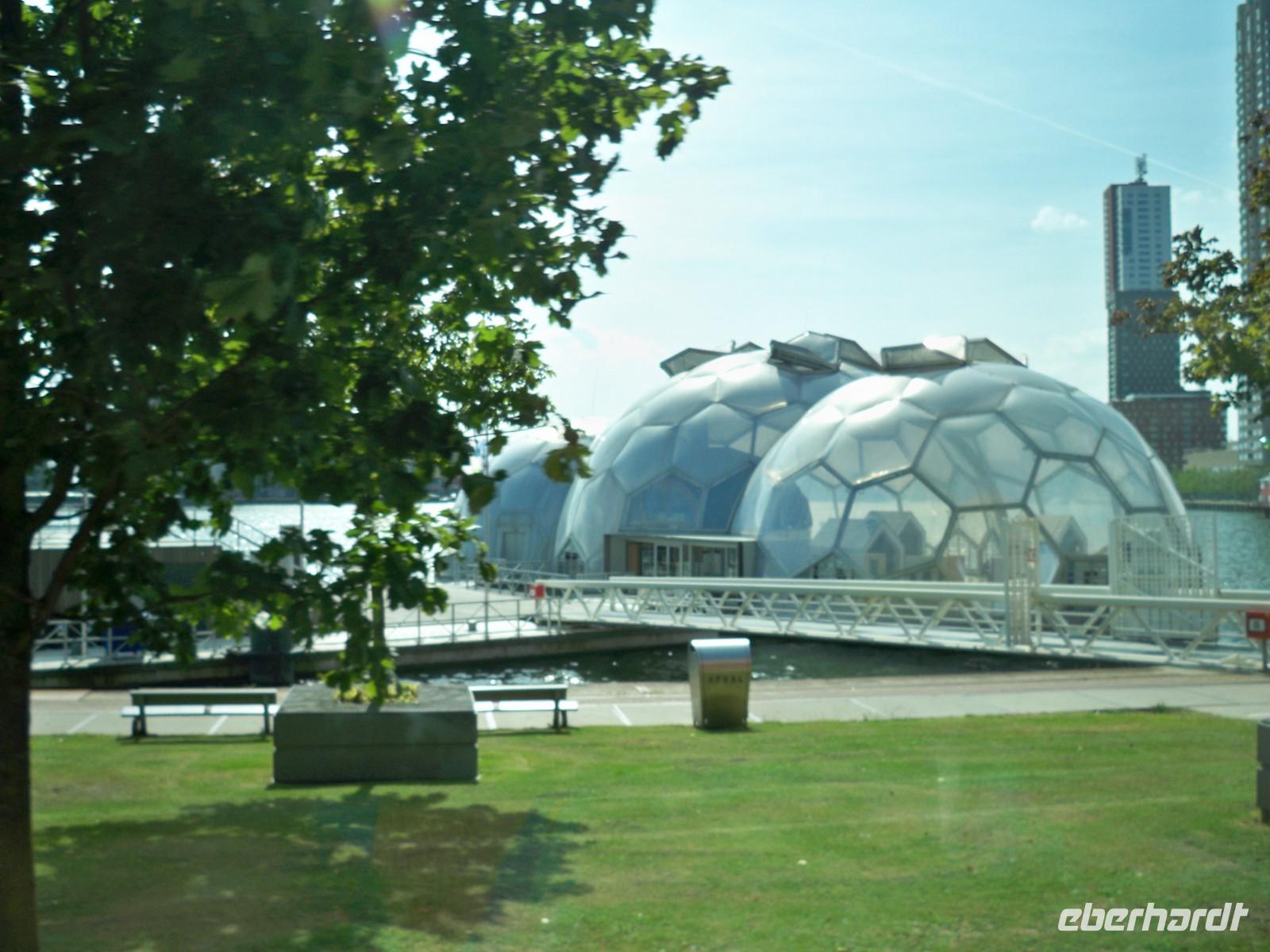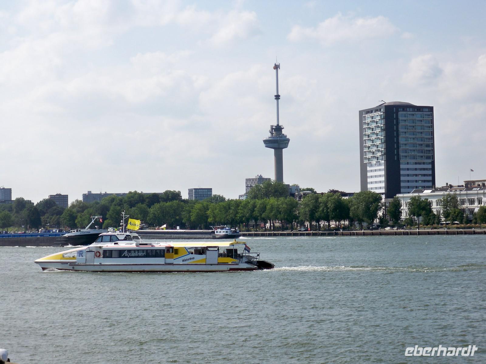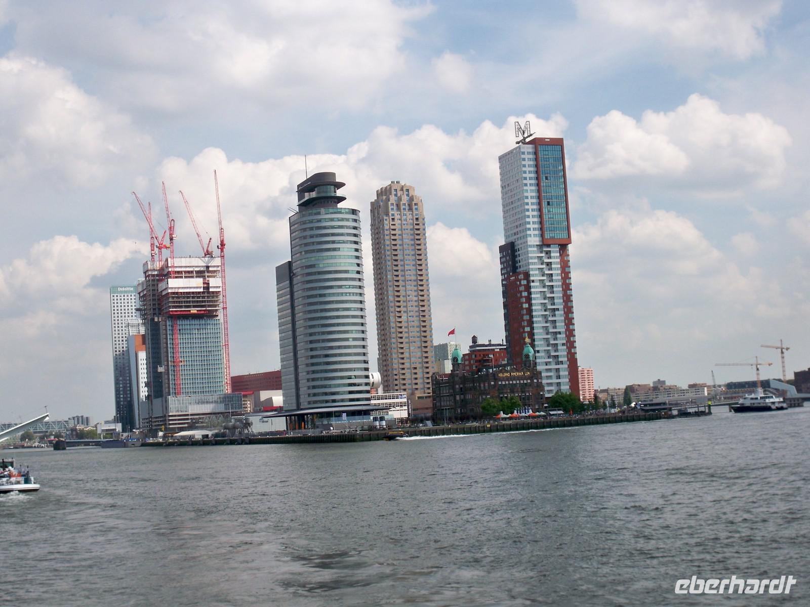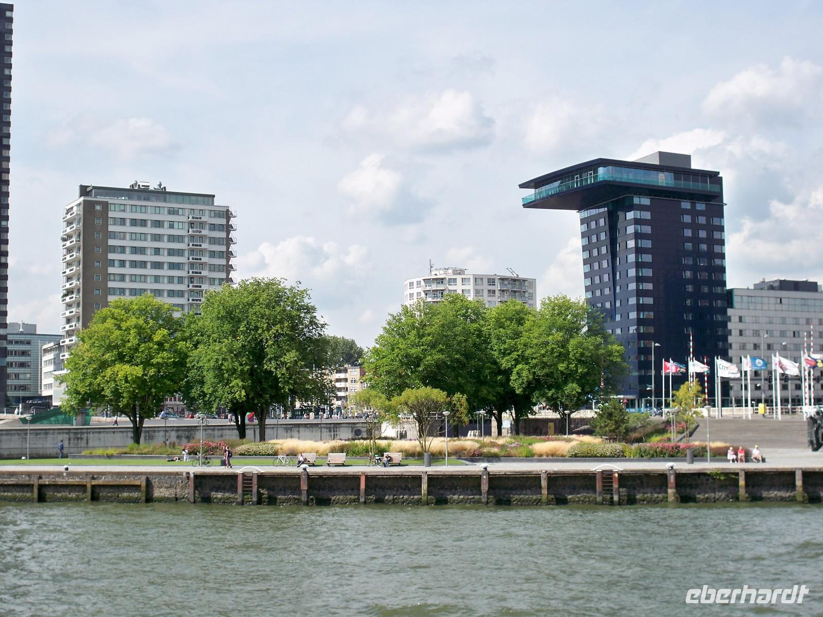 Am frühen Morgen legte unser Schiff in Richtung Rotterdam ab. Durch Schleusen, den Schelde-Rhein-Kanal und die Oude Maas ging es weiter Richtung Rotterdam. Auch heute wieder strahlend schönes Wetter. Also schnell auf das Sonnendeck und die Landschaft genießen. Wieder Stau an der Schleuse. Vorbei an Rotterdams Hafenanlagen ankerten wir dann direkt in der Nähe der „Erasmusbrücke". Auf Grund ihrer weißen Farbe und der zauberhaften Gestaltung gleicht sie einem Schwan und wird auch liebevoll so genannt. 800 Meter lang mit einem 139 Meter hohen Pylon verbindet sie seit 1996 als wichtigste Verbindung den Norden und den Süden der Stadt. Der Nachmittag begann mit einer Stadtrundfahrt. Unsere Stadtführerin machte die Tour durch die zweitgrößte Stadt der Niederlande zu einem besonderen Erlebnis. Sehr interessant gestaltete sie die Rundfahrt durch die Stadt mit dem größten Seehafen der Welt. Erzählte viel von Land und Leuten und der Entwicklung der im 2. Weltkrieg fast völlig zerstörten Stadt.