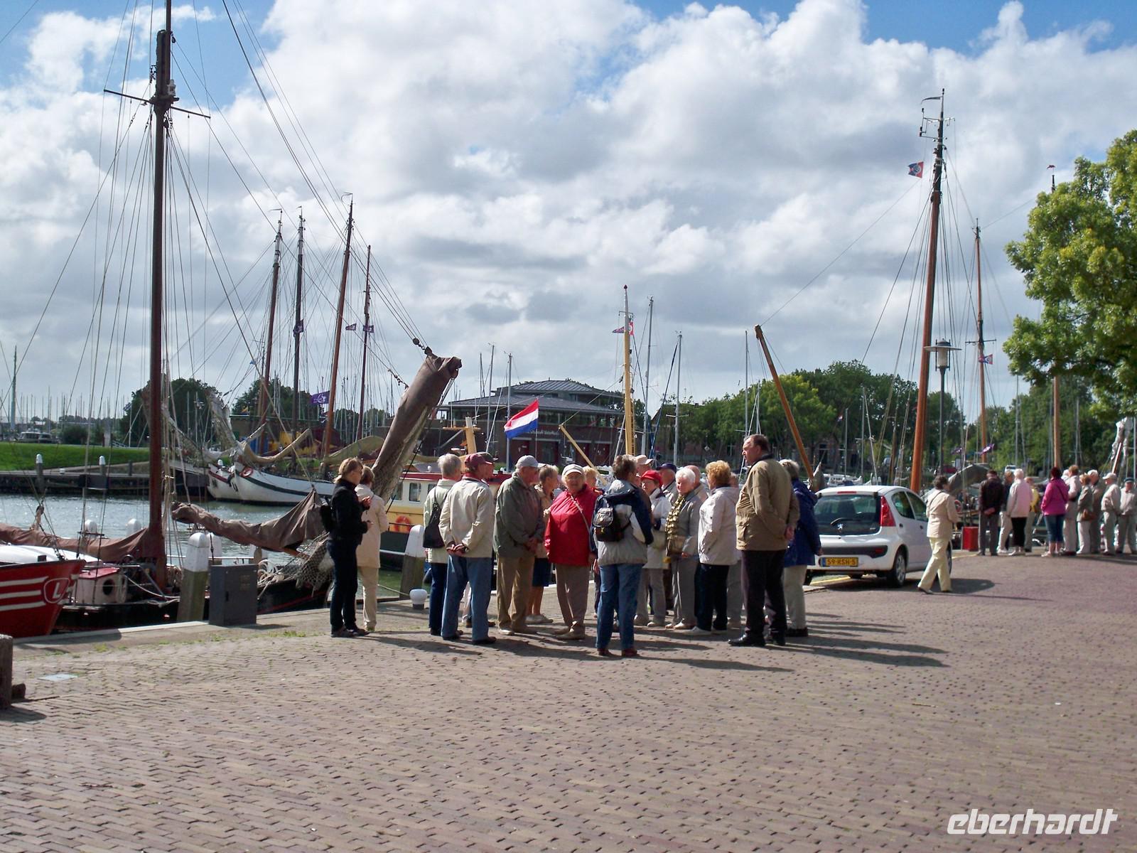 Während des Frühstücks startete unser Schiff zur Fahrt nach Enkhuizen. Kühl und regnerisch begann der Morgen und durch das Marker Meer schaukelte unser Schiff bei Windstärke 7. Kein besonderes Vergnügen. Doch Oliver heiterte uns mit Frühschoppenmusik auf. Nach dem Mittagessen erwarteten uns im Hafen von Enkhuizen die Stadtführer. Die Sonne wagte sich auch wieder hervor und der Stadtrundgang durch das zauberhafte Hafenstädtchen konnte also beginnen.