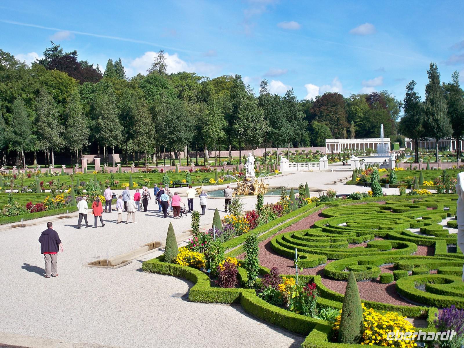 Der Weg vom Busparkplatz zum Schloss war für einige Gäste sehr anstrengend. Die örtlichen Stadtführer erwarteten uns. Wir begannen unseren Rundgang zunächst durch die wunderbar gepflegten Parkanlagen des Schlosses. Der rund um das Palais angelegte Barockgarten verzaubert durch seine Broderiebeete, Statuen, Prunkvasen und Springbrunnen.