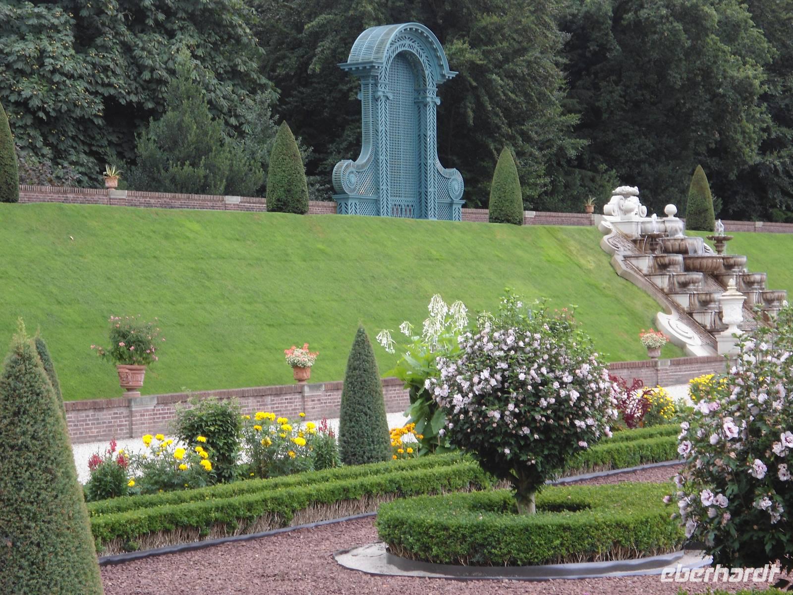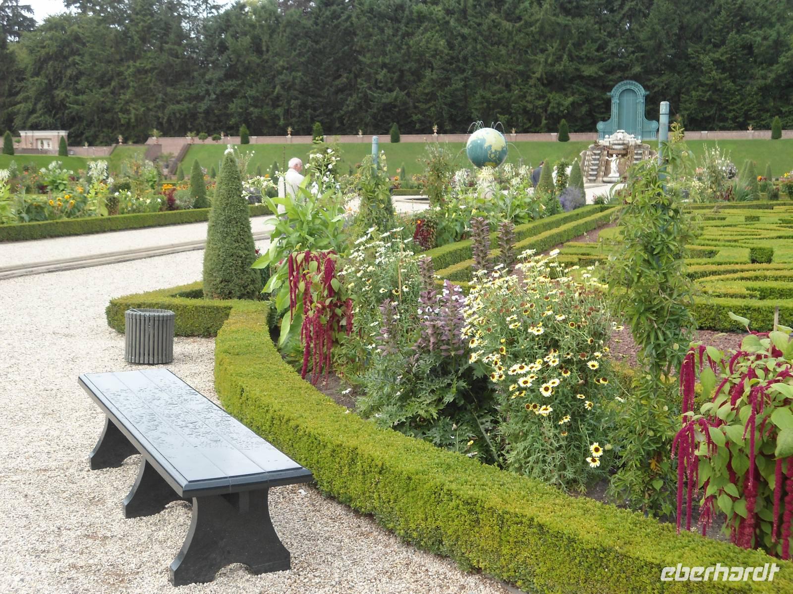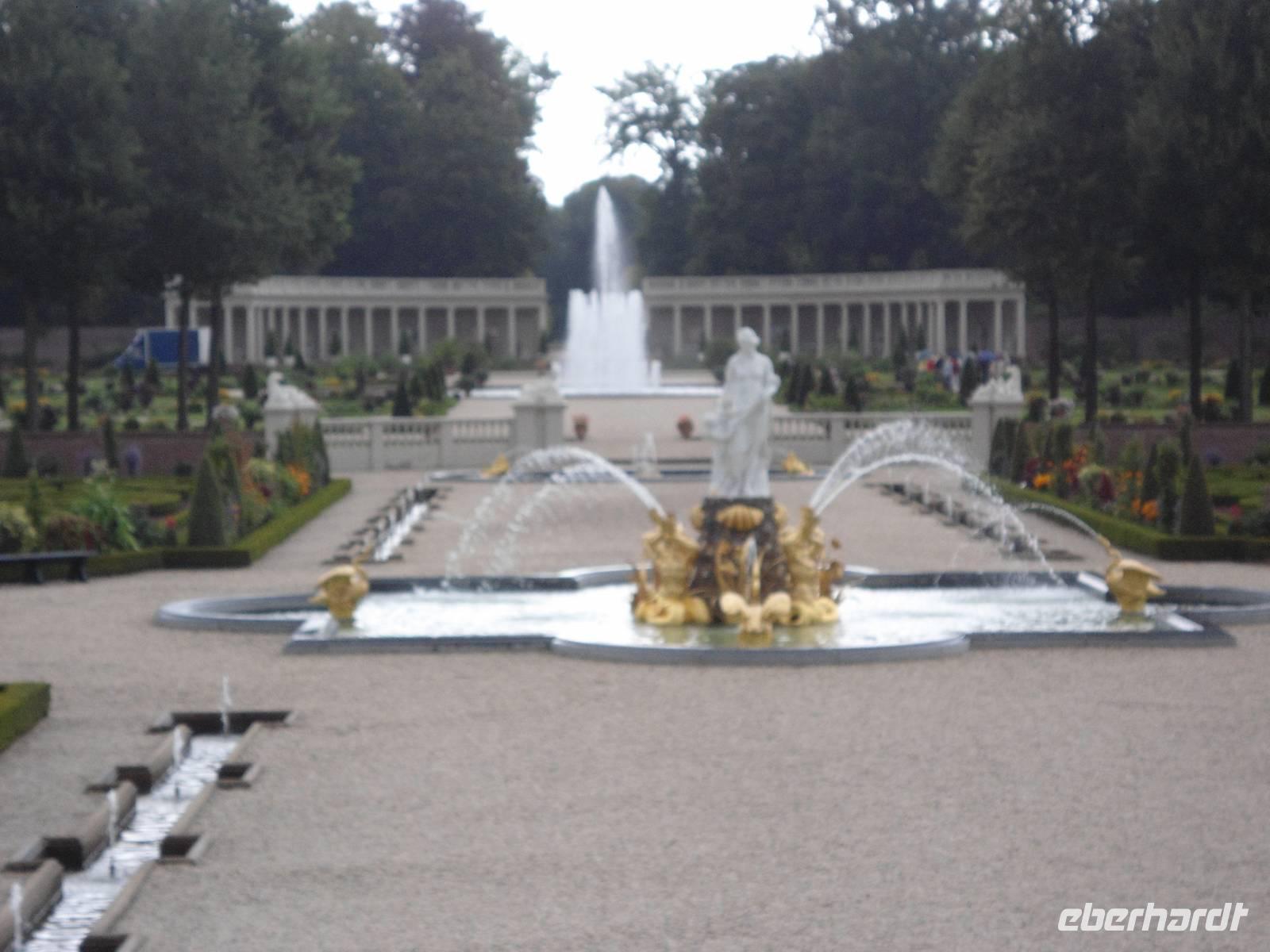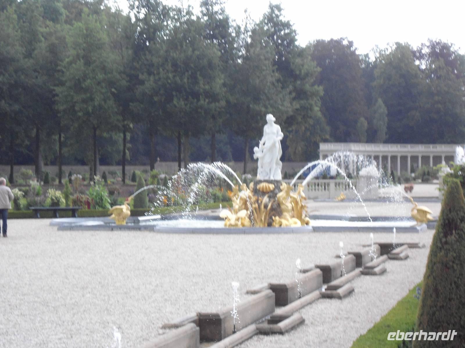 Am Palaiseingang erwarteten uns unsere Parkführer,  zeigten und erklärten uns den wunderbar angelegten und gepflegten Schlosspark. Teilweise terrassenförmig gestaltet, mit Springbrunnen und Wasserspielen ausgestattet  und Statuen ergänzt, ergibt alles eine wunderbare Einheit.