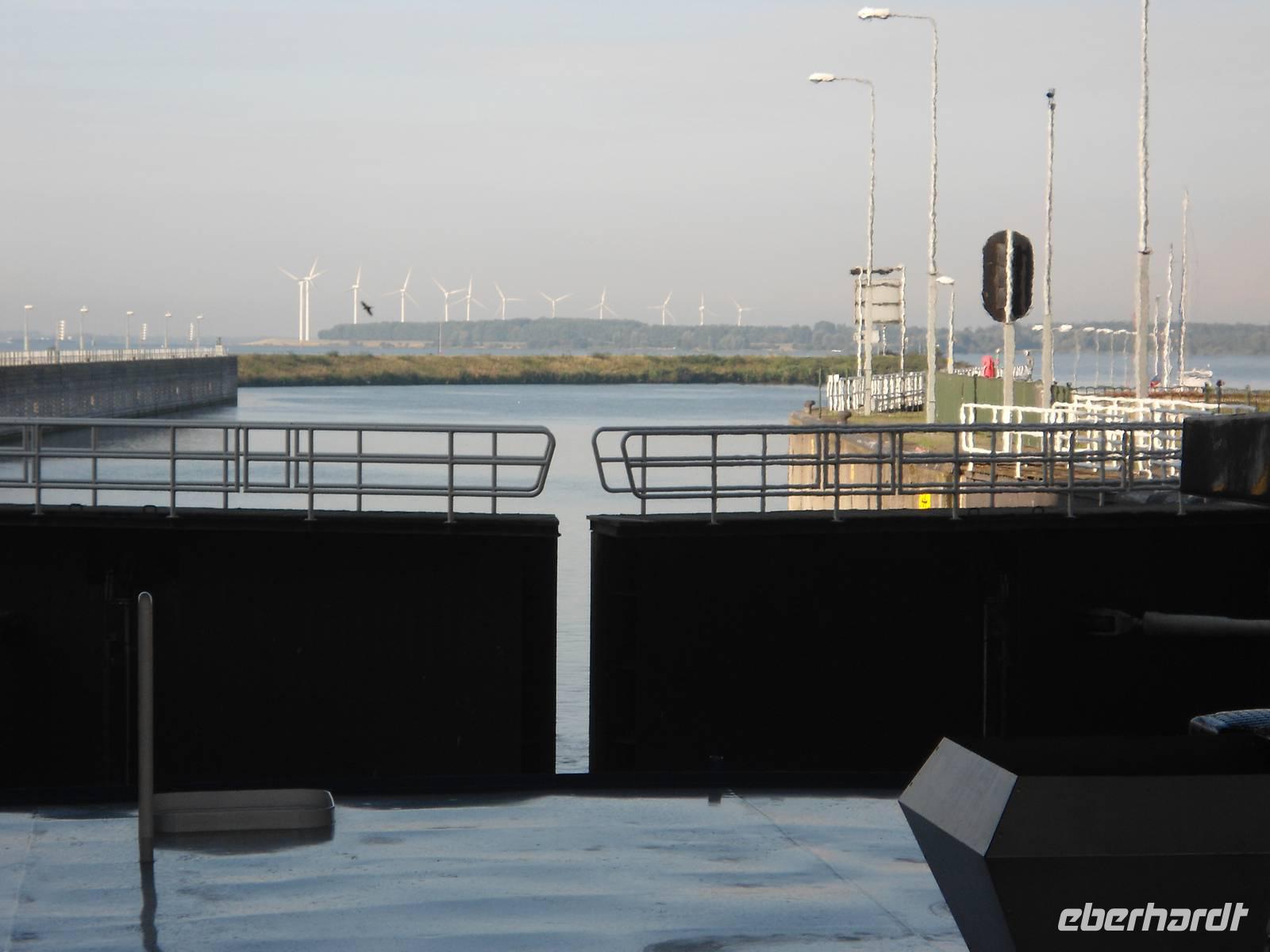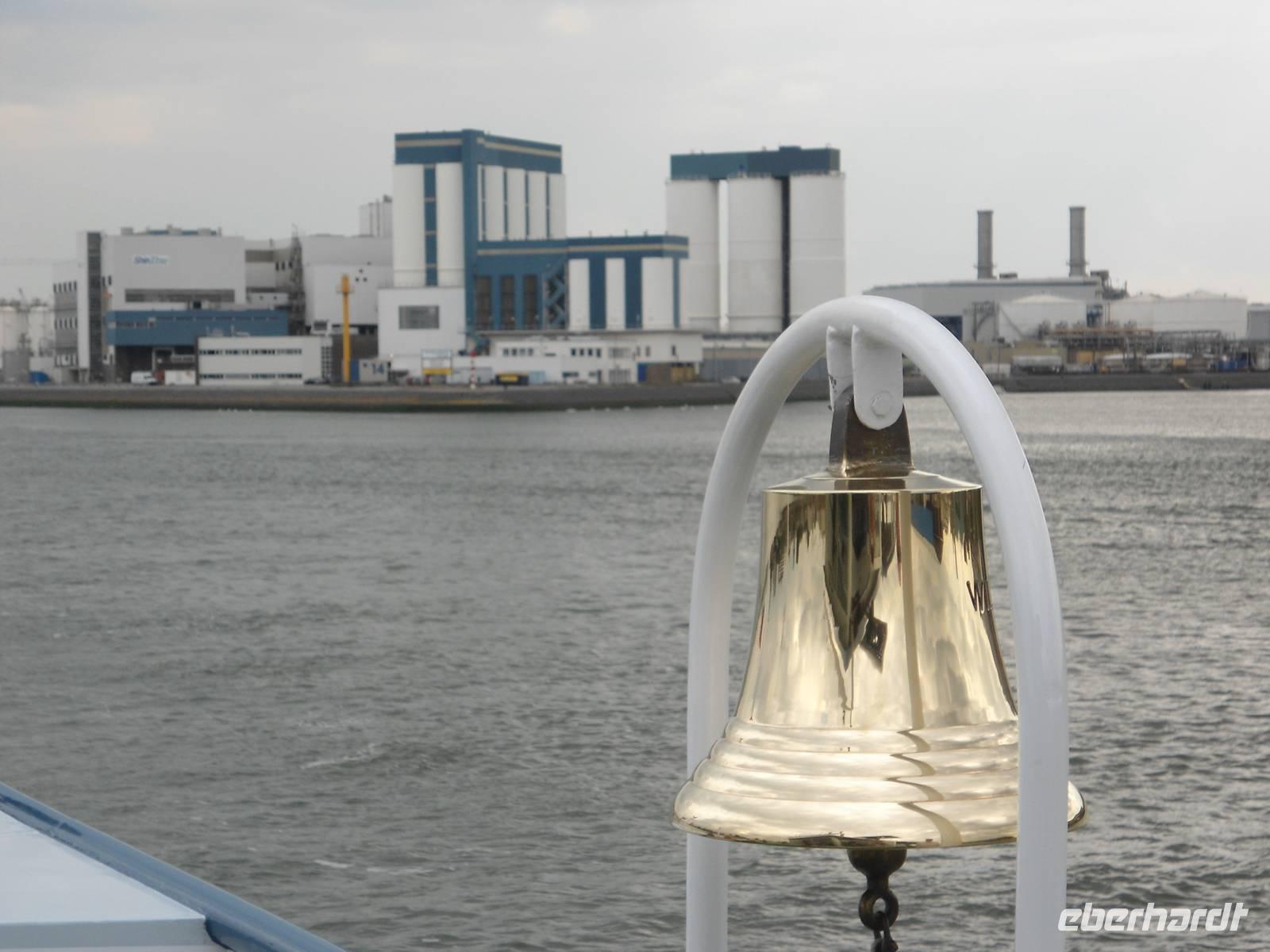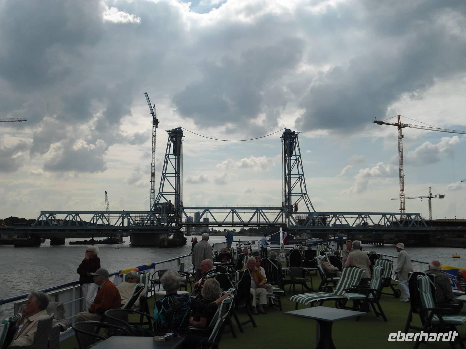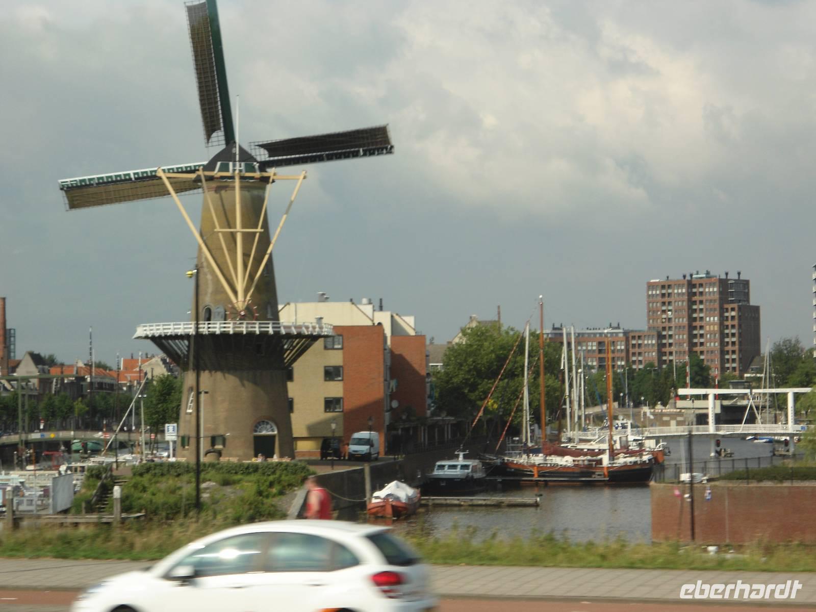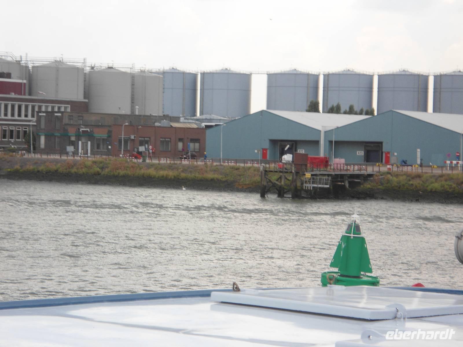 Am frühen Morgen nahm die „Rigoletto" Kurs auf Rotterdam. Wir fuhren wieder durch den „Schelde-Rijn-Kanal", den „Volkerak" mit der großen Schleuse bei „Willemstad" und weiter über die „Oud Maas" nach Rotterdam. Bei schönem Wetter hatten wir die Möglichkeit, auf dem Sonnendeck diese schöne Fahrtstrecke zu erleben. Ganz besonders beeindruckte uns die große Hafenanlage der Stadt, die uns eine lange Strecke begleitete. Rotterdam besitzt den größten Seehafen Europas. Umschlagplätze, Containerterminals, riesige Ölcontainer, Lagerhallen und Silos kennzeichnen den Hafen. Er zieht sich 20 km auf dem für Seeschiffe ausgebauten „Wasserweg" bis zur Nordsee. Davon konnten wir nur einen kleinen Teil von unserem Schiff aus sehen.