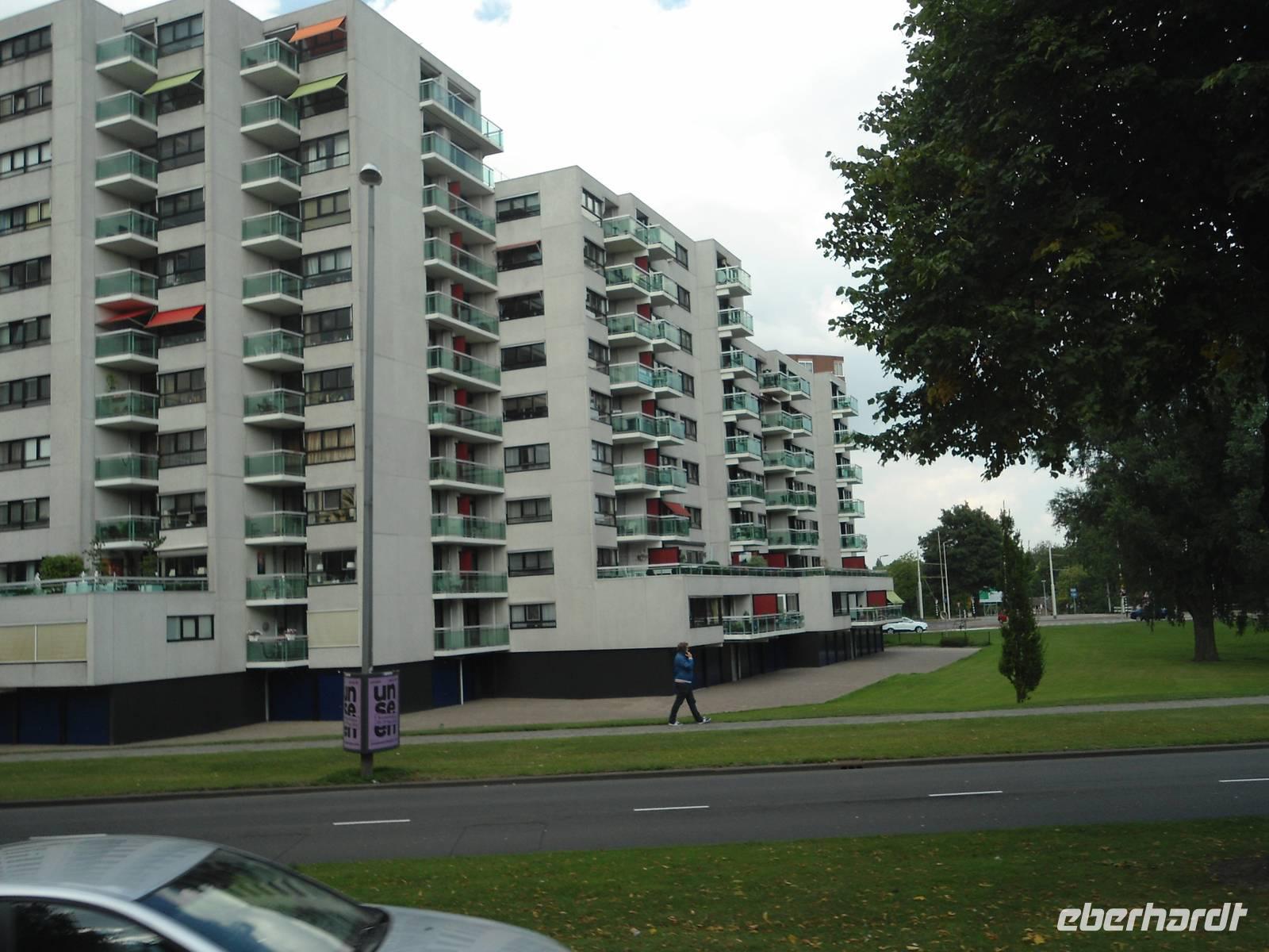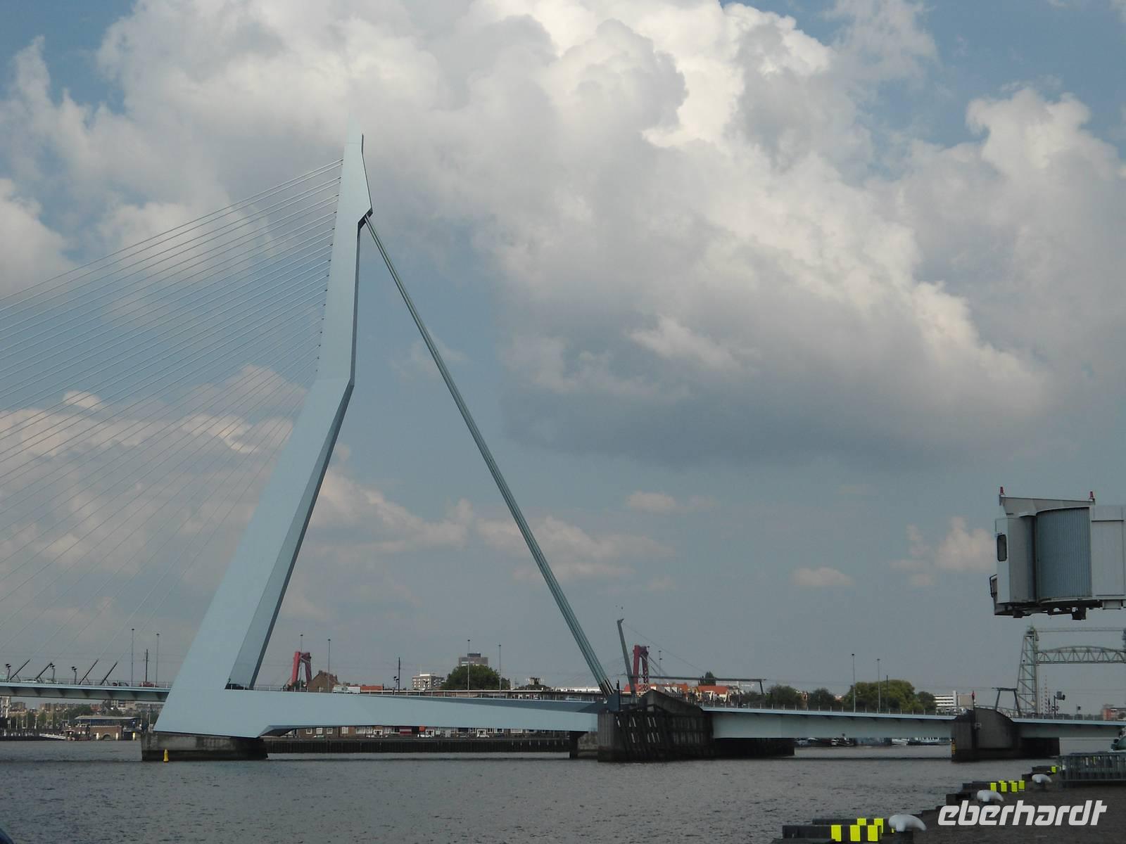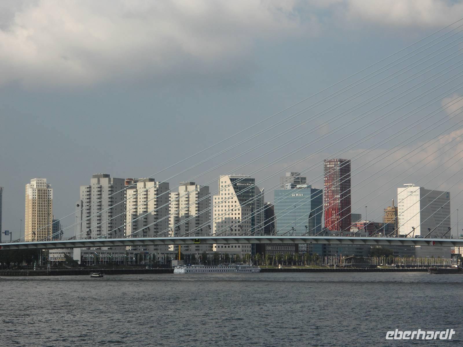 Aber uns interessierte auch die Stadt. Und die zeigte uns Jo van Schalk nach dem Mittag zur Stadtrundfahrt. Da Rotterdam im 2. Weltkrieg fast komplett zerstört wurde, ist in der heute modernen Großstadt Historisches kaum zu sehen. Aber auch die moderne Architektur in ihrer Vielseitigkeit hat uns beeindruckt. Und viele kleine grüne Inseln locken die Einwohner zum Verweilen. Das Wahrzeichen der Stadt ist wohl der „Weiße Schwan", die „Erasmusbrücke" in ihrer spektakulären Bauweise. Abends mit 3 Neonfarben beleuchtet. Wir erfuhren auch vieles über Land und Leute und somit waren die 2 Stunden schnell vorbei