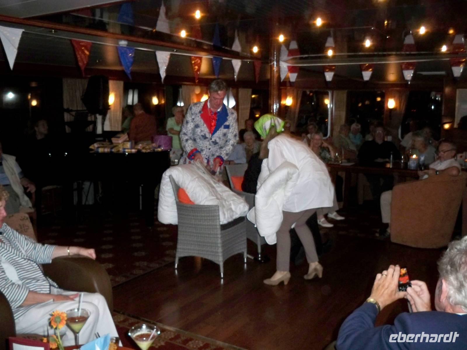 Nach dem Frühstück wartete unser Chauffeur Ulf bereits auf uns. Wir begaben uns auf eine Rundfahrt durch Amsterdam und Stadtführer Ton van Garderen vermittelte Interessantes über Land und Leute und die Hauptstadt der Niederlande. Beim Halt an der Rembrandt-Mühle wurde das obligatorische Gruppenfoto gemacht. Danach begaben wir uns zum Bootsanleger an der bekannten Heinecken-Brauerei, wo die Grachtenfahrt über die Wasserstraßen der Stadt begann. Vorbei an prachtvollen Giebelhäusern erlebten wir eine abwechslungsreiche Tour mit dem Boot. Gegen Mittag waren wir wieder an Bord und es blieb noch etwas Freizeit bis zur Abfahrt für individuelle Endeckungen. Am späten Nachmittag begann die Fahrt über das Markermeer nach Enkhuizen. An diesem Tag war es neblig trüb und das Meer sehr ruhig. Am Abend ankerten wir in Enkhuizen einem kleinen Hafenstädtchen. Nach dem Abendessen waren wir zur Crew-Show in den Salon eingeladen. Ein Abend mit viel Humor und Spaß wurde uns von der Mannschaft bereitet. Ungeahnte Talente boten ein abwechslungsreiches Programm. Dazu gab es bei der Tombola schöne Preise zu gewinnen. Bei Musik und Tanz erlebten wir einen schönen Abend an Bord der MS „Rigoletto".