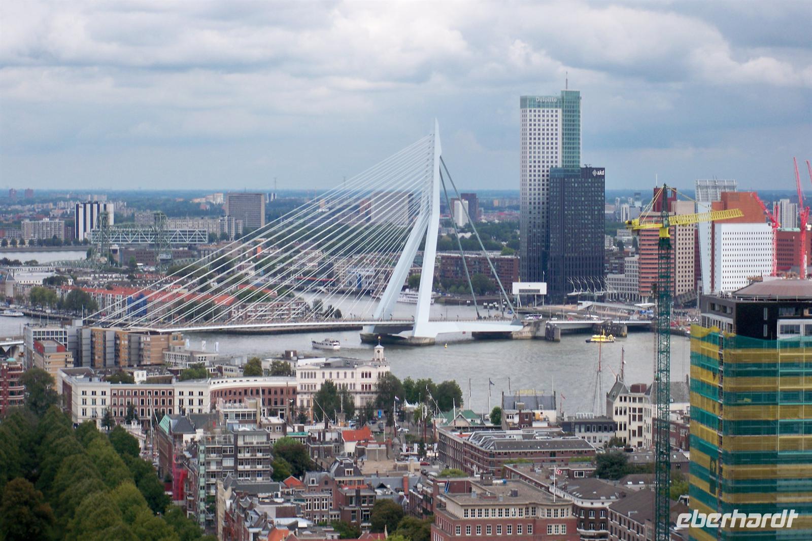 Um Mitternacht legte unser Schiff in Richtung Rotterdam ab und während des Frühstücks ankerten wir bereits in Rotterdam direkt in der Nähe der „Erasmusbrücke“. Auf Grund ihrer weißen Farbe und der zauberhaften Gestaltung gleicht sie einem Schwan und wird auch liebevoll so genannt. 800 Meter lang mit einem 139 Meter hohen Pylon verbindet sie seit 1996 als wichtigste Verbindung den Norden und den Süden der Stadt. Der Vormittag begann mit einer Stadtrundfahrt und unserem Reisebus mit Frank am Steuer. Stadtführerin Cornelia machte die Tour durch die zweitgrößte Stadt der Niederlande zu einem besonderen Erlebnis. Sehr lustig gestaltete sie die Rundfahrt durch die Stadt mit dem größten Seehafen der Welt. Erzählte sehr viel von Land und Leuten und der Entwicklung der im 2. Weltkrieg fast völlig zerstörten Stadt.