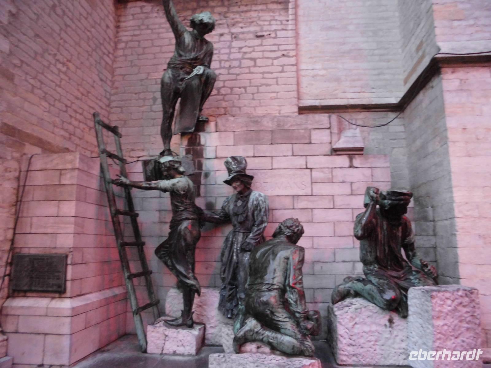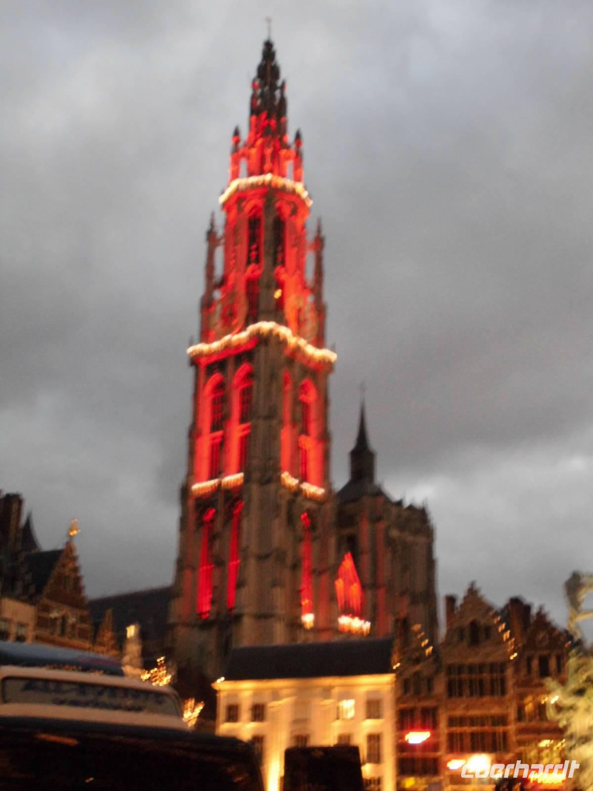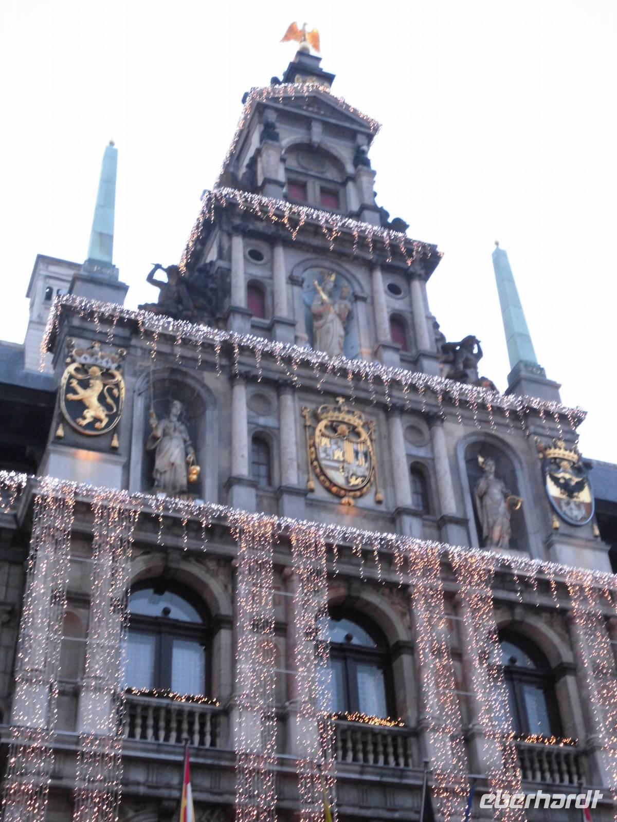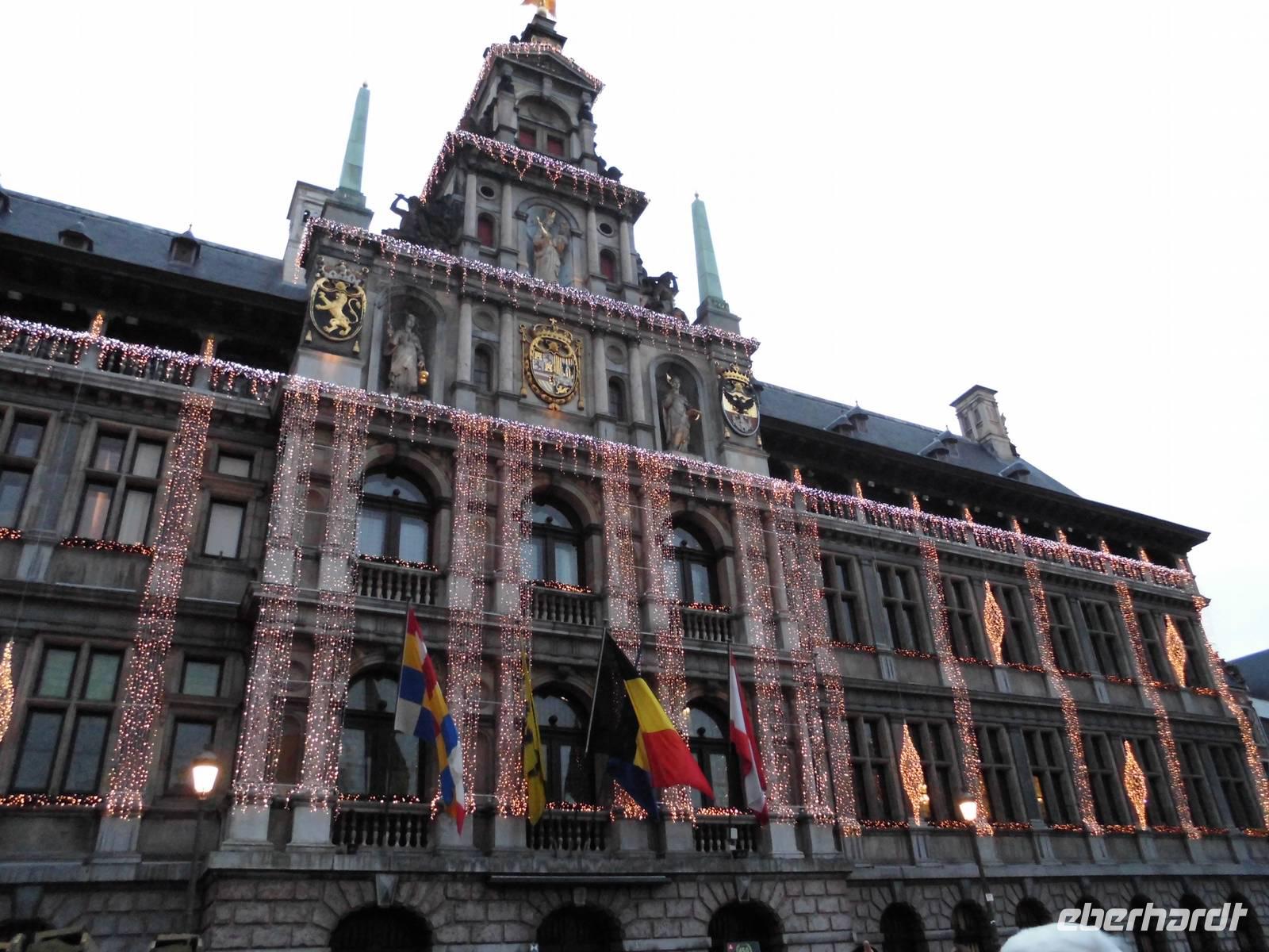 Am Bahnhof ANTWERPEN-CENTRAAL stiegen wir aus und waren von dem interessanten Bau angetan. Man nennt ihn auch EISENBAHNKATHEDRALE. Durch den prächtigen Innensaal gingen wir zu den Gleisanlagen. Dort können Züge auf 4 Etagen übereinander abfahren. Nach diesem technischen Wunder, ging es entlang der Diamatengeschäfte. Jeder Diamant der auf der Welt gefunden wird, wird in Antwerpen begutachtet. Nur ein kleiner Teil der Steine werden als Schmuck verarbeitet. Aber wir Frauen konnten uns nicht satt sehen an den Auslagen der Geschäfte. Die Männer waren froh, dass es keine Freizeit gab. So hieß es einsteigen in den Bus. Nach kurzer Fahrt stiegen wir an einem Parkplatz am Fluss Schelde aus. Vorbei an einem alten Jugendstilgebäude was heute als Parkhaus genutzt wird liefen wir in die noch weihnachtlich beleuchtete Altstadt. Der bedeutendste Sohn dieser Stadt ist Peter Paul Rubens. Geboren 1577 in Siegen als Sohn wohlhabender Eltern hat er hier in Antwerpen die Hauptzeit seines Lebens verbracht. Nach seinen Wanderjahren in Italien und Spanien, heiratete er und hatte in Antwerpen eine große Malschule. Es entstanden Werke wie „Sohn Niklas“ 1619 „Urteil des Paris“ 1636. 62jährig starb er 1640 in Antwerpen. Wir sahen das 1840 errichtete Denkmal für Rubens und das Rubenshaus auf dem Groenplaats. Der Spaziergang mit dem Stadtführer ging vorbei an alten Speichergebäuden, zum Grote Markt. Dieser Platz in der Altstadt umgeben mit vielen Zunfthäusern und dem Brabo-Brunnen erstrahlte im Licht der 10.000Lämpchen an den Bäumen. Vor dem Rathaus im Renaissancestil von 1561 bis 1564 vom Architekten De Vriendt entworfen, erklärte uns Stadtführer Gustav, die an der Fassade angebrachten 3Wappen. Der spanischen Regentschaft, der Stadt Antwerpen und das von Brabant. Schon von weitem zu sehen und rot angestrahlt, war die gotische Kreuzkirche mit dem 123m hohen Nordturm. Von 1352 bis 1521 erbaut beherbergt sie zwei berühmte Triptychen des flämischen Malers Rubens: die Kreuzabnahme (1621) und die Kreuzaufrichtung 1610)