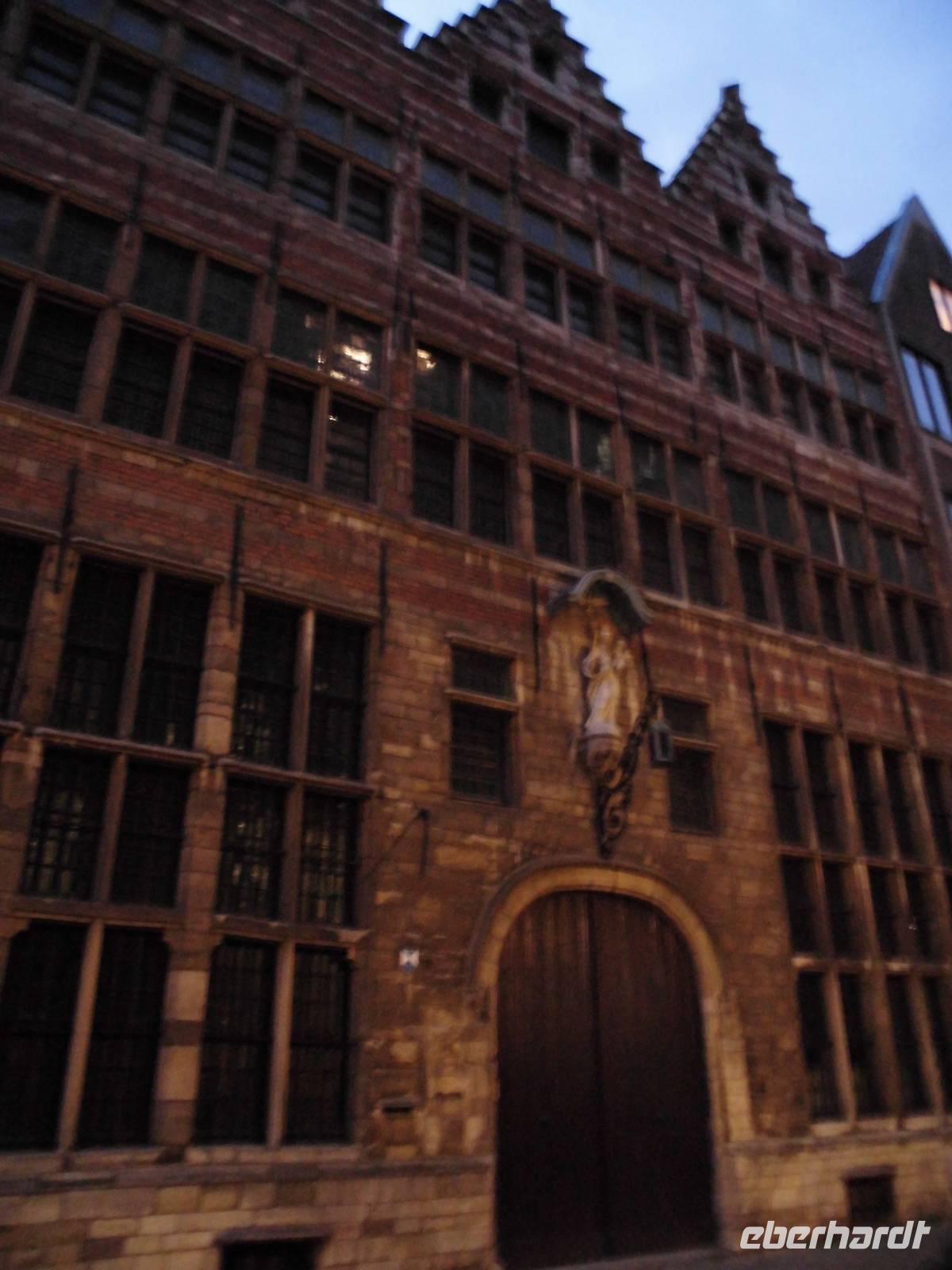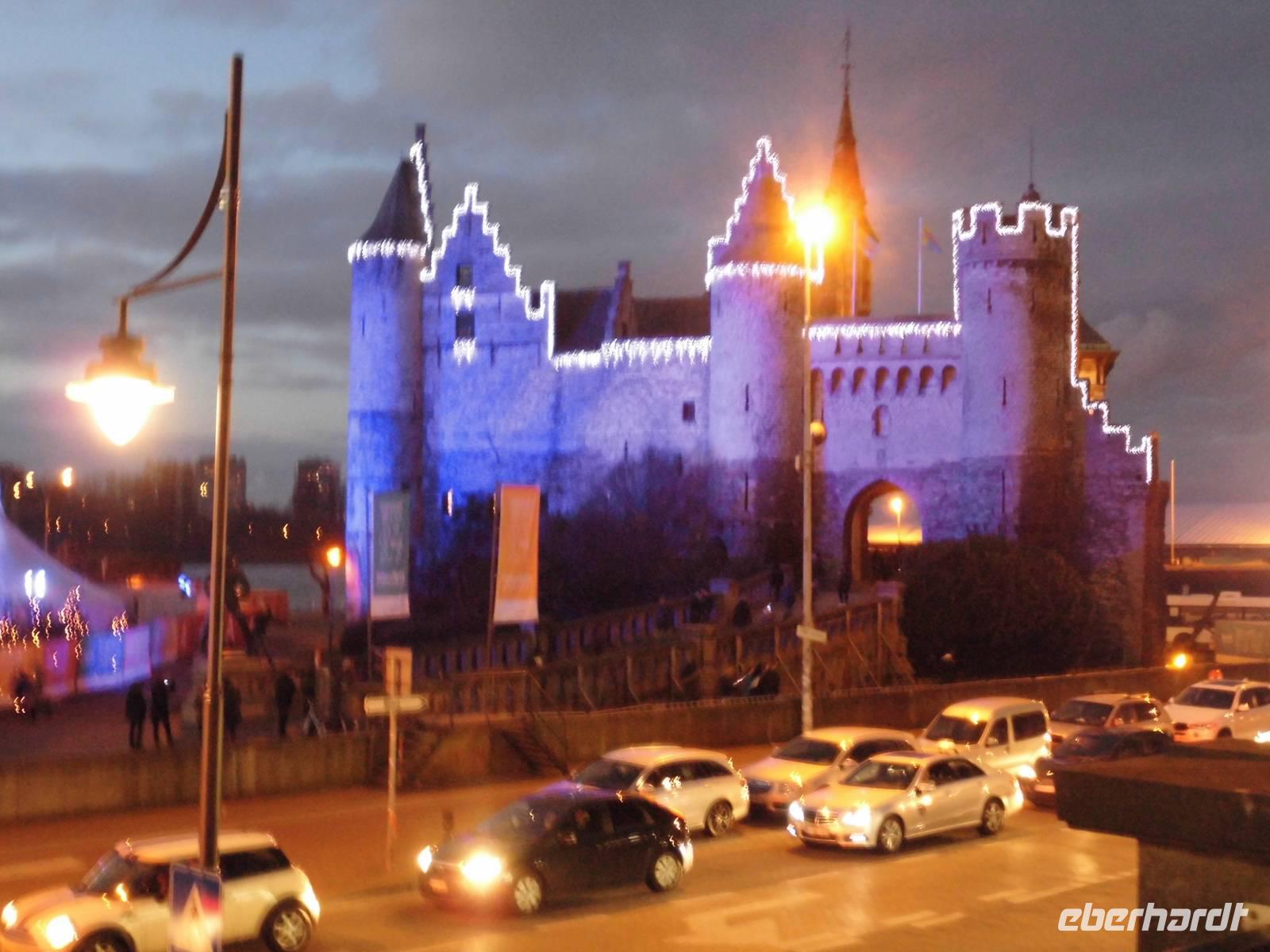 Zurück zum Bus gehen wir am ältesten Gebäude Antwerpens, der Burg - Het Steen- vorbei. Sie ist etwas kitschig blau beleuchtet. 1200 errichtet, diente sie von 1303 bis 1823 als Gefängnis. Danach als Museum. Seit 2012 fand die Burg eine neue Verwendung als „HET STEHEN der Wijzen. Ein Haus für Denker, Träumer und Macher.