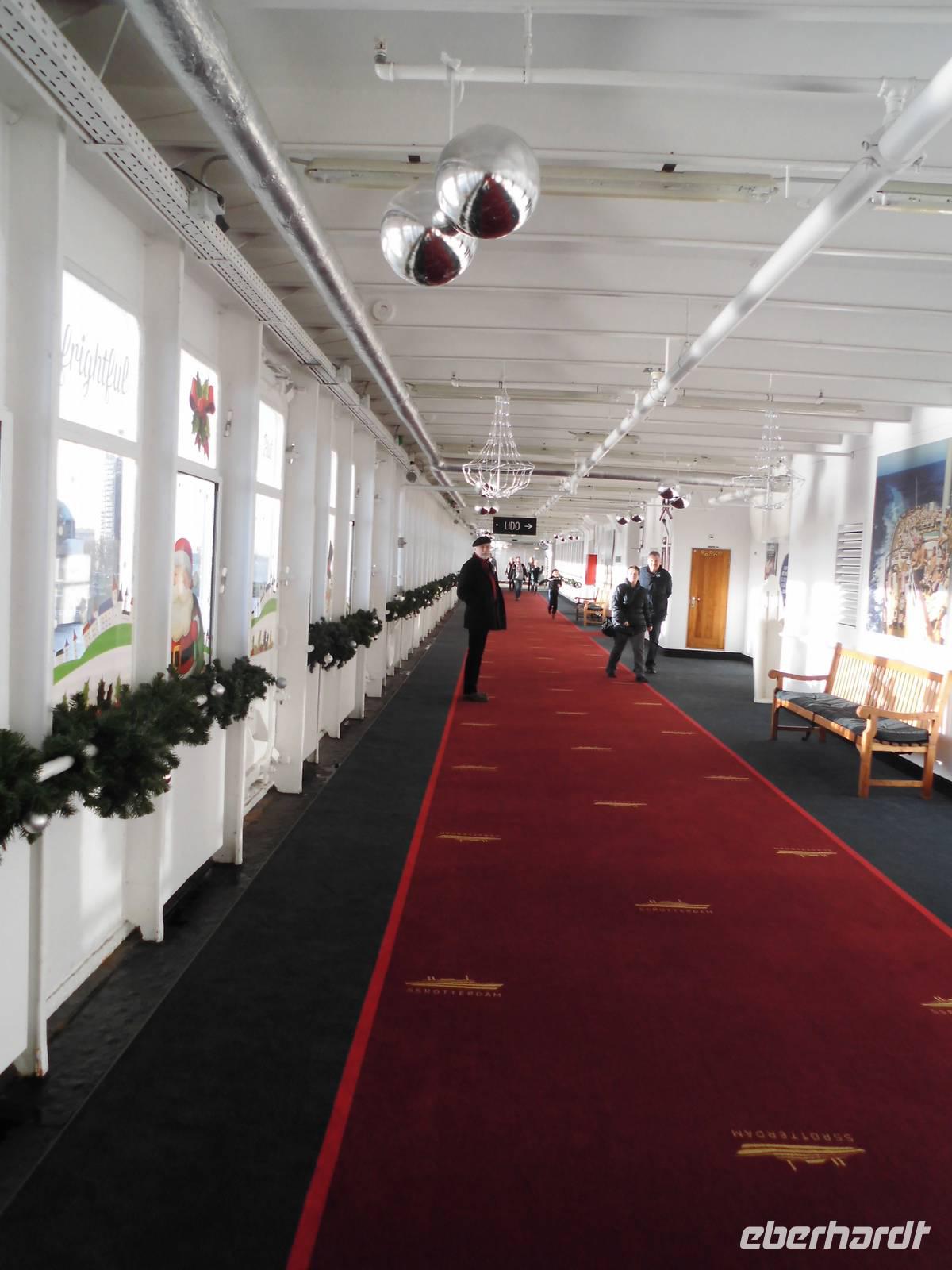 18.30 Uhr Platz nehmen in Restaurant zum Silvester-Galadinner. Die Köche hatten sich mal wieder selbst übertroffen. Einfach köstlich das Menü! Danach Plätze im Restaurant suchen für die Nacht der Nächte. Zum Tanz spielte Sunny tolle Musik. Dann unterhielt uns die Mannschaft der Rigoletto mit ihrer Crew Show und der Tombola. So langsam näherten wir uns dem Jahreswechsel. Es wurden farbig beleuchtete Sektgläser mit Inhalt ausgegeben. Alles war bereit das Neue Jahr 2016 gebührend zu empfangen. Den ersten Schluck im Salon, aber dann hoch auf das Sonnendeck und die Farbenpracht des Höhenfeuerwerkes von der Erasmusbrücke aus zu genießen. Einfach sensationell, Europas größtes und bestimmt auch lautestes Feuerwerk. Das zu erleben ist gigantisch. Einige Gäste waren auch in Richtung Erasmusbrücke gelaufen um hautnah dabei zu sein. Danach lagen wir uns in den Armen, versprachen beste Wünsche, Gesundheit usw. In der Lobby stand schon wieder ein kleiner Imbiss, den die fleißigen Köche der Crew gezaubert hatten. Dann tanzten wir in den frühen neuen Tag, der Weg ins Bett war ja nicht weit. Das ist das Schöne an einer Kreuzfahrt - die kurzen Wege ins Hotelzimmer kann jeder selbst bestimmen. Ganz ohne Taxi, Bus oder gar öffentliche Verkehrsmittel.