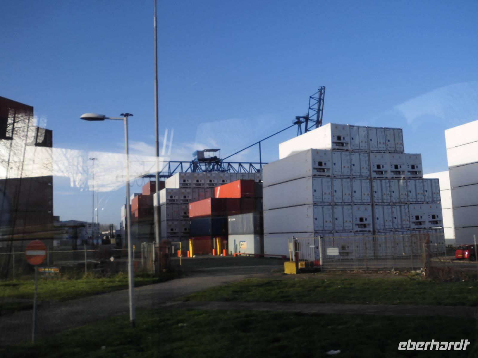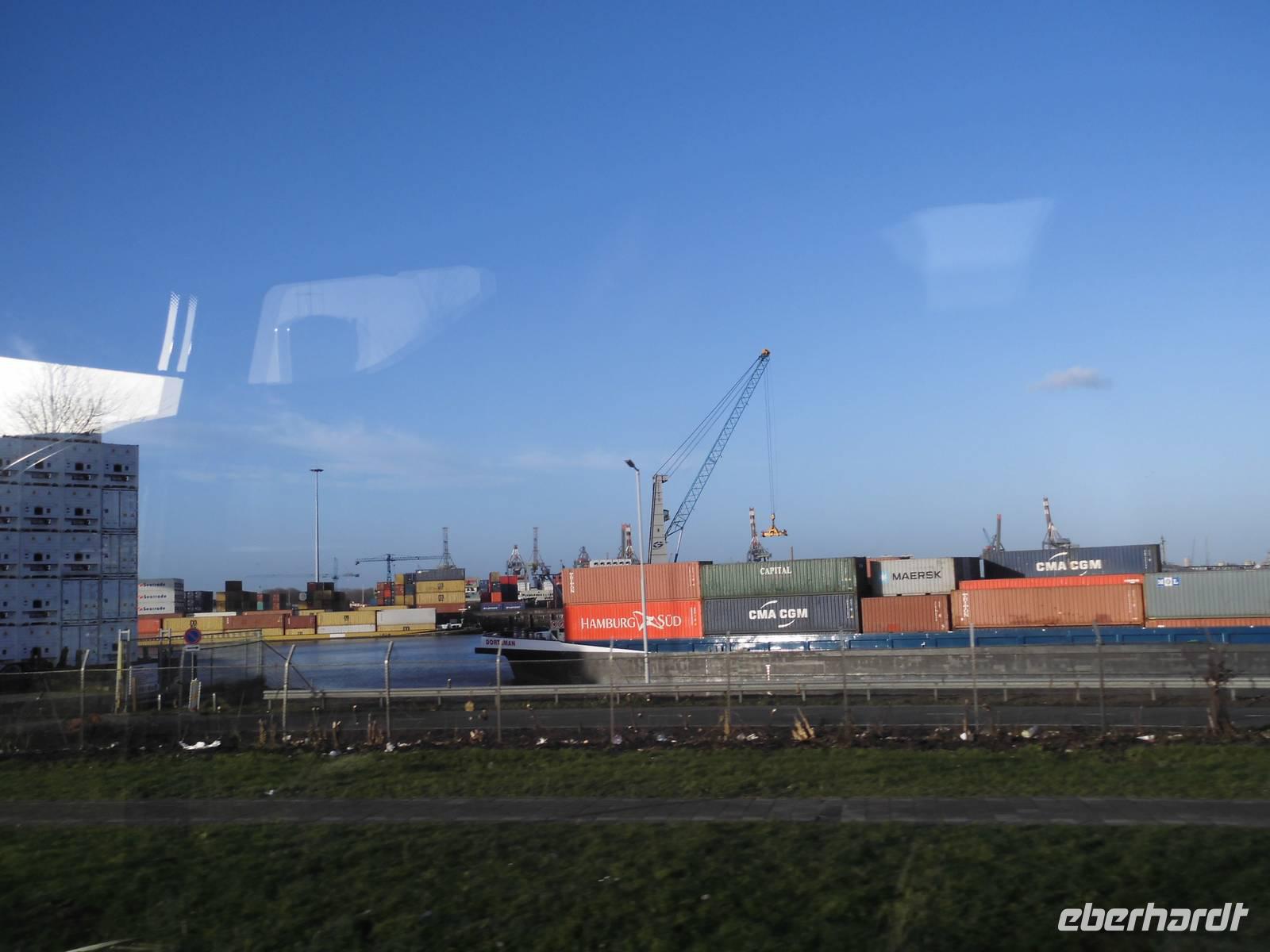 Am Bus angekommen fahren wir durch einen 1,6km langen Tunnel unter der Schelde durch. Es gibt keine Brücken über diesen Fluss wegen der Gezeiten. Bis zu 5m Unterschied kann zwischen Ebbe und Flut entstehen. Nicht nur Tunnel für Fahrzeuge, sondern auch reine Fußgängertunnel unter der Schelde sind zwischen den Stadtteilen von Antwerpen anlegt.