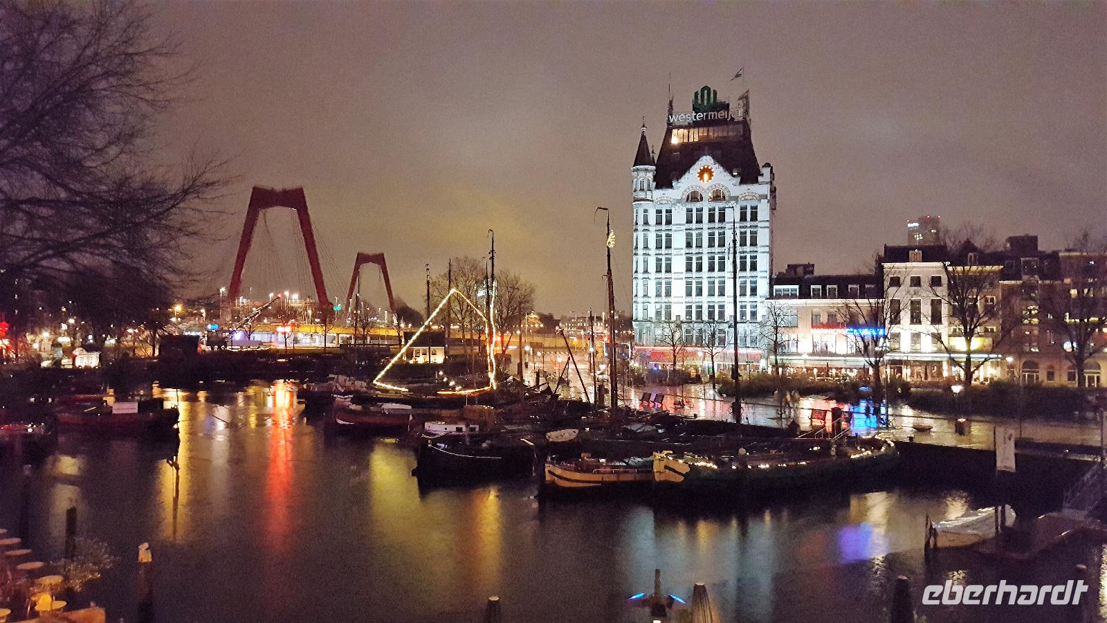 Unser Anleger beim Uniworld Steiger befindet sich direkt an der Erasmusbrücke, wo heute das größte Feuerwerk der Niederlande gezündet wird. Die Erasmusbrücke (niederl. Erasmusbrug) ist eine Schrägseilbrücke über die Nieuwe Maas, einen Hauptstrom im Rhein-Maas-Delta. Die nach dem Philosophen Erasmus von Rotterdam benannt wurde, verbindet das Zentrum mit dem Kop van Zuid, einem städtebaulichen Entwicklungsgebiet.