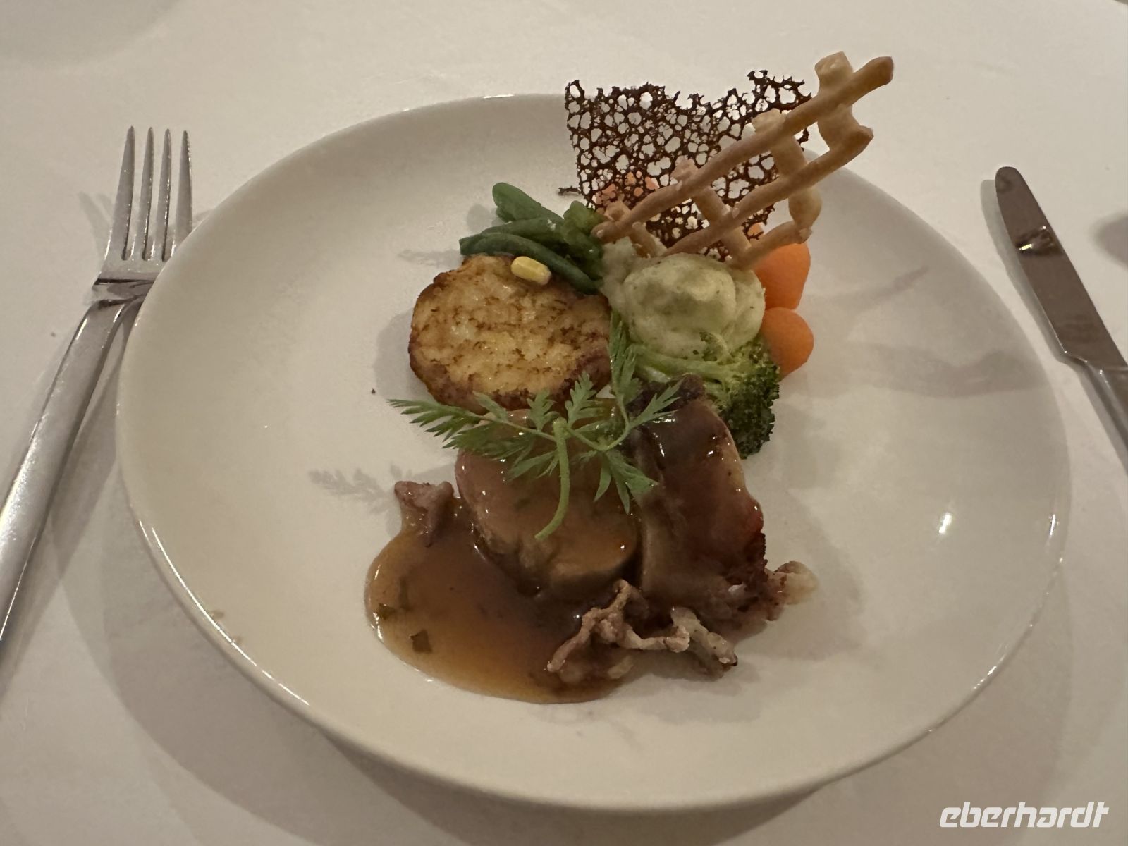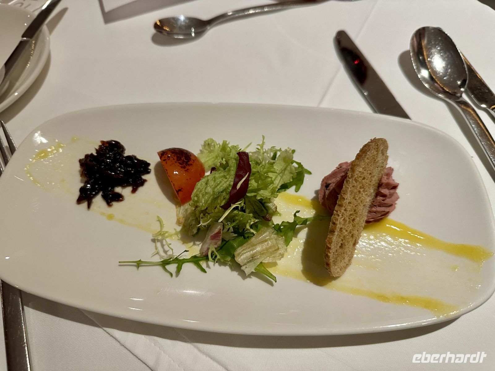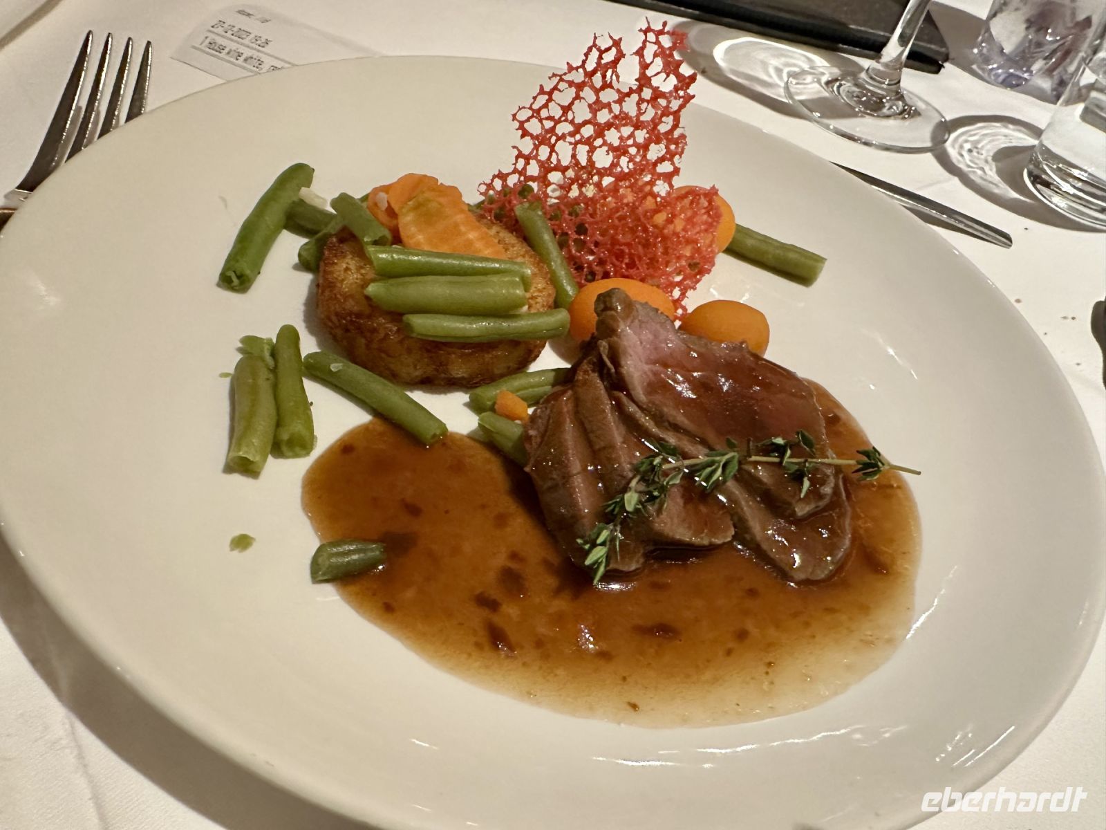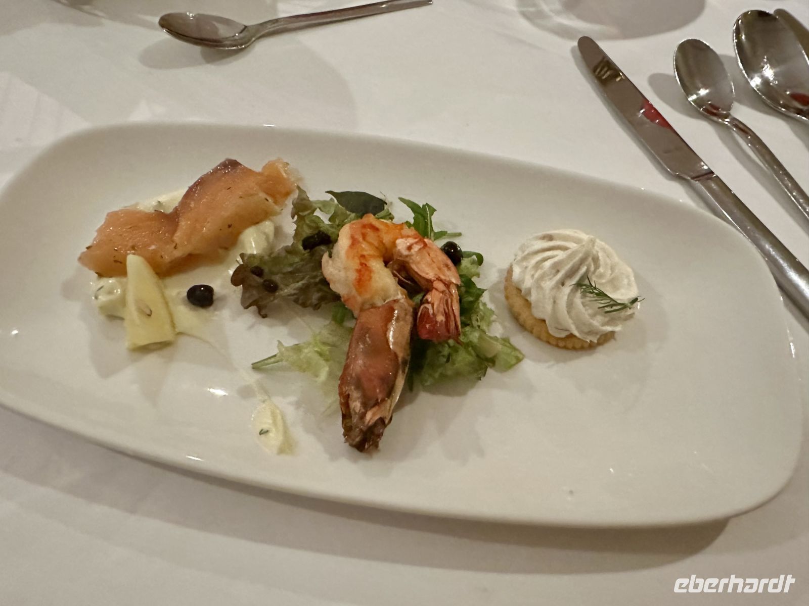 Am Abend verabschiedet sich der Kapitän, bedankt sich bei seiner Crew und bei seinen Gästen bevor wir uns zum letzten festlichen Abendessen, dem Kapitänsdinner, begeben. Heute gibt es geräucherten Lachs mit Guacamole, Kopfsalat und Sesam Crunch, geräucherte Ente mit Orangendressing, Rucola und Karottensalat, Spargelsuppe, Welsfilet mit Dillöl und schließlich medium gebratenes Schweinefleisch mit Honig-Basilikum-Soße, Kartoffelrösti und Gemüse. Als Nachspeise wird ein Omelette Siberienne gereicht. Anschließend fallen wir erschöpft in unsere Betten. Den Koffer können wir auch morgen früh noch zu machen.