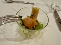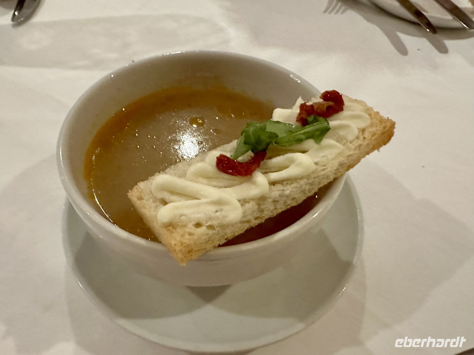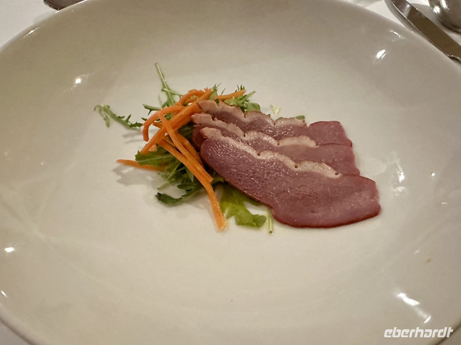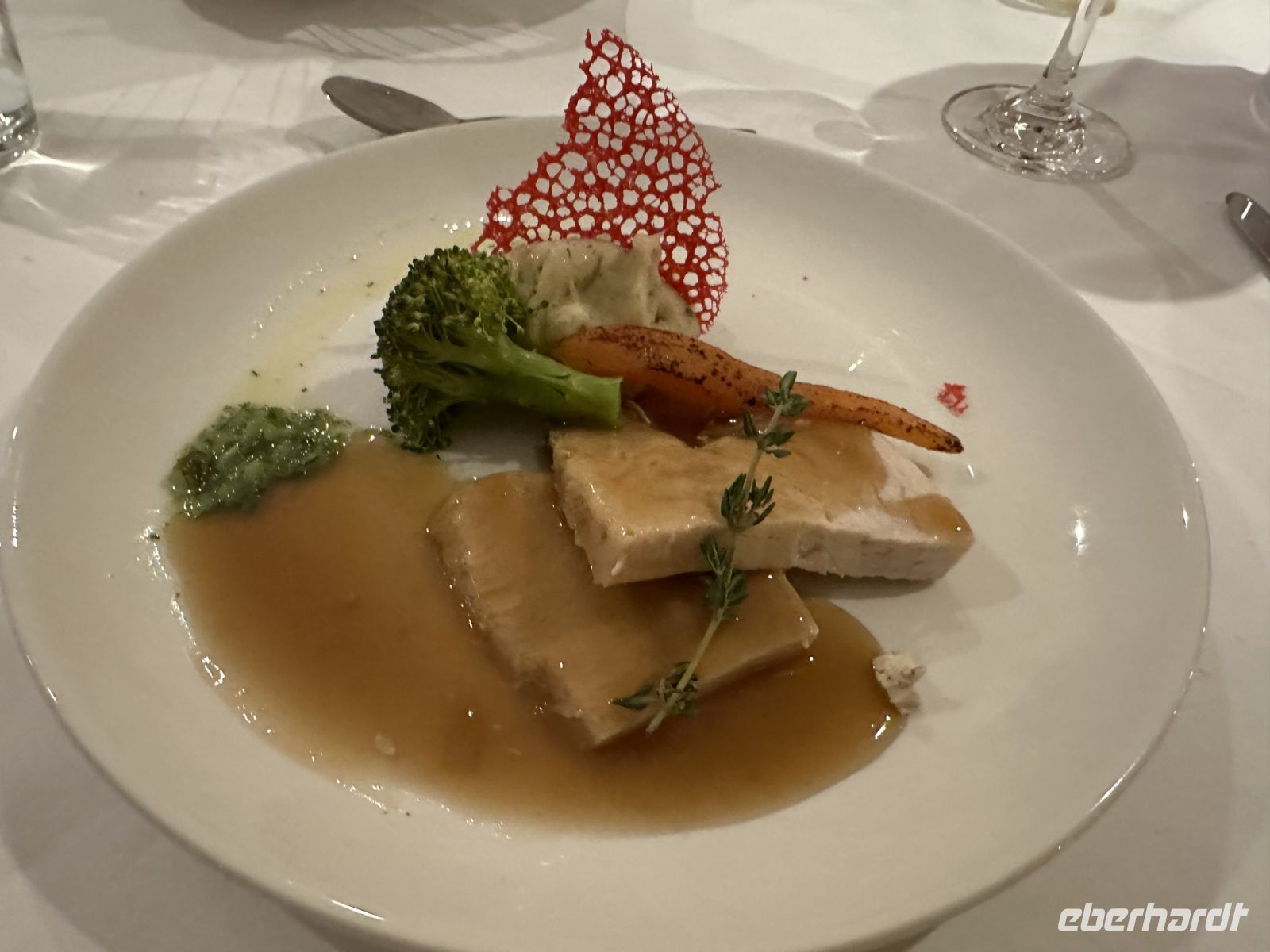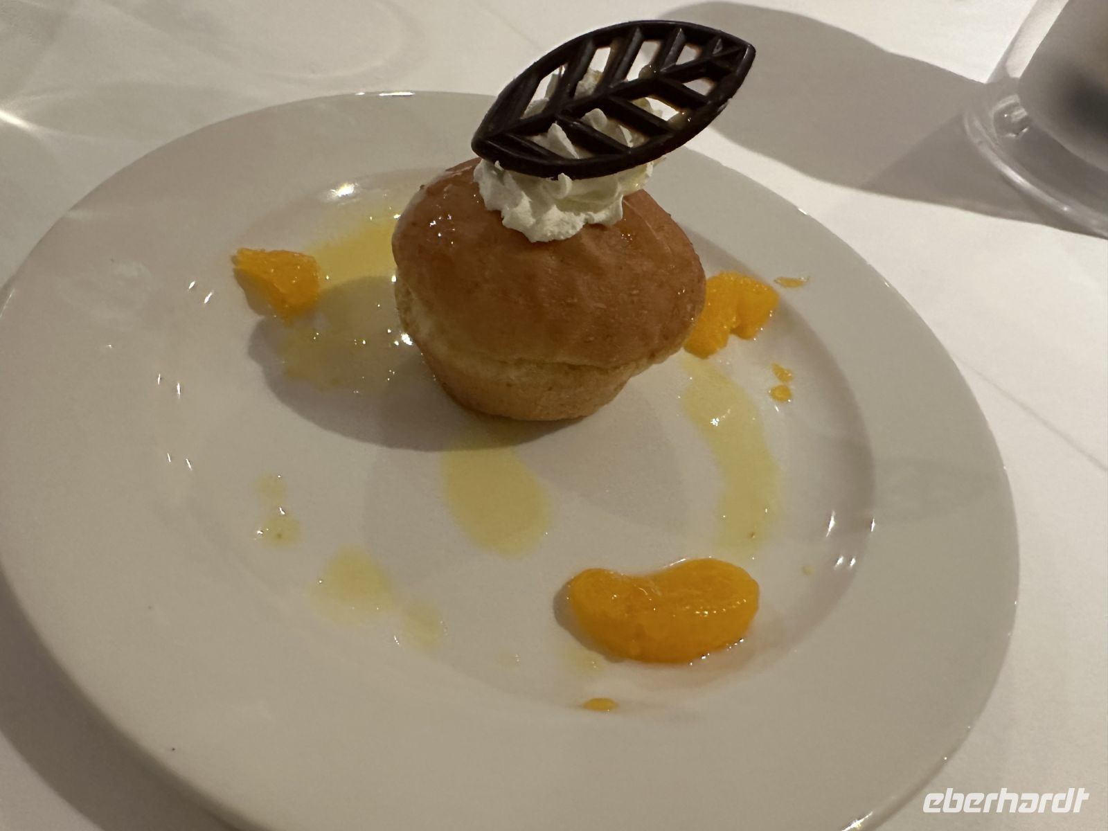 Am Abend verabschiedet sich der Kapitän, bedankt sich bei seiner Crew und bei seinen Gästen bevor wir uns zum letzten festlichen Abendessen, dem Kapitänsdinner, begeben. Heute gibt es geräucherten Lachs mit Guacamole, Kopfsalat und Sesam Crunch, geräucherte Ente mit Orangendressing, Rucola und Karottensalat, Spargelsuppe, Welsfilet mit Dillöl und schließlich medium gebratenes Schweinefleisch mit Honig-Basilikum-Soße, Kartoffelrösti und Gemüse. Als Nachspeise wird ein Omelette Siberienne gereicht. Anschließend fallen wir erschöpft in unsere Betten. Den Koffer können wir auch morgen früh noch zu machen.