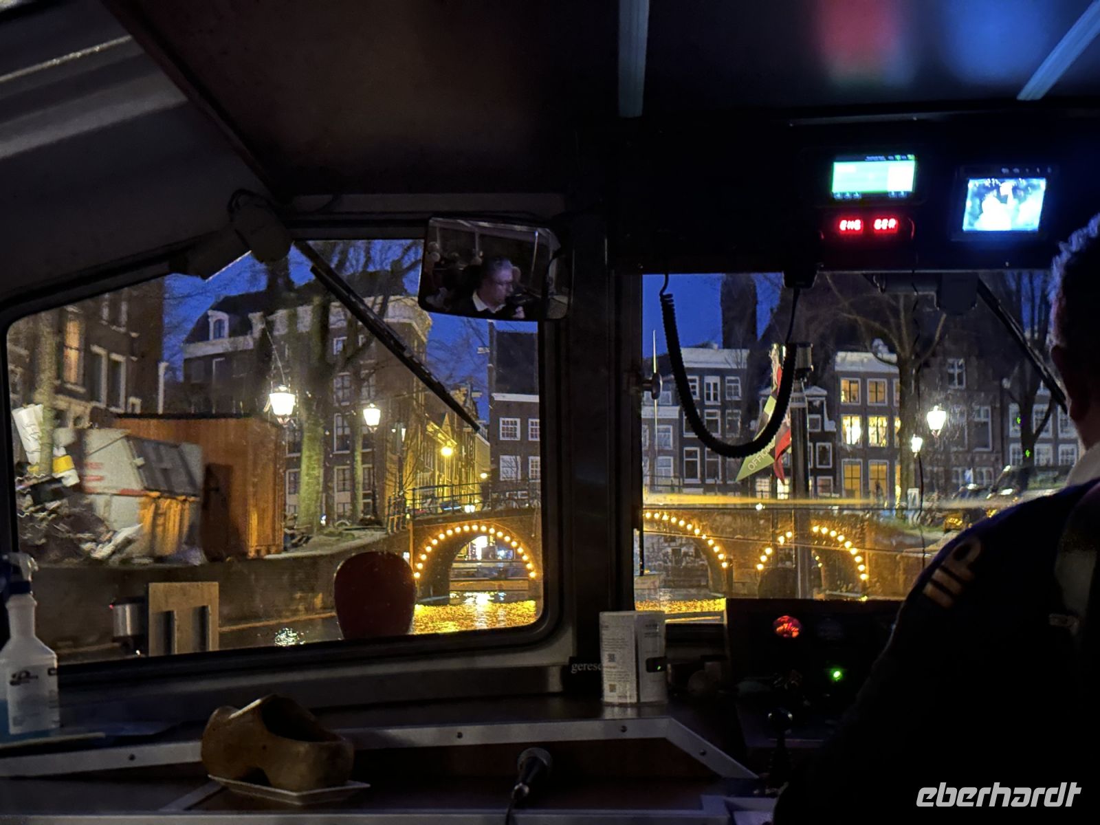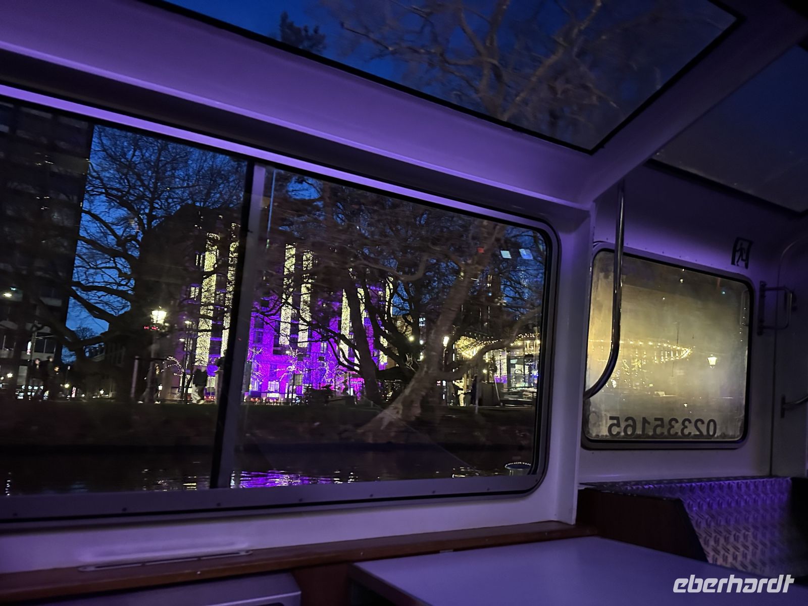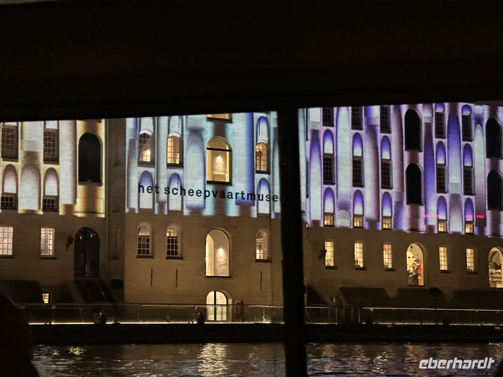 Für Frühaufsteher steht ein kleines Frühstücksbuffet bereit. Ab 10 Uhr folgt der Silvesterbrunch mit kalten und warmen Speisen. Unser Schiff ist auf dem Weg nach Amsterdam. Wir genießen die gemütliche Fahrt bis dorthin. Am Nachmittag unternehmen wir eine zweistündige Stadtrundfahrt. Nach einer kleinen Freizeit steigen wir auf ein Grachtenboot und erleben ein beleuchtetes Amsterdam. Was wir vom Bus aus nicht sehen konnten, sind die vielen angestrahlten modernen Kunstobjekte, die sich an den Ufern der Grachten befinden. Auch viele Häuser haben eine besondere Beleuchtung, fast wirkt es wie ein kleines Festival of Light, was jedes Jahr in Berlin stattfindet.