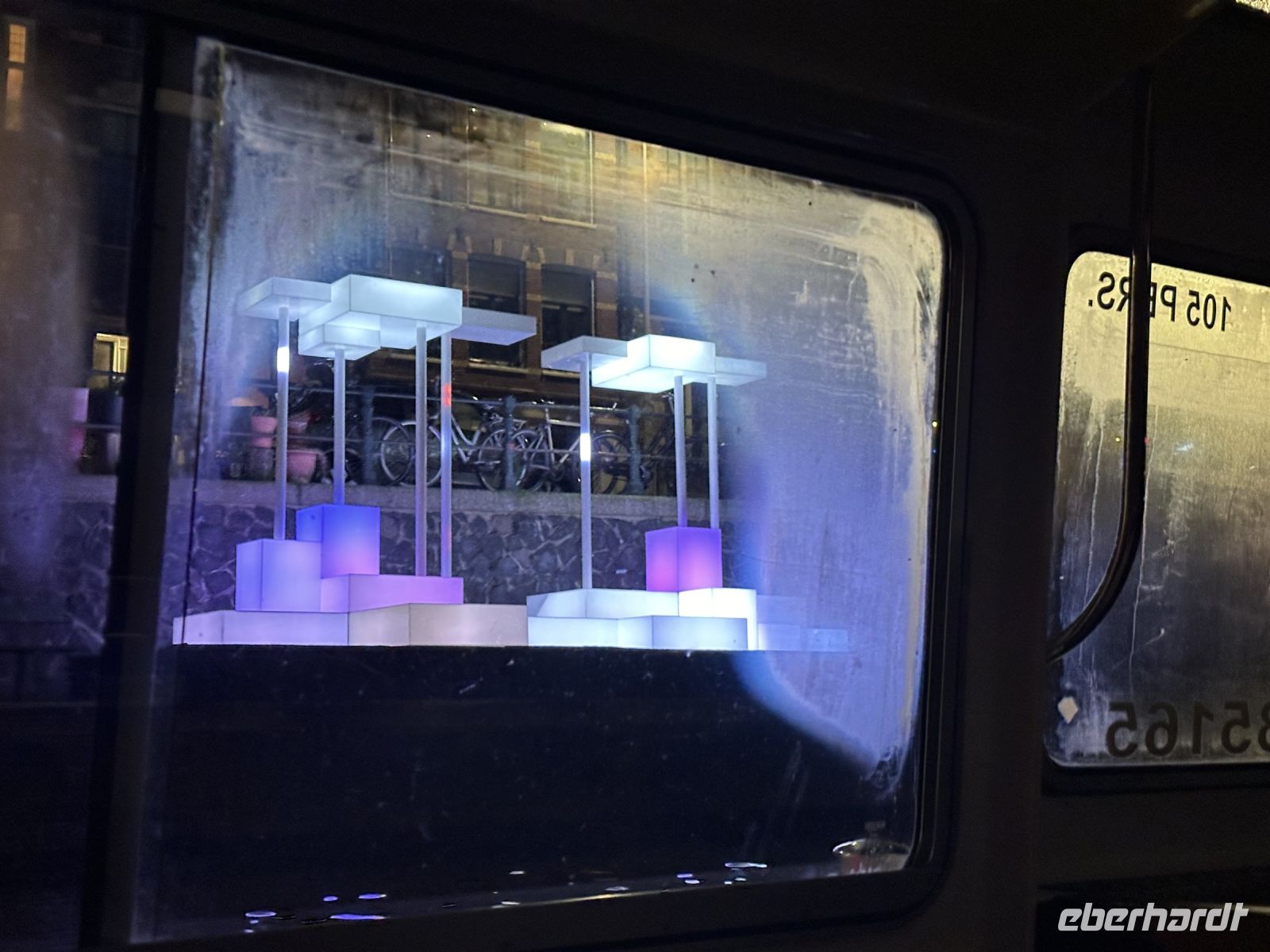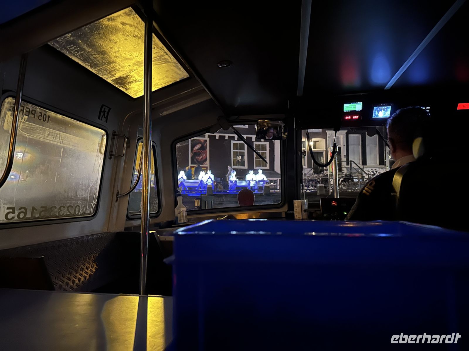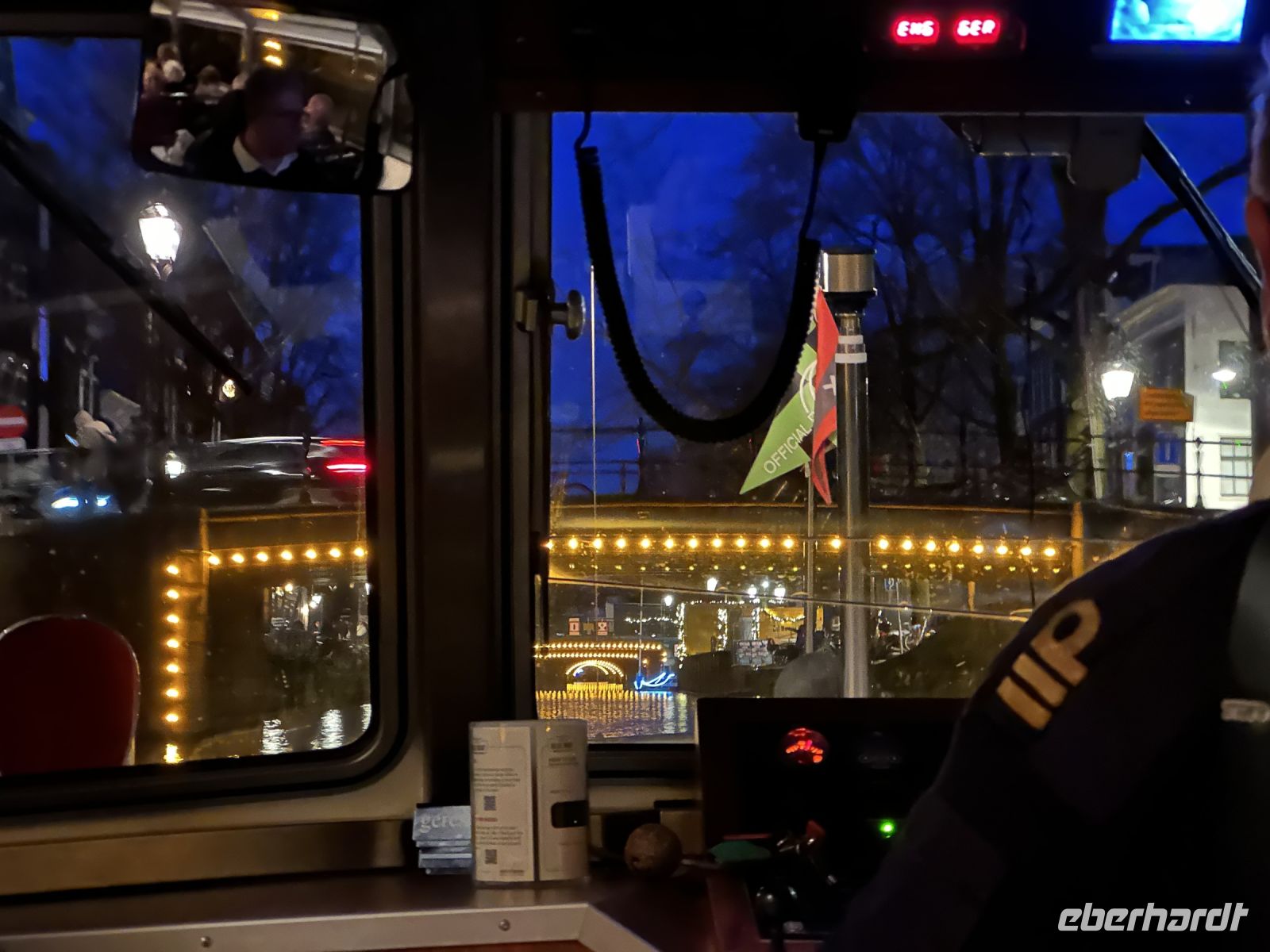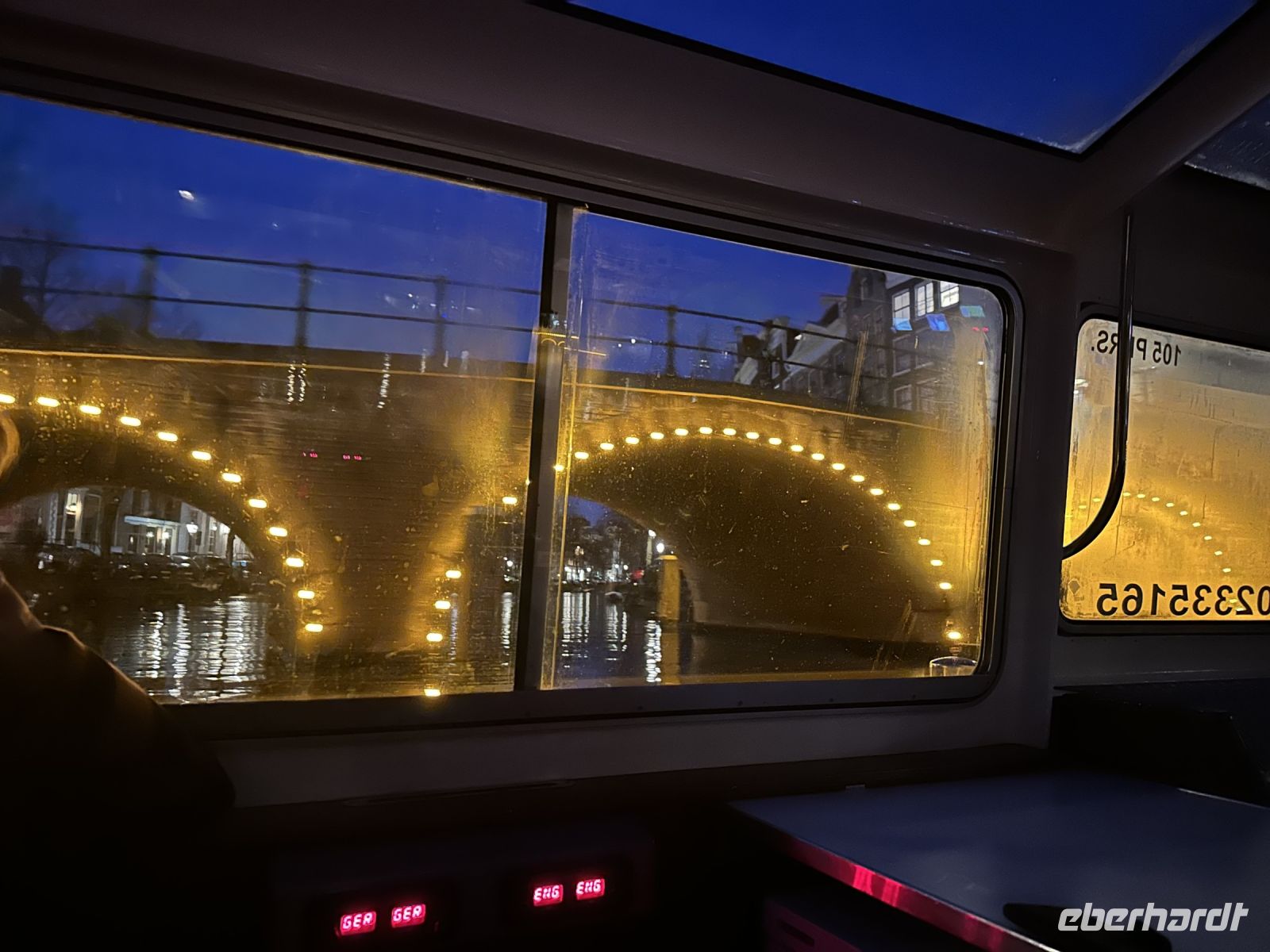 Für Frühaufsteher steht ein kleines Frühstücksbuffet bereit. Ab 10 Uhr folgt der Silvesterbrunch mit kalten und warmen Speisen. Unser Schiff ist auf dem Weg nach Amsterdam. Wir genießen die gemütliche Fahrt bis dorthin. Am Nachmittag unternehmen wir eine zweistündige Stadtrundfahrt. Nach einer kleinen Freizeit steigen wir auf ein Grachtenboot und erleben ein beleuchtetes Amsterdam. Was wir vom Bus aus nicht sehen konnten, sind die vielen angestrahlten modernen Kunstobjekte, die sich an den Ufern der Grachten befinden. Auch viele Häuser haben eine besondere Beleuchtung, fast wirkt es wie ein kleines Festival of Light, was jedes Jahr in Berlin stattfindet.