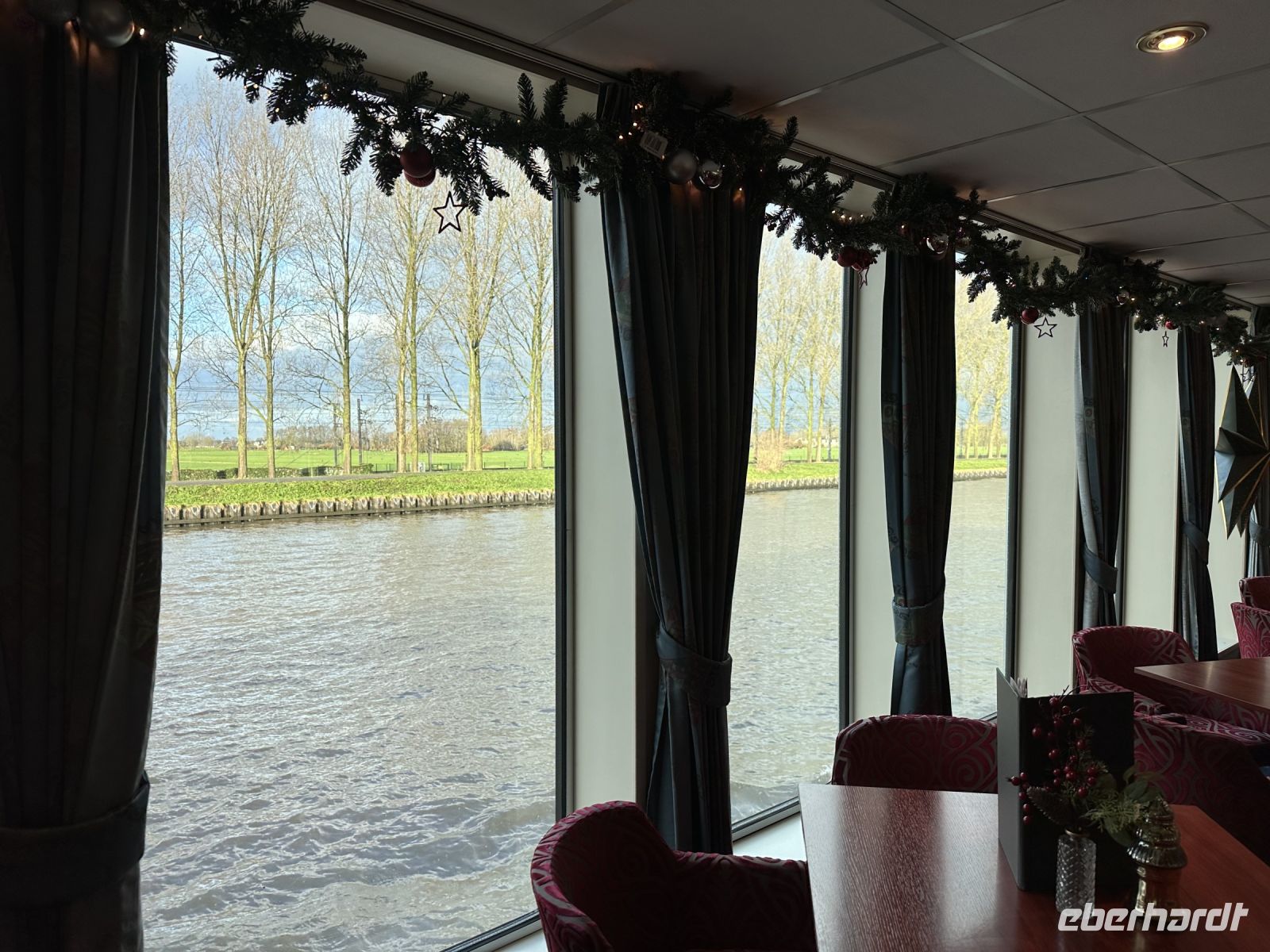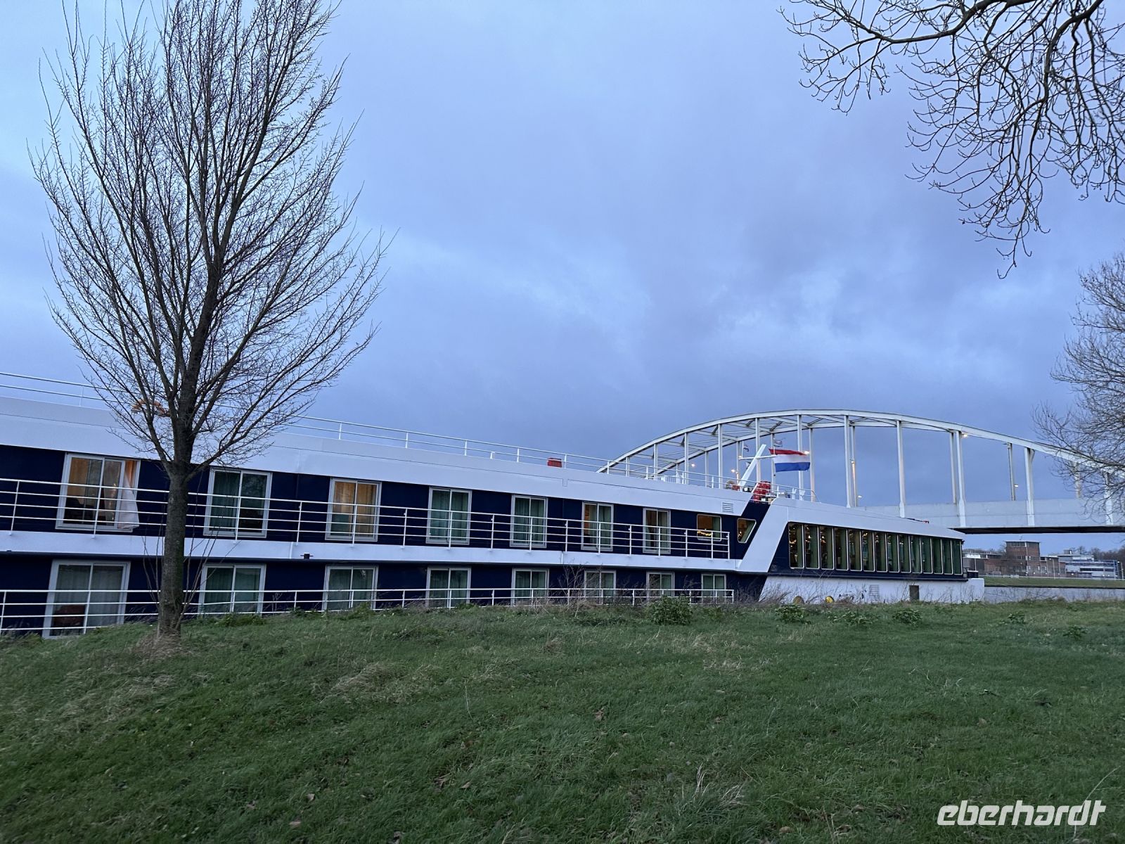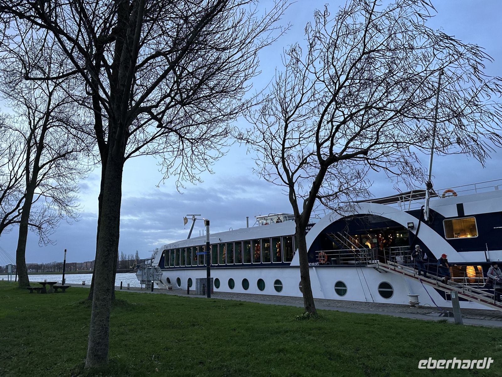 In diesem Winter macht uns das Hochwasser zu schaffen. Mit Argusaugen beobachten wir den Wetterbericht und tatsächlich erreicht uns kurzfristig die Nachricht, dass unser Schiff, die MS Dutch Grace, nicht in Arnheim anlegen und damit auch Ijmegen nicht angefahren werden kann. Nun also fahren wir nach Utrecht. Am frühen Morgen, es ist noch dunkel, startet der Bus am Flughafen Dresden. Nach vier kurzen Halten, sind in Jena zwei Drittel der Gruppe zugestiegen, die anderen steigen am Flughafen Paderborn zu. Gesetzeskonform halten wir uns an die Fahrt- und Ruhepausen, genießen mittags die traditionellen Bus-Würstchen und nähern uns am frühen Abend der Anlegestelle. Wir drehen eine kleine Ehrenrunde, dann erreichen wir als erster von drei Bussen das Schiff. Das Gepäck wird von den Mitarbeitern des Schiffes ausgeladen und in die Kabinen gebracht. An der Rezeption erhalten wir unsere Kabinenschlüssel (tatsächlich richtige Schlüssel, keine Schlüsselkarten) auch ein Safeschlüssel wird gleich mit übergeben. Die Zeit reicht aus, sich frisch zu machen, bevor wir im Salon vom Kapitän empfangen werden. Bei einem Glas Sekt erfahren wir, wer hinter den Kulissen für unser Wohlbefinden sorgen wird und wer das Schiff lenkt. Anschließend begeben wir uns ins Restaurant zum ersten Abendessen an Bord. Als Vorspeise wird eine cremige Pastete mit Pflaumenchutney, marinierten Kirschtomaten, Kopfsalat und Kräuter-Crostini, als Hauptgericht wird Rindfleisch in Rotweinsoße mit Kartoffelrösti und Gemüse gereicht und zum Nachtisch gibt es Tiramisu. Der Abend klingt im Salon bei Livemusik und gemütlichen Beisammensein aus.
