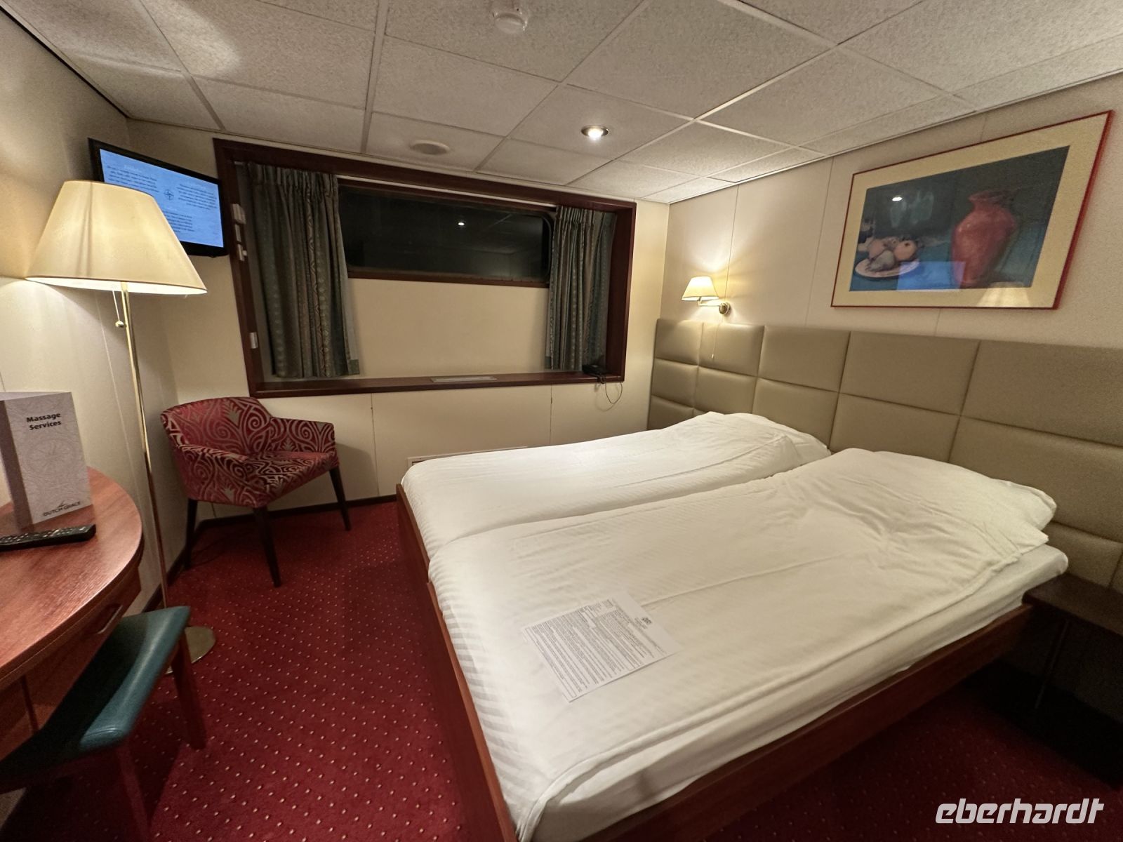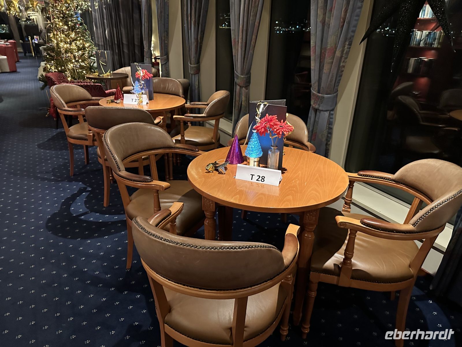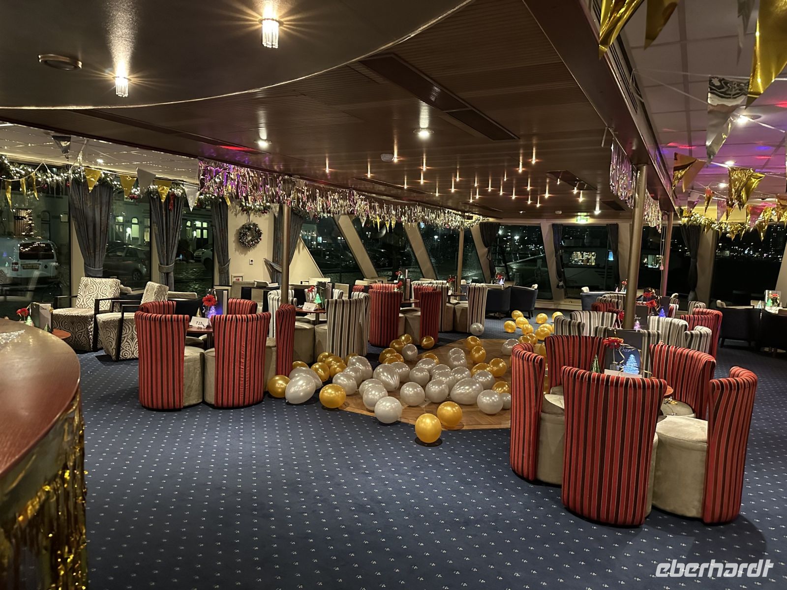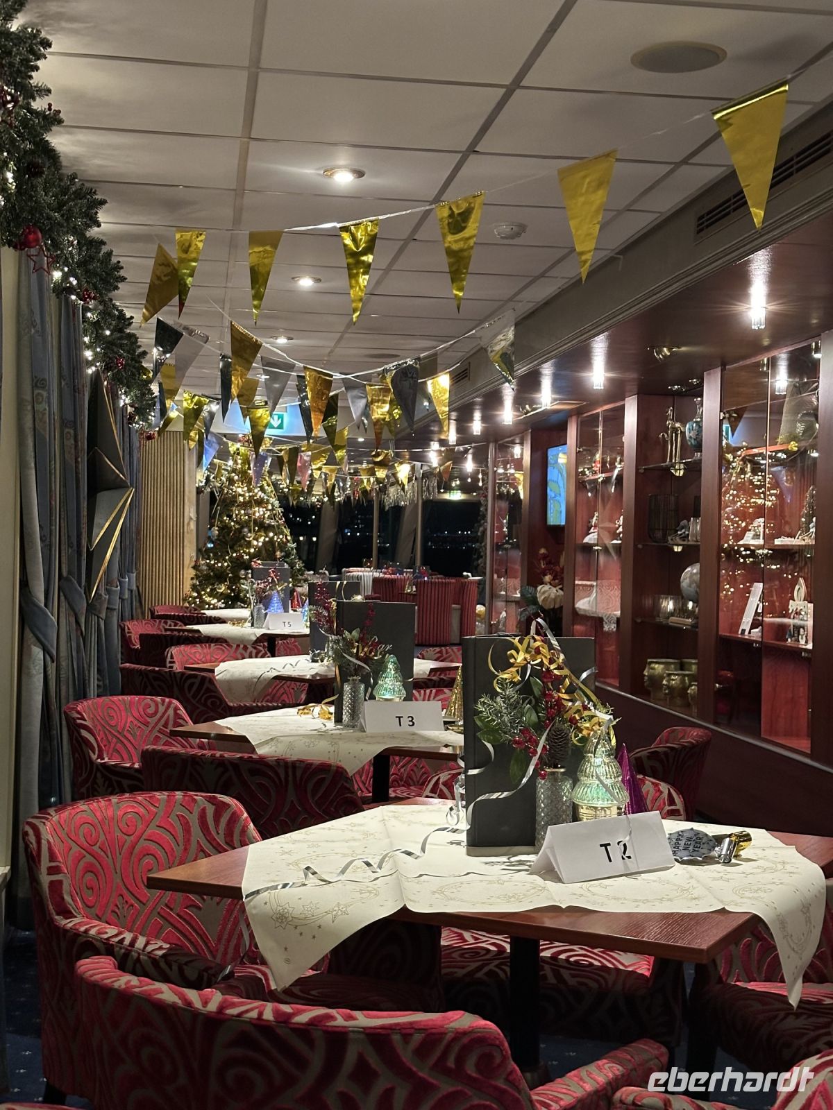 Für den Silvesterabend haben wir uns hübsch gemacht. Die Kleider sind einen Tick eleganter, Ohrringe und Perlenketten schmücken die Damen, viele Herren haben das schönst Jackett, die Fliege oder den Schlips hervorgeholt. Bevor jedoch die Silvesterparty beginnt, werden wir mit einem festlichen sechs Gänge Menü verwöhnt. Es beginnt mit einem Miniburger, gefüllt mit Fleisch, Äpfeln und Moosbeeren. Zur Vorspeise wird ein Trio aus dem Meer gereicht: eine Riesengarnele, geräuchertes Makrelenmousse und marinierter Lachs. Es folgt eine Ochsenschwanzsuppe und ein Apfelsorbet. Als Hauptspeise gibt es marinierten, langsam gegarten Truthahn in eigenem Bratensaft mit Brokkoli, Babykarotten und Kartoffelpüree. Ein Pfefferkuchen-Parfait mit Schlagsahne rundet das Menü ab. Anschließend begeben wir uns in den Salon, der von der Crew schön geschmückt wurde. Bei Musik und Tanz vergeht die Zeit bis Mitternacht schnell. Wir stoßen an auf das neue Jahr und beobachten das Silvesterfeuerwerk in Rotterdam.