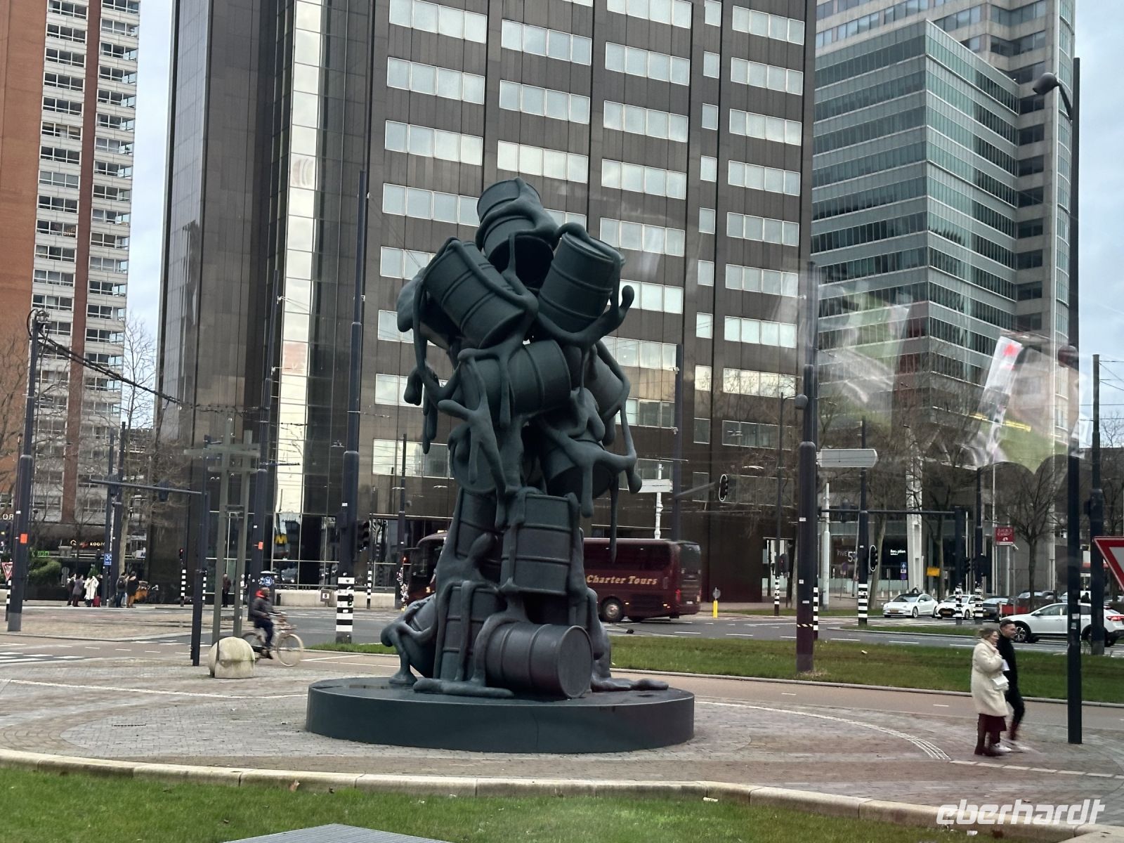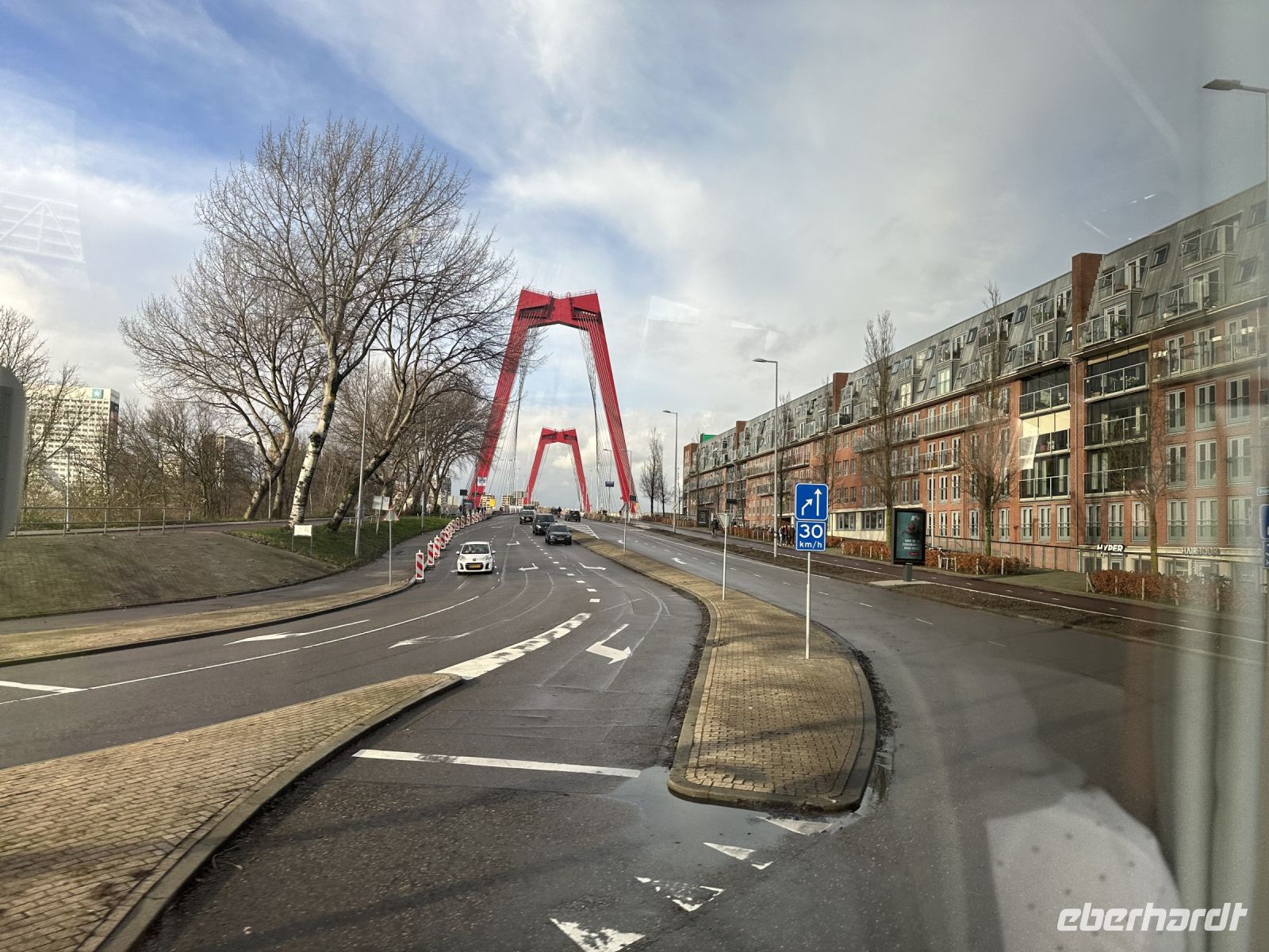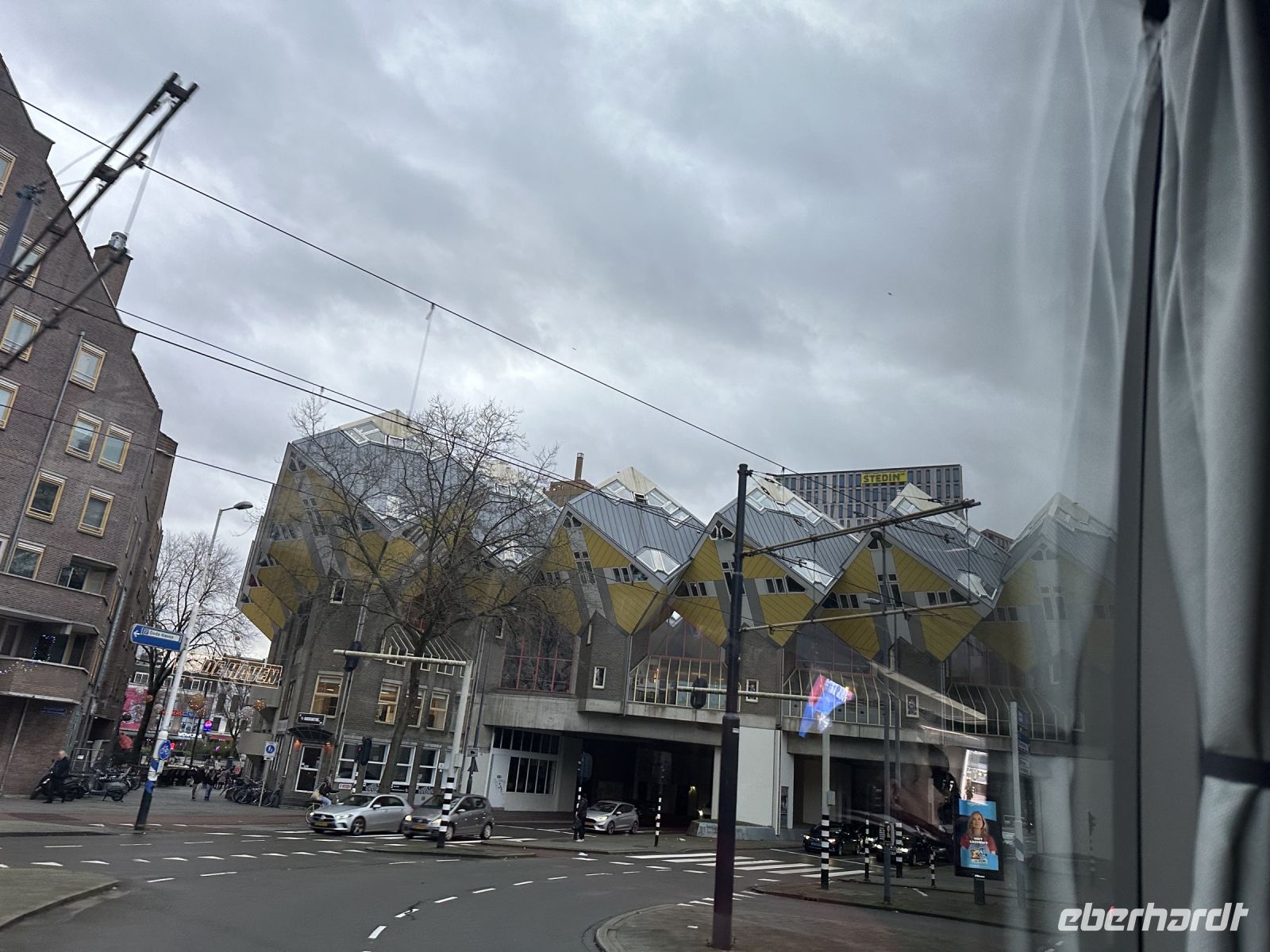 In der Nacht ist unser Schiff nach Rotterdam gefahren. Am Nachmittag unternehmen wir eine Stadtrundfahrt. Mehrmals überqueren wir mit dem Bus die berühmte Erasmusbrücke, die wegen ihrer Schönheit auch den Namen Schwan trägt. In Rotterdam gibt es viele Skulpturen zu sehen. Die meisten erinnern an vergangene Kriege, andere widmen sich der modernen Kunst. Dazu gehört ein überdimensionaler Gartenzwerg mit einem Dildo in der Hand. Macht Liebe statt Krieg könnte seine Aussage sein. Die berühmten Kubushäuser laden dazu ein, darüber nachzudenken, ob es in den Wohnungen gerade oder schiefe Wände bzw. Fußböden gibt. Nach der Stadtbesichtigung haben wir eine Stunde Zeit die berühmte Markthalle zu besuchen und uns mit Leckereien zu versorgen.
